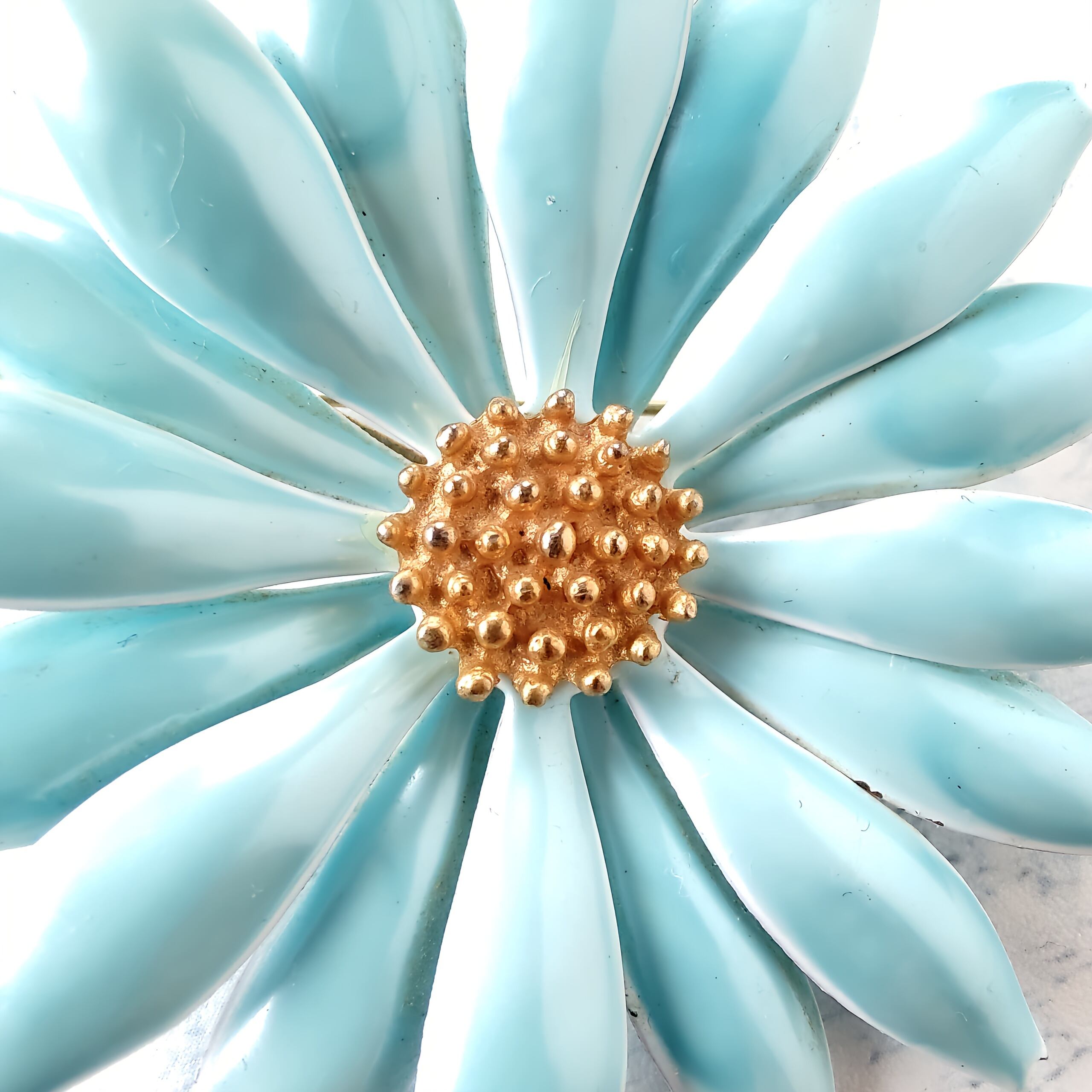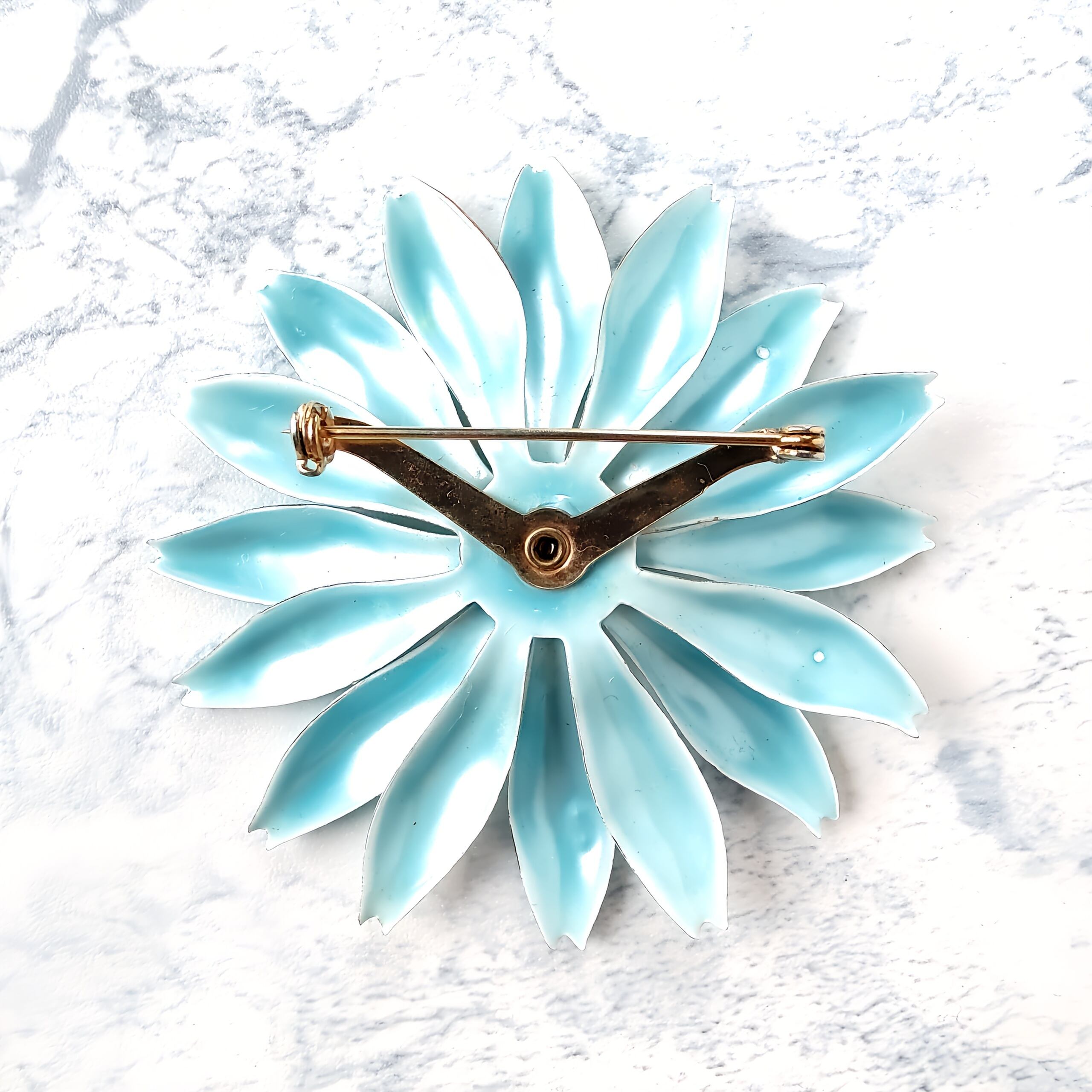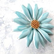ホワイトの上から水色のエナメルで重ね塗りして淡く色付けされたフラワーのヴィンテージブローチです。