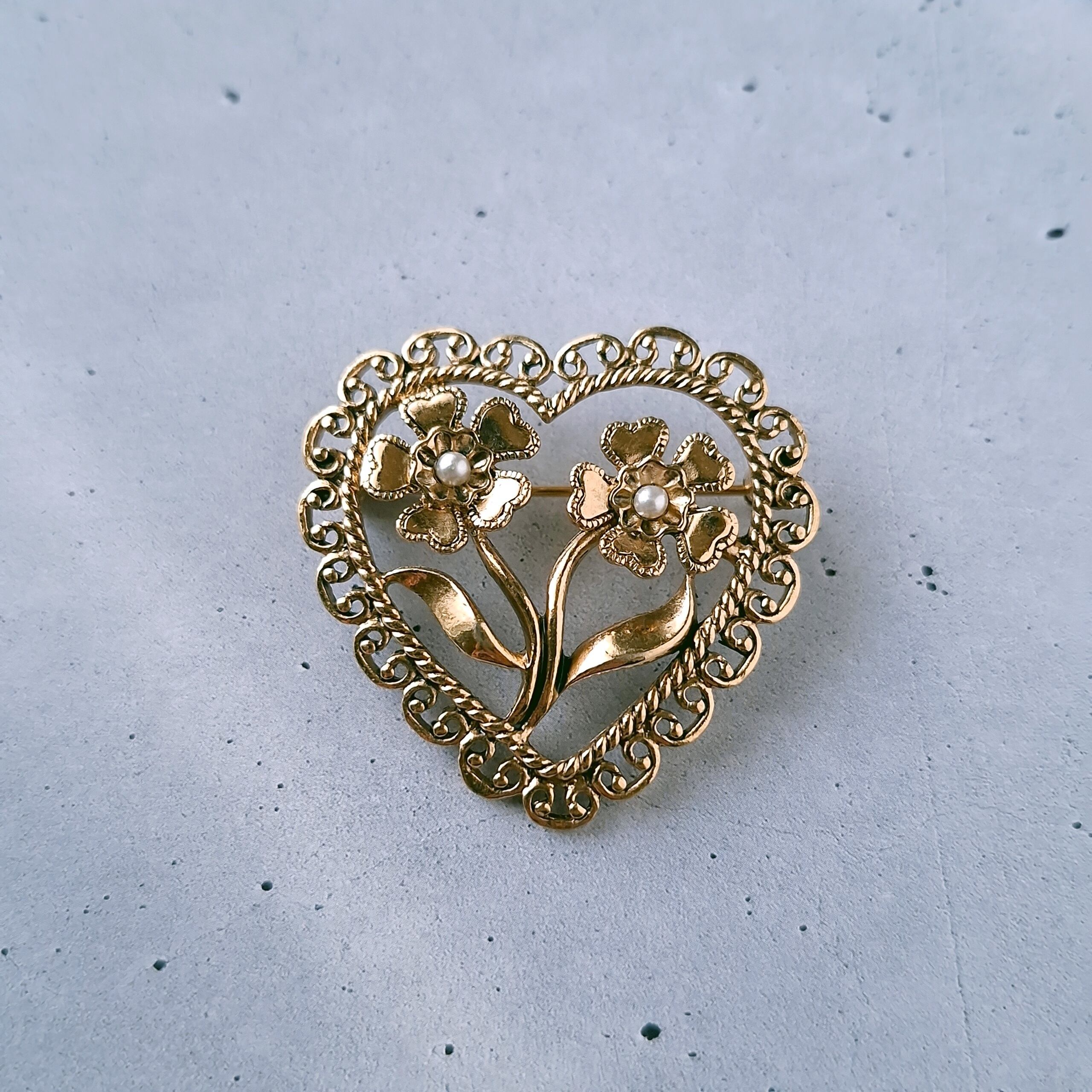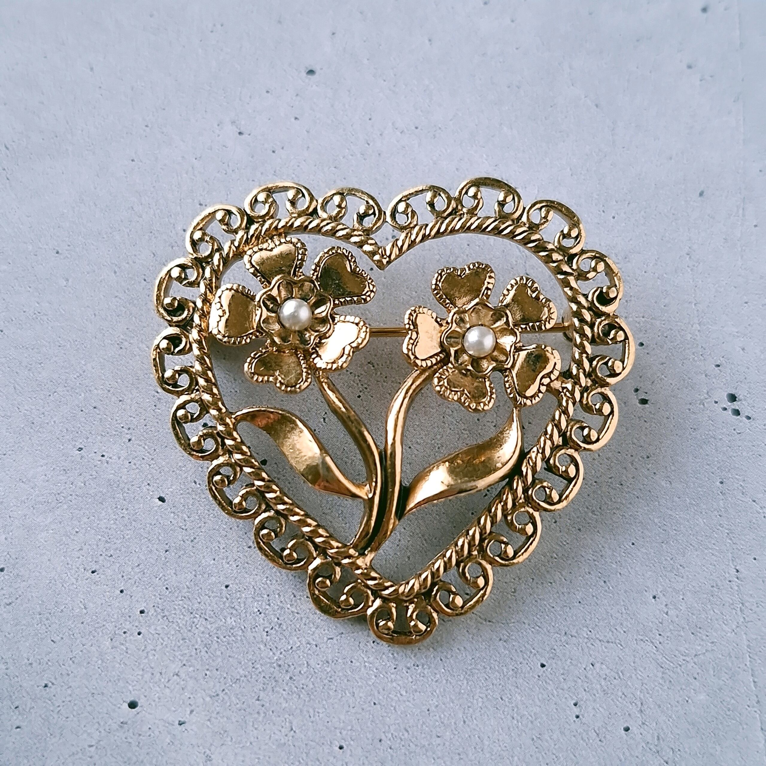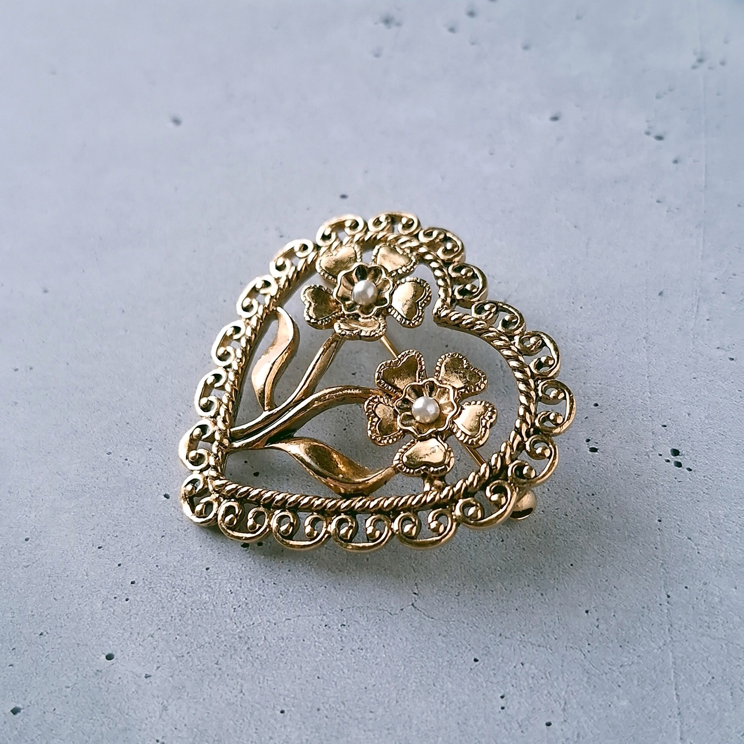 1886年アメリカのニューヨークにて小さな香水会社を創業、1971年に本格的にコスチュームジュエリーの製作を開始したAvon(エイボン)の1998年に販売された“ANTIQUED HEART PIN”の黒ずみ加工が施されたゴールドメタルのフェイクパールがあしらわれたフラワーをレースの付いたオープンハートで囲ったデザインのヴィンテージブローチです。