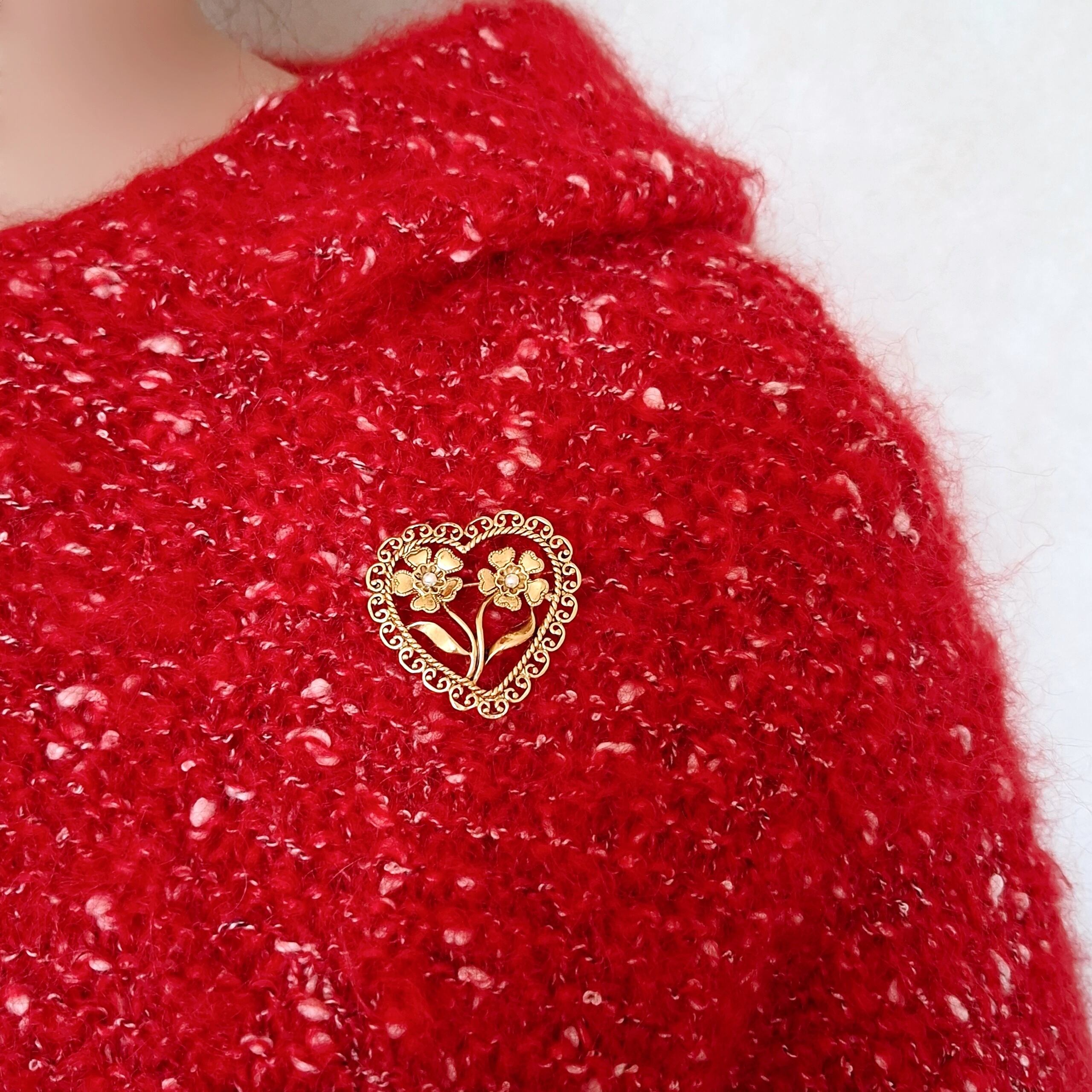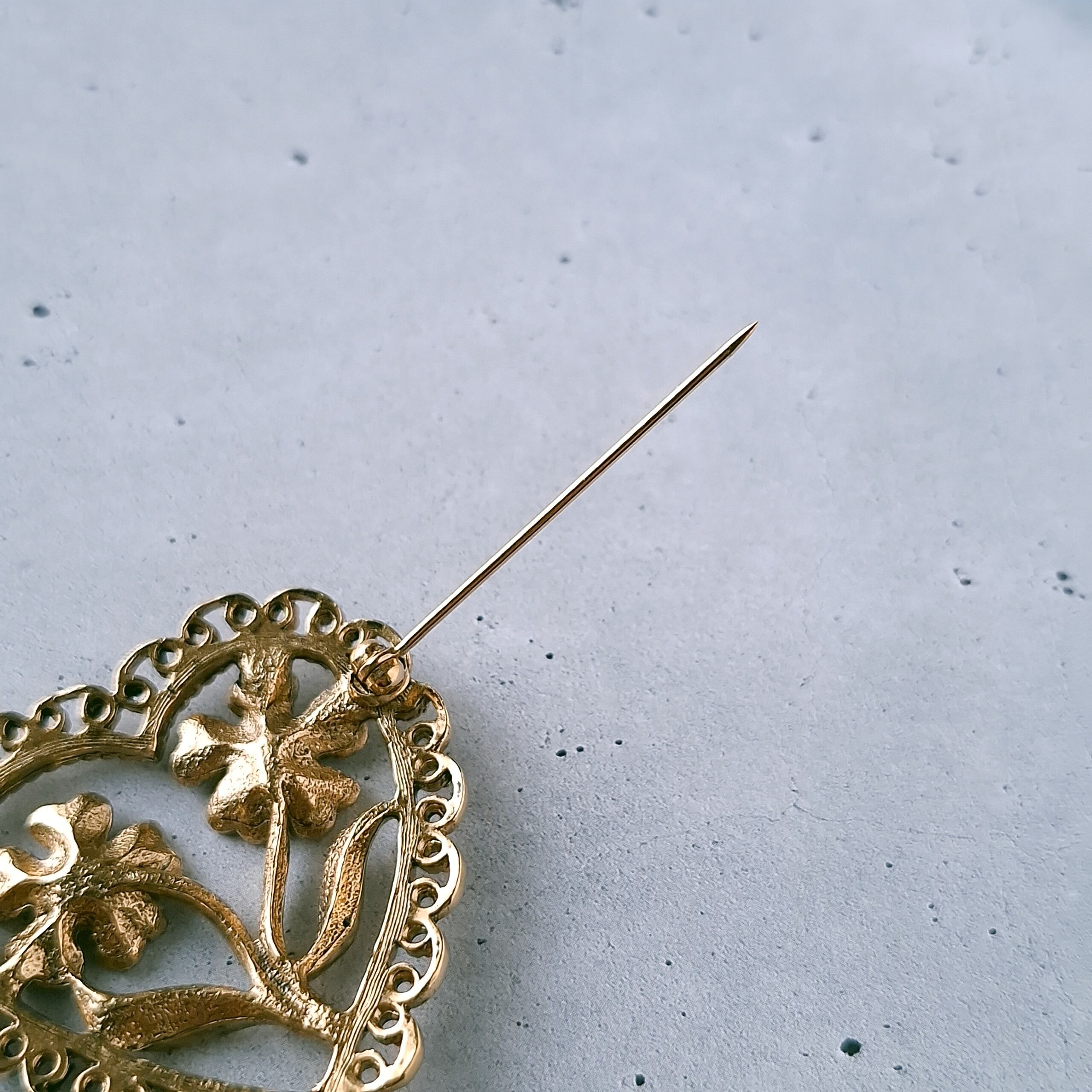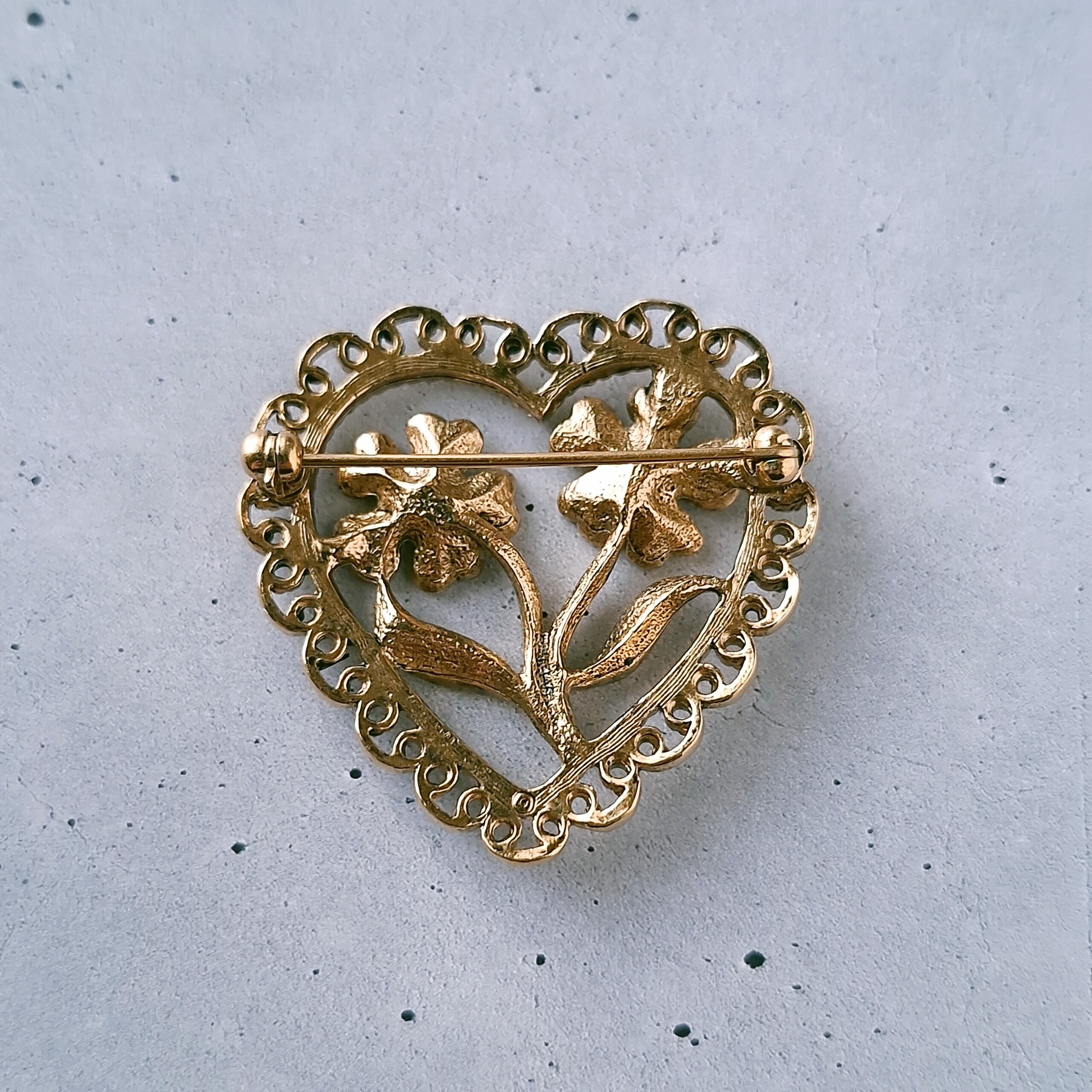 1886年アメリカのニューヨークにて小さな香水会社を創業、1971年に本格的にコスチュームジュエリーの製作を開始したAvon(エイボン)の1998年に販売された“ANTIQUED HEART PIN”の黒ずみ加工が施されたゴールドメタルのフェイクパールがあしらわれたフラワーをレースの付いたオープンハートで囲ったデザインのヴィンテージブローチです。