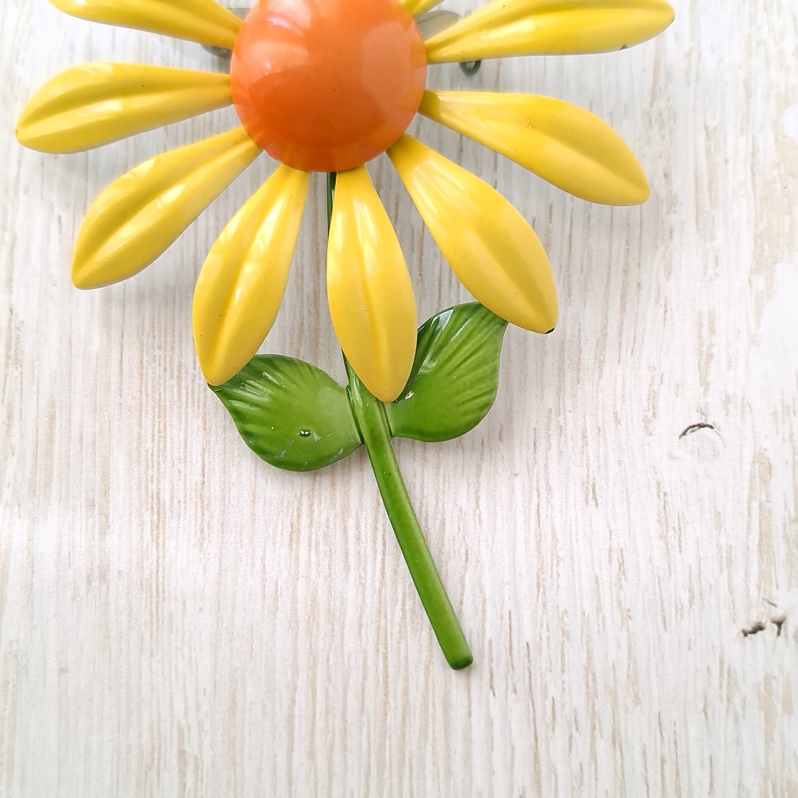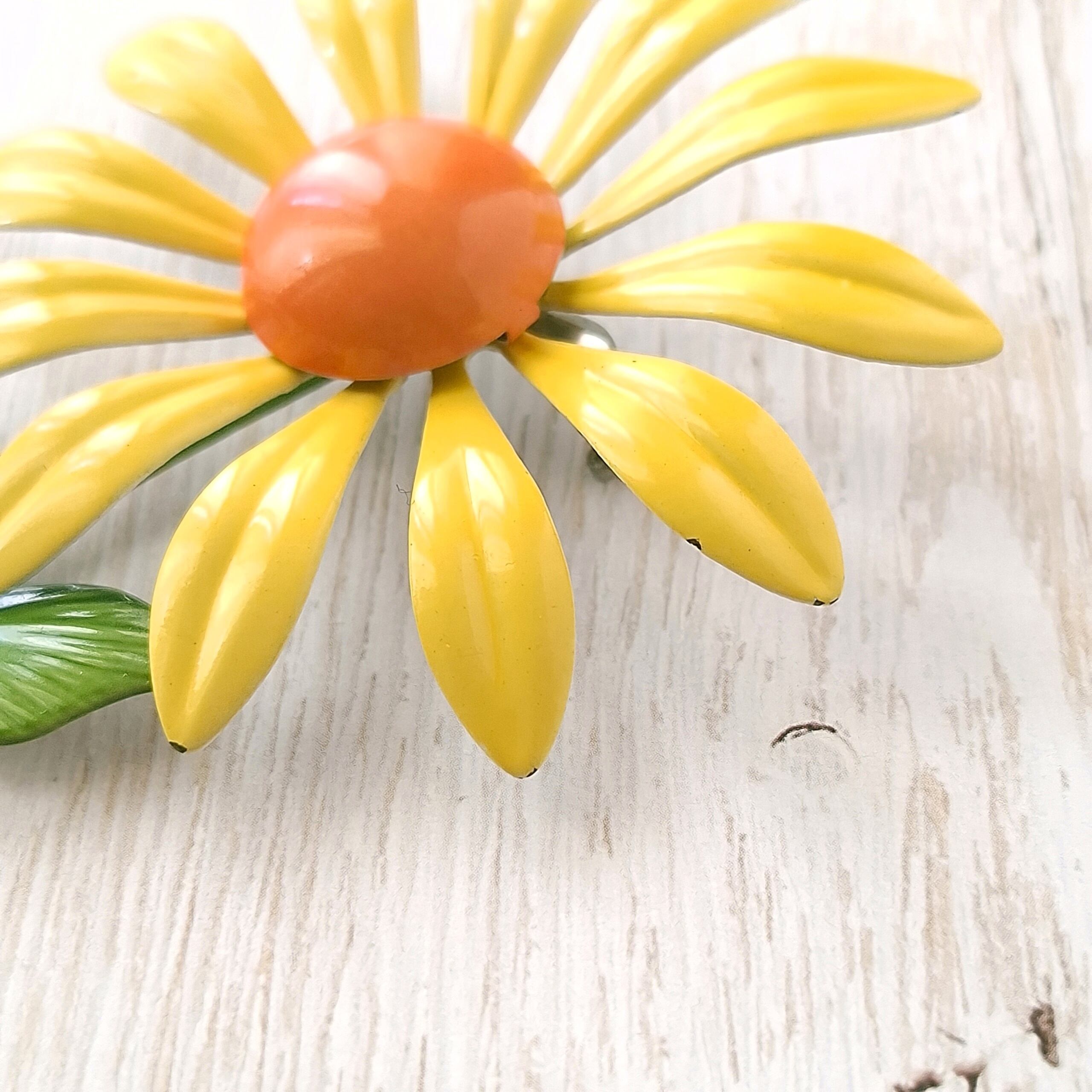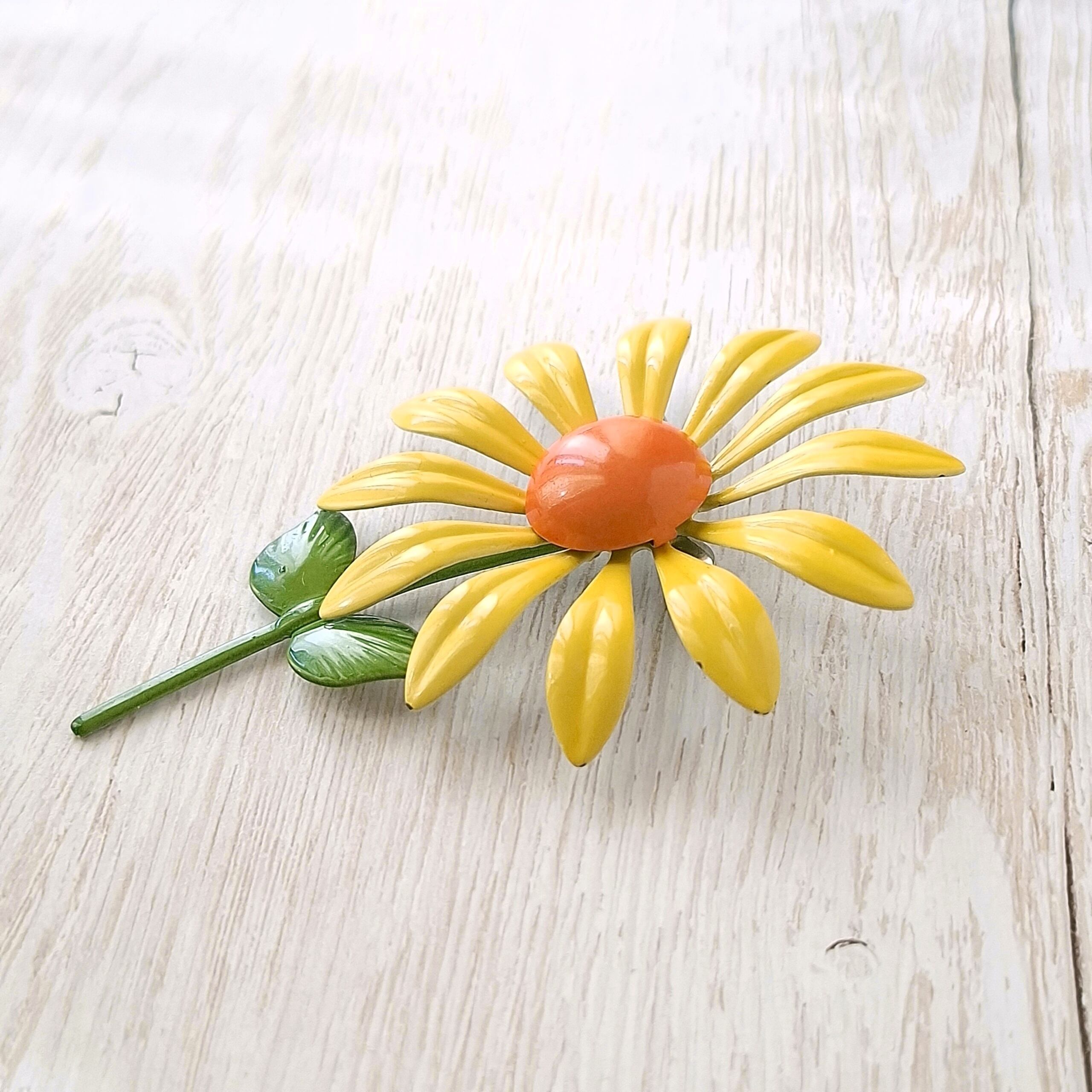 イエローとオレンジのエナメルで色付けされたフラワーのヴィンテージブローチです。