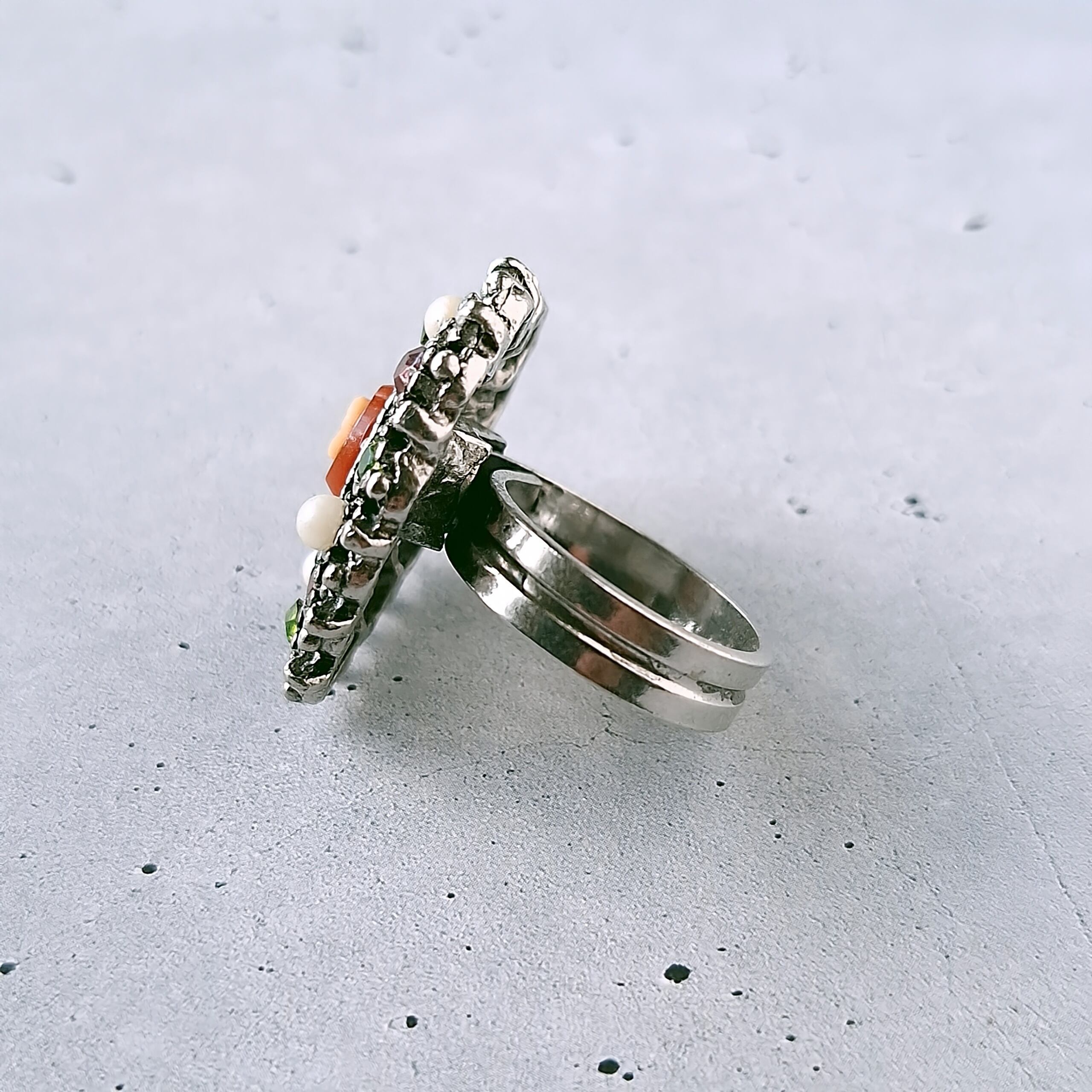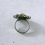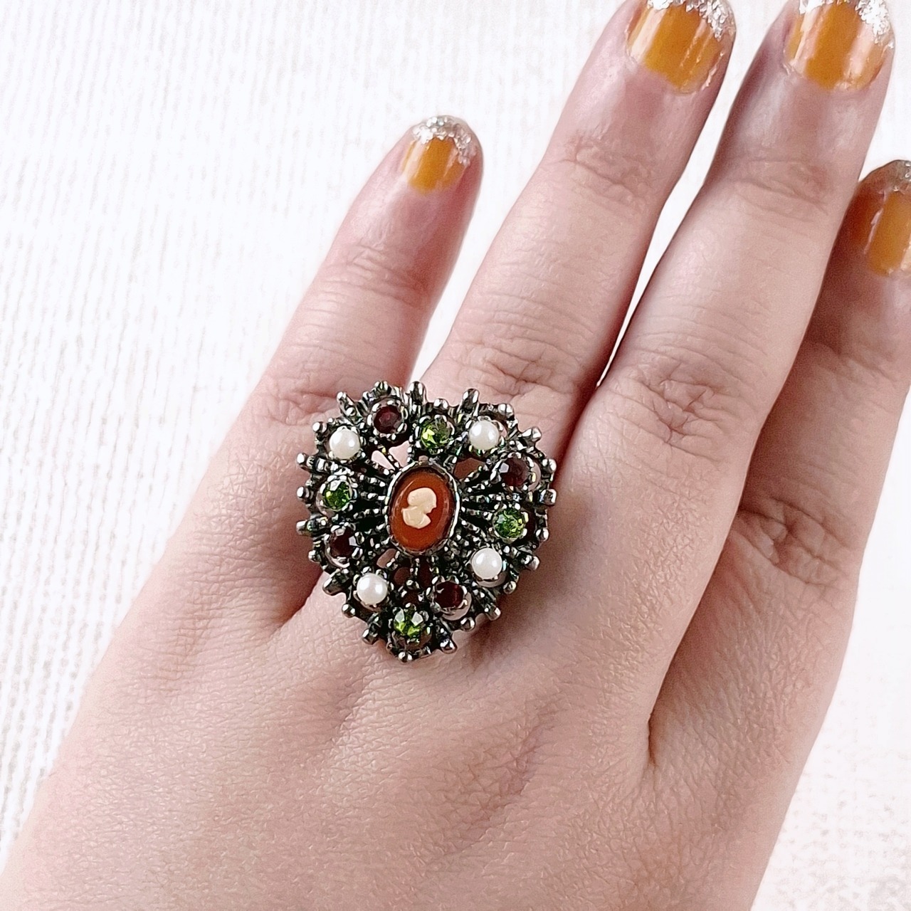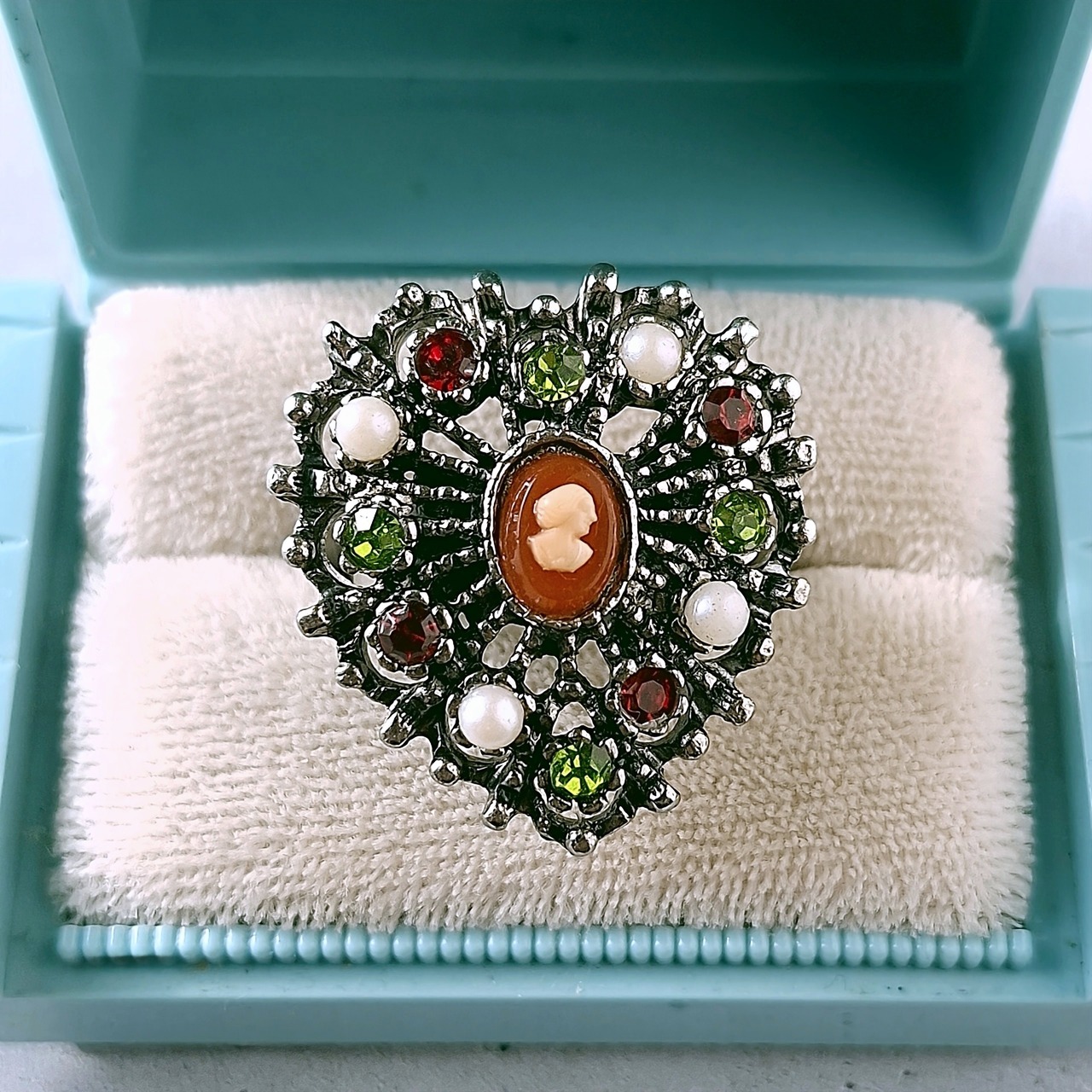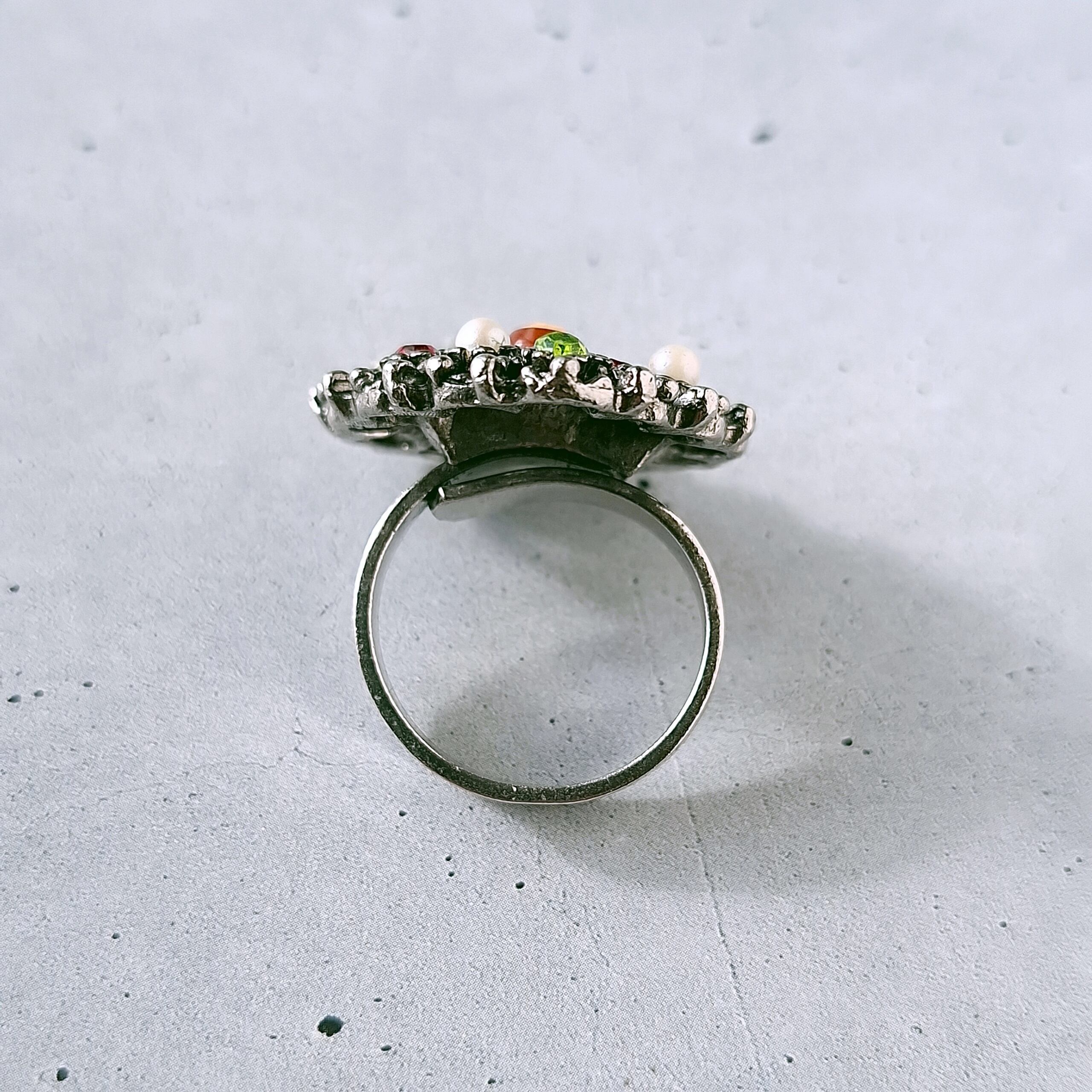 《Uncas Manufacturing Co》 silver openwork heart cameo faux pearl red lime green rhinestone vintage ring アンカス ヴィンテージリング