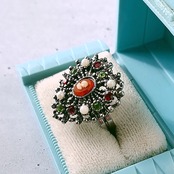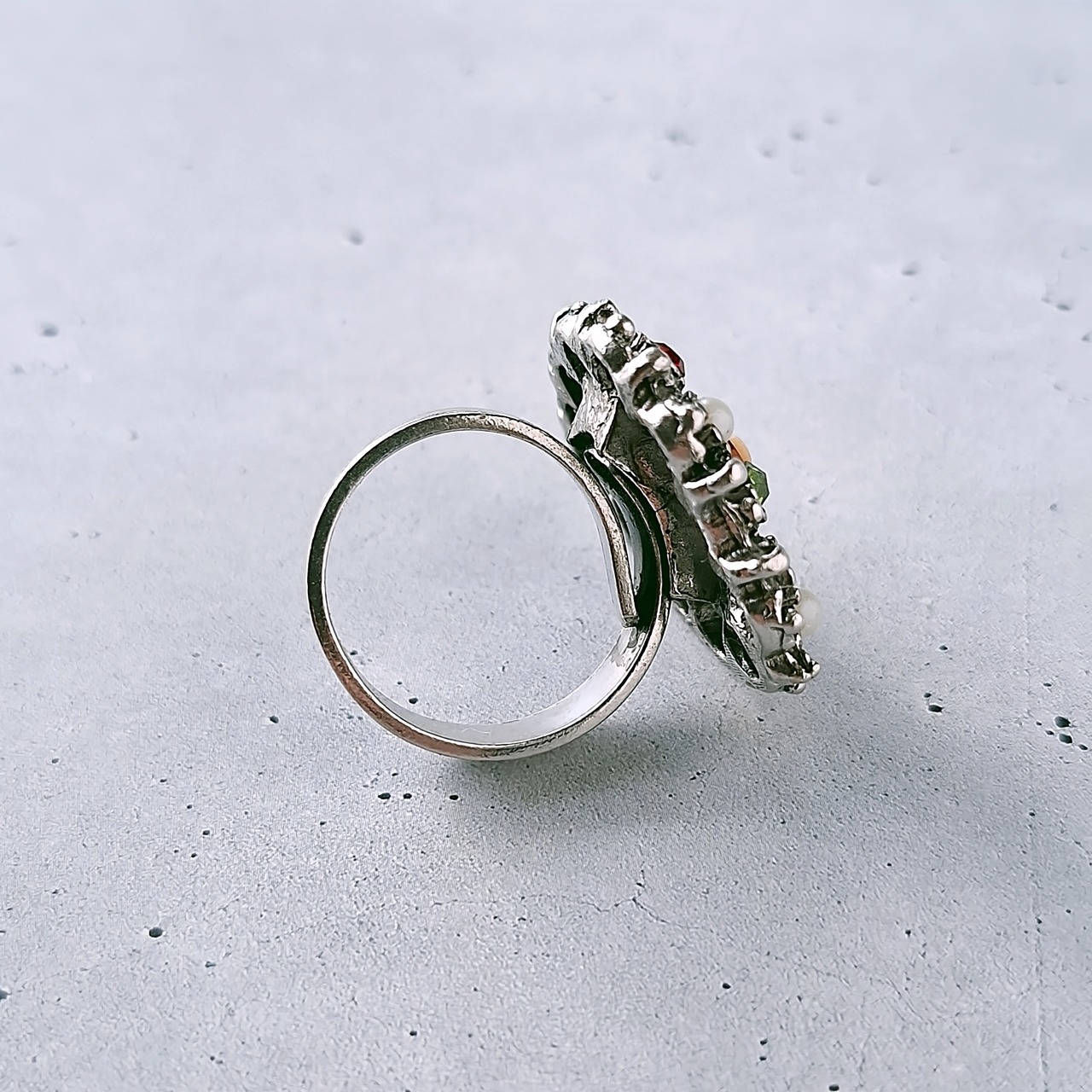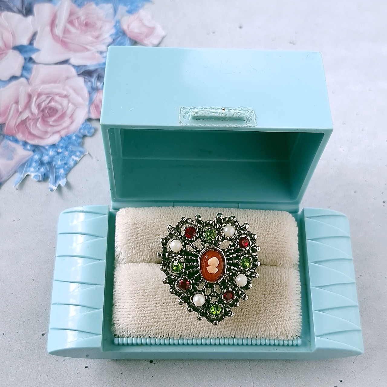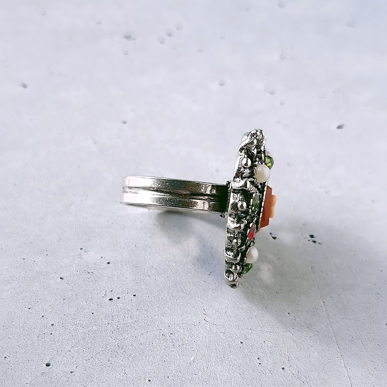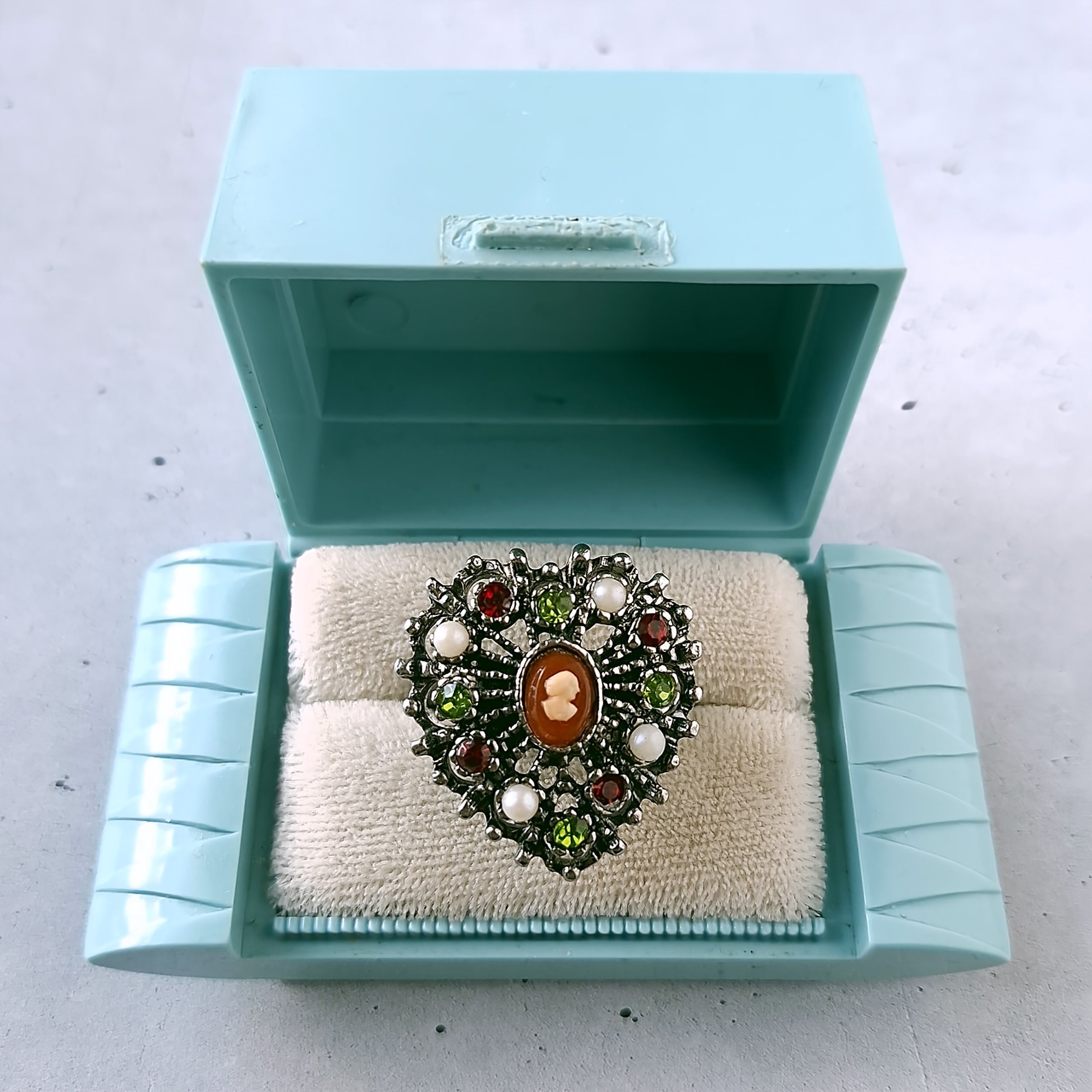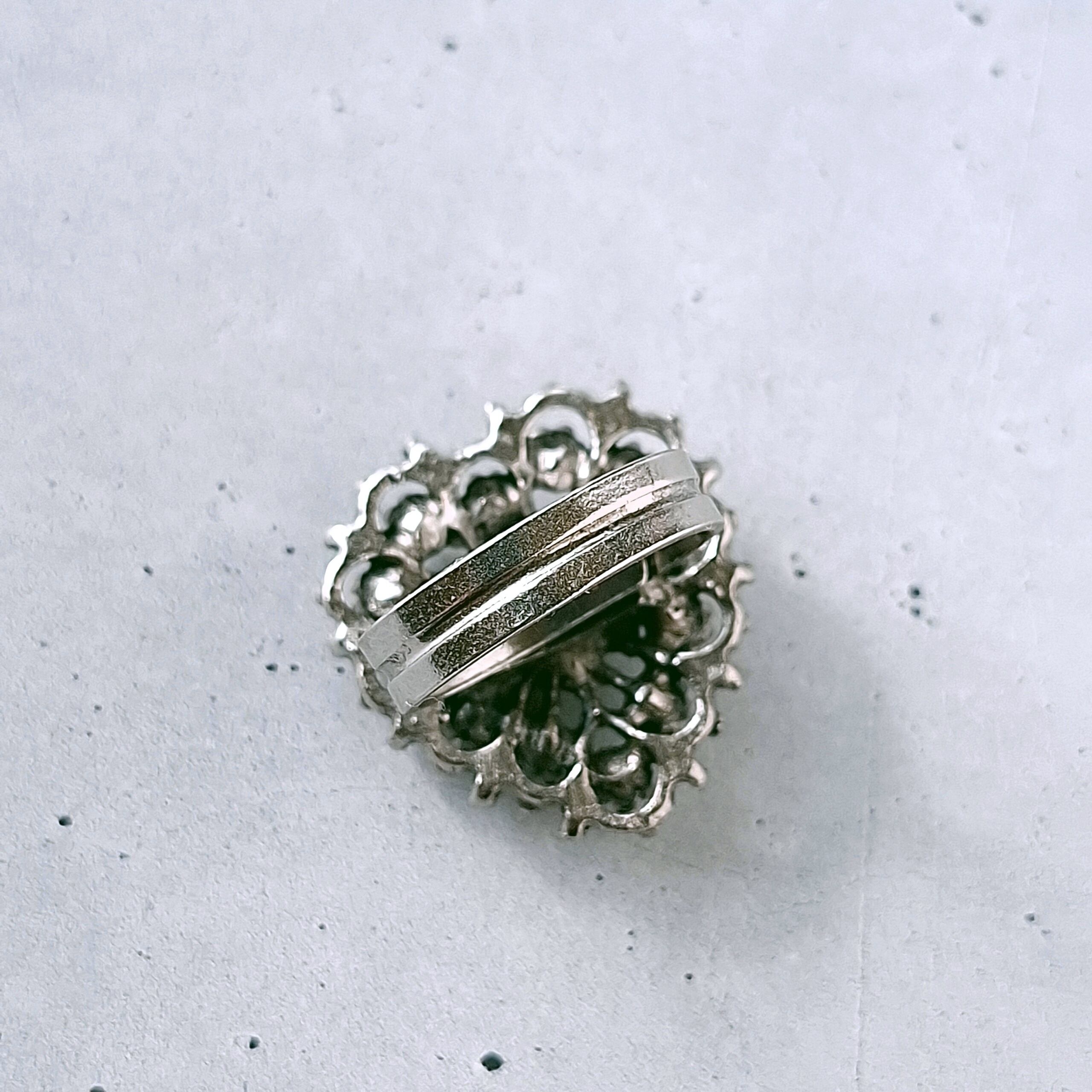《Uncas Manufacturing Co》 silver openwork heart cameo faux pearl red lime green rhinestone vintage ring アンカス ヴィンテージリング
