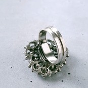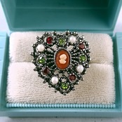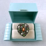 1911年にアメリカのロードアイランド州プロビデンスにて創業し、100年以上の歴史を持つジュエリーメーカーUncas Manufacturing Company(アンカス)の黒ずみ加工が施されたオープンワークのシルバーメタルのハートに樹脂製のカメオ、フェイクパール、レッドとライムグリーンのラインストーンがあしらわれたヴィンテージリングです。