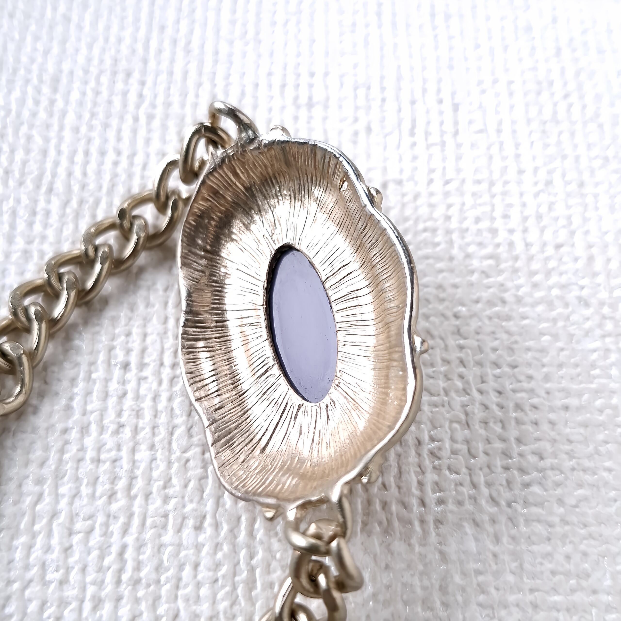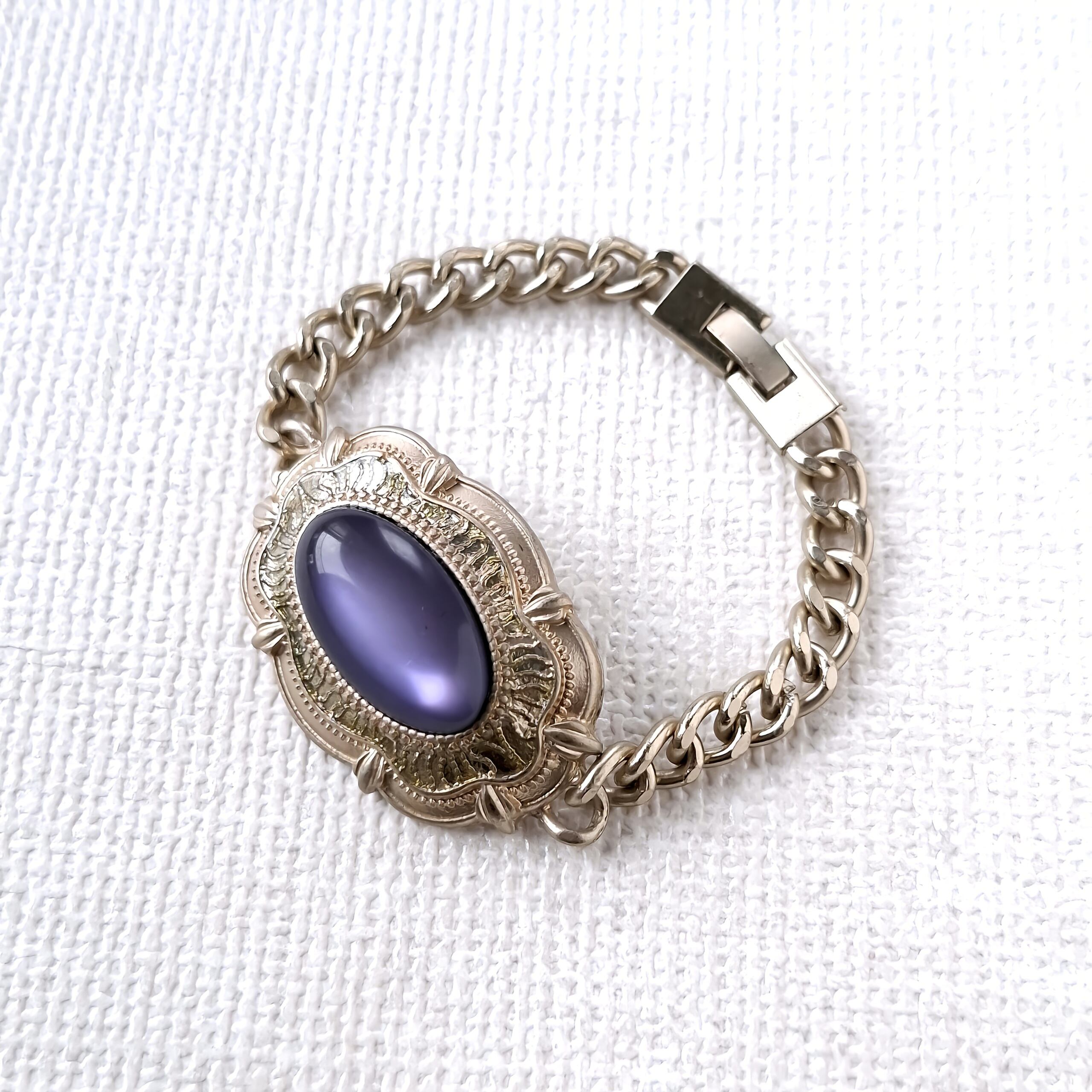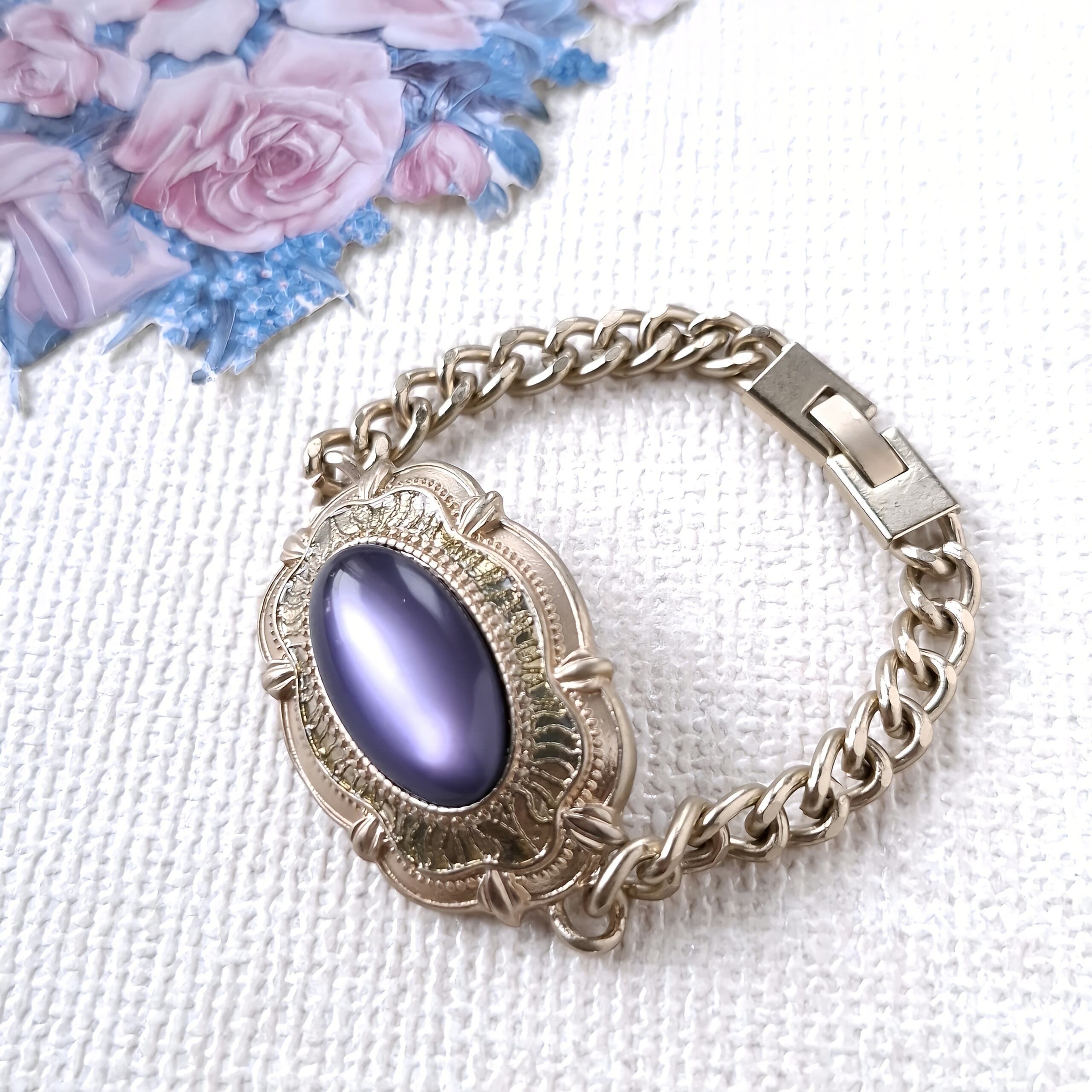 マットなゴールドメタルにネイビーとパープルの間のような色合いのムーングロウカボションがあしらわれたヴィクトリアデザインのヴィンテージブレスレットです。