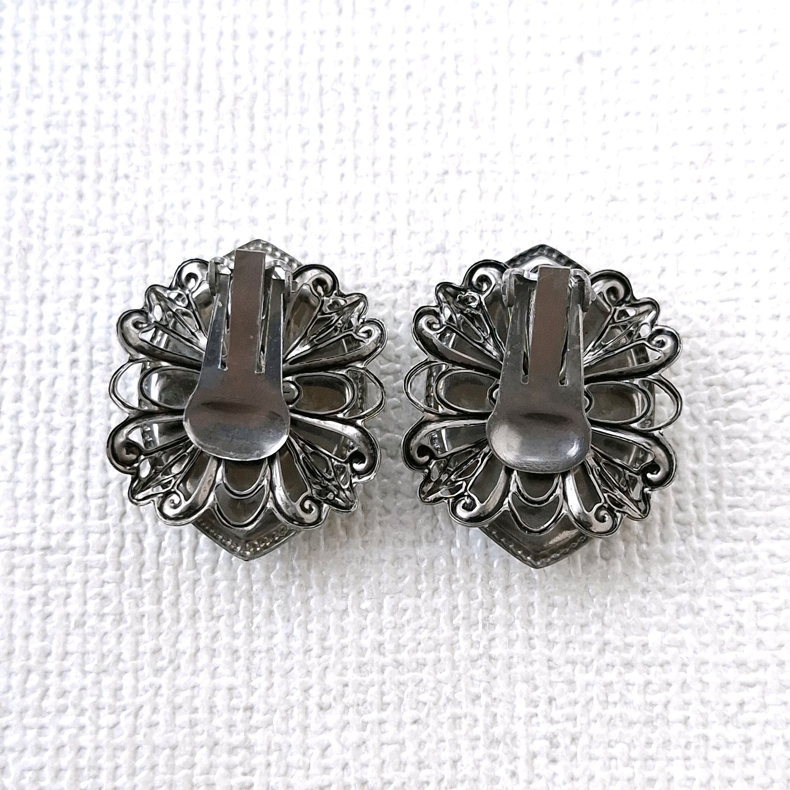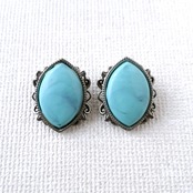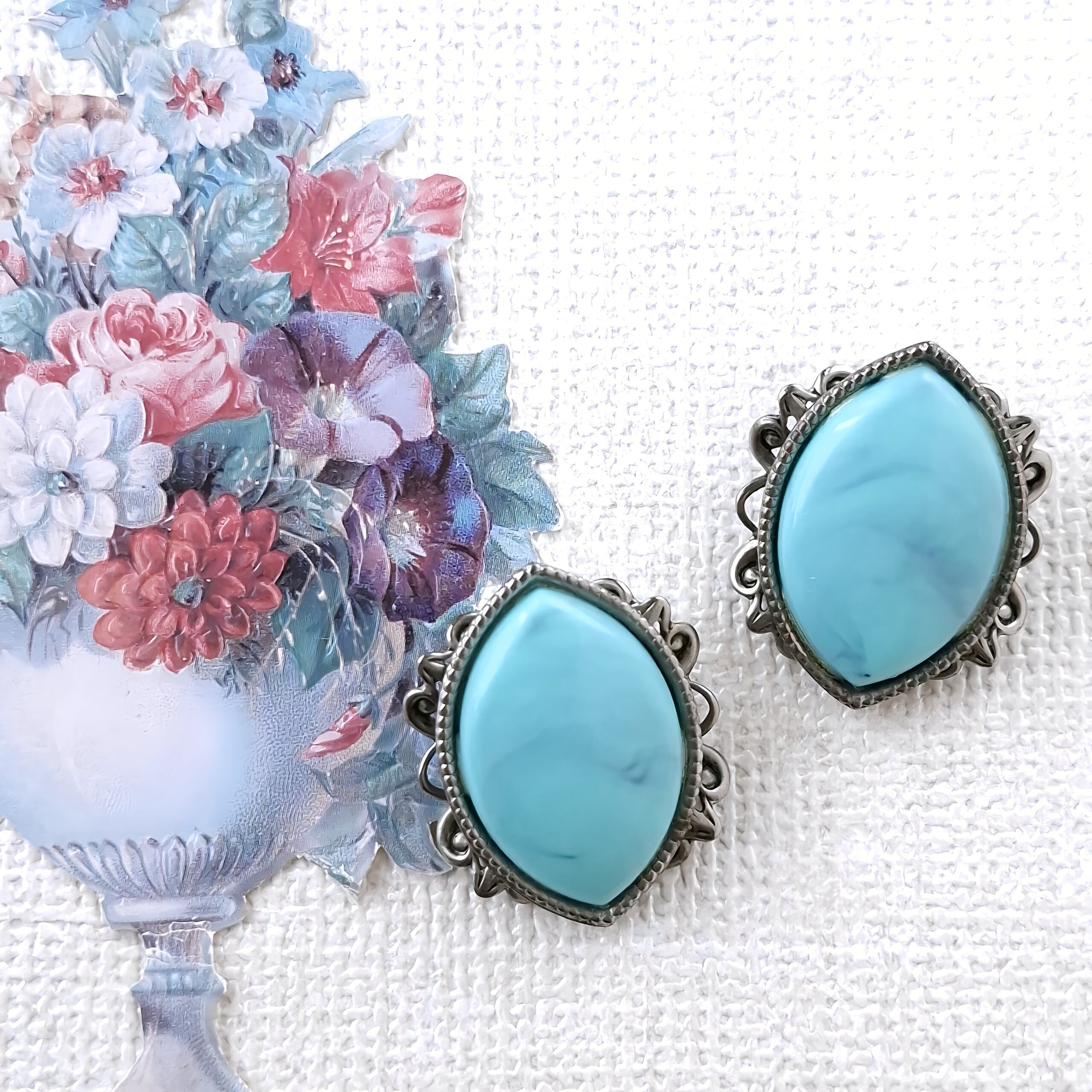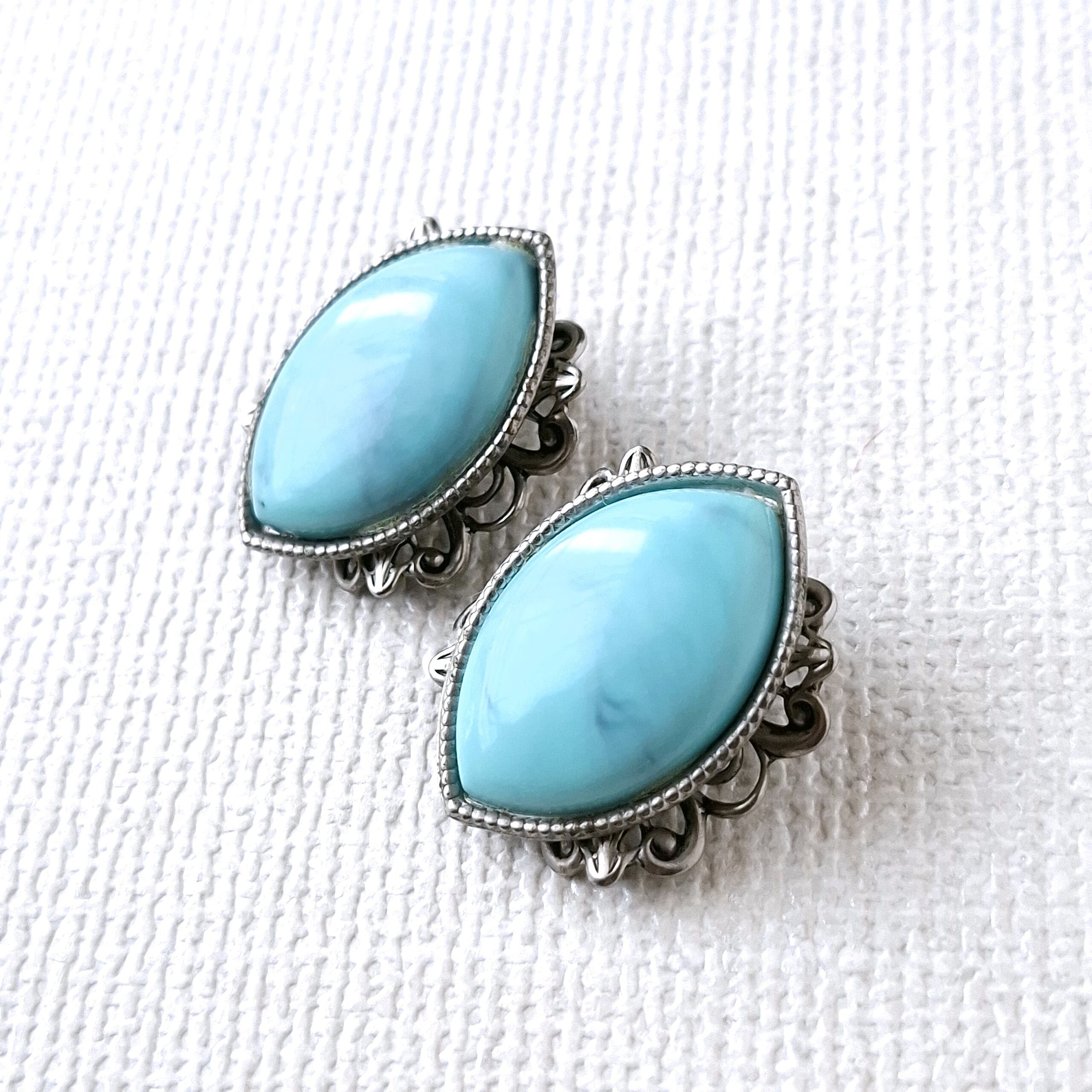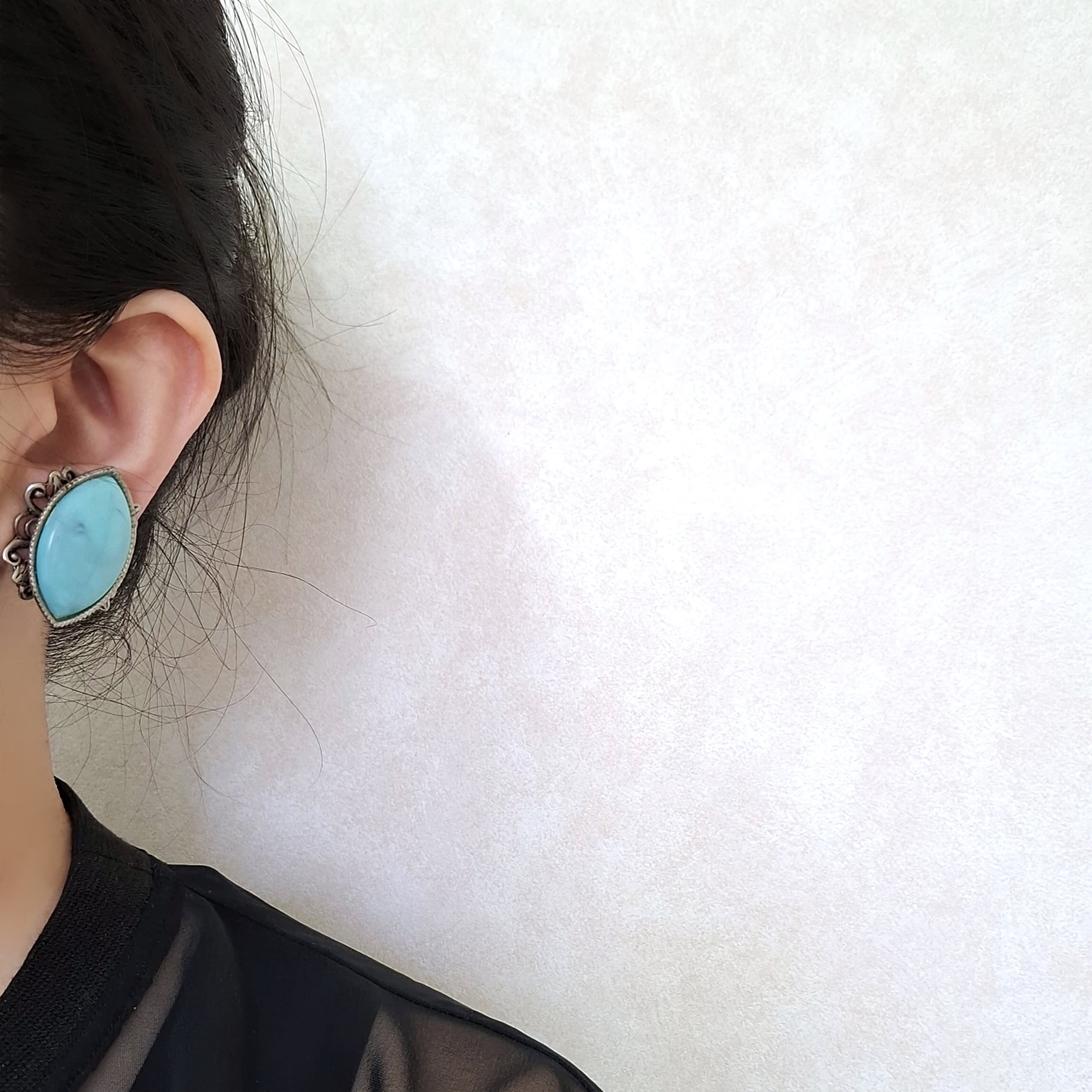マーキス型のフェイクターコイズプラスチックの横からシルバーの透かしメタルがレース状にはみ出すようにデザインされたヴィンテージイヤリングです。