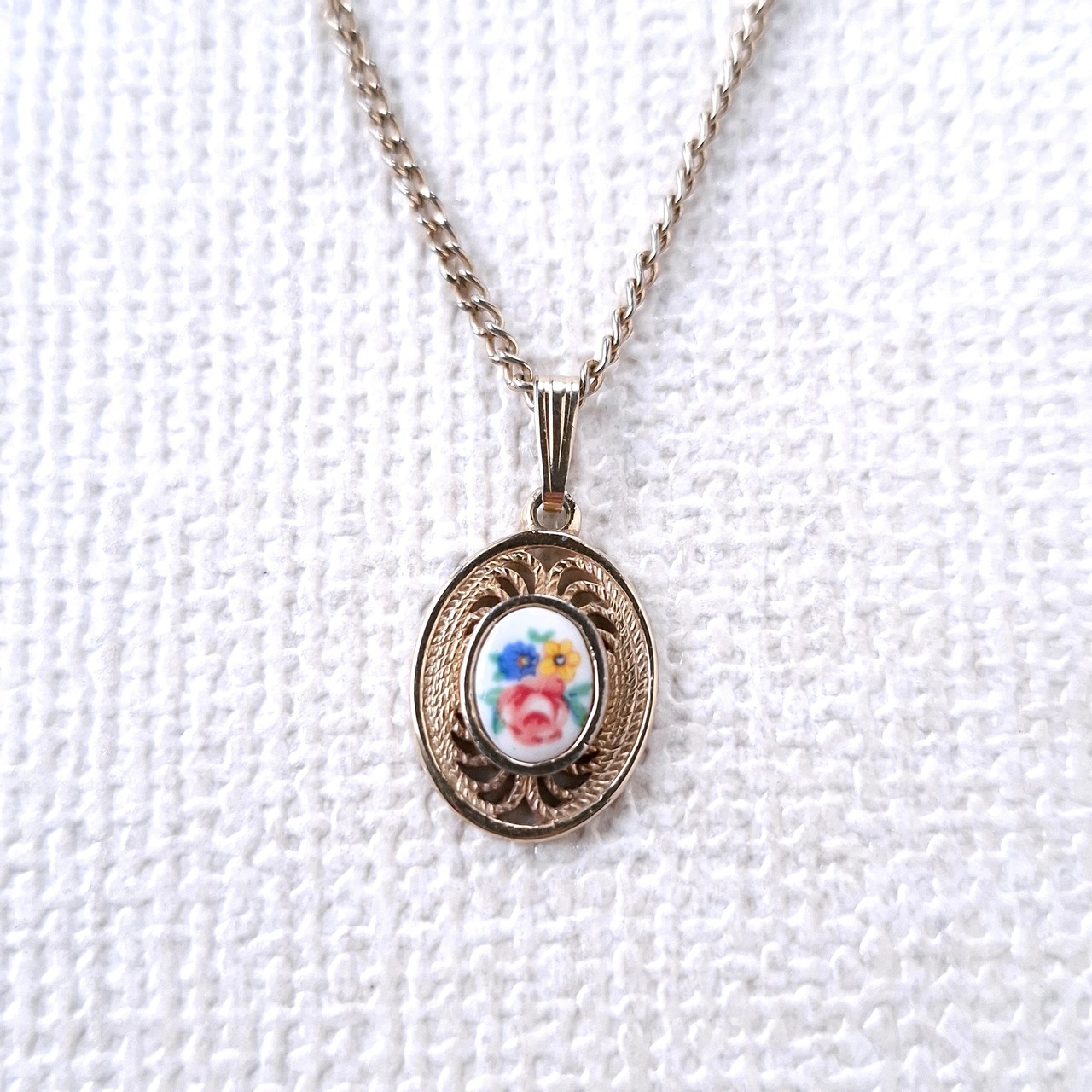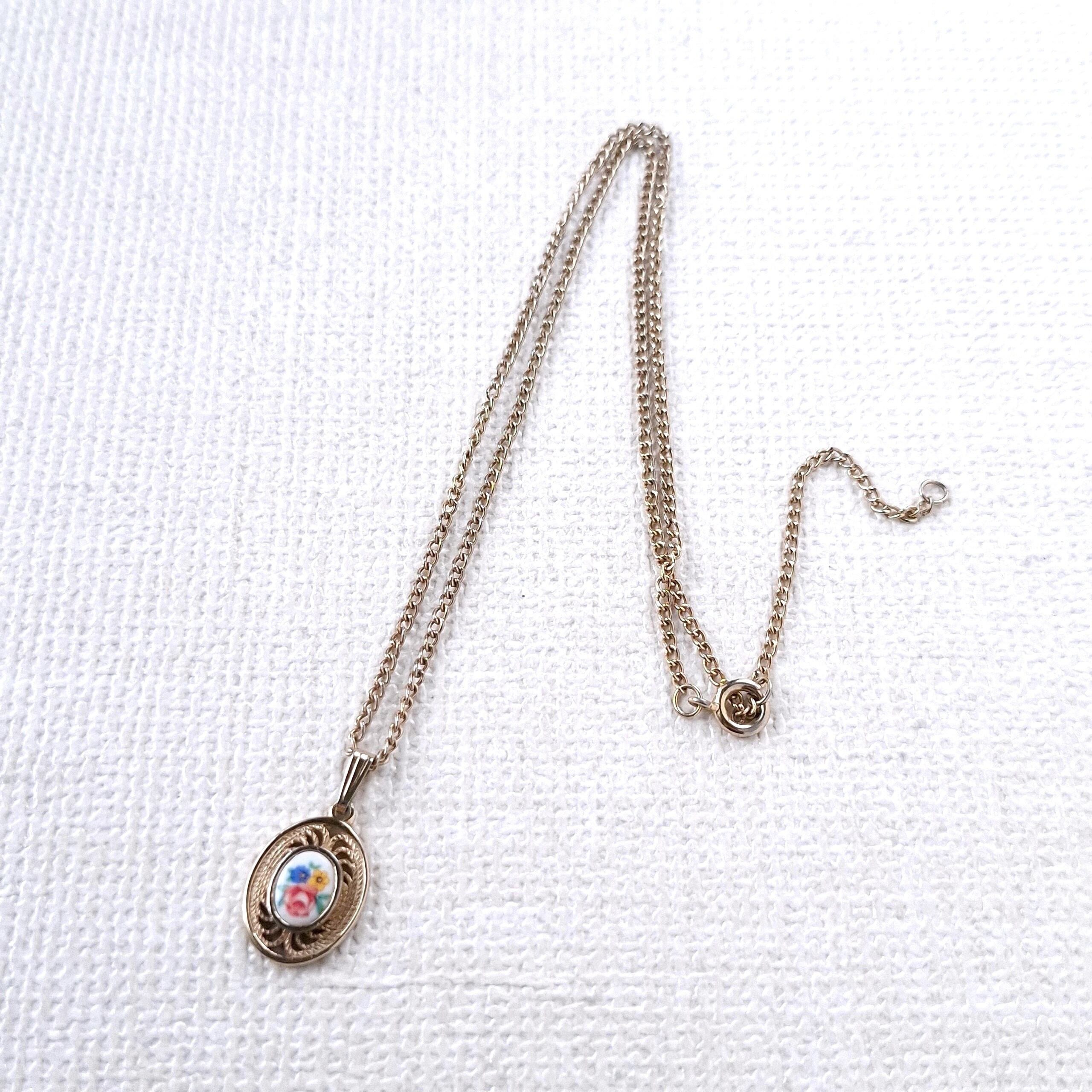 1949年にニューヨークで創業したSarah Coventry(サラコベントリー)の1975年に販売された“Victorian Bouquet”のゴールドメタルのフィリグリーにフラワーが描かれたホワイトのポーセリンカボションがあしらわれたヴィンテージネックレスです。