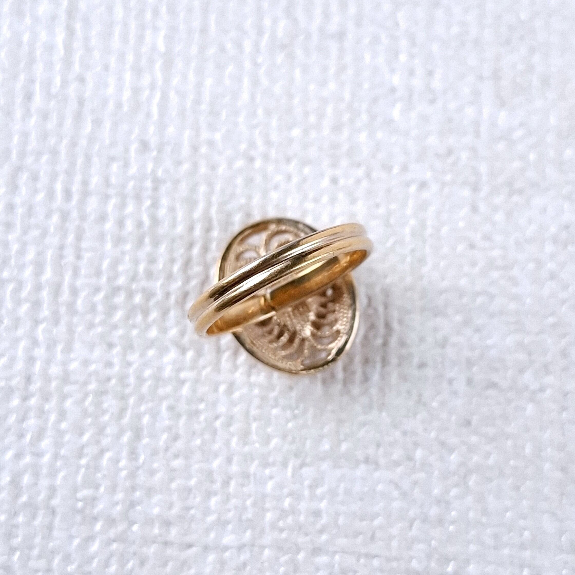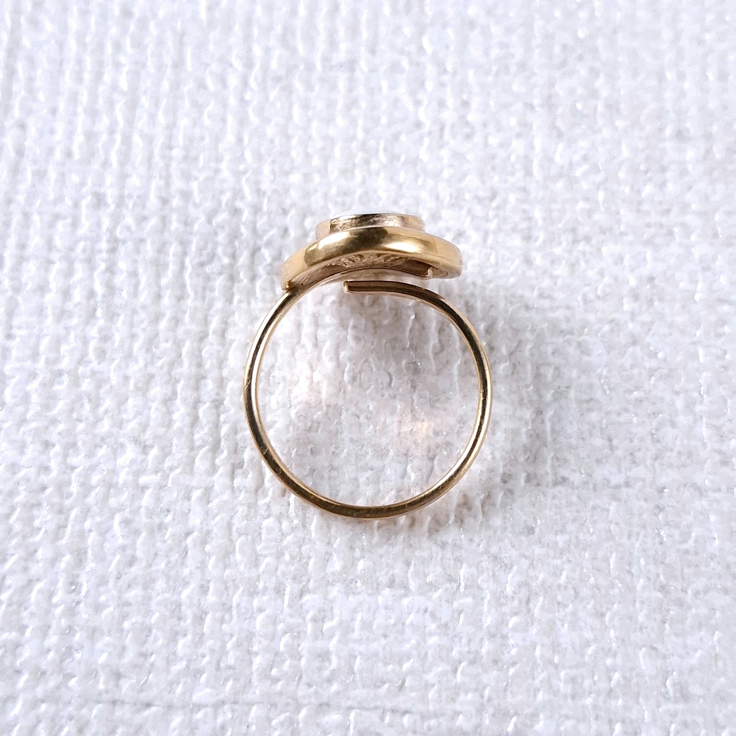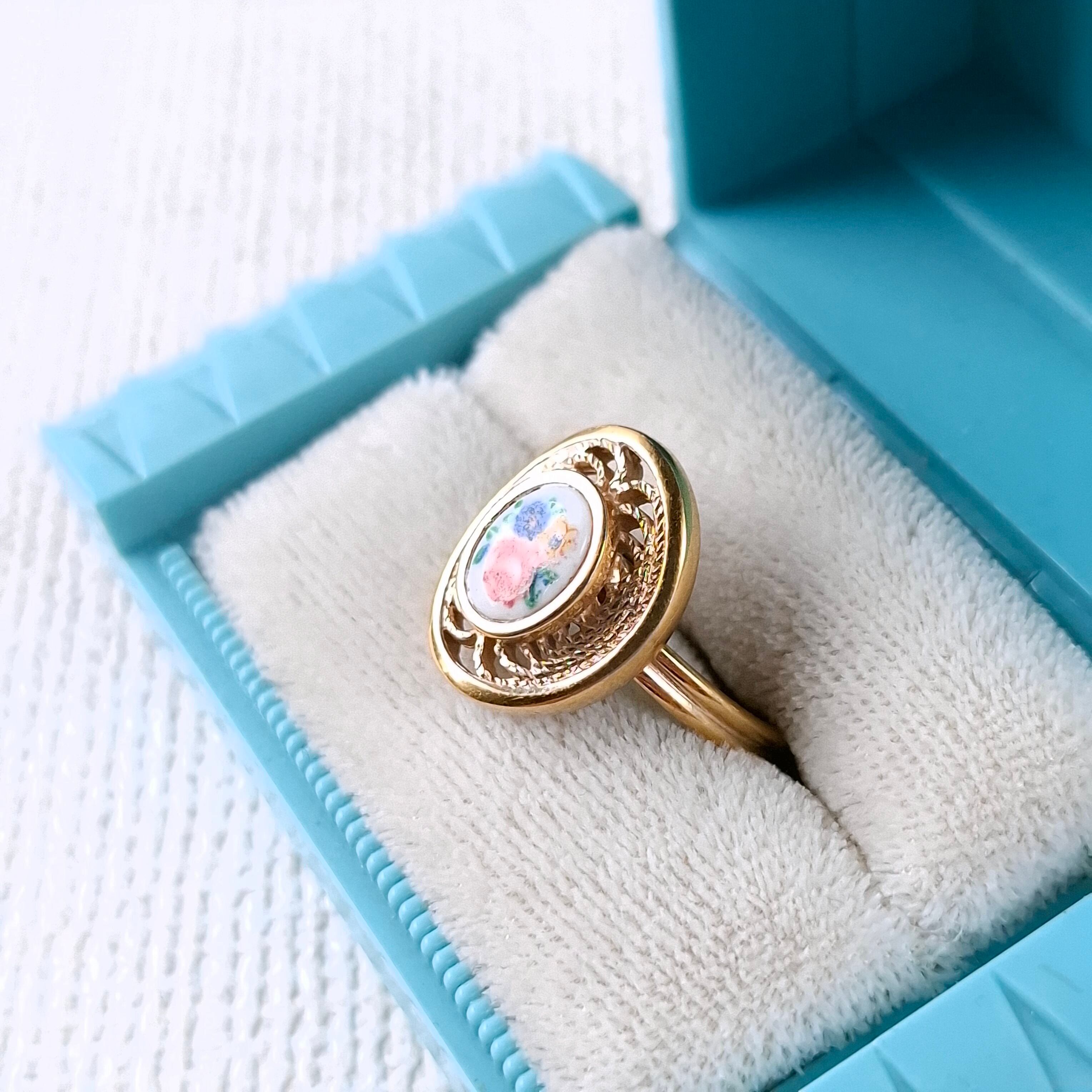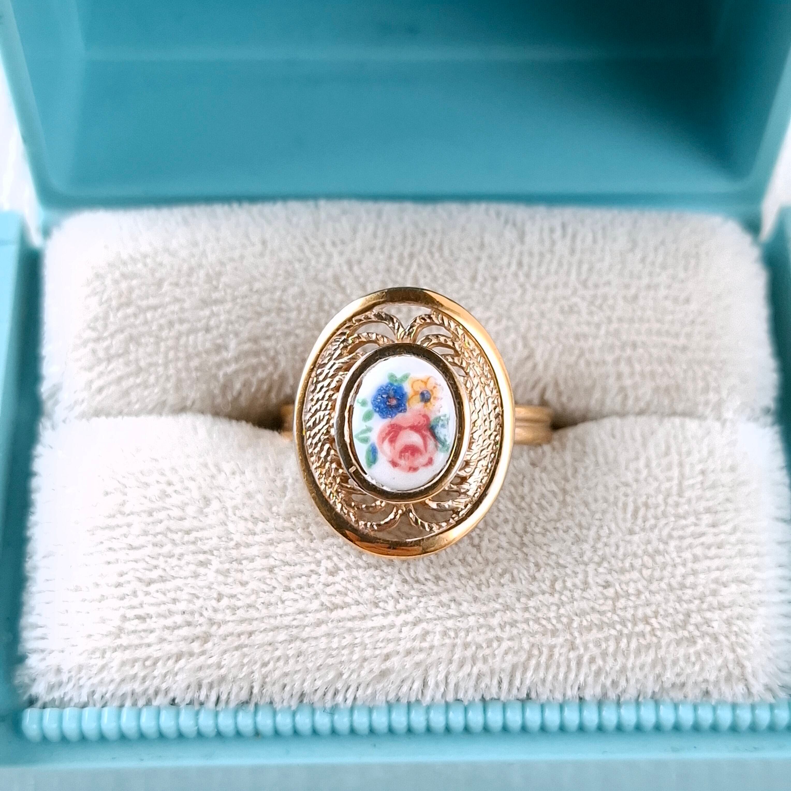 1949年にニューヨークで創業したSarah Coventry(サラコベントリー)の1975年に販売された“Victorian Bouquet”のゴールドメタルのフィリグリーにフラワーが描かれたホワイトのポーセリンカボションがあしらわれたヴィンテージリングです。