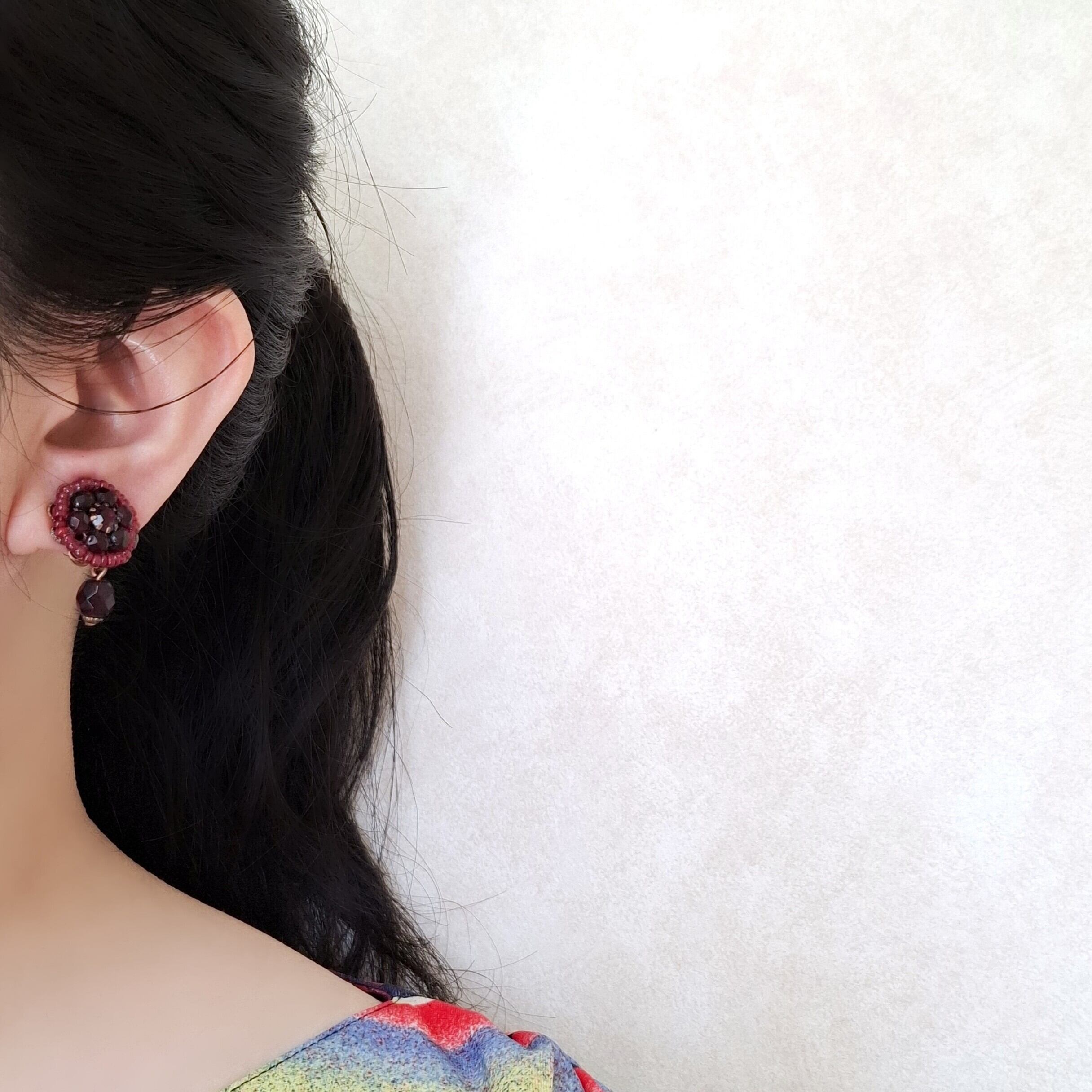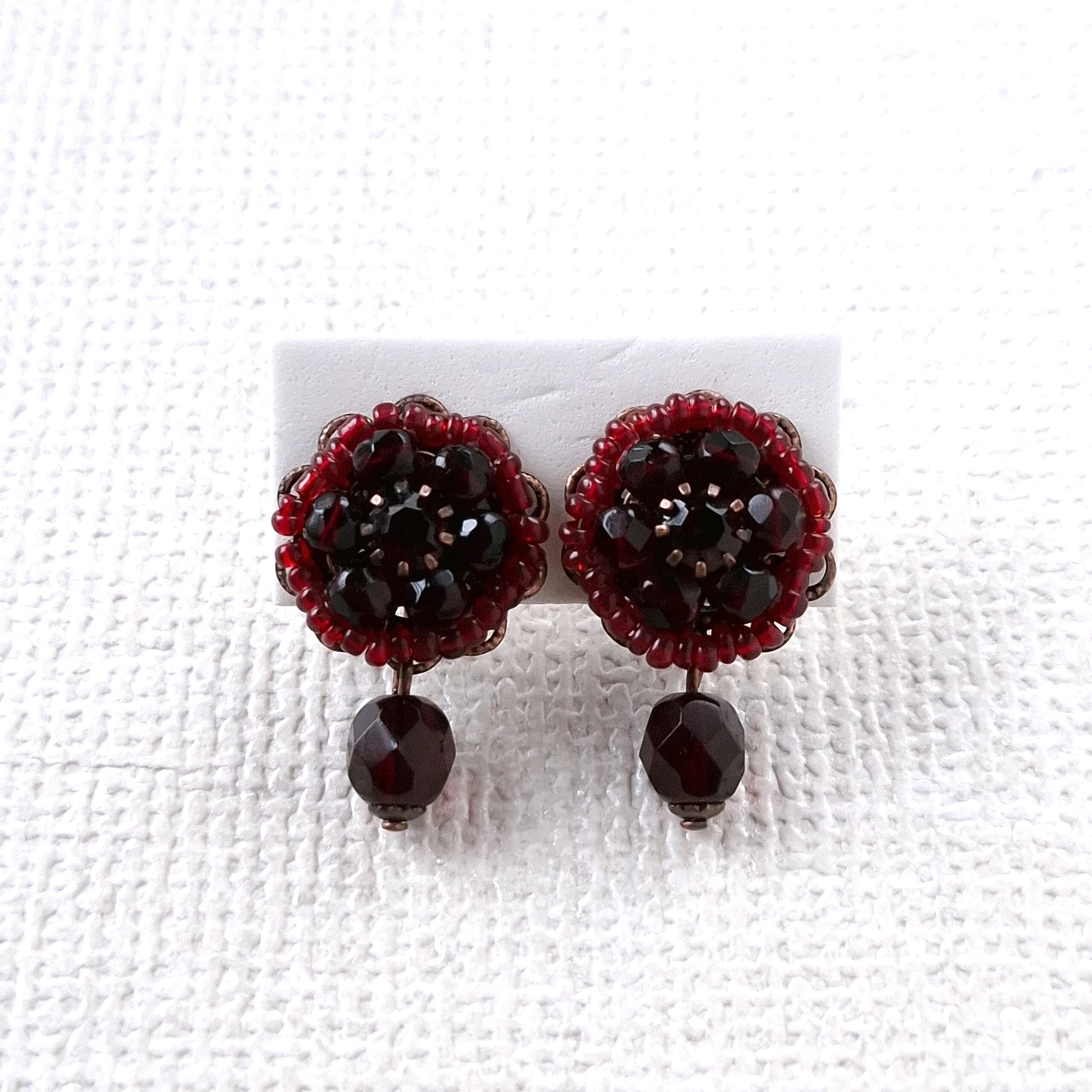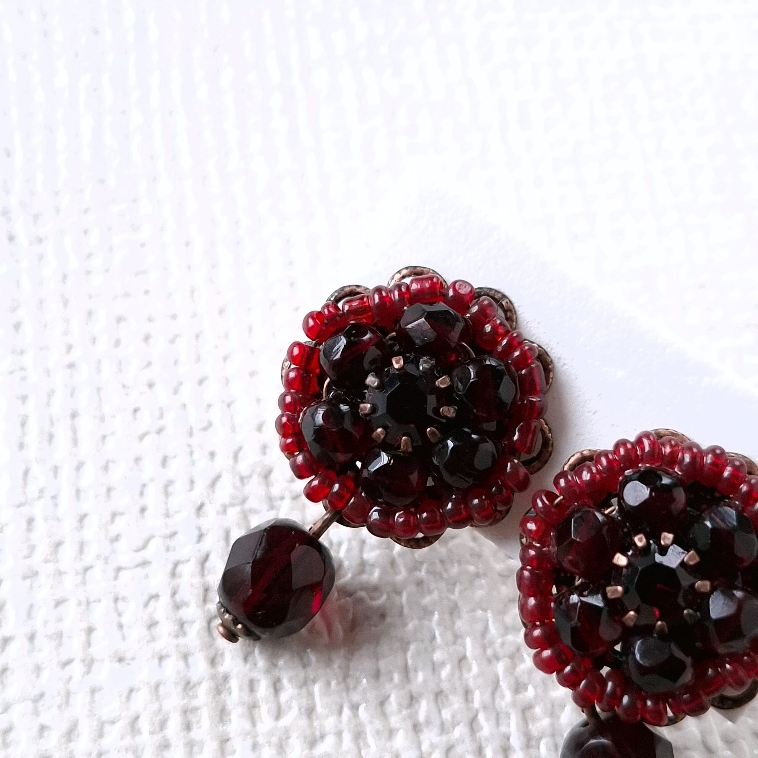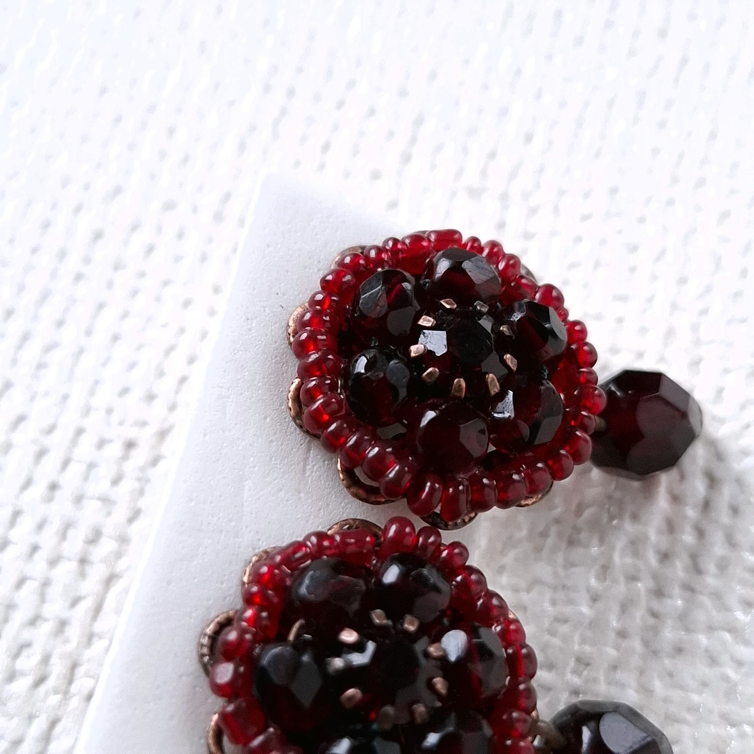 1886年アメリカのニューヨークにて小さな香水会社を創業、1971年に本格的にコスチュームジュエリーの製作を開始したAvon(エイボン)の2000年に販売された“BEADED BUTTON”のレッドのガラスビーズとラインストーンのクラスターデザインのヴィンテージイヤリングです。