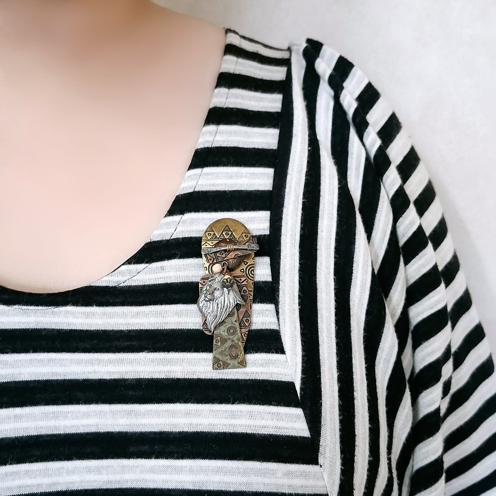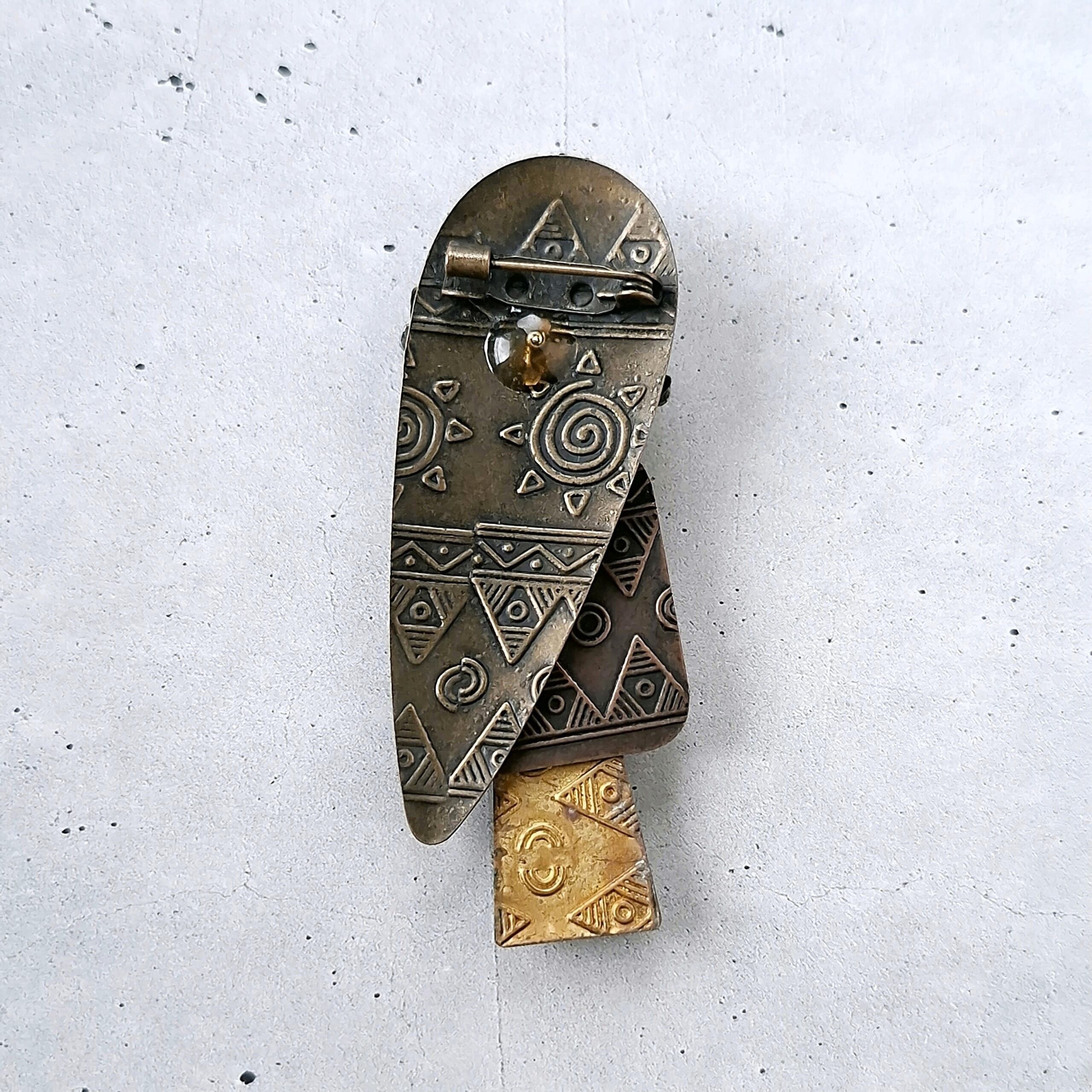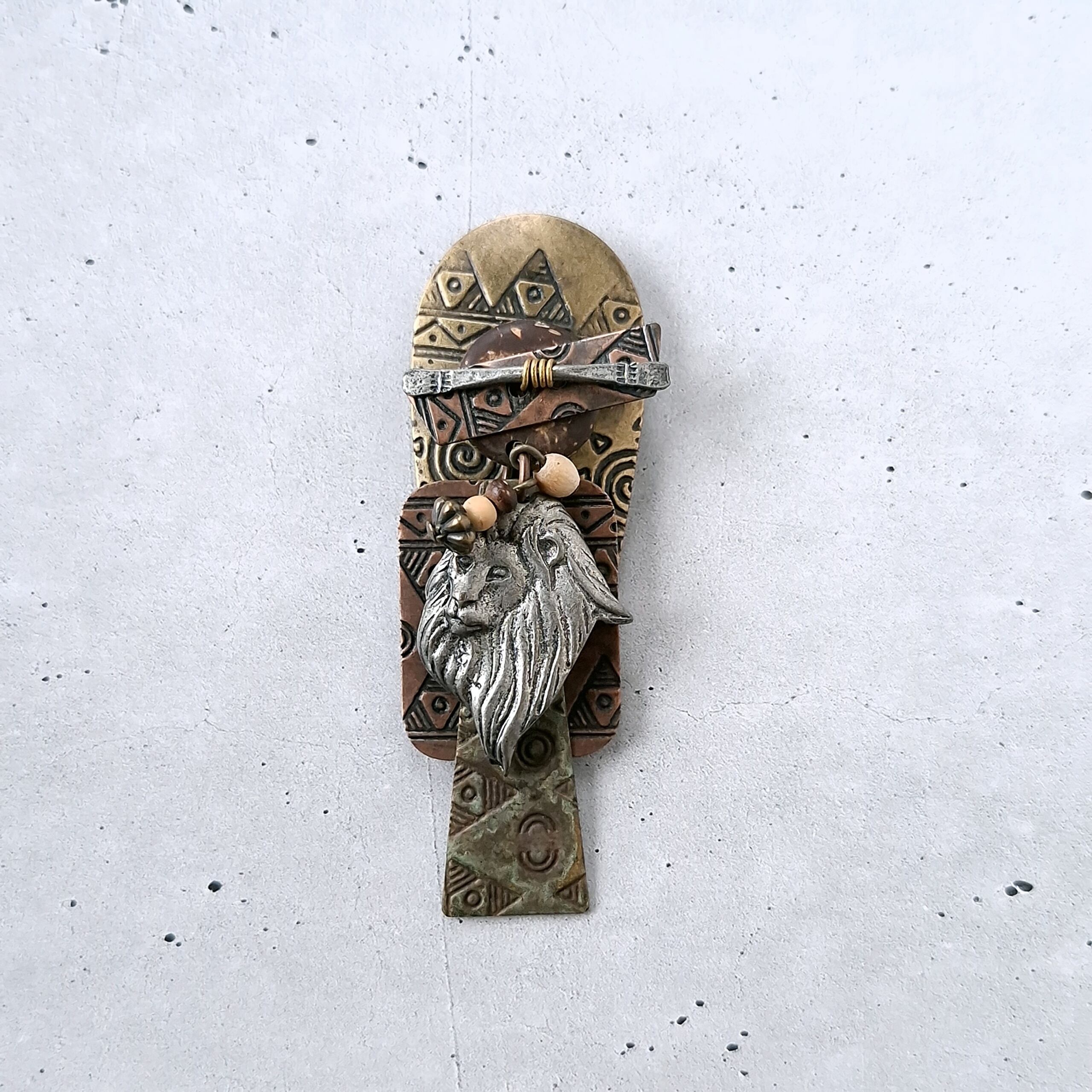 african tribal pattern brass lion wood beads vintage brooch ヴィンテージブローチ