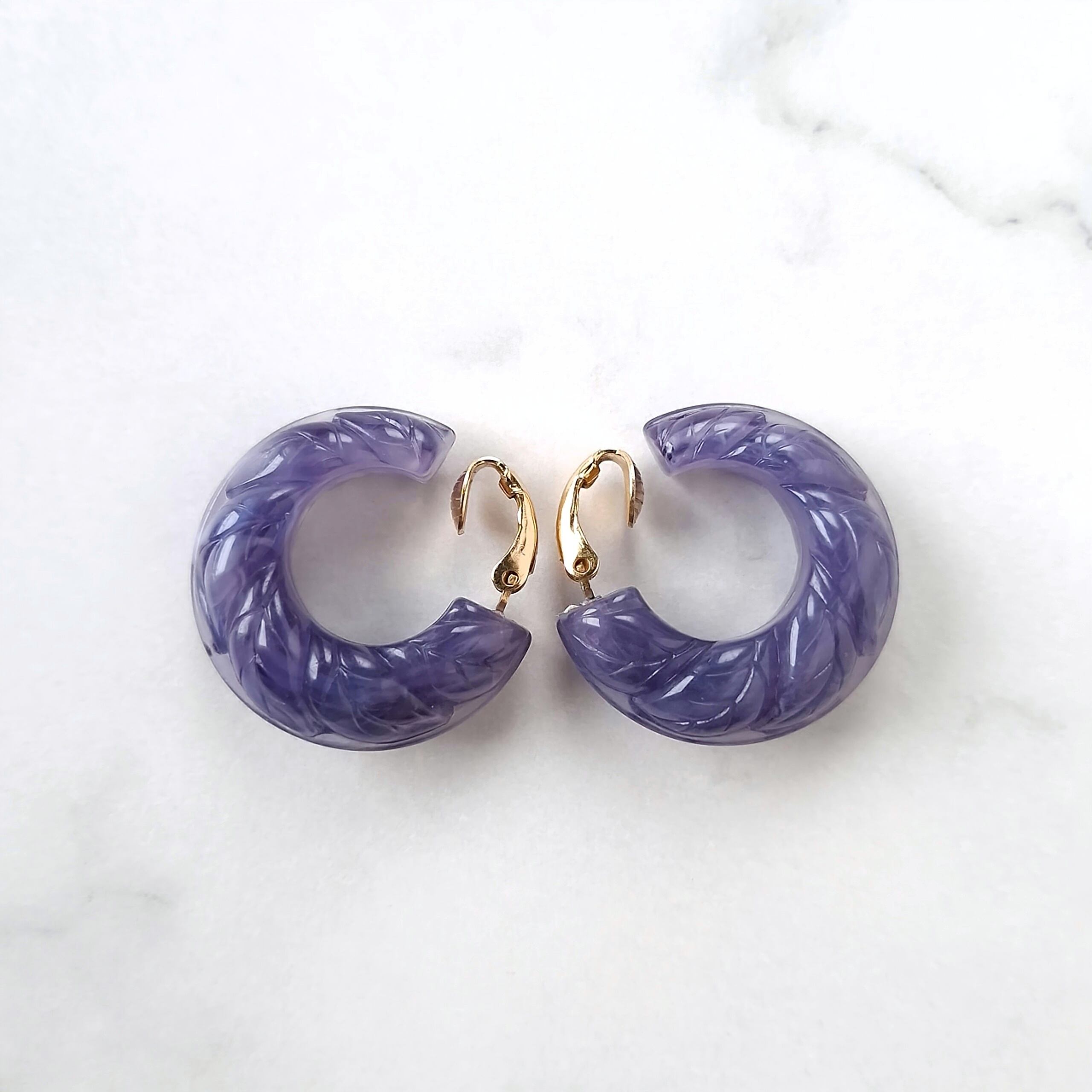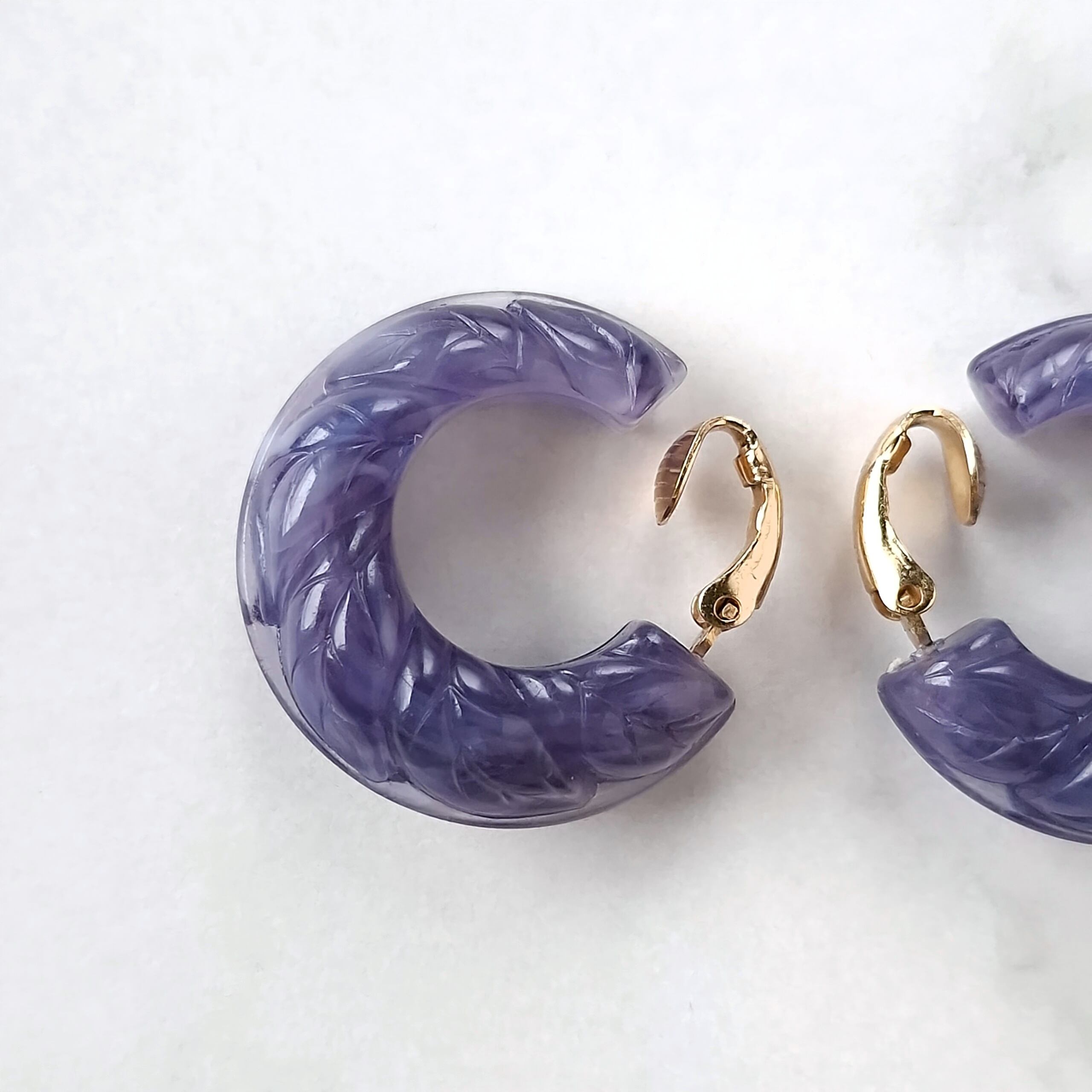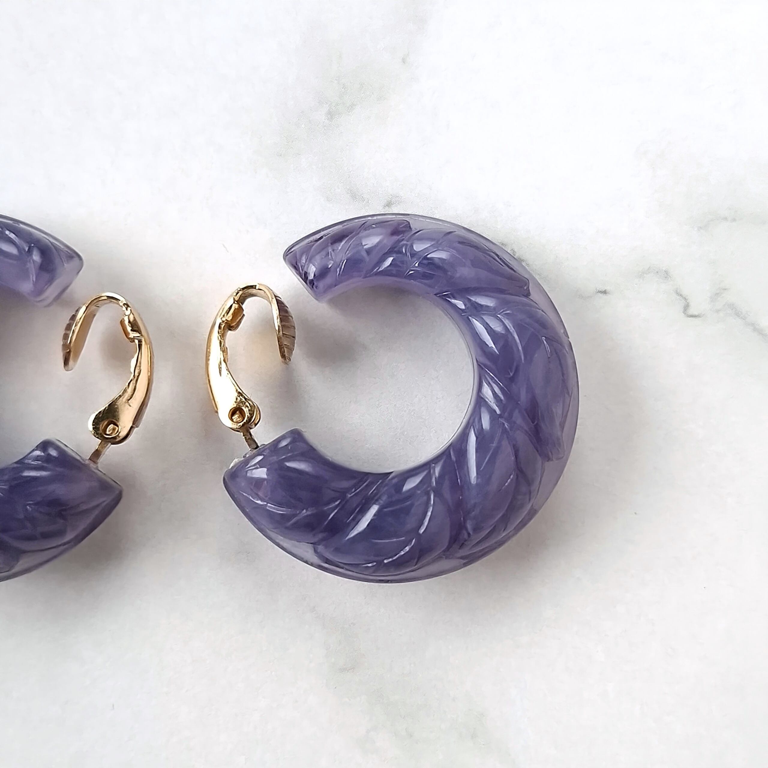 1886年アメリカのニューヨークにて小さな香水会社を創業、1971年に本格的にコスチュームジュエリーの製作を開始したAvon(エイボン)の1982年に販売された“FLORAL HOOP”のアメジストトーンのプラスチックにリーフの模様が刻まれたフープタイプのヴィンテージイヤリングです。