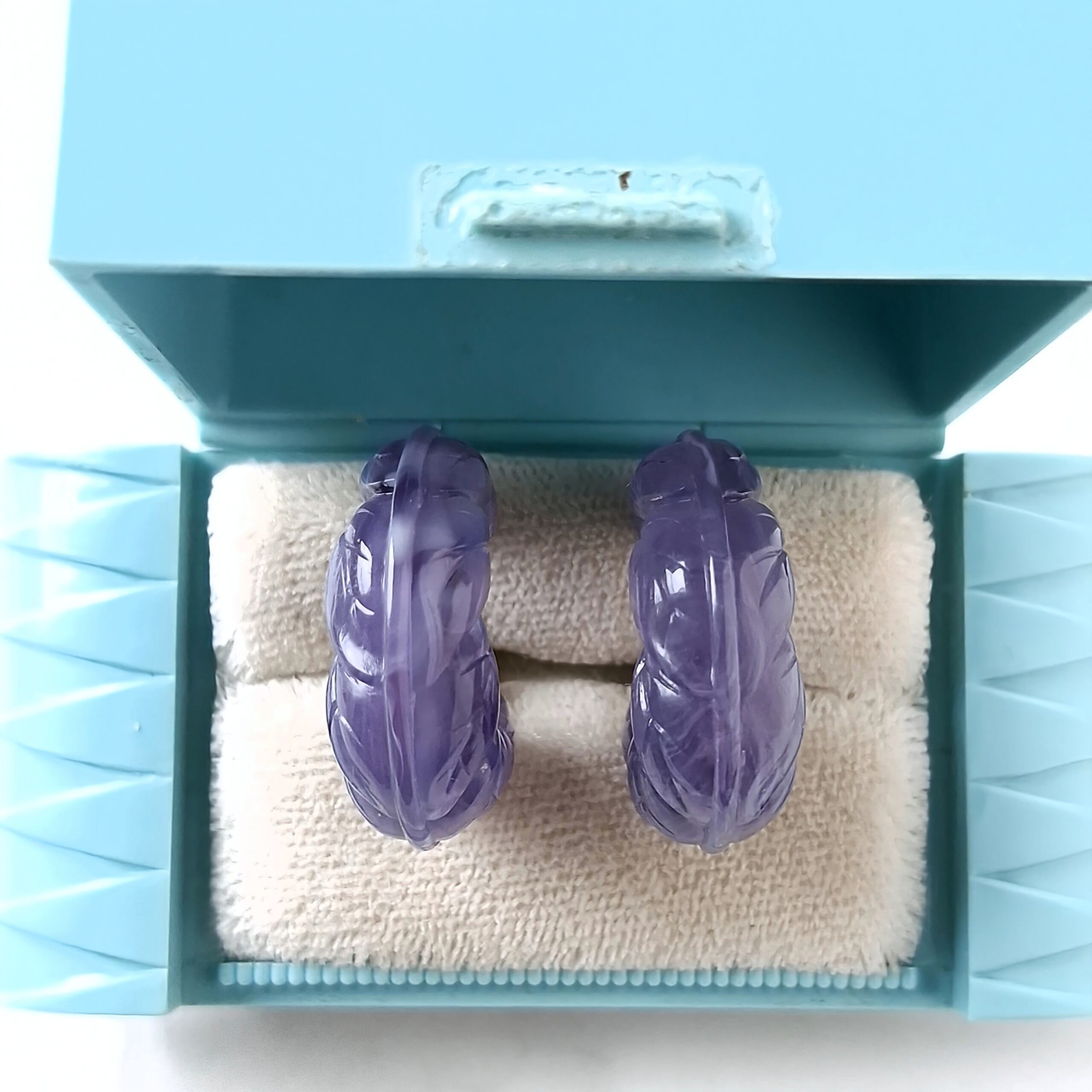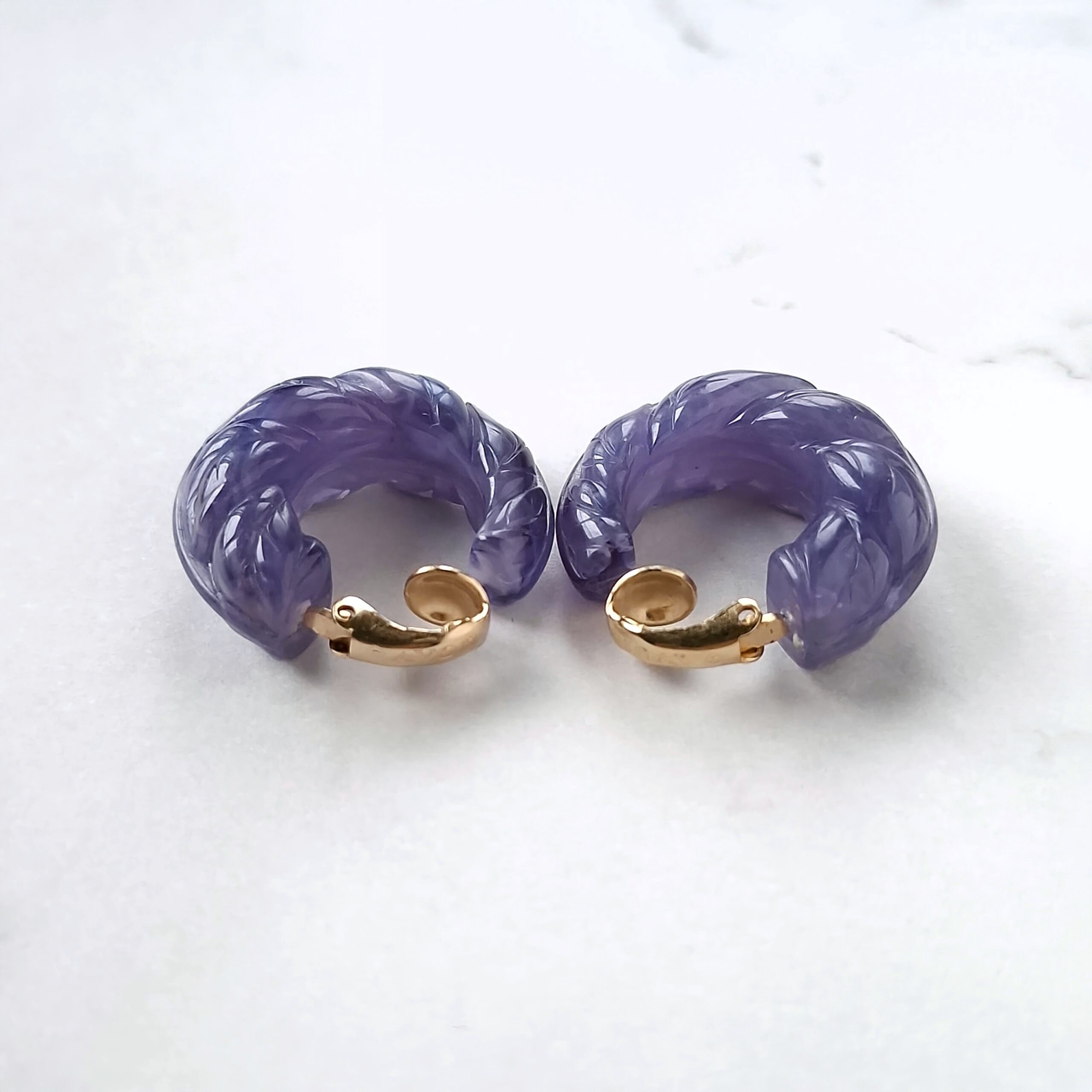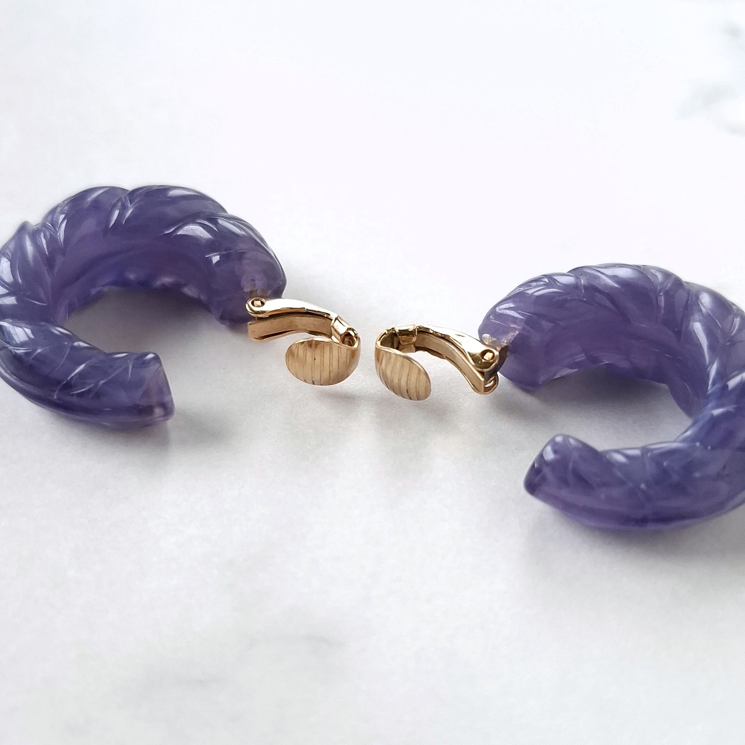 1886年アメリカのニューヨークにて小さな香水会社を創業、1971年に本格的にコスチュームジュエリーの製作を開始したAvon(エイボン)の1982年に販売された“FLORAL HOOP”のアメジストトーンのプラスチックにリーフの模様が刻まれたフープタイプのヴィンテージイヤリングです。