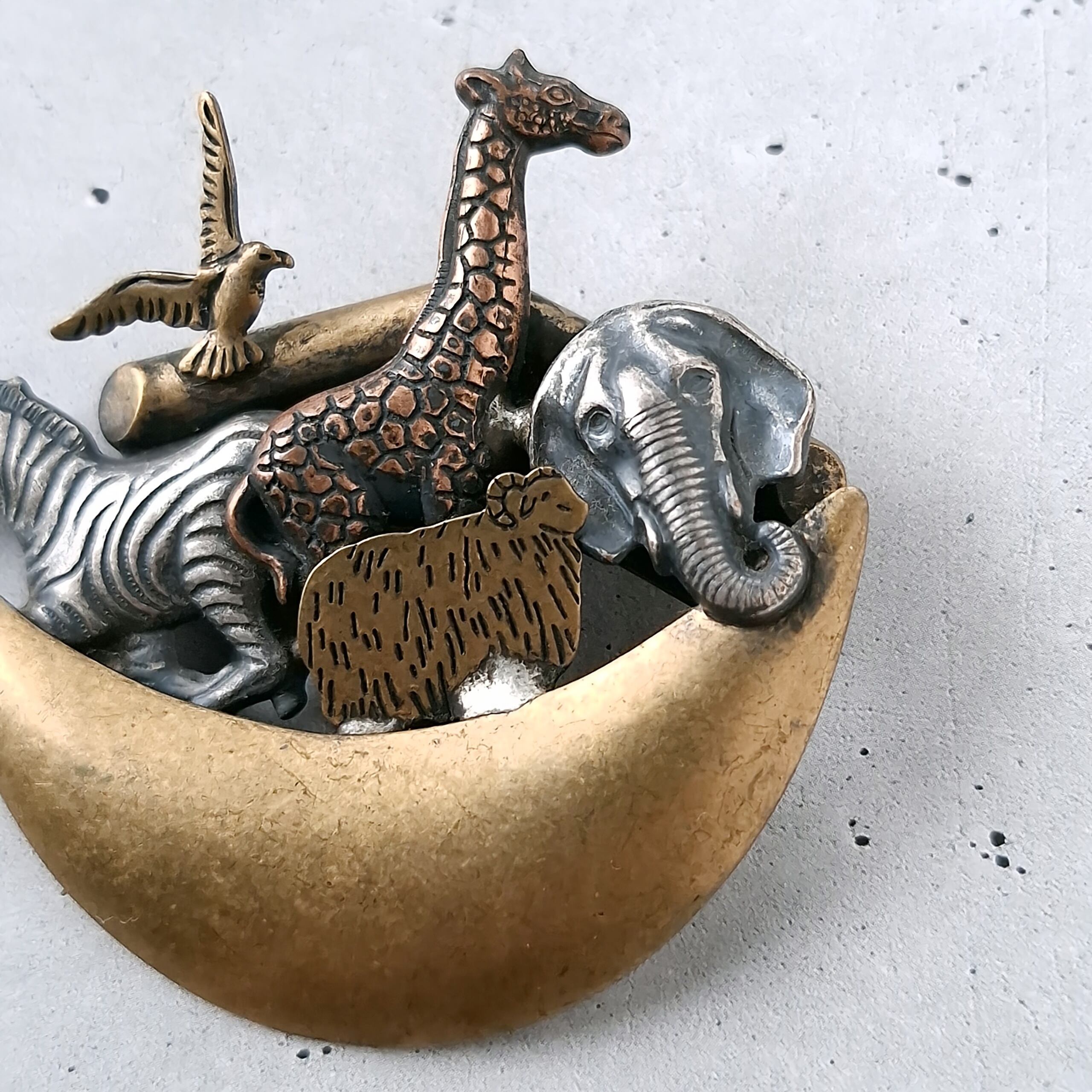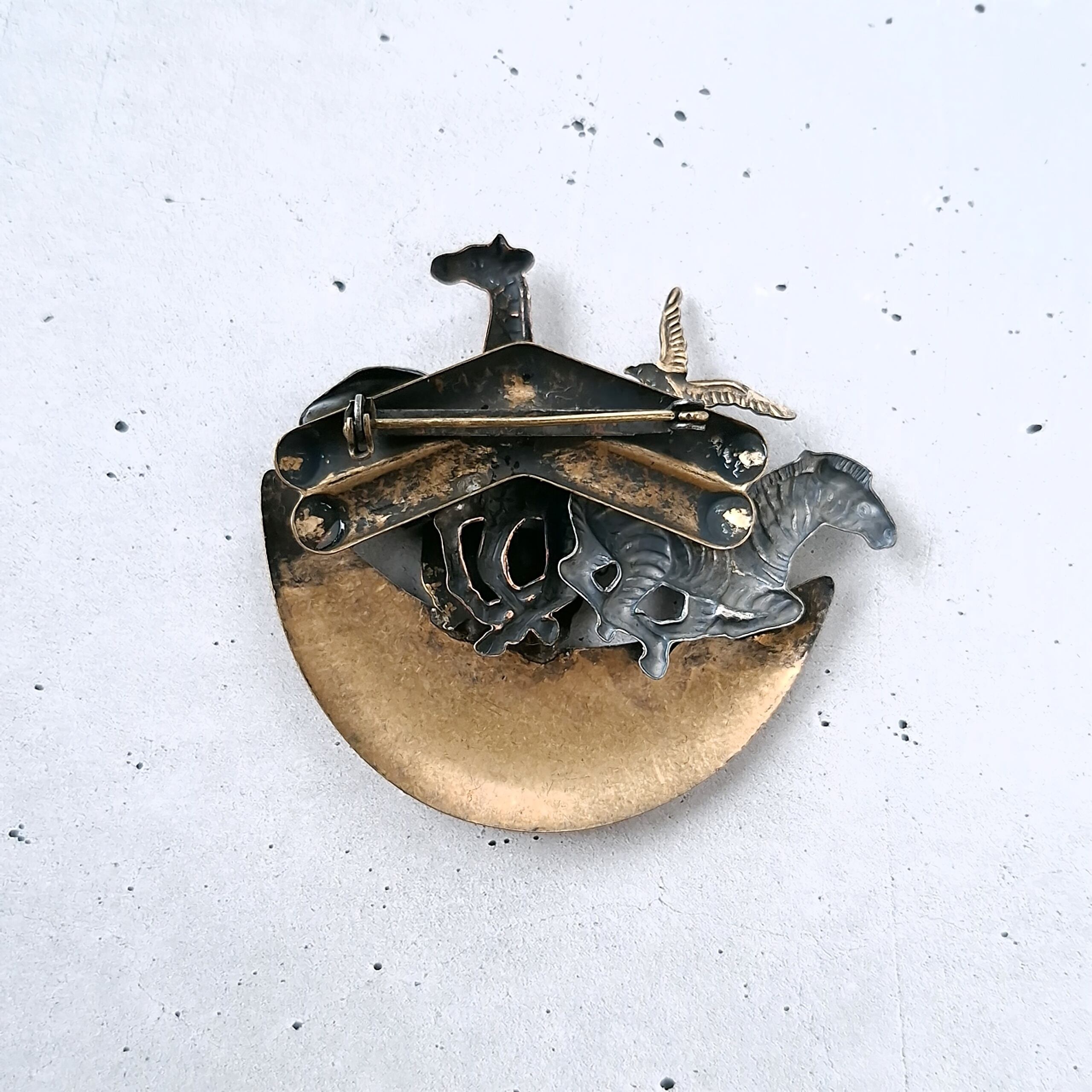 黒ずみ加工が施された鳥、キリン、シマウマ、ゾウ、羊が乗ったノアの方舟のヴィンテージブローチです。