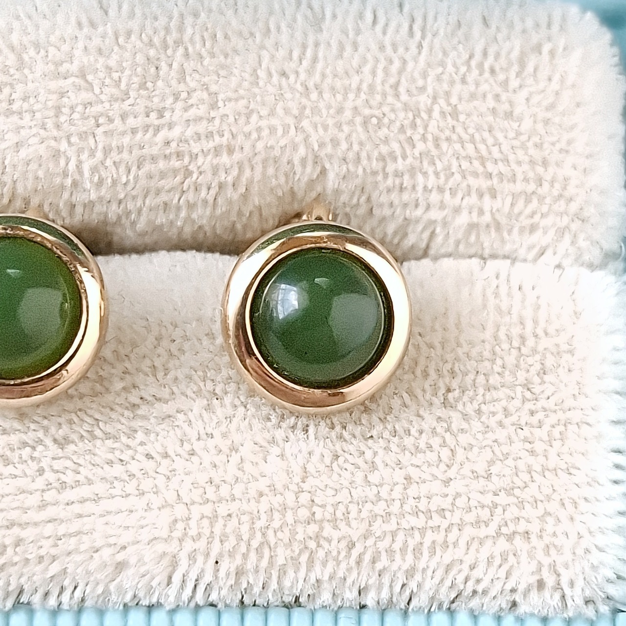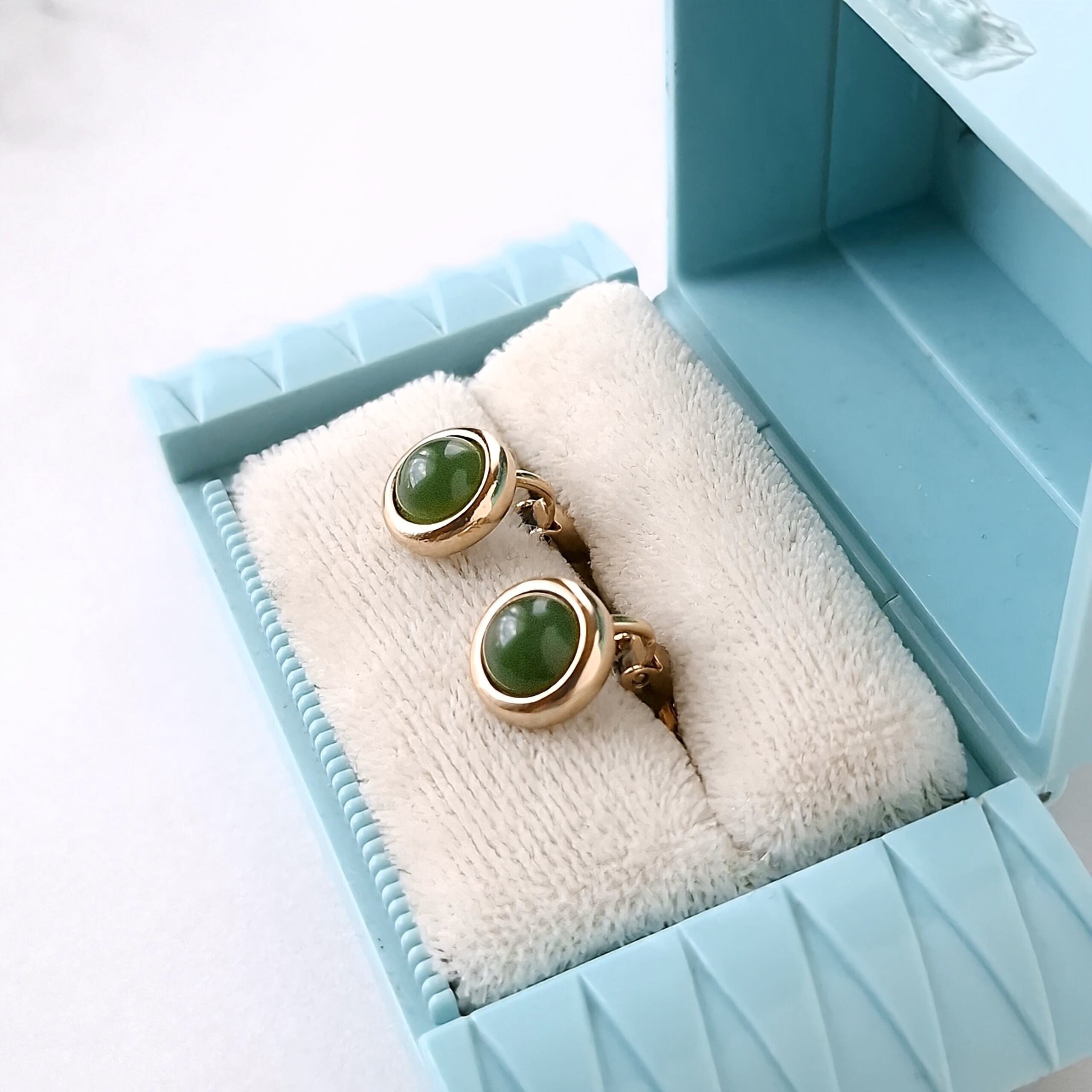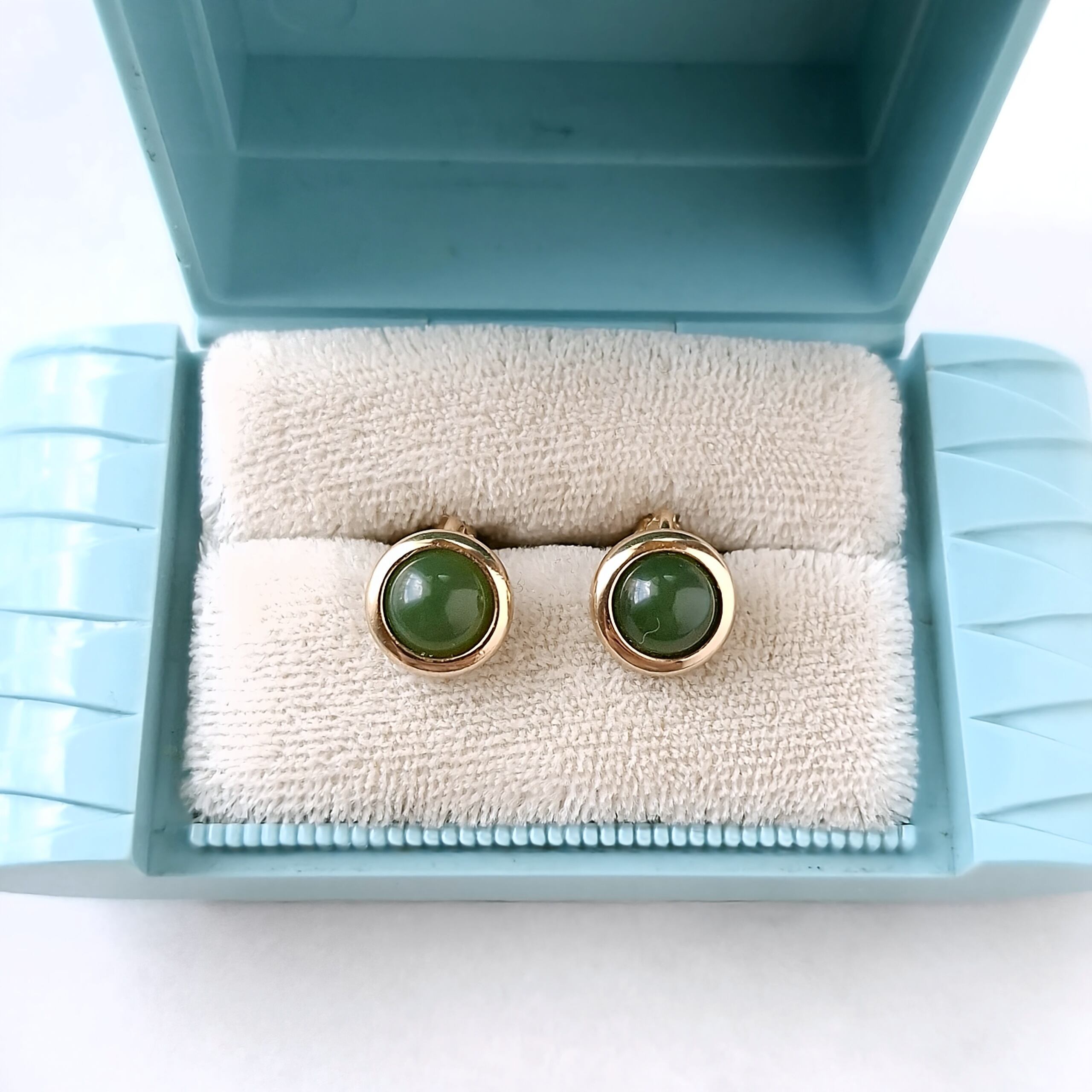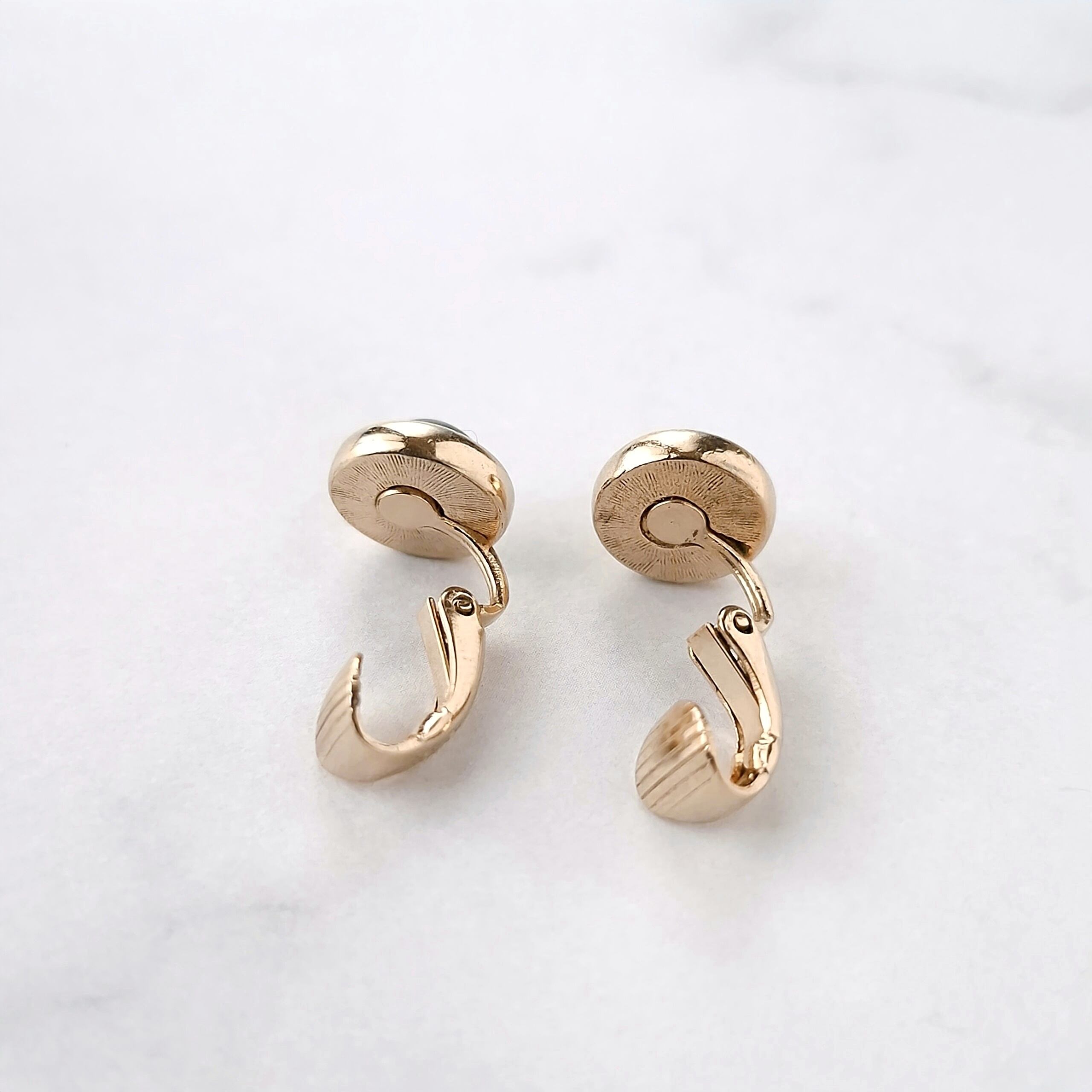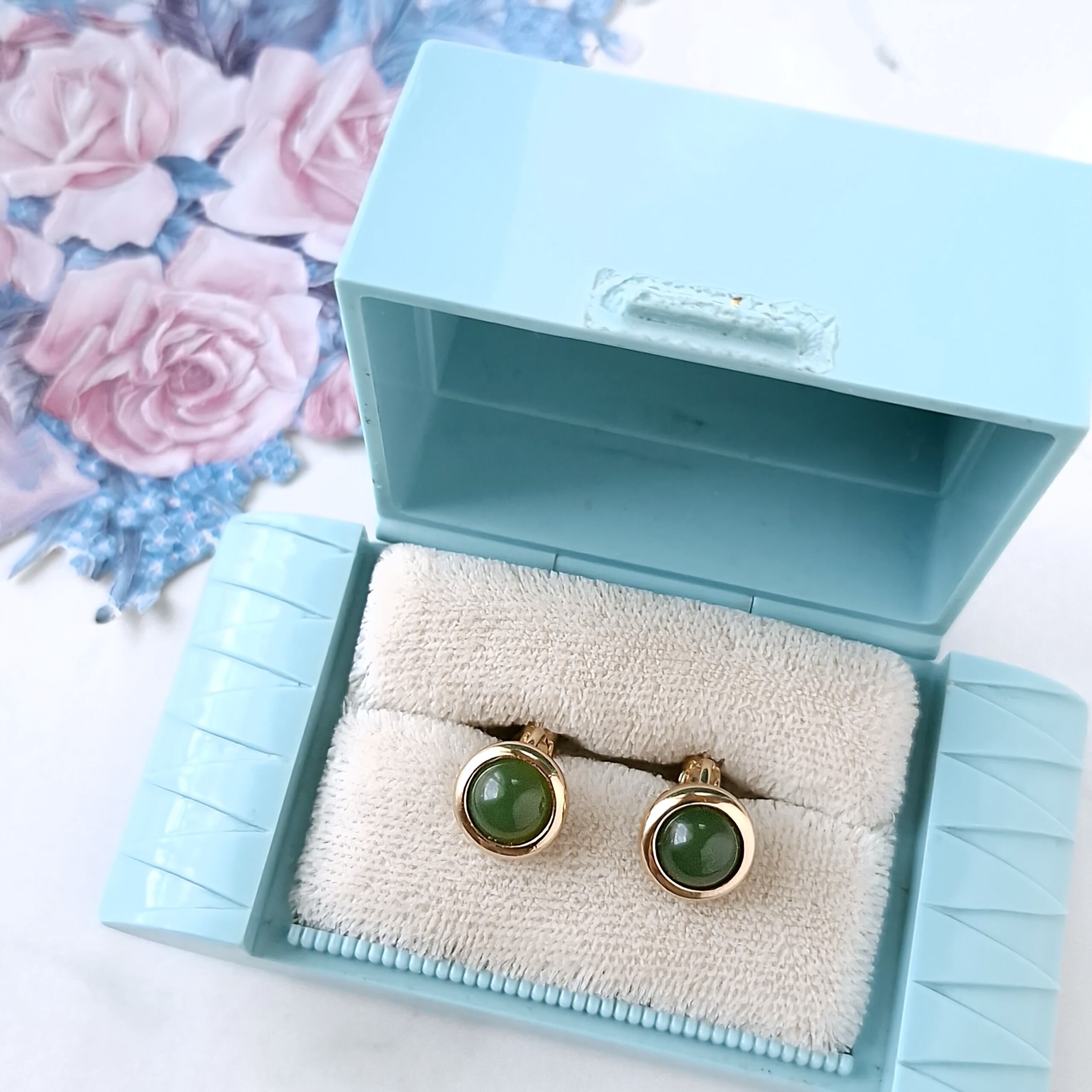 1886年アメリカのニューヨークにて小さな香水会社を創業、1971年に本格的にコスチュームジュエリーの製作を開始したAvon(エイボン)の1977年に販売された“Oriental Jade”のラウンド型のゴールドメタルに本物の東洋の翡翠があしらわれたヴィンテージイヤリングです。