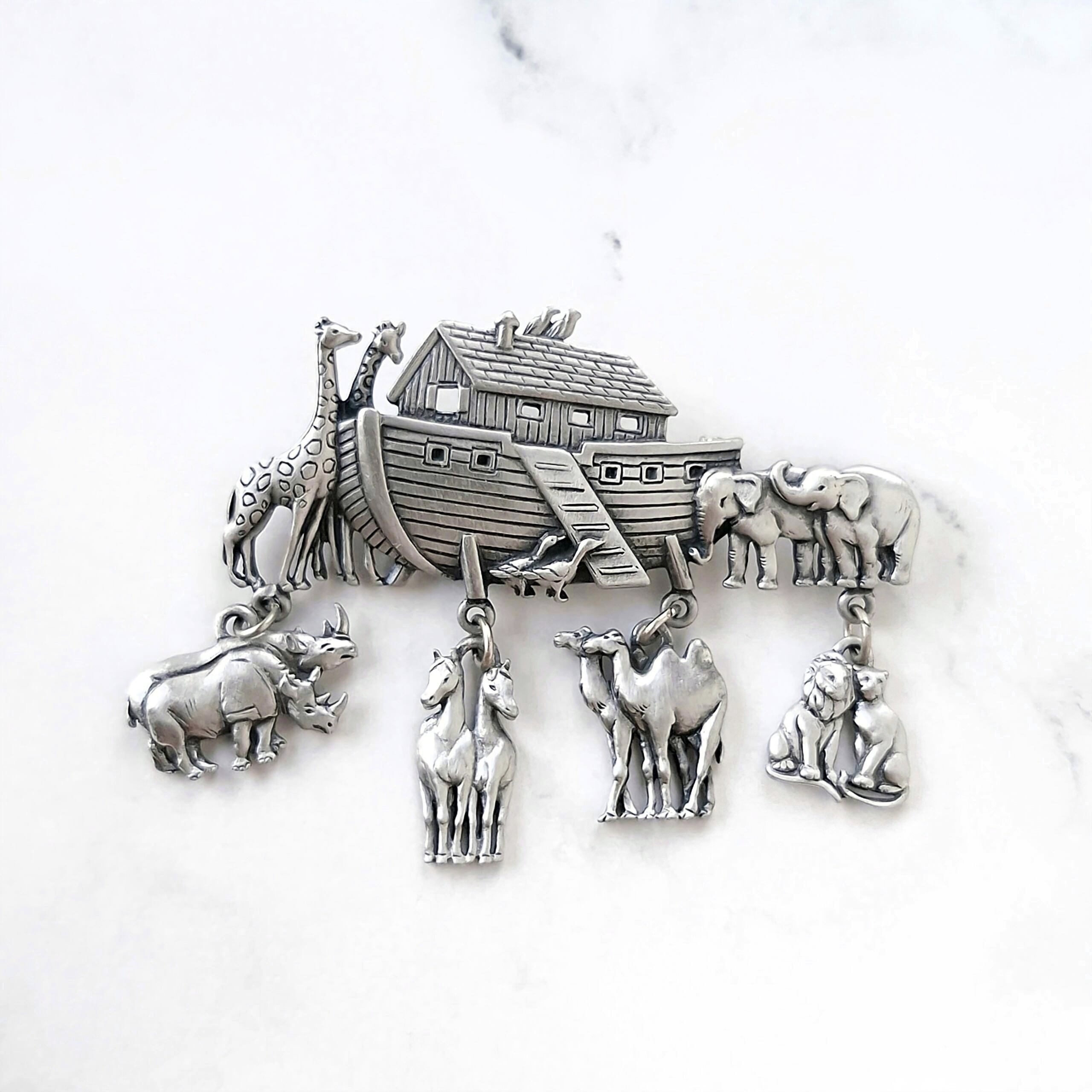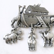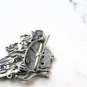 1935年にアメリカのロードアイランド州プロビデンスにて設立された「Jonette Jewelry Company」(通称J.J.、JJ)の船にサイ、馬、ラクダ、ライオンのチャームがぶら下がったシルバートーンのピューターのノアの方舟のヴィンテージブローチです。