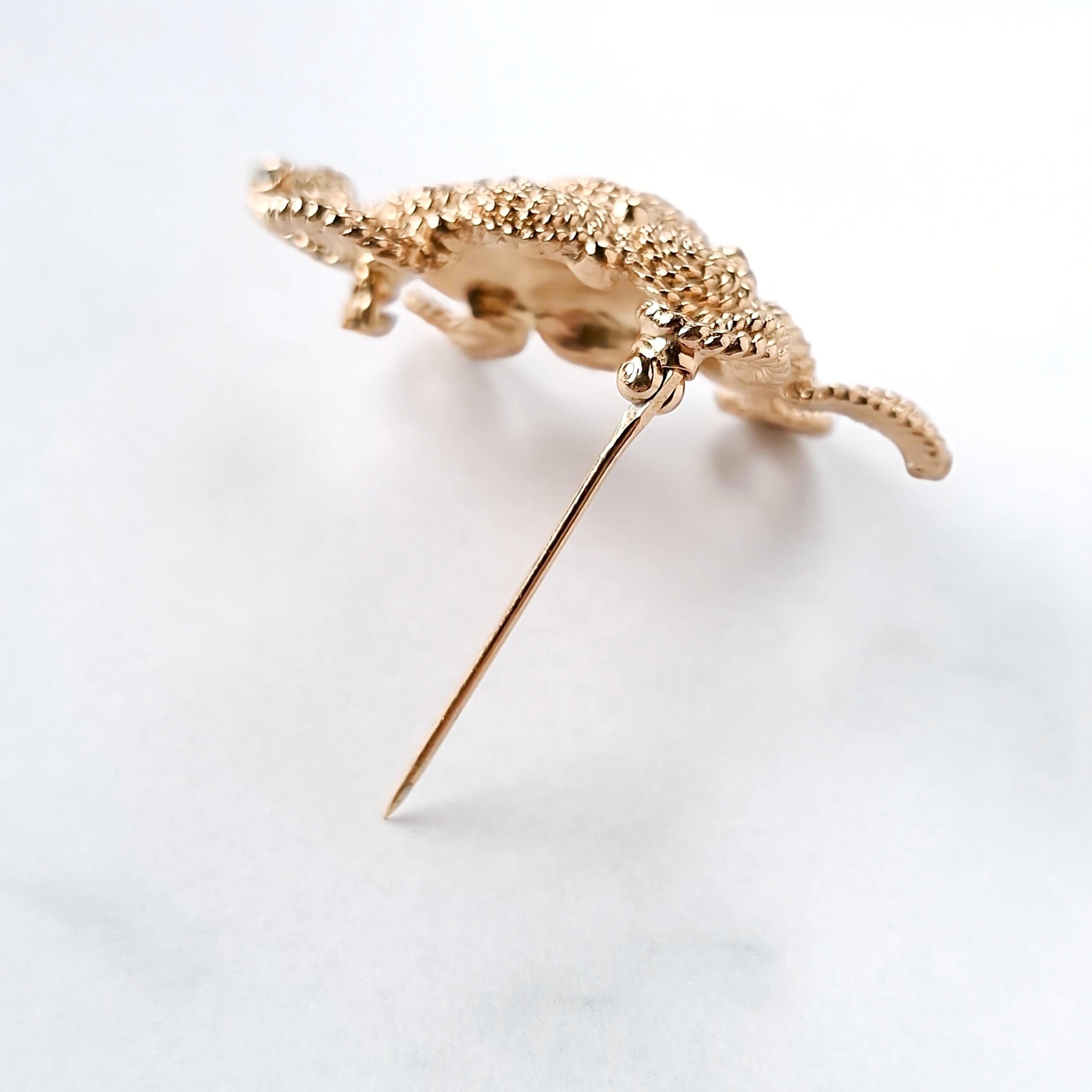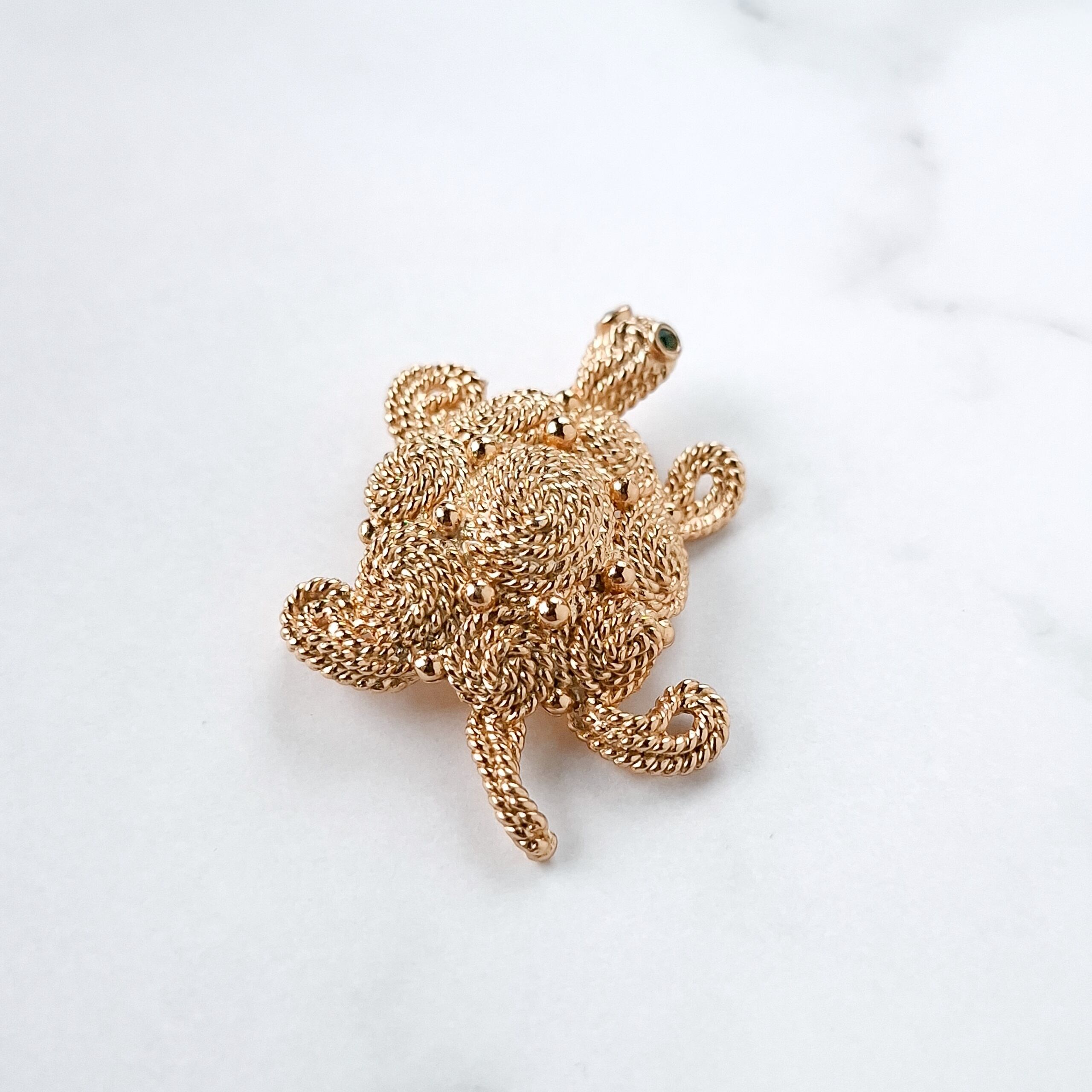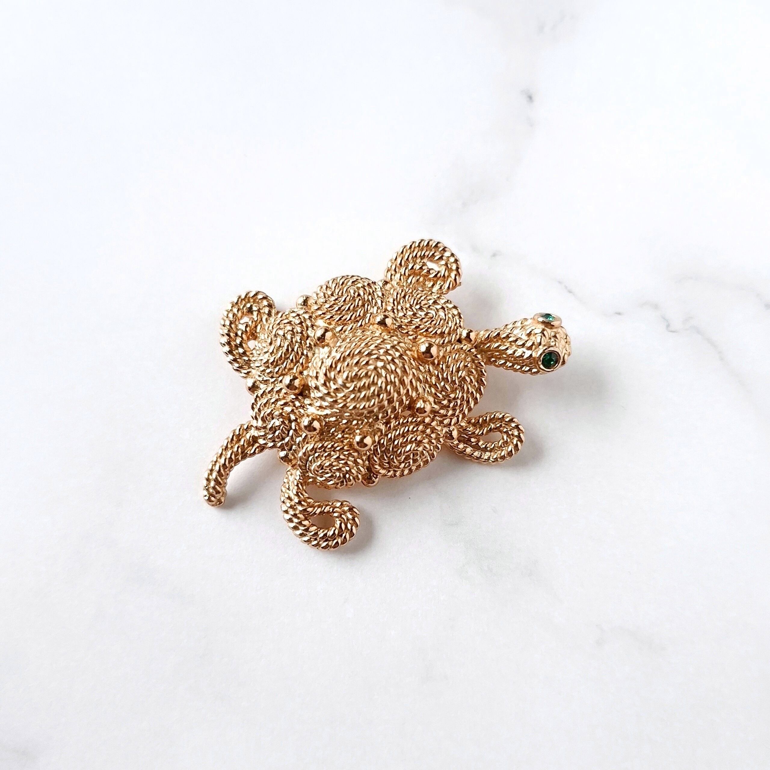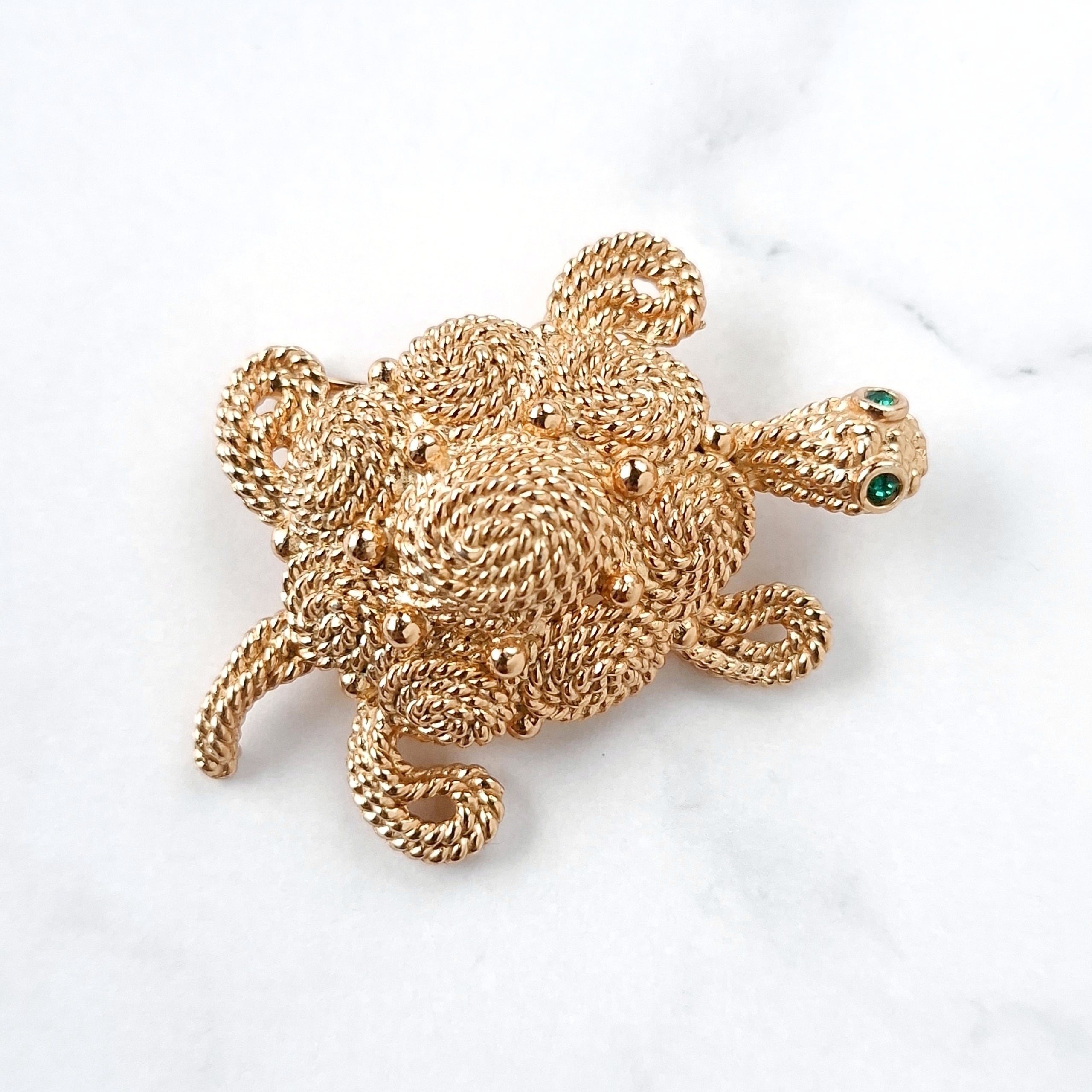 1875年アメリカのマサチューセッツで銀製の時計バンドを製作する会社を創業、第一次世界対戦後に社名を変更してアクセサリーを製作した老舗コスチュームジュエリーメーカー「NAPIER」(ネイピア)の瞳にグリーンのラインストーンがあしらわれたゴールドメタルのロープデザインのカメのヴィンテージブローチです。