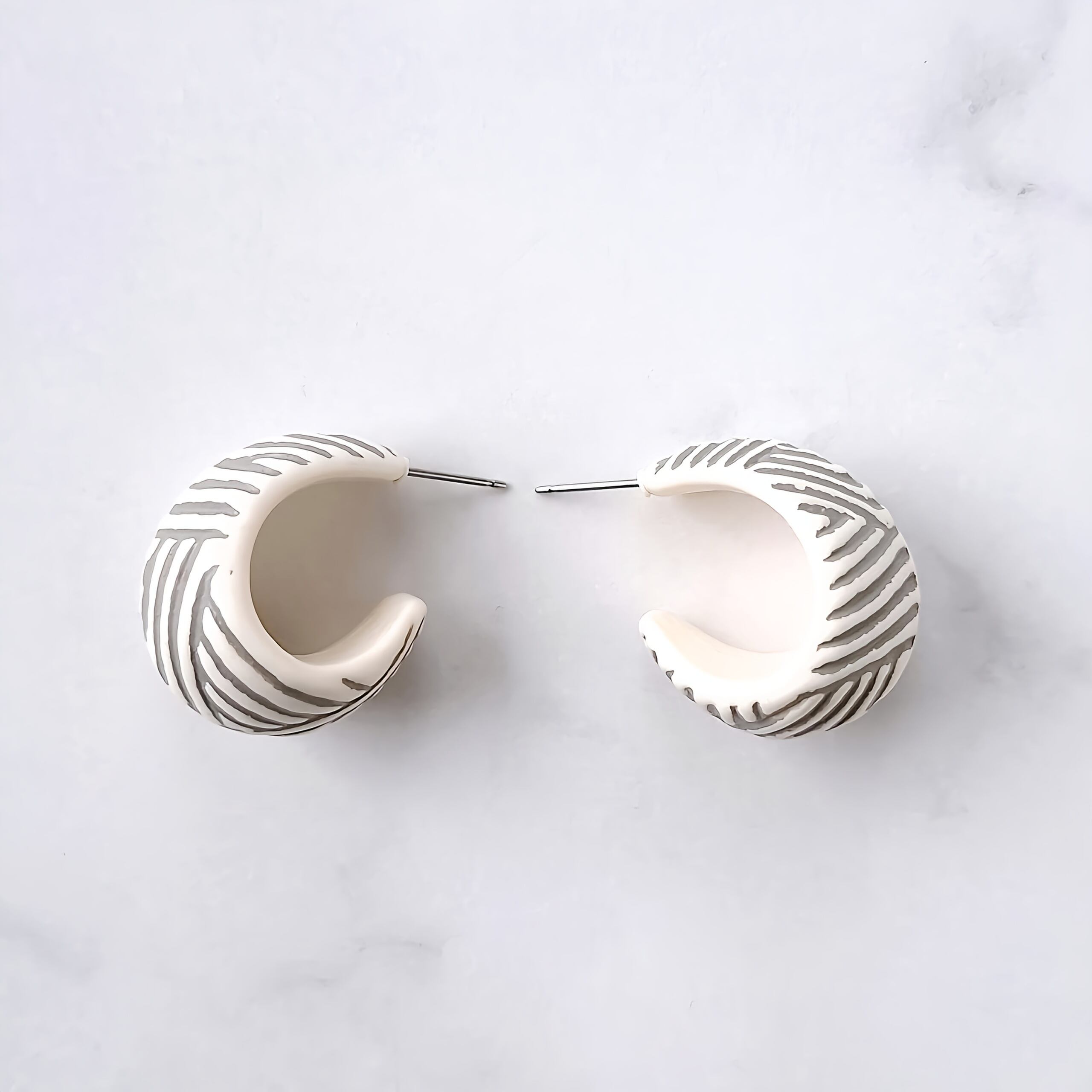 1886年アメリカのニューヨークにて小さな香水会社を創業、1971年に本格的にコスチュームジュエリーの製作を開始したAvon(エイボン)の1988年に販売された“sirocco hoop”のオフホワイトのプラスチックにグレーの線状の模様が施されたアフリカンスタイルのヴィンテージピアスです。