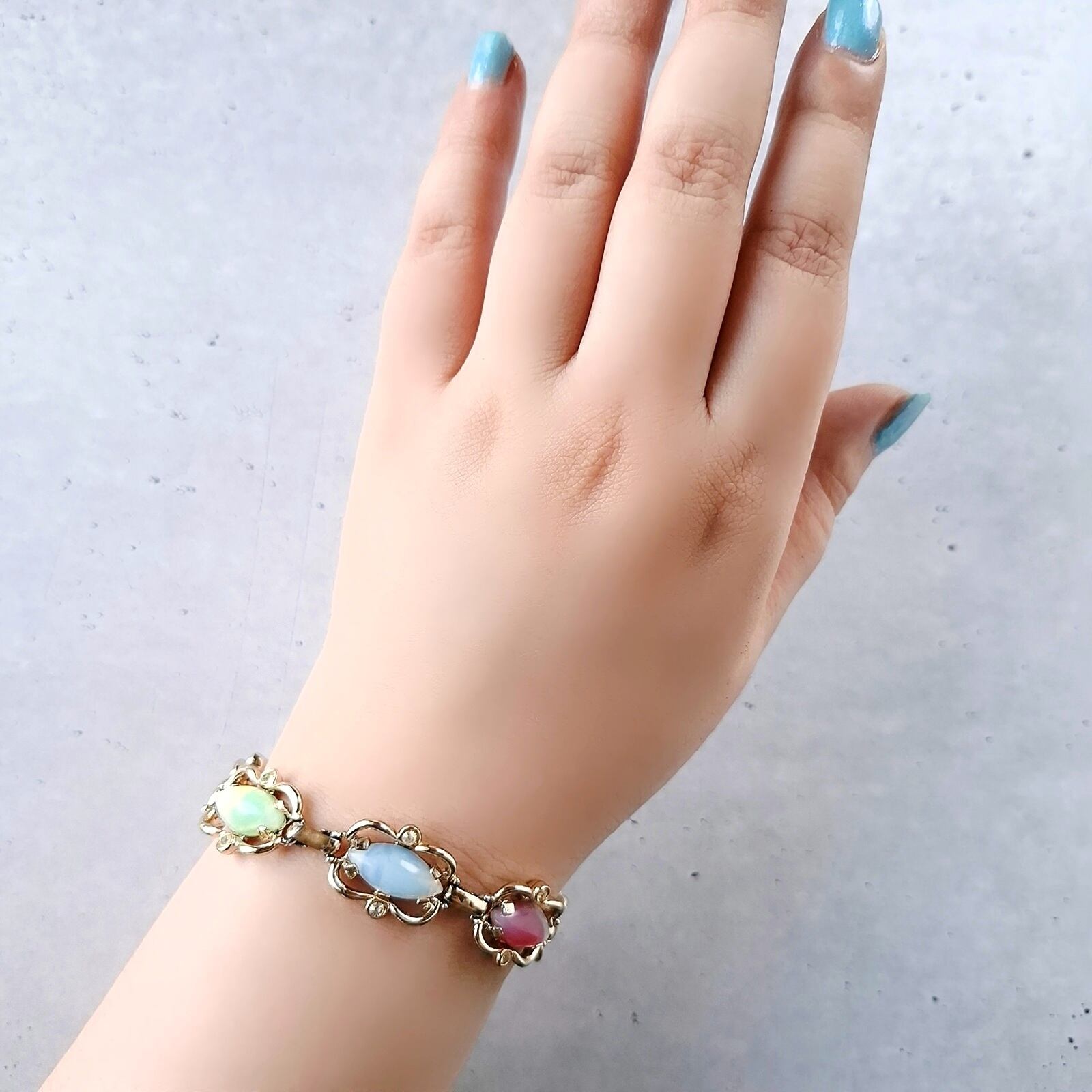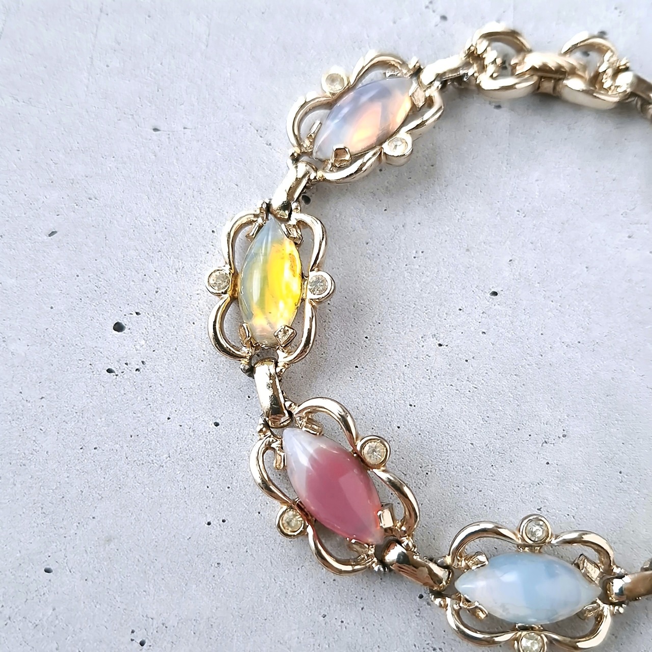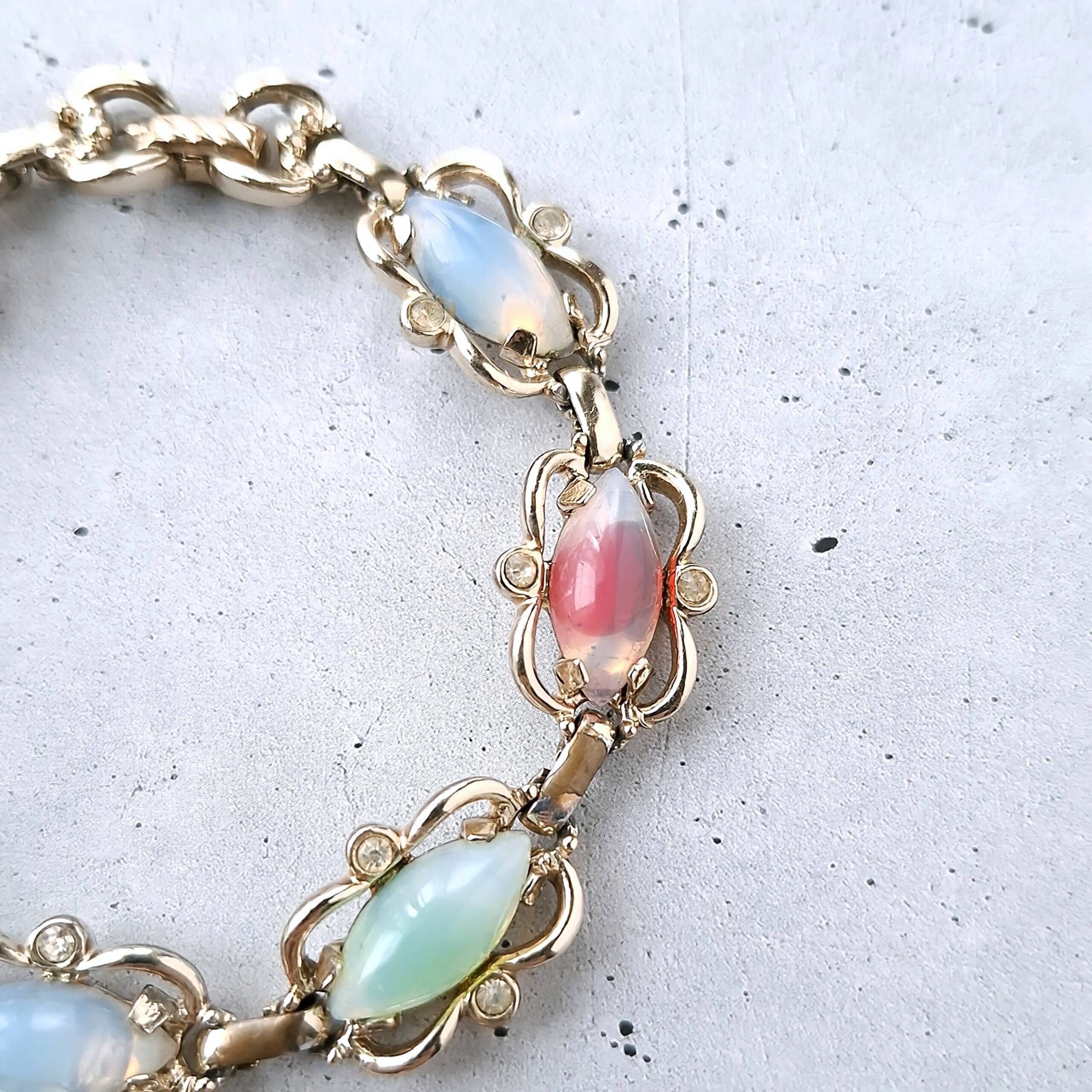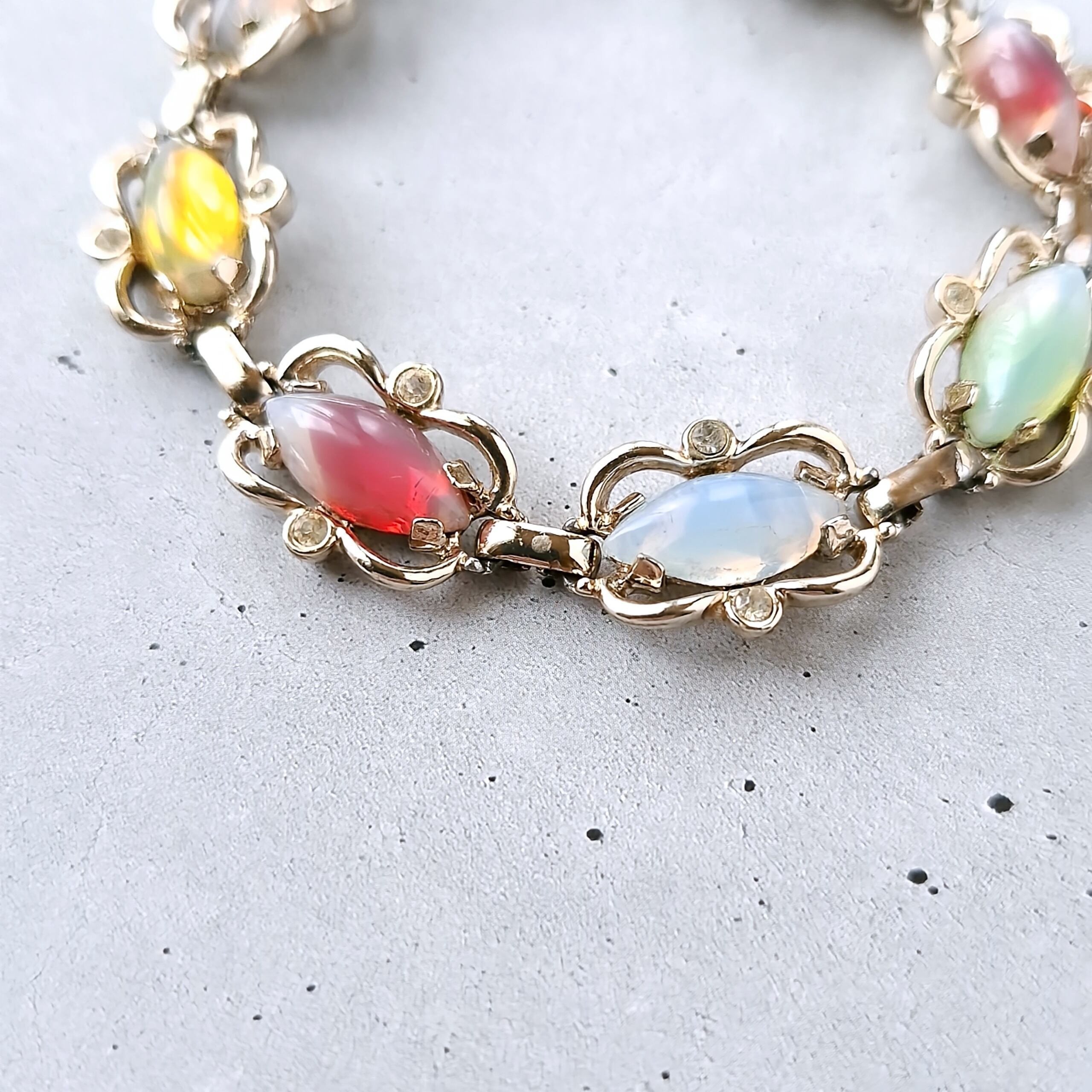 1949年にニューヨークで創業したSarah Coventry(サラコベントリー)の1959年に販売された“Sabrina Fair”の薄い色味のオープンワークゴールドメタルにクリアラインストーンとカラフルなサブリナガラス(オパールのような乳白色に色を流し込んだギブレガラス)があしらわれたヴィンテージブレスレットです。