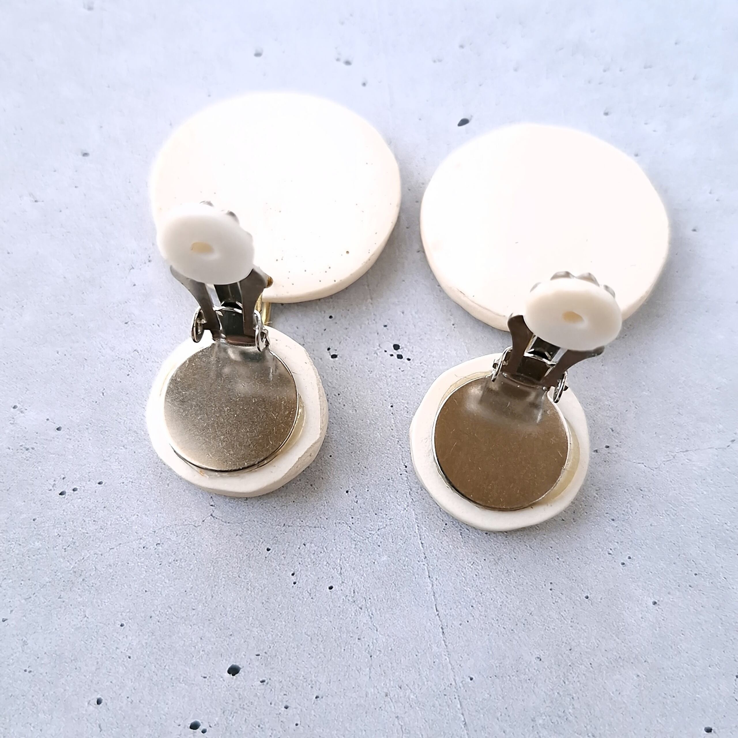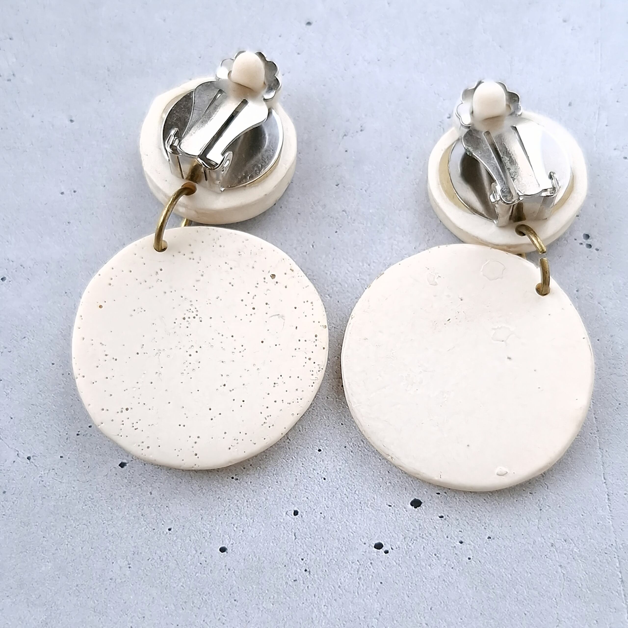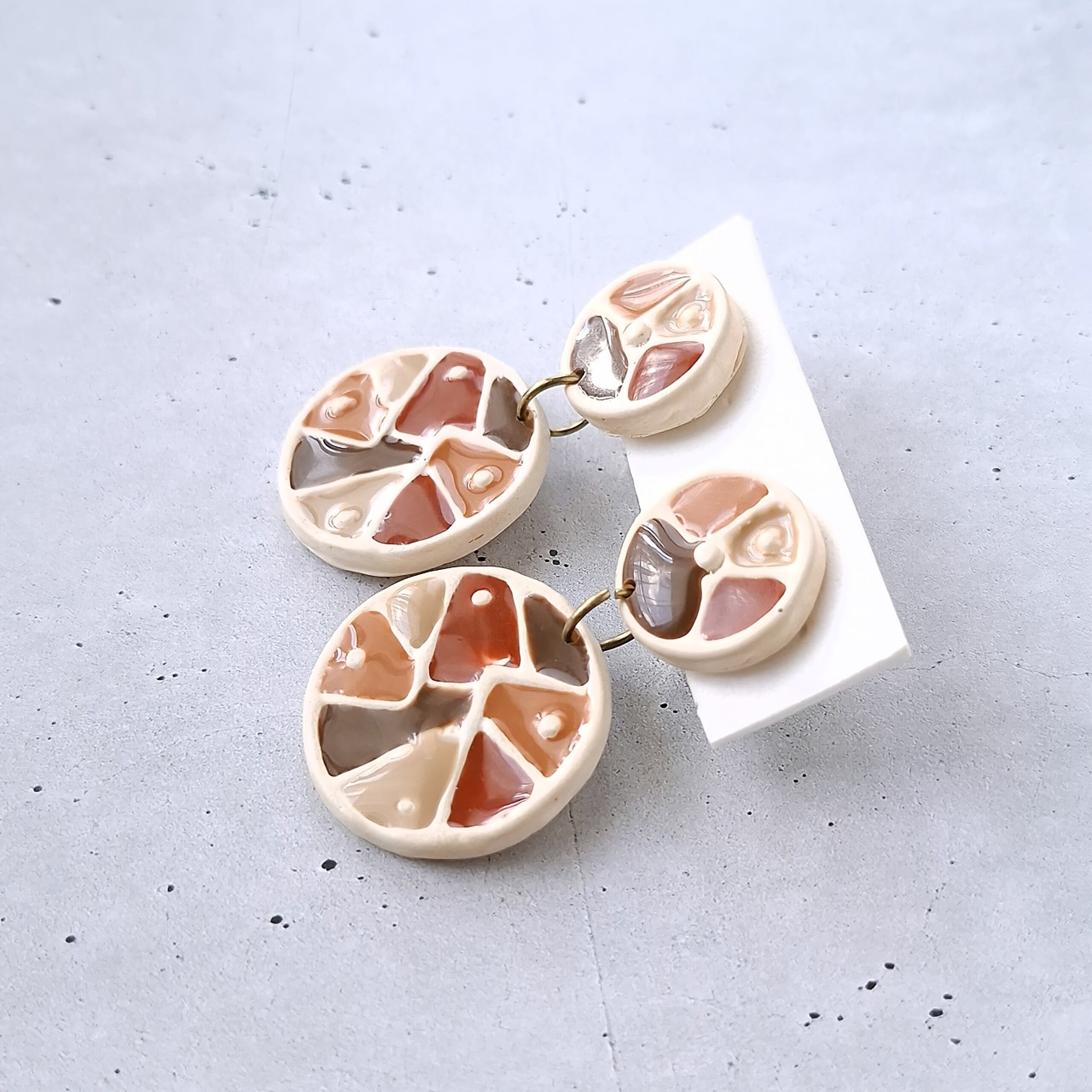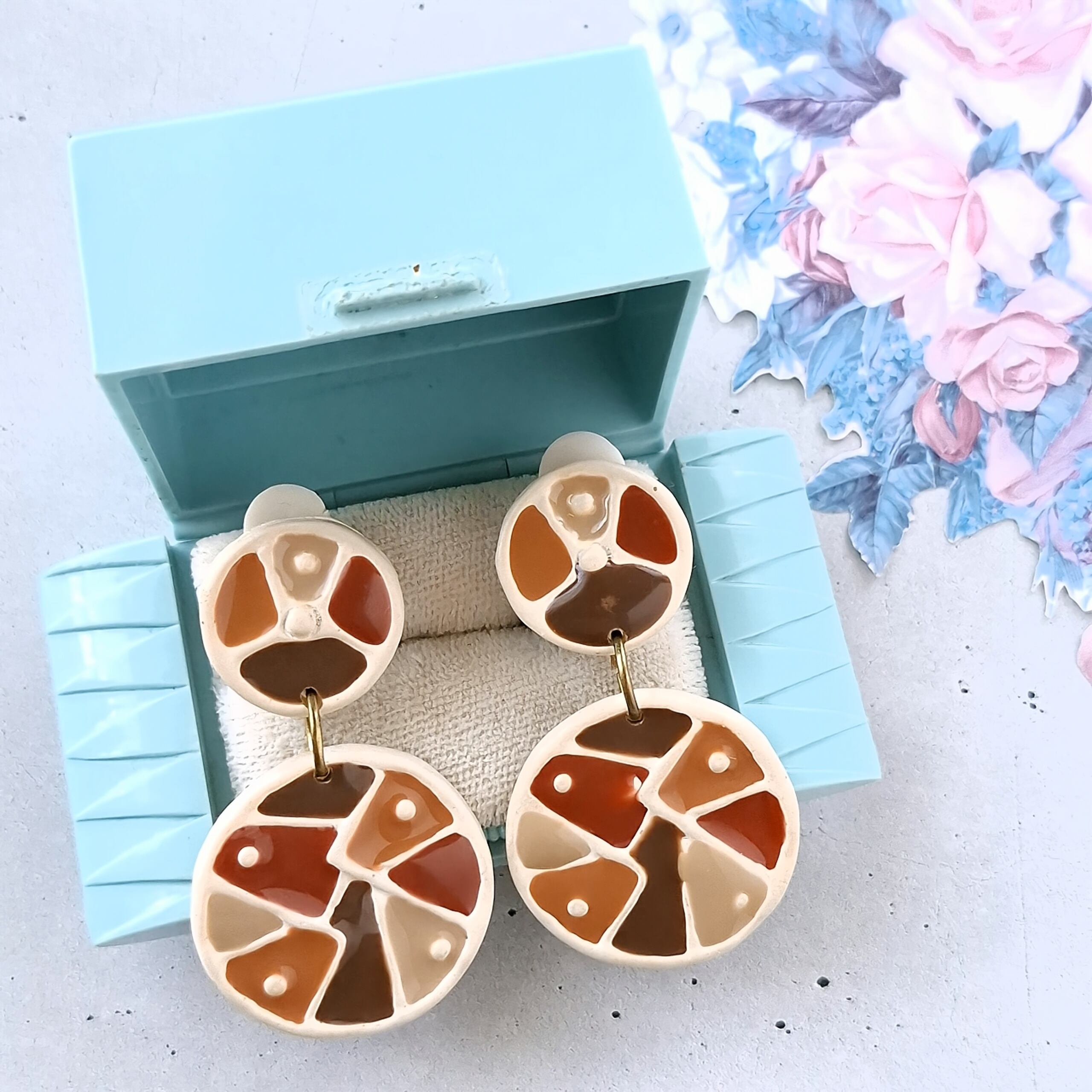 ブラウン系のエナメルで色付けされた大小のベージュのラウンド型のプラスチックが連なったデザインのヴィンテージイヤリングです。