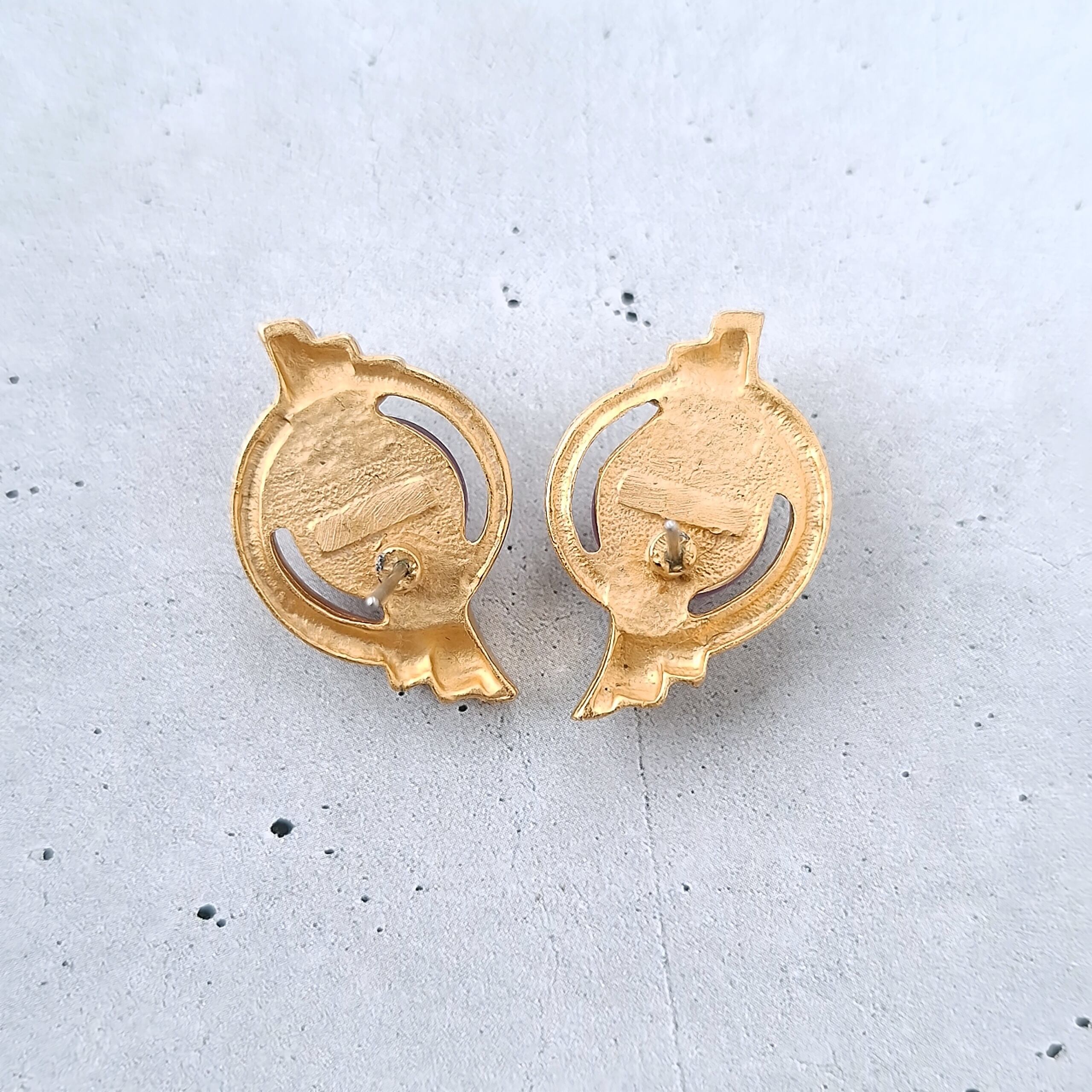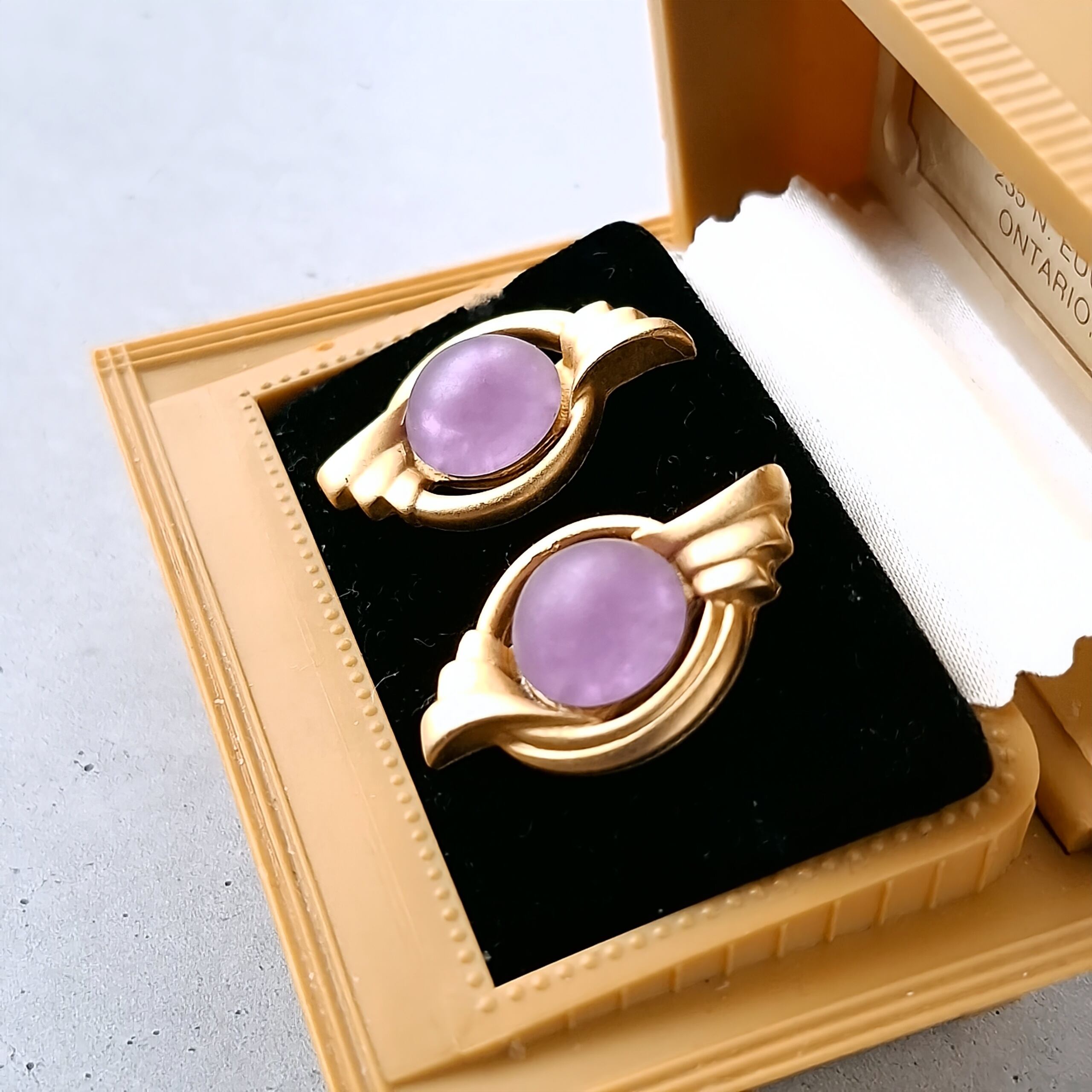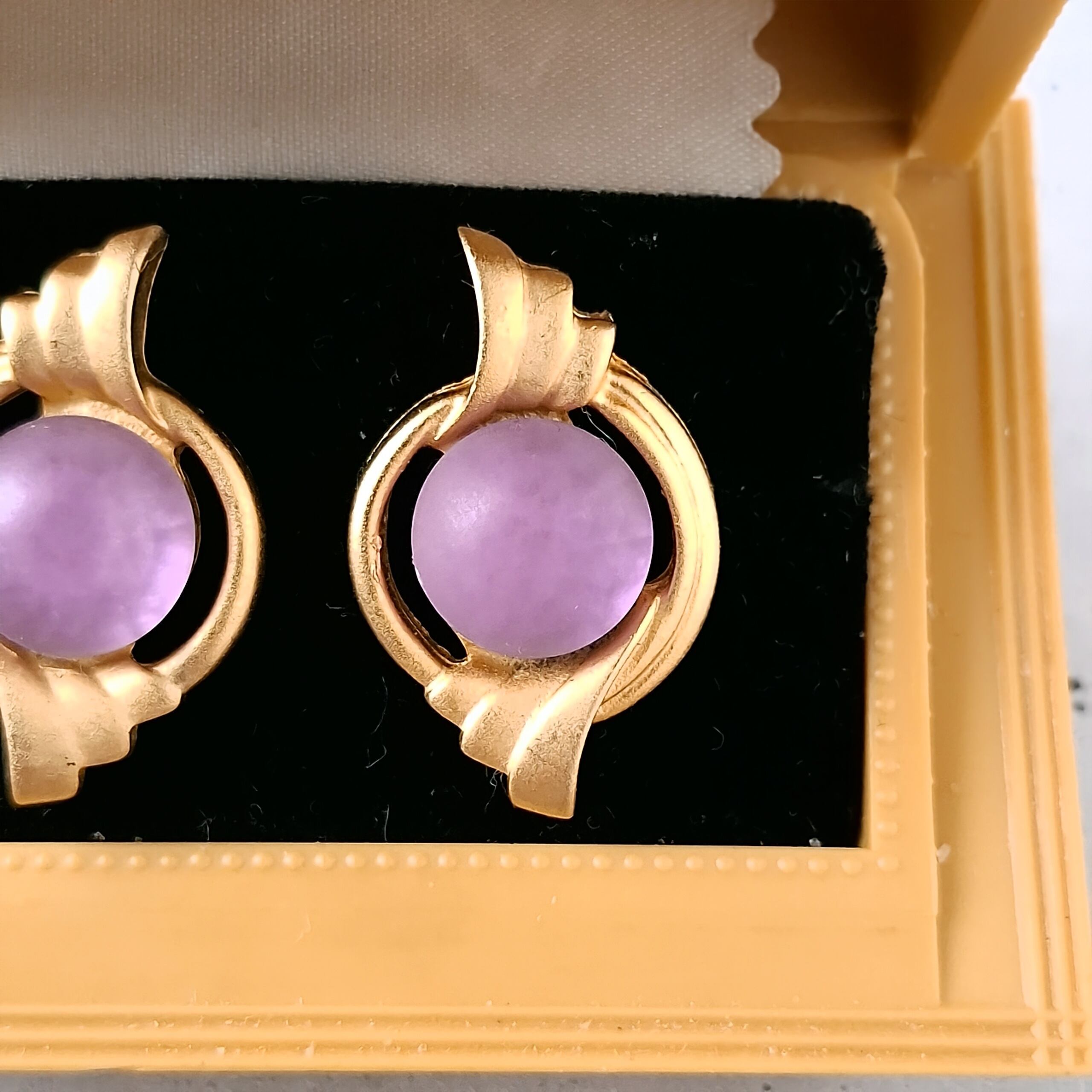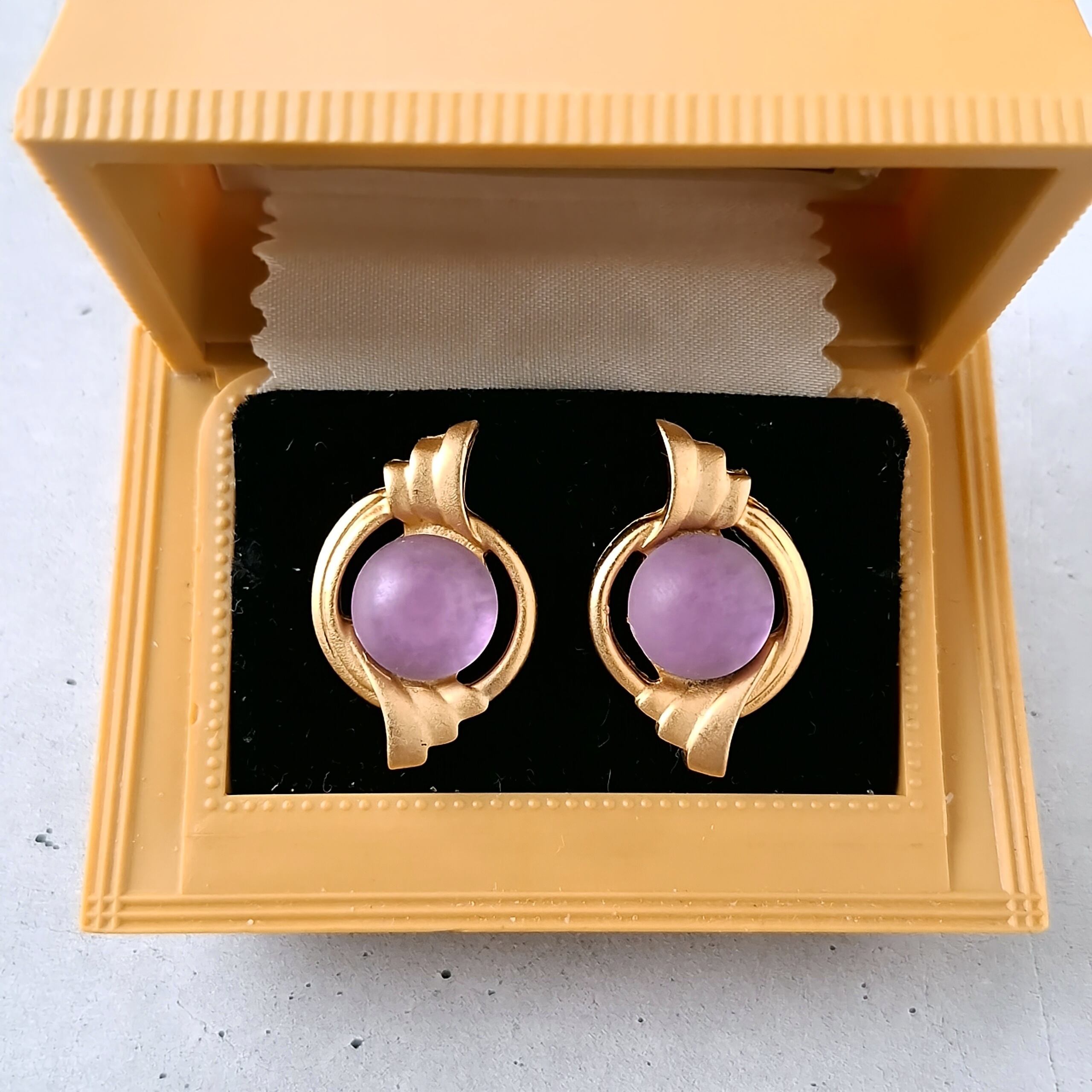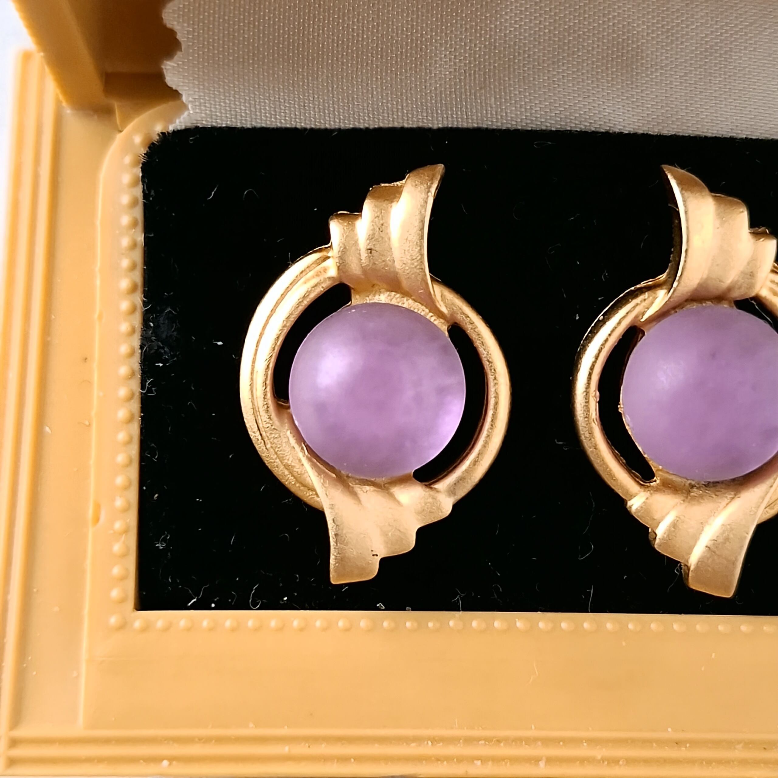 オープンワークのサークル状のマットゴールドメタルの中央にパープルのフロストガラスカボションがあしらわれたヴィンテージピアスです。