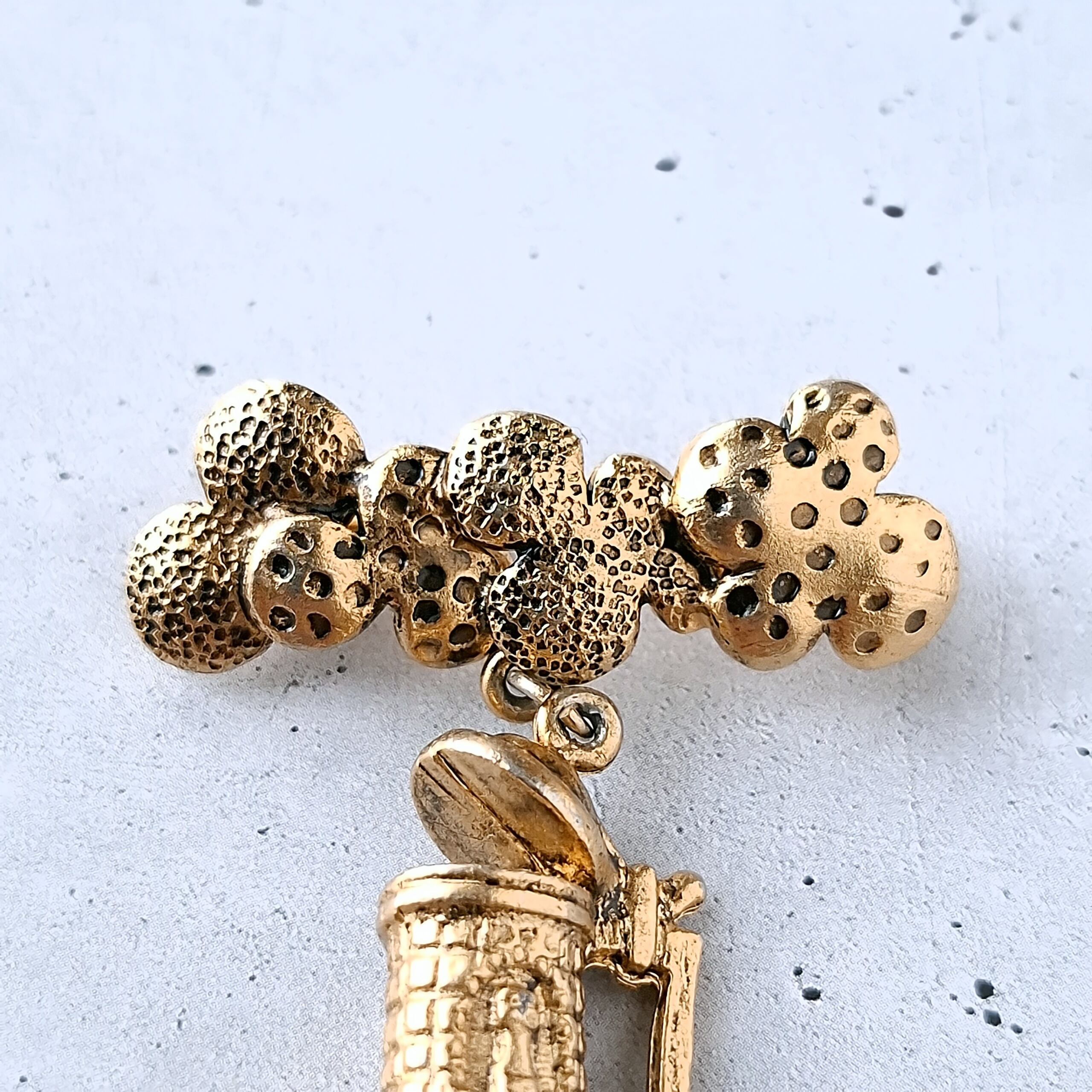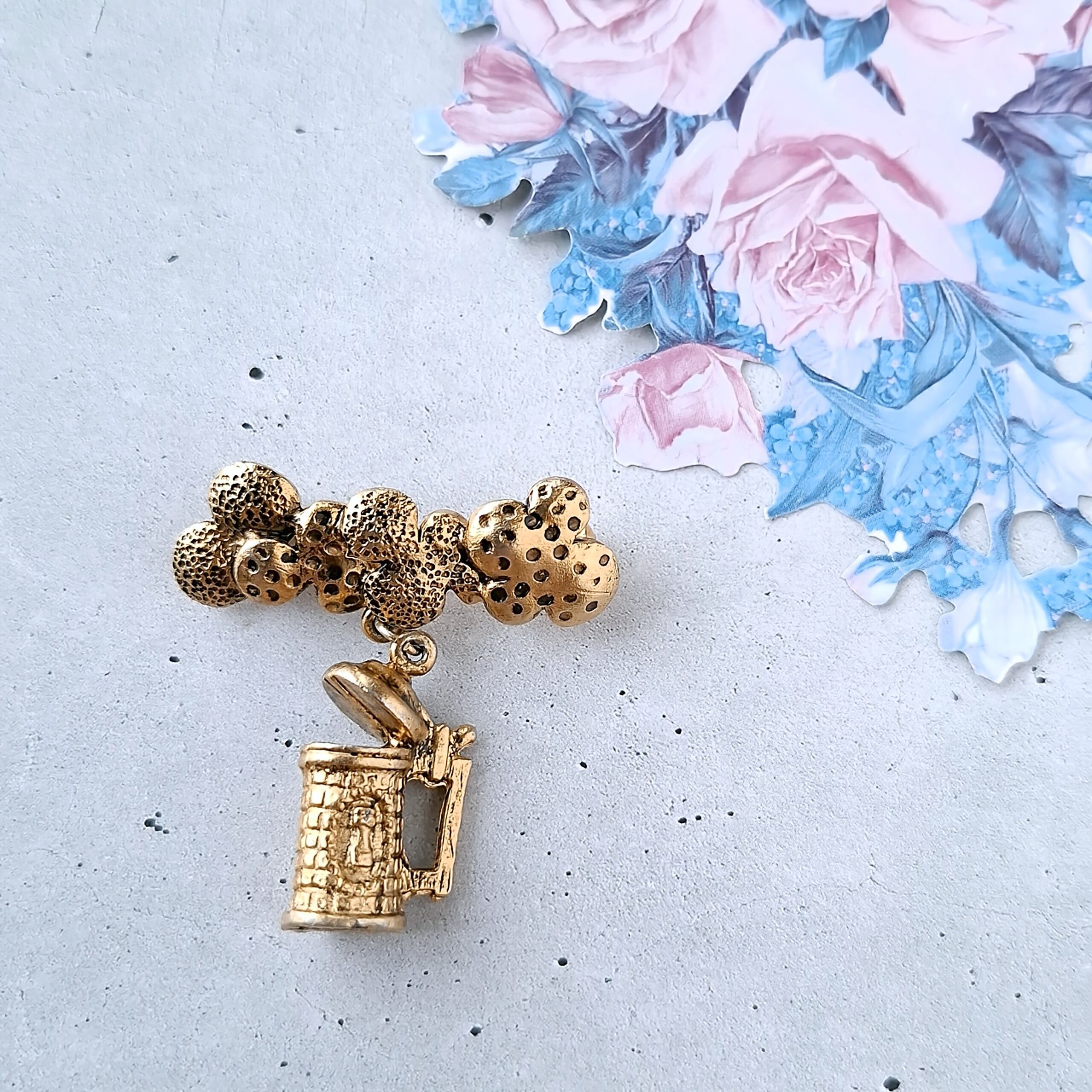 黒ずみ加工が施されたゴールドメタルのドット模様の泡に蓋付きのビールマグのチャームが付いたヴィンテージブローチです。