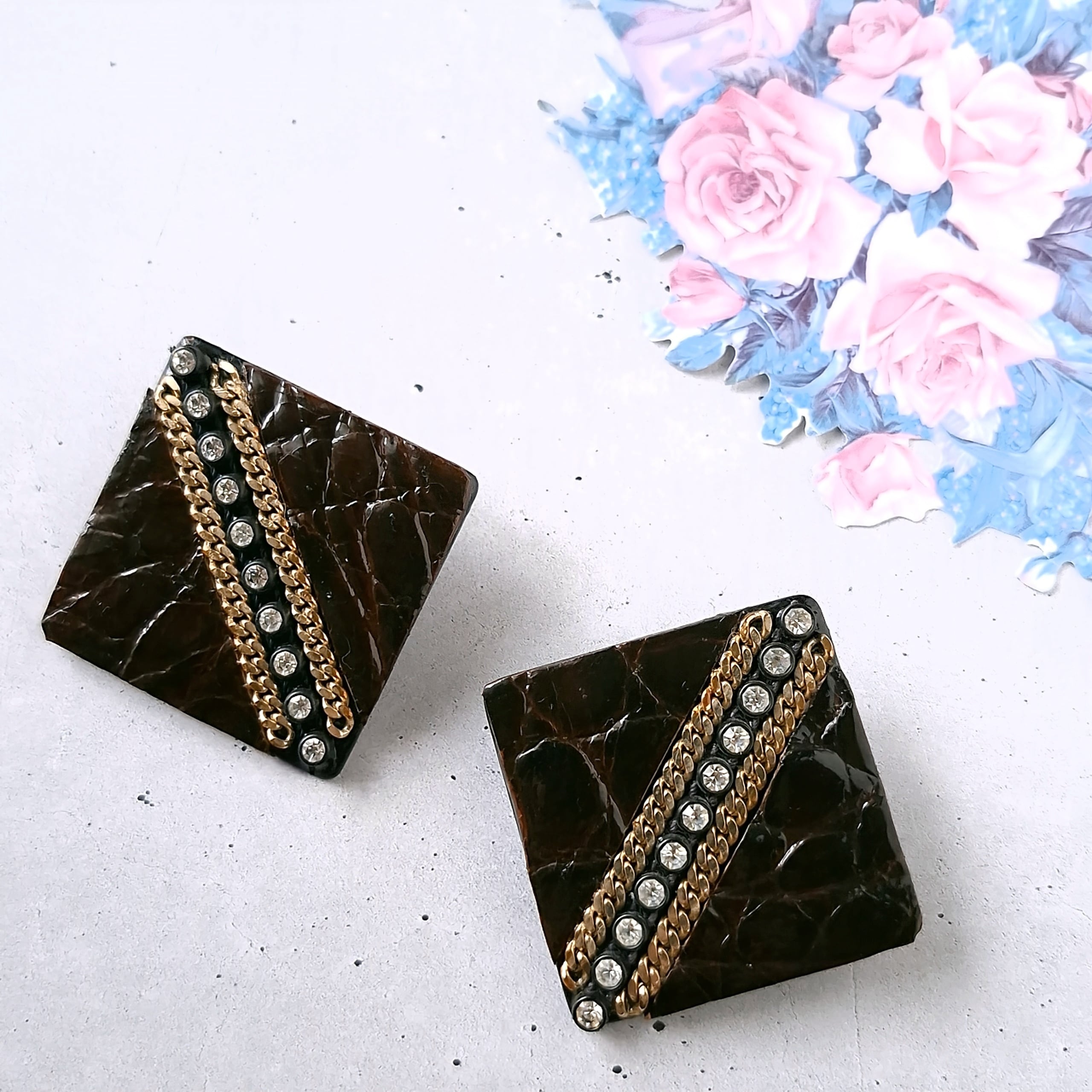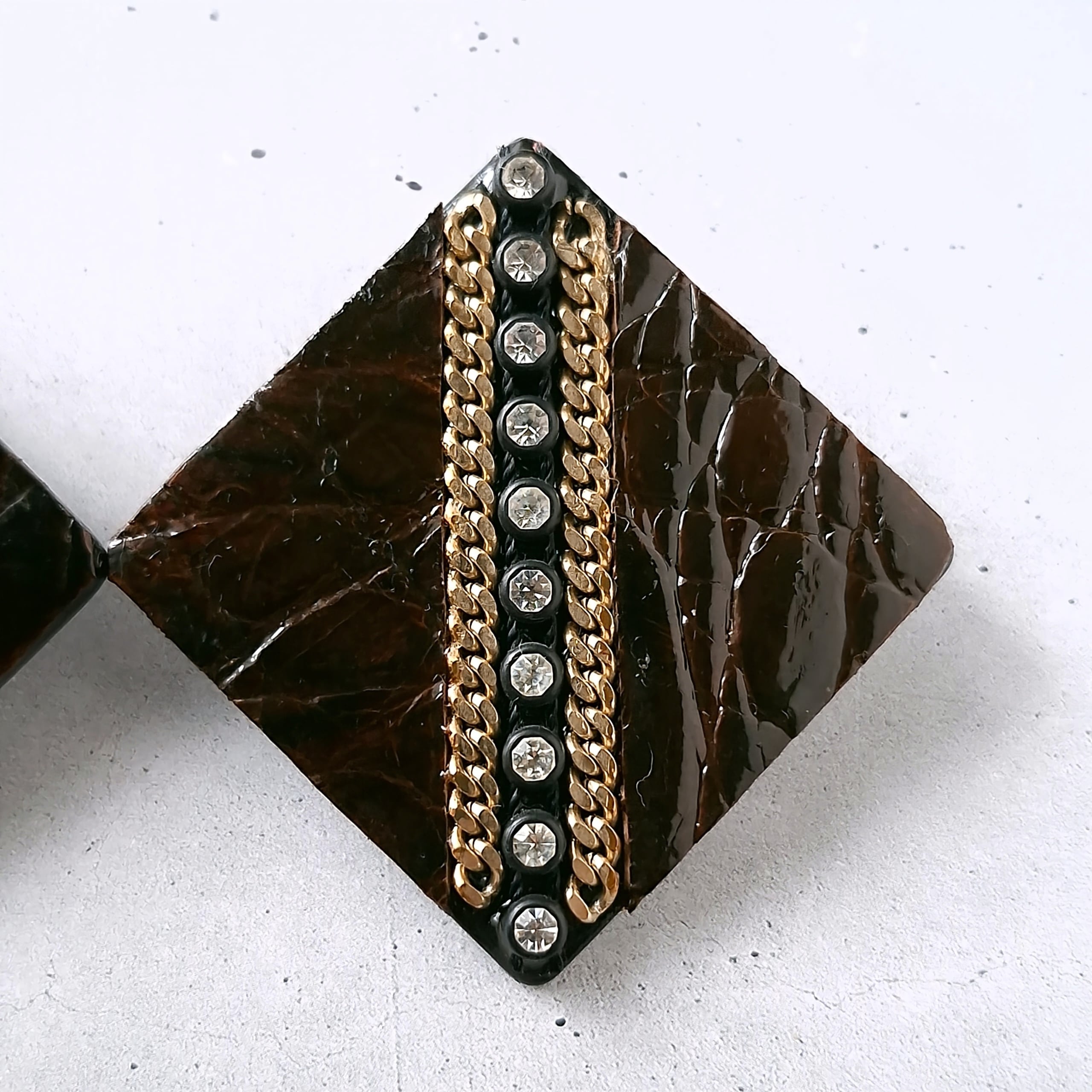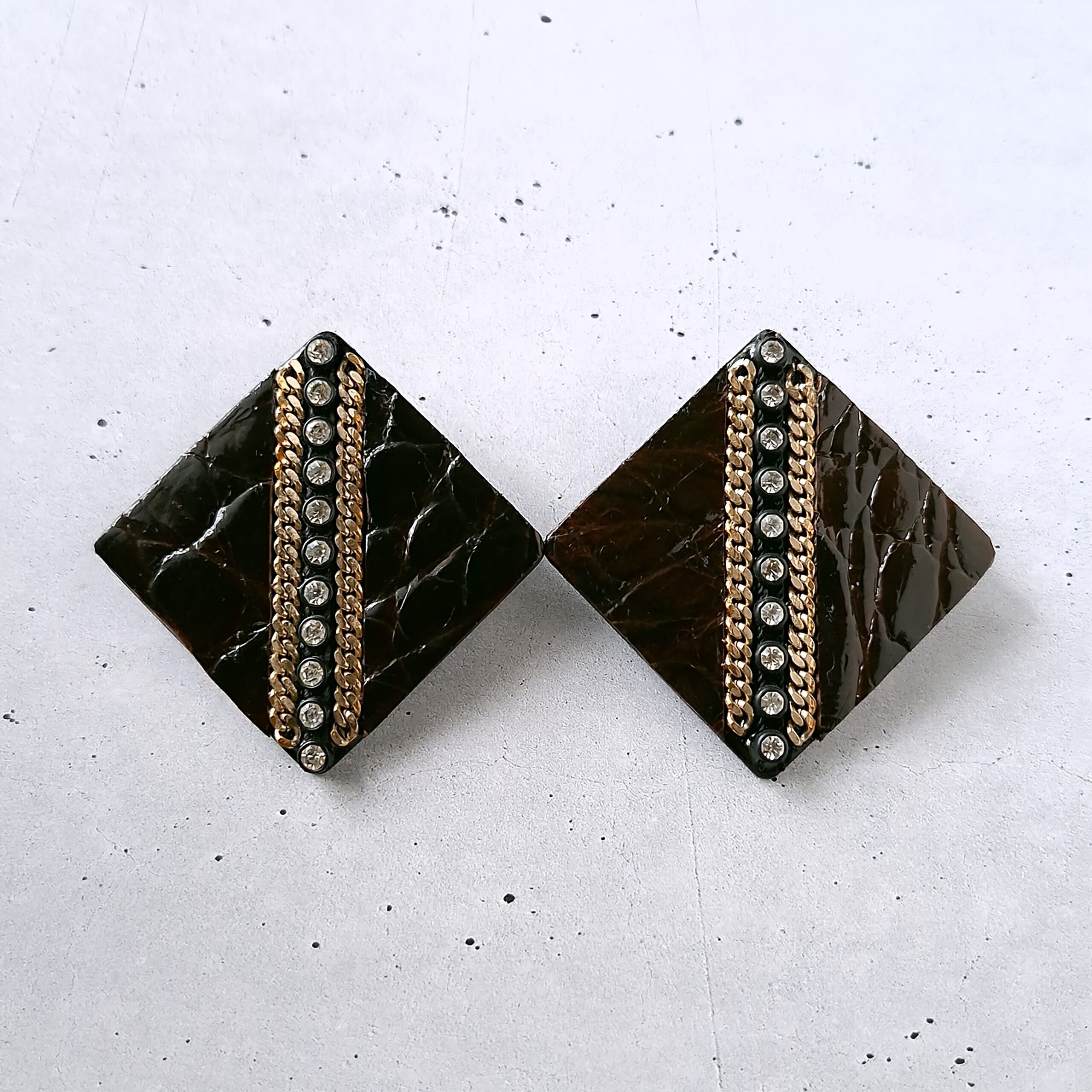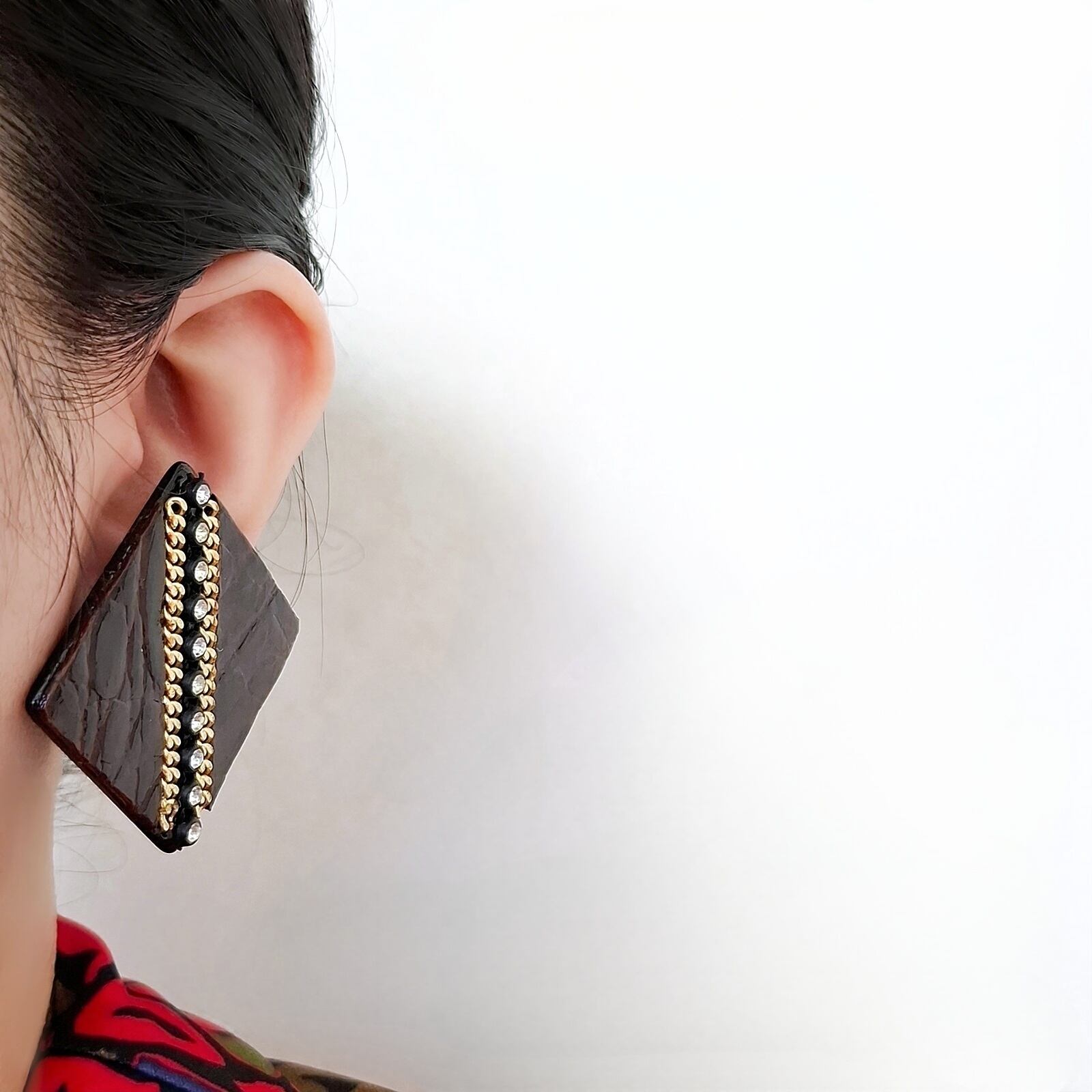 ブラックのベースプラスチックにダークブラウンのフェイクレザー、ゴールドメタルチェーン、クリアラインストーンがあしらわれた大ぶりな菱形のヴィンテージイヤリングです。