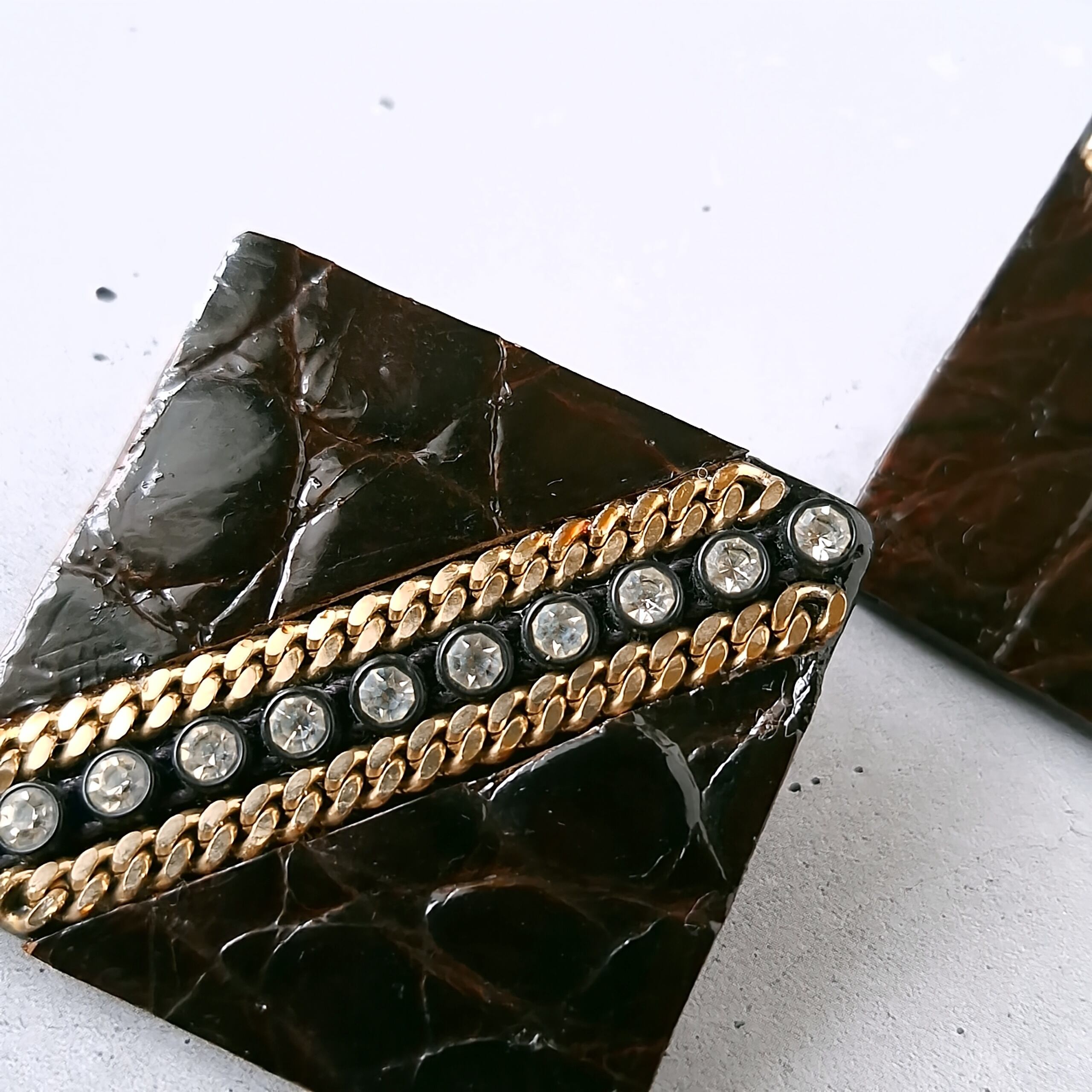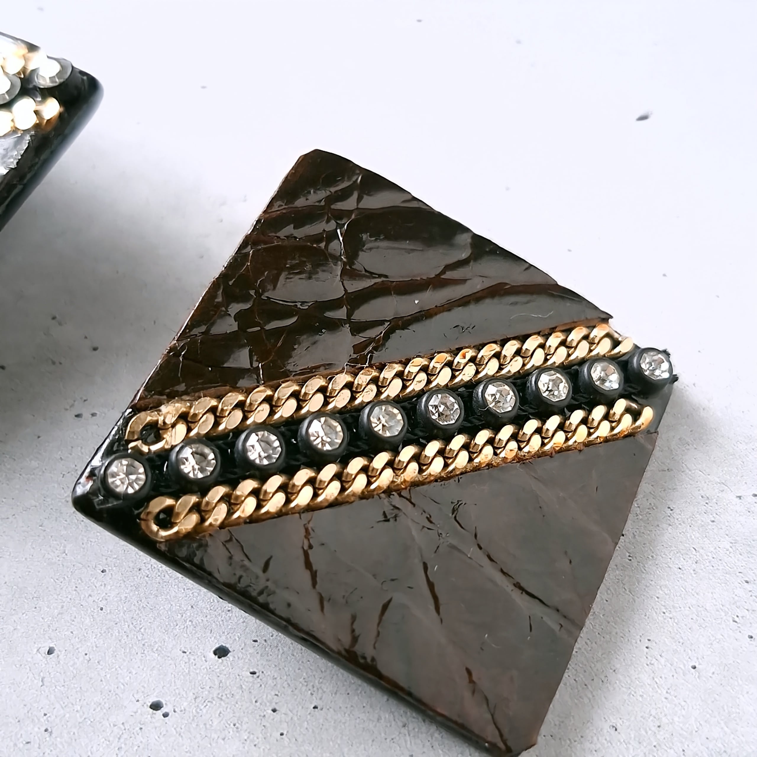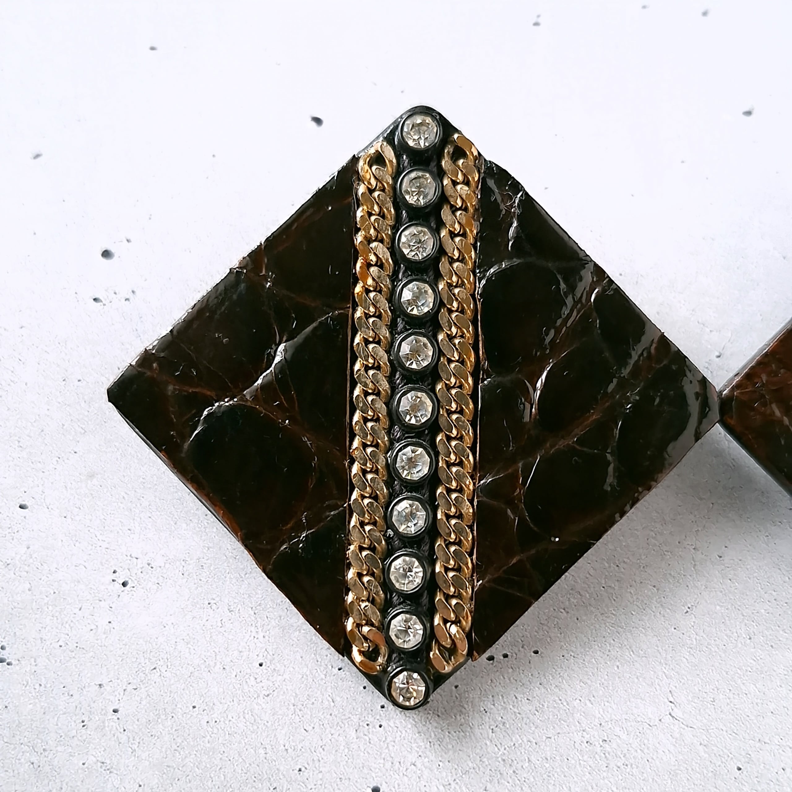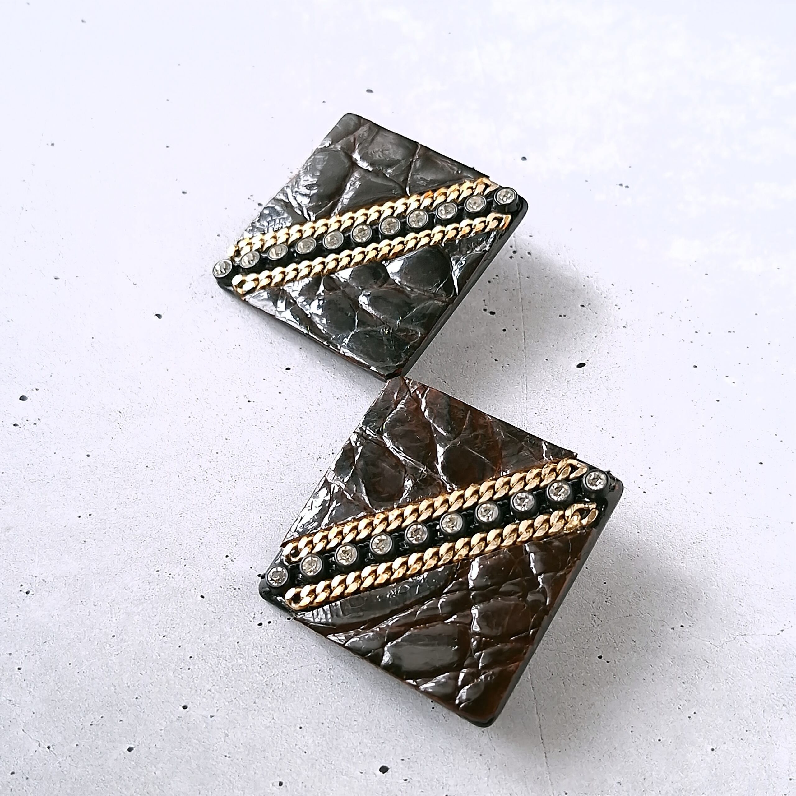 ブラックのベースプラスチックにダークブラウンのフェイクレザー、ゴールドメタルチェーン、クリアラインストーンがあしらわれた大ぶりな菱形のヴィンテージイヤリングです。