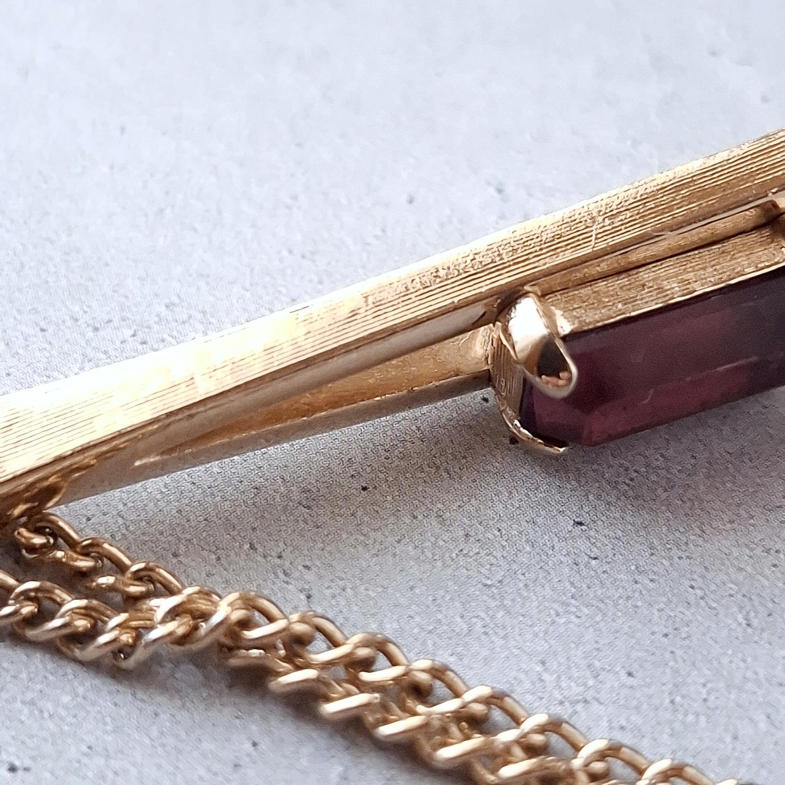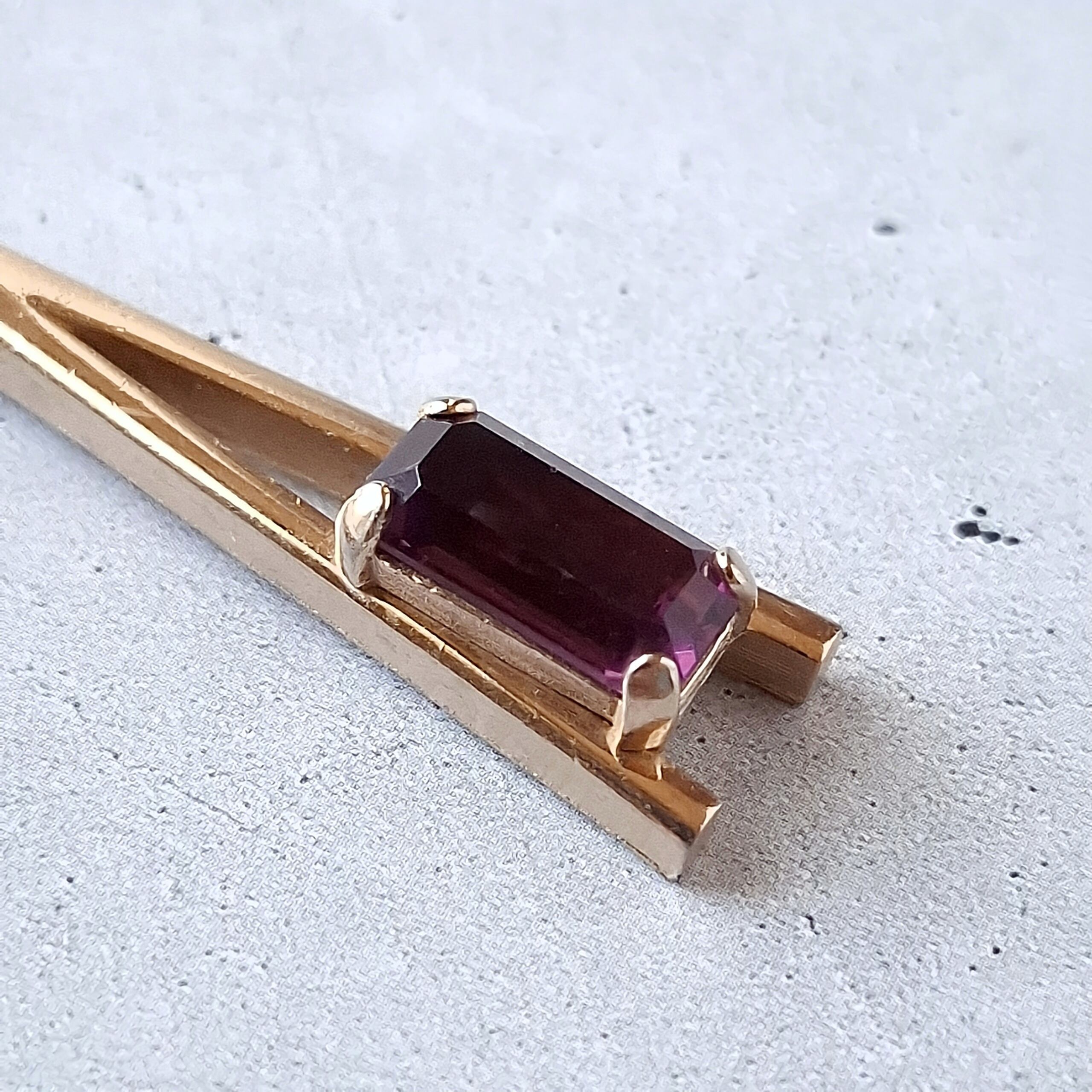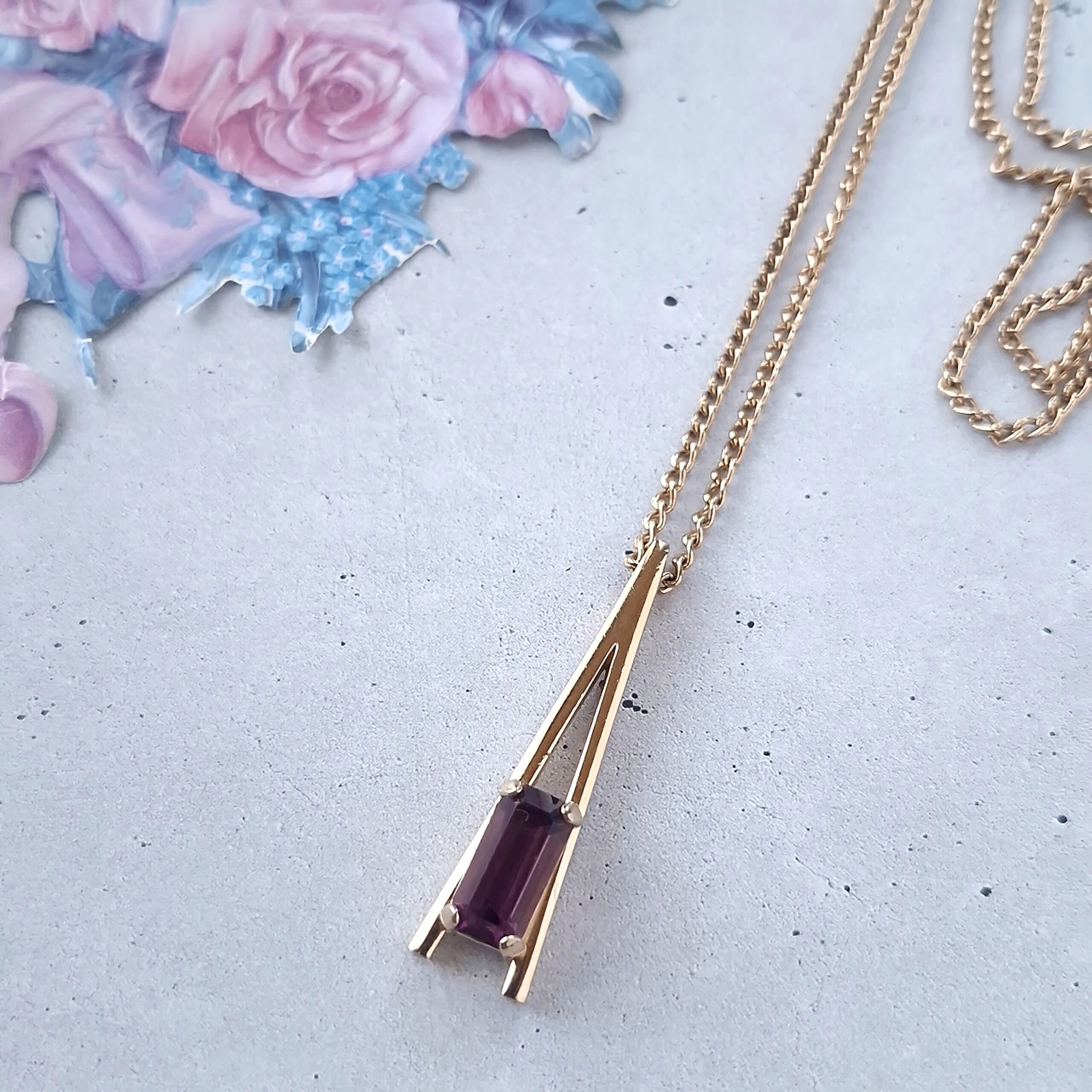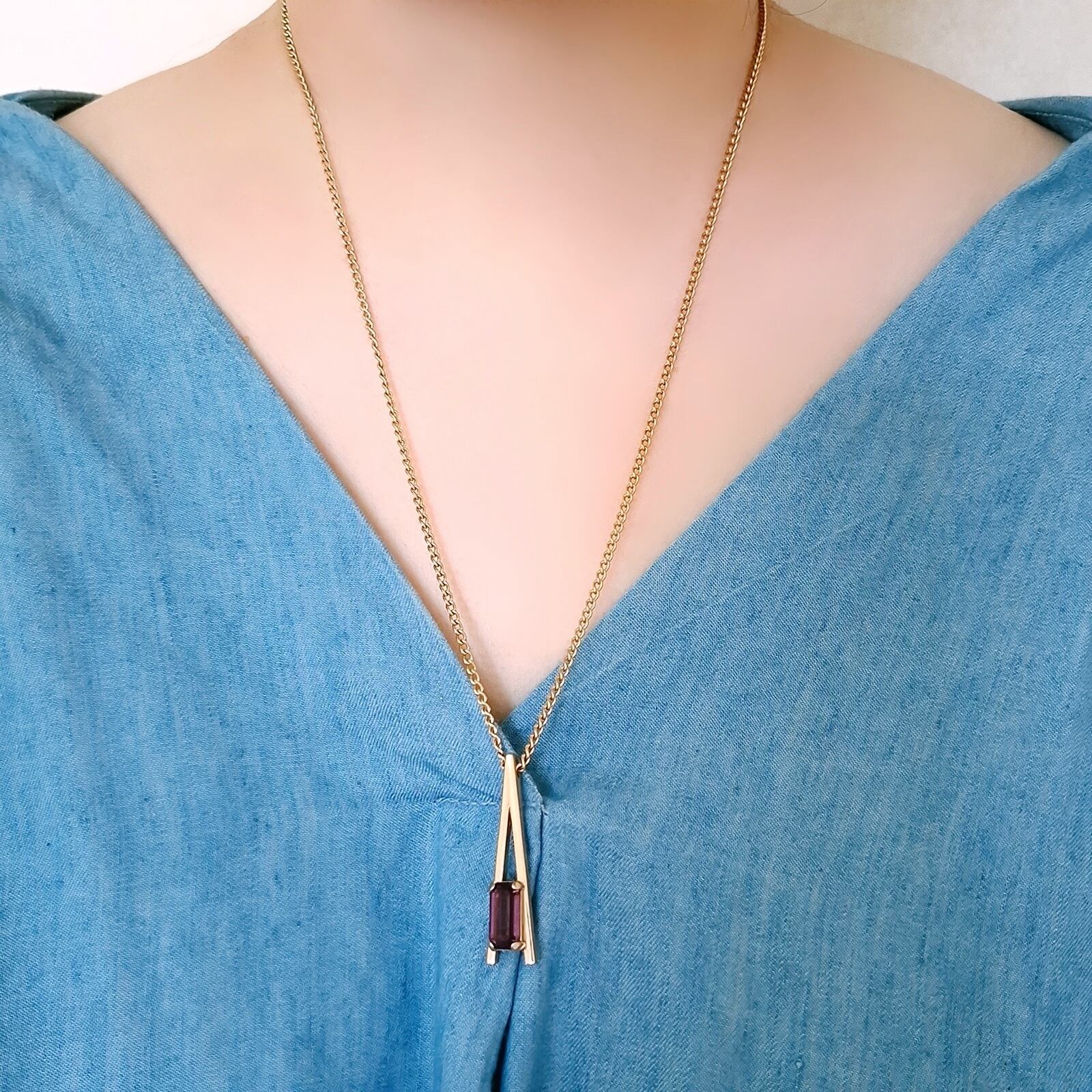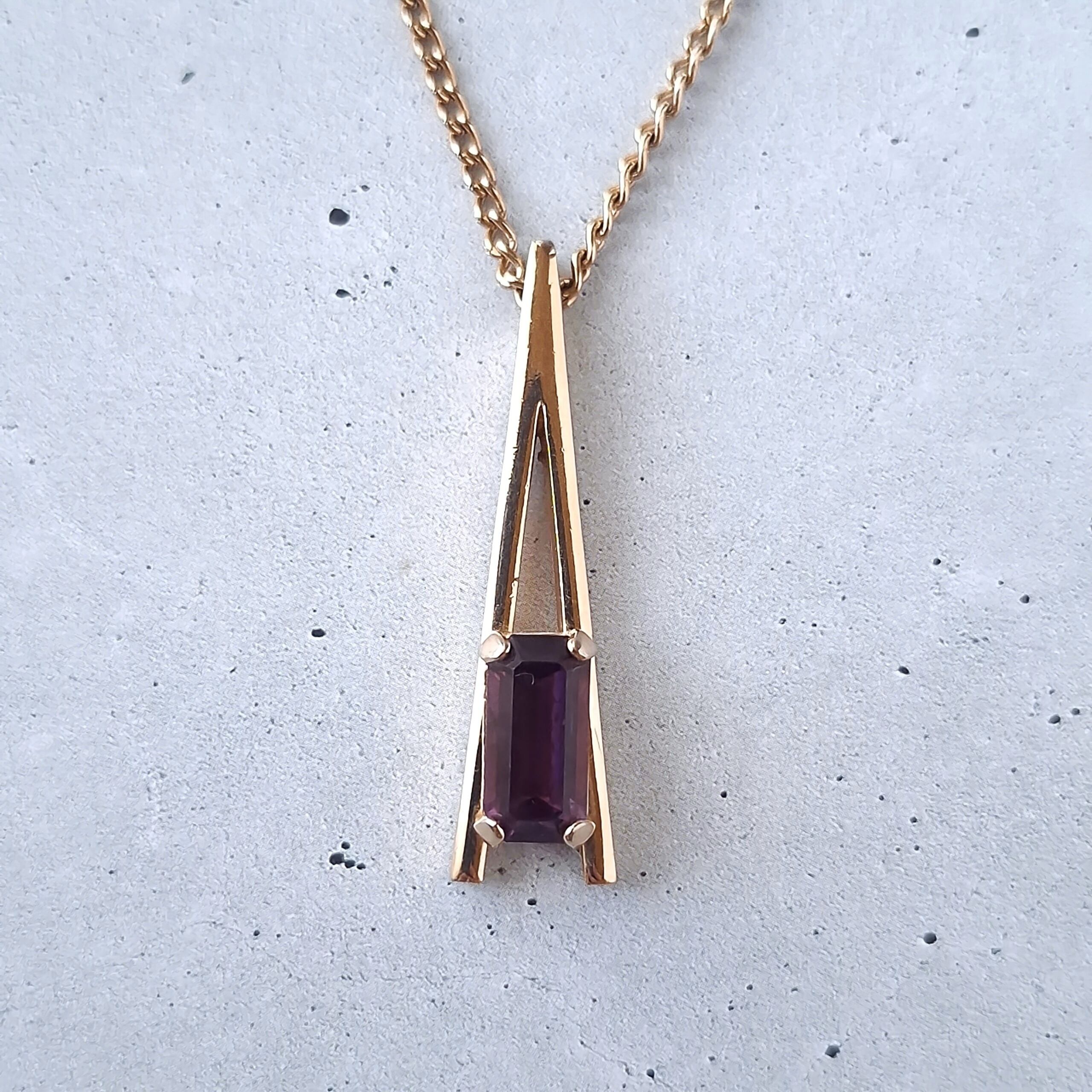 1886年アメリカのニューヨークにて小さな香水会社を創業、1971年に本格的にコスチュームジュエリーの製作を開始したAvon(エイボン)の1975年に販売された“Plaza IV Collection”の三角のゴールドメタルにスクエアカットのパープルのラインストーンがセットされたヴィンテージネックレスです。