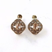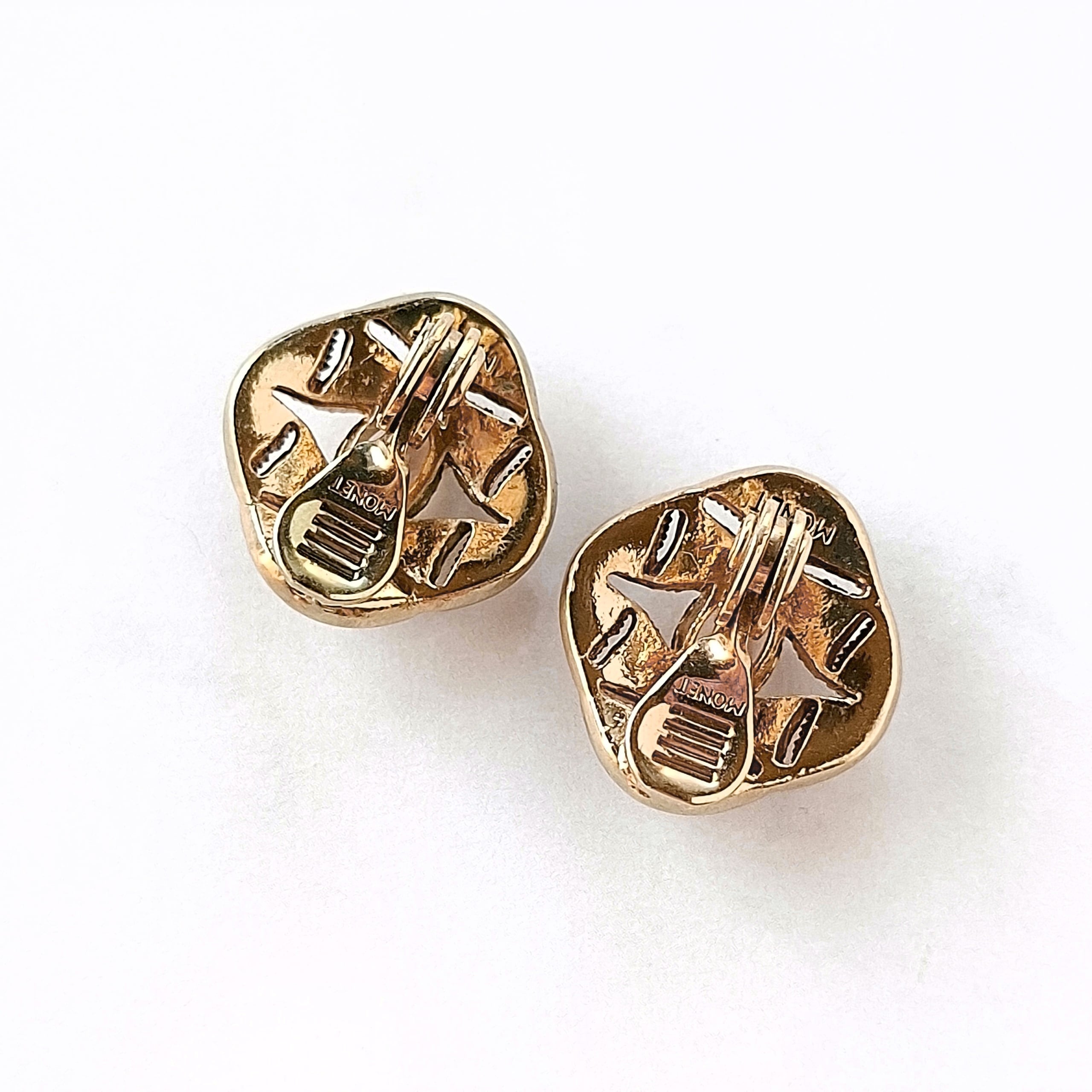 1927年ロードアイランドにて創業、1937年会社名を変更しアクセサリー制作を開始したMONET(モネ)の黒ずみ加工が施された菱形のオープンワークゴールドメタルにライトコロラドトパーズラインストーンがあしらわれたヴィンテージイヤリングです。