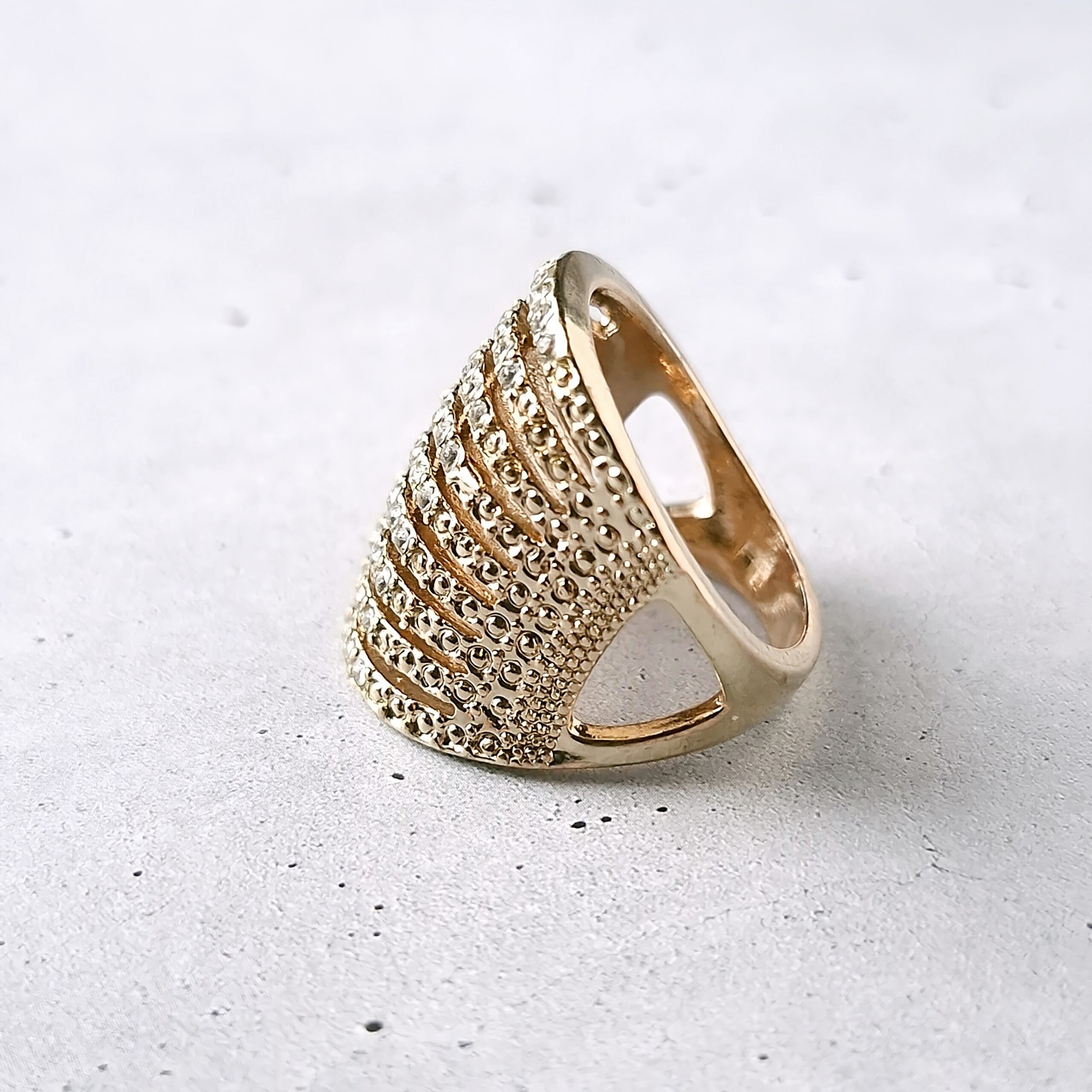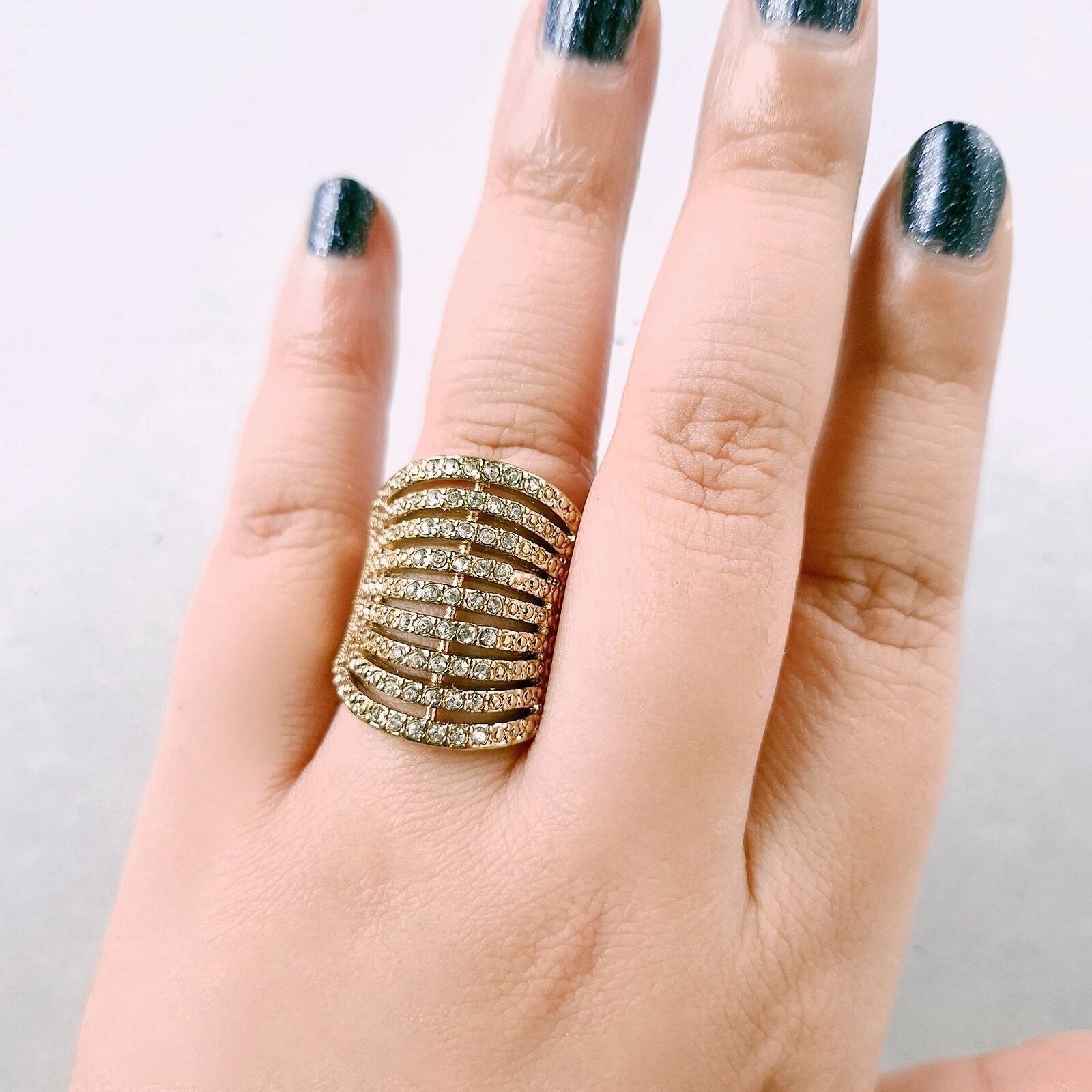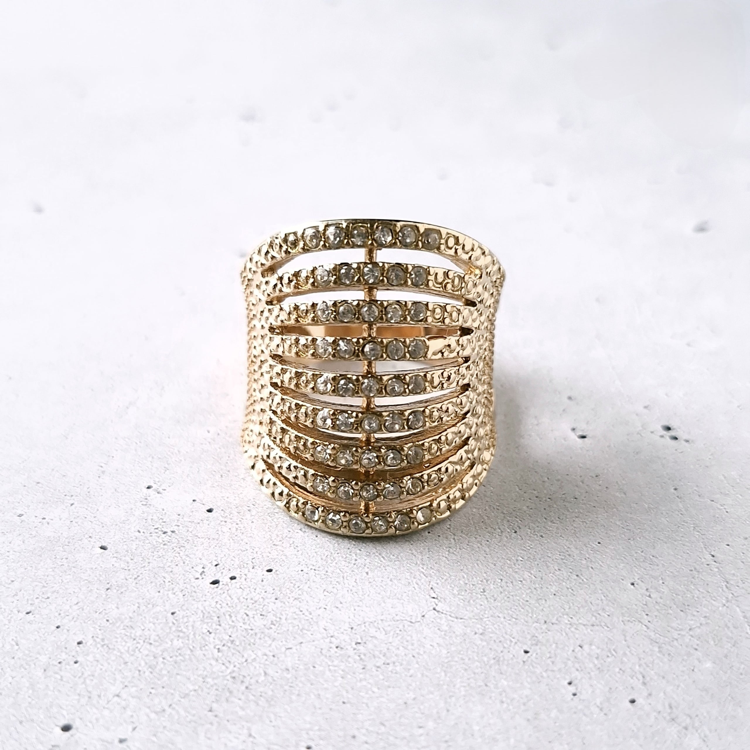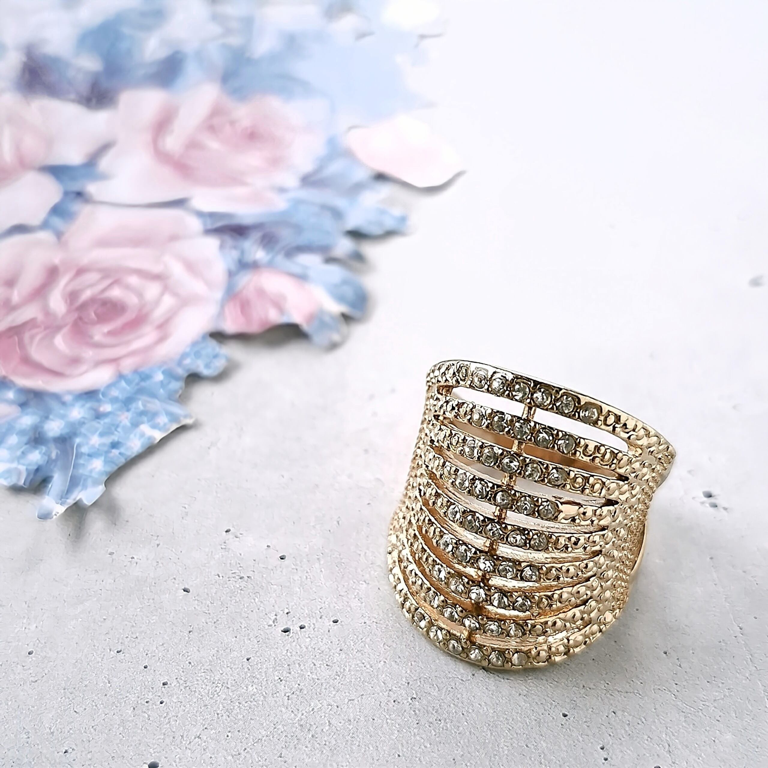 1886年アメリカのニューヨークにて小さな香水会社を創業、1971年に本格的にコスチュームジュエリーの製作を開始したAvon(エイボン)の2015年に販売された“DANCING SHIMMER”の中央にクリアラインストーンがあしらわれたレイヤードデザインのワイドなヴィンテージリングです。