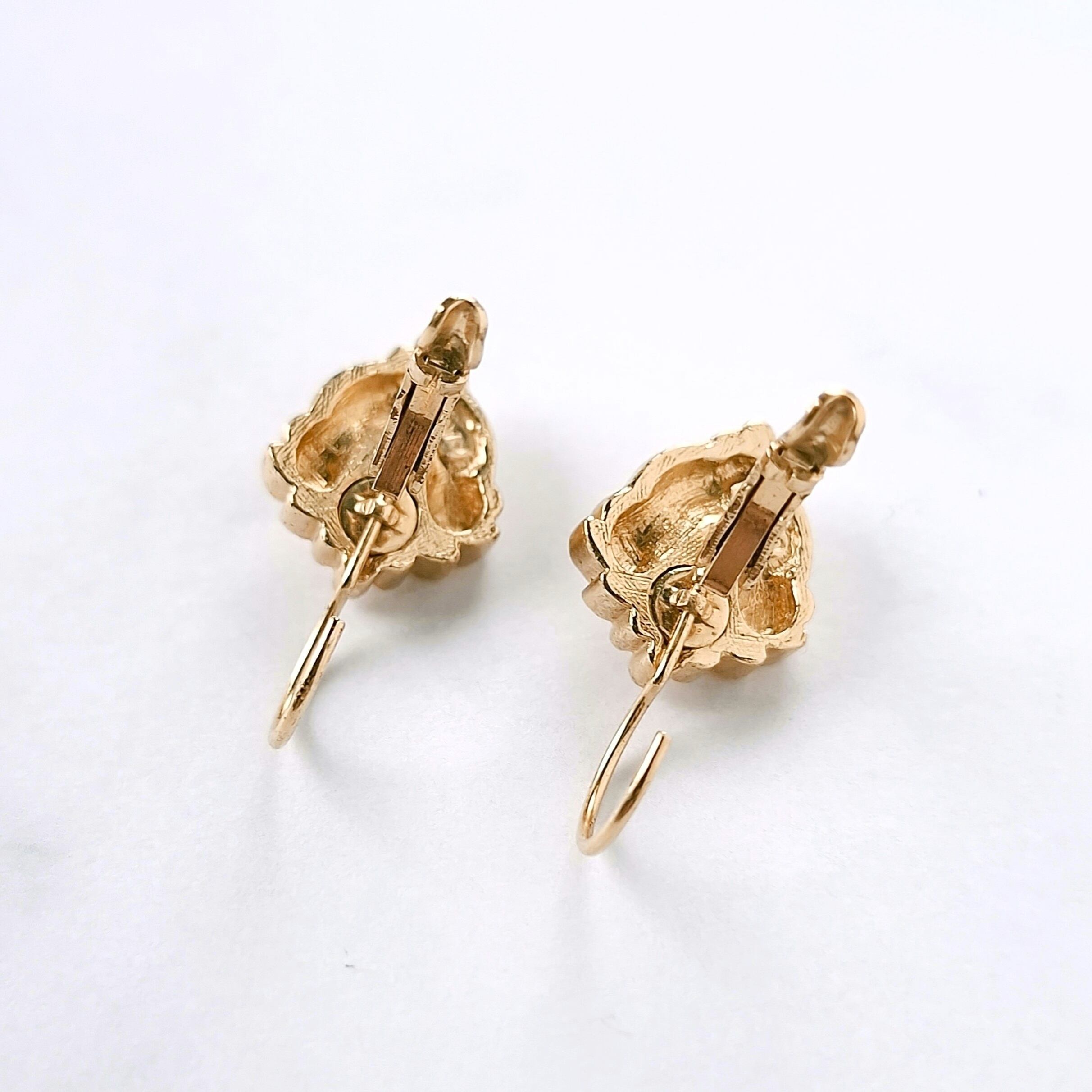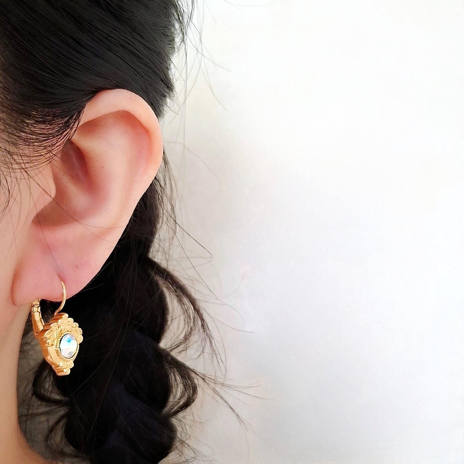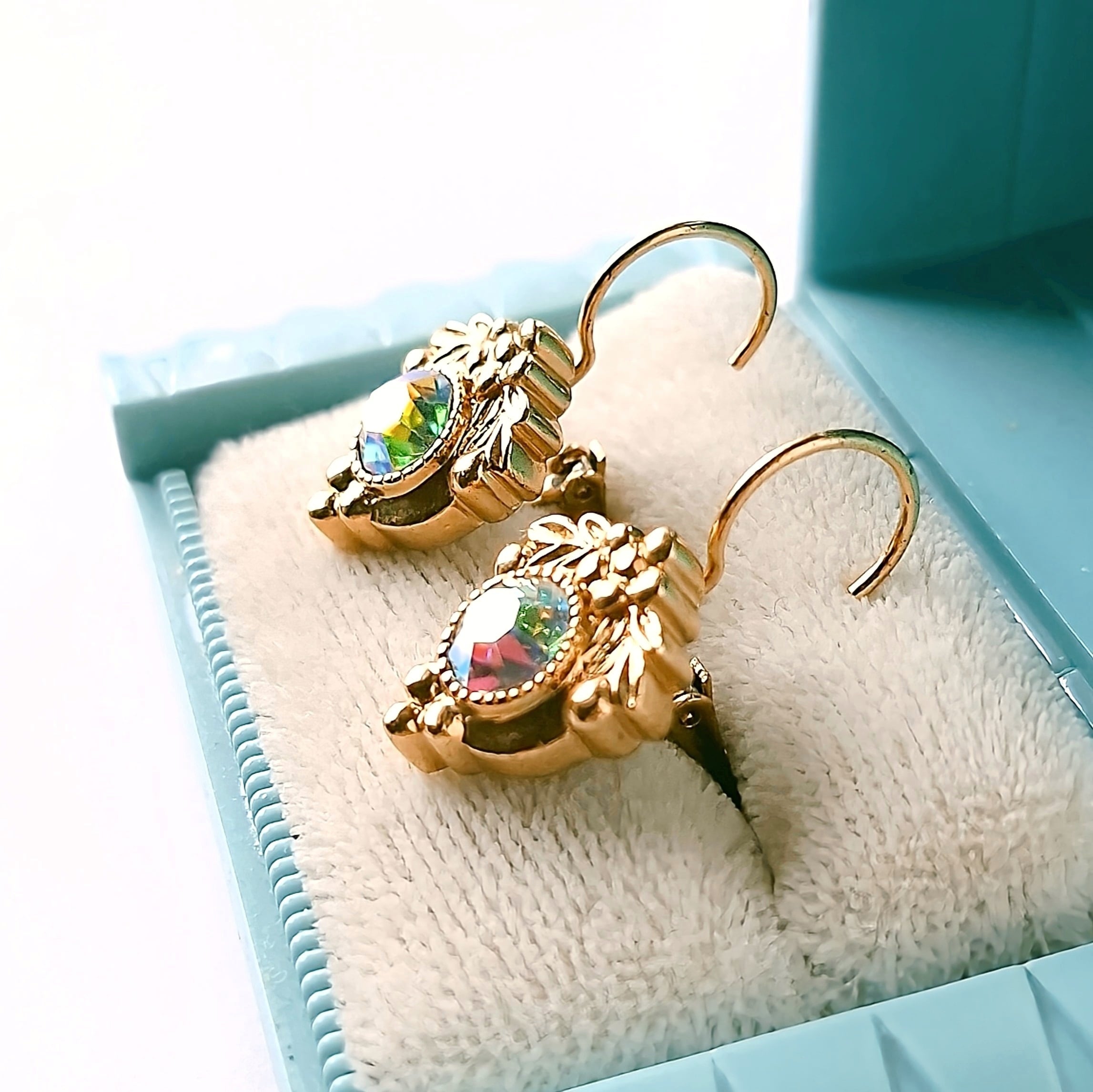 1886年アメリカのニューヨークにて小さな香水会社を創業、1971年に本格的にコスチュームジュエリーの製作を開始したAvon(エイボン)の1997年に販売された“GOLDEN LEVERBACK”のオーロララインストーンがあしらわれたメタルにフラワー、リーフ、木の実の装飾が施されたアール・ヌーヴォーデザインのヴィンテージピアスです。