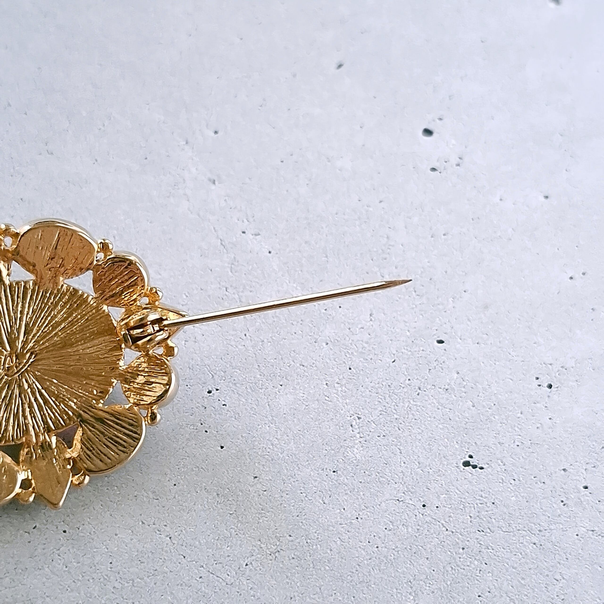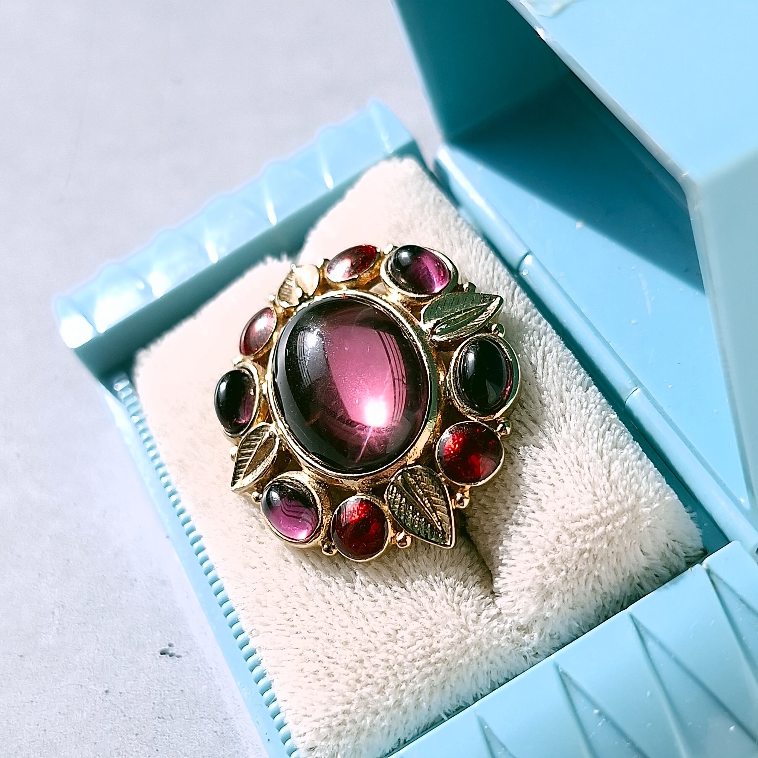 1976年にアメリカにて創業したLiz Claiborne(リズ・クレイボーン)のリーフの装飾が施されたメタルにクリアレッドのエナメルの色付けとパープルのガラスカボションがあしらわれたヴィンテージブローチです。