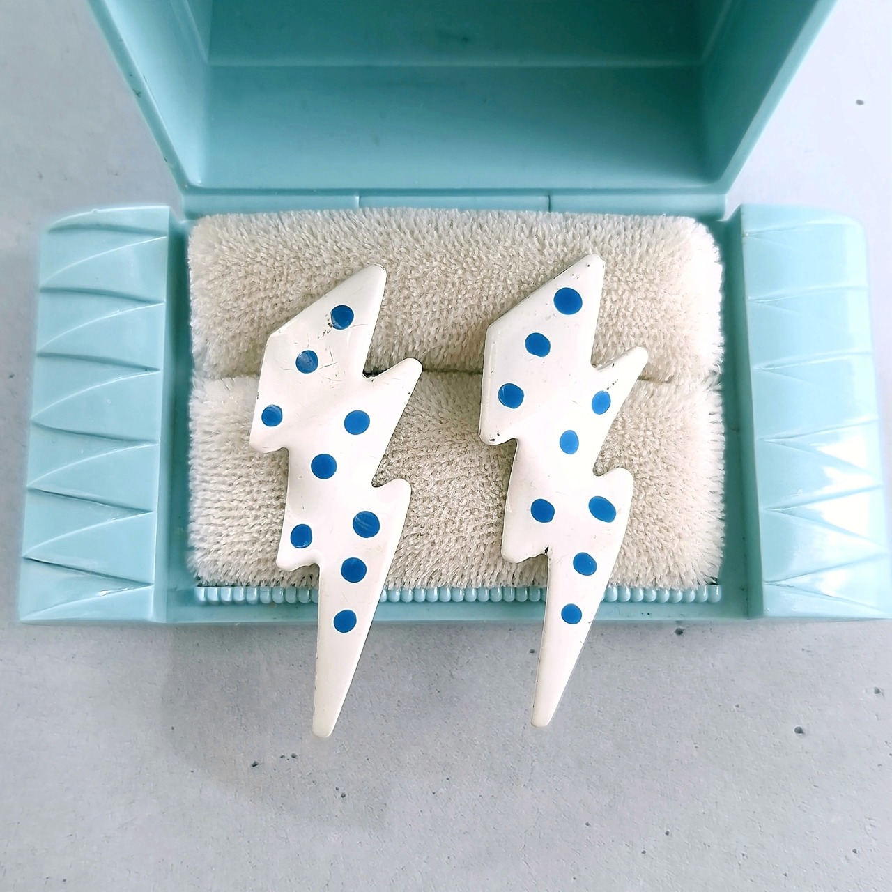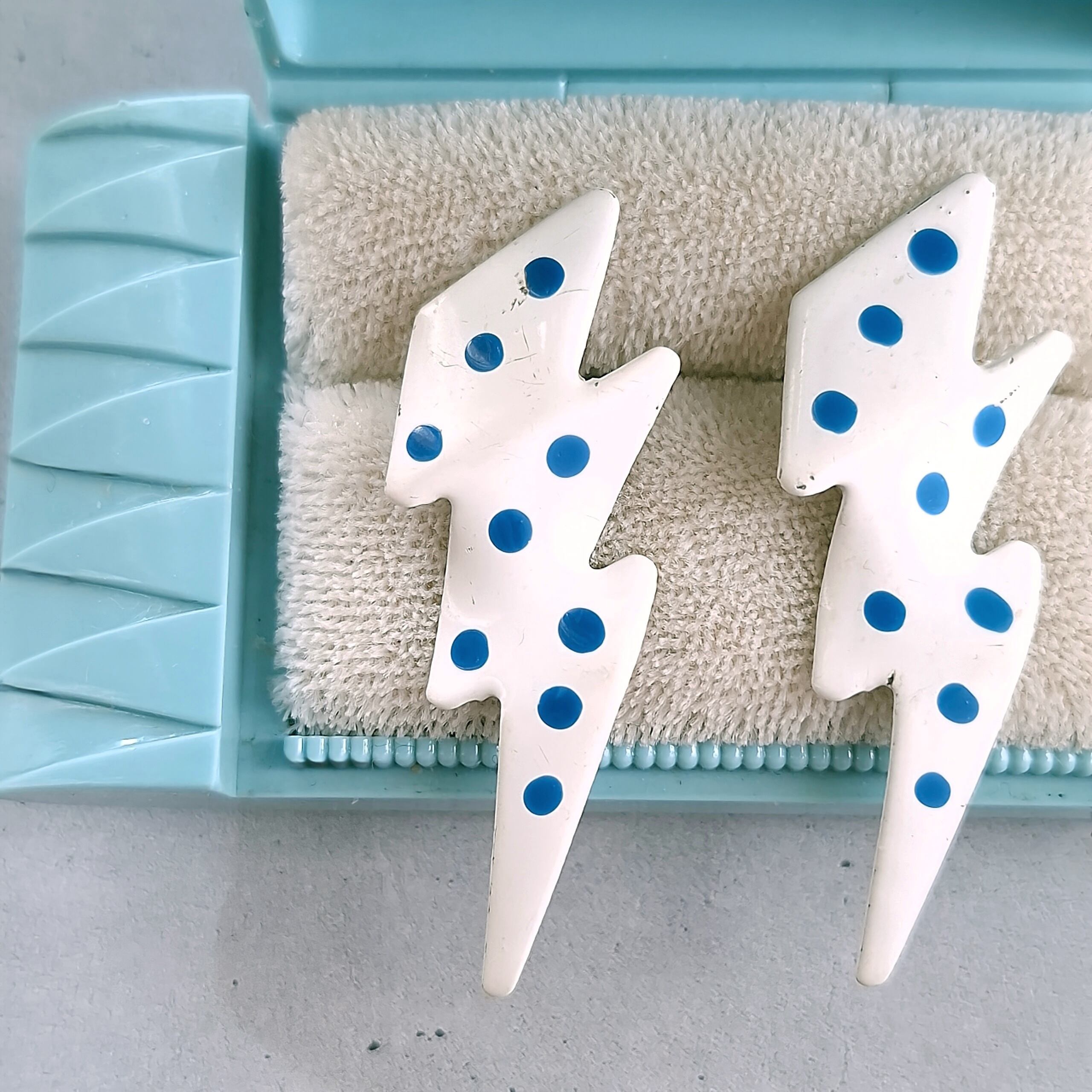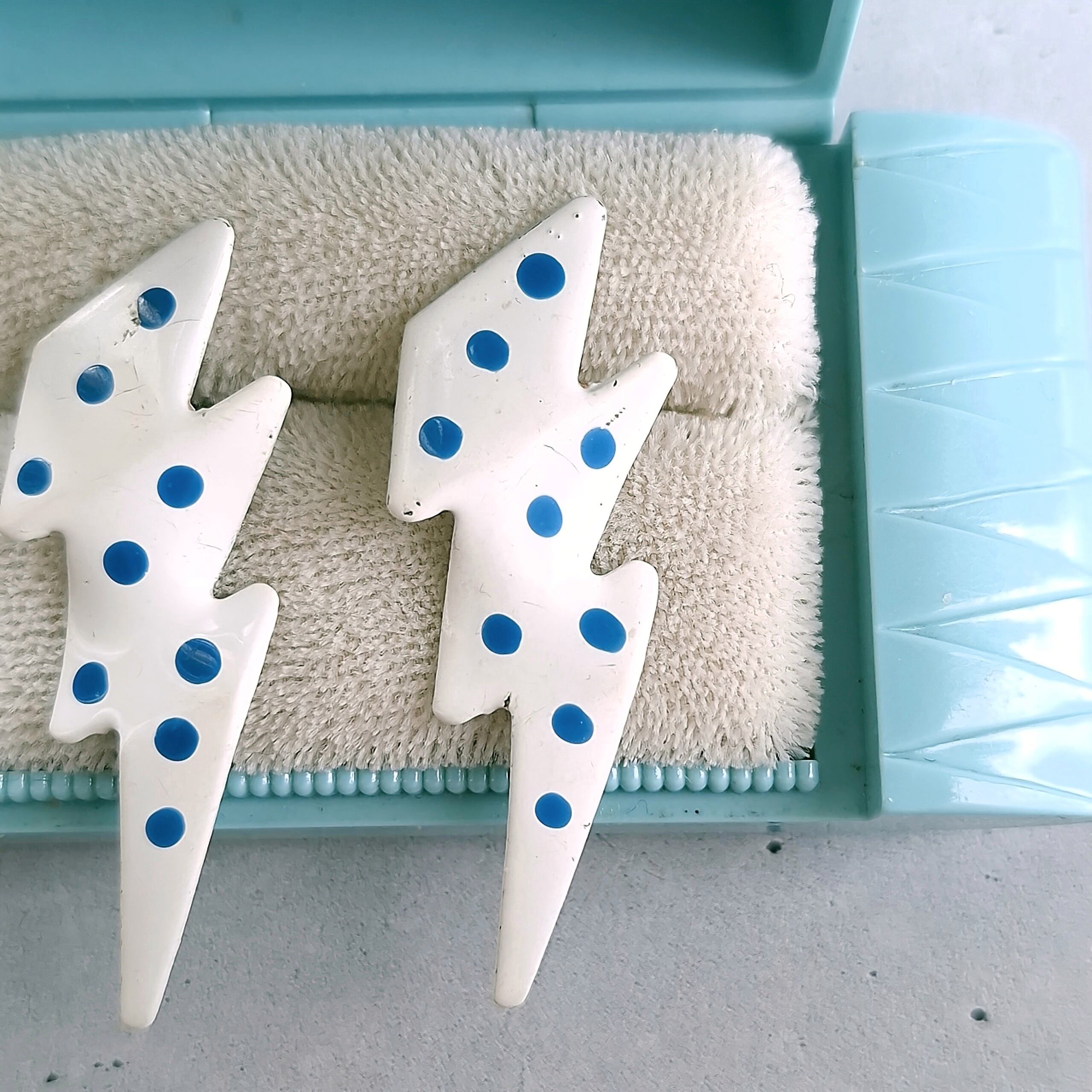 ホワイトに色付けされた上からブルーのエナメルでドット模様がペイントされた稲妻の形をしたヴィンテージピアスです。