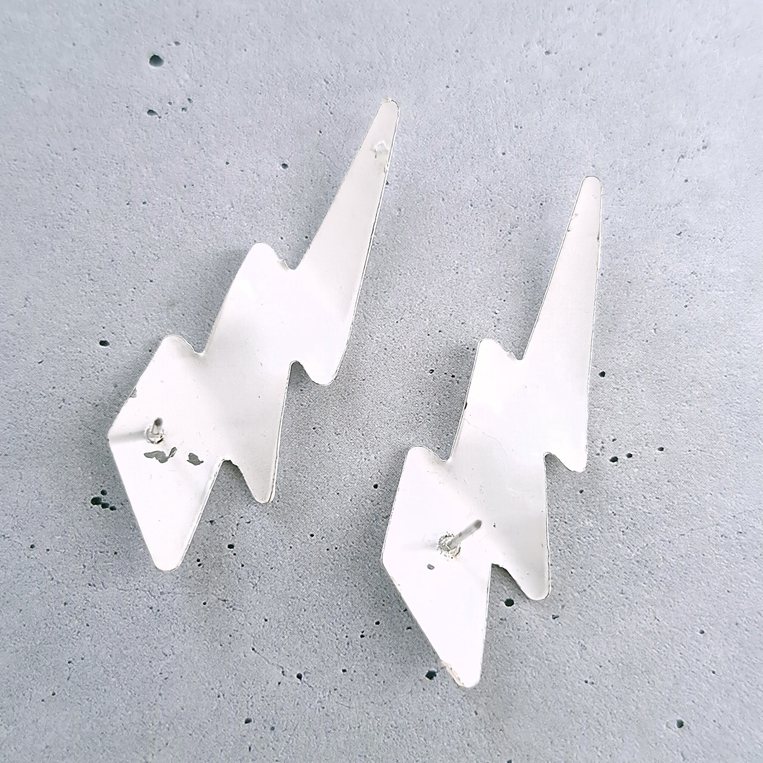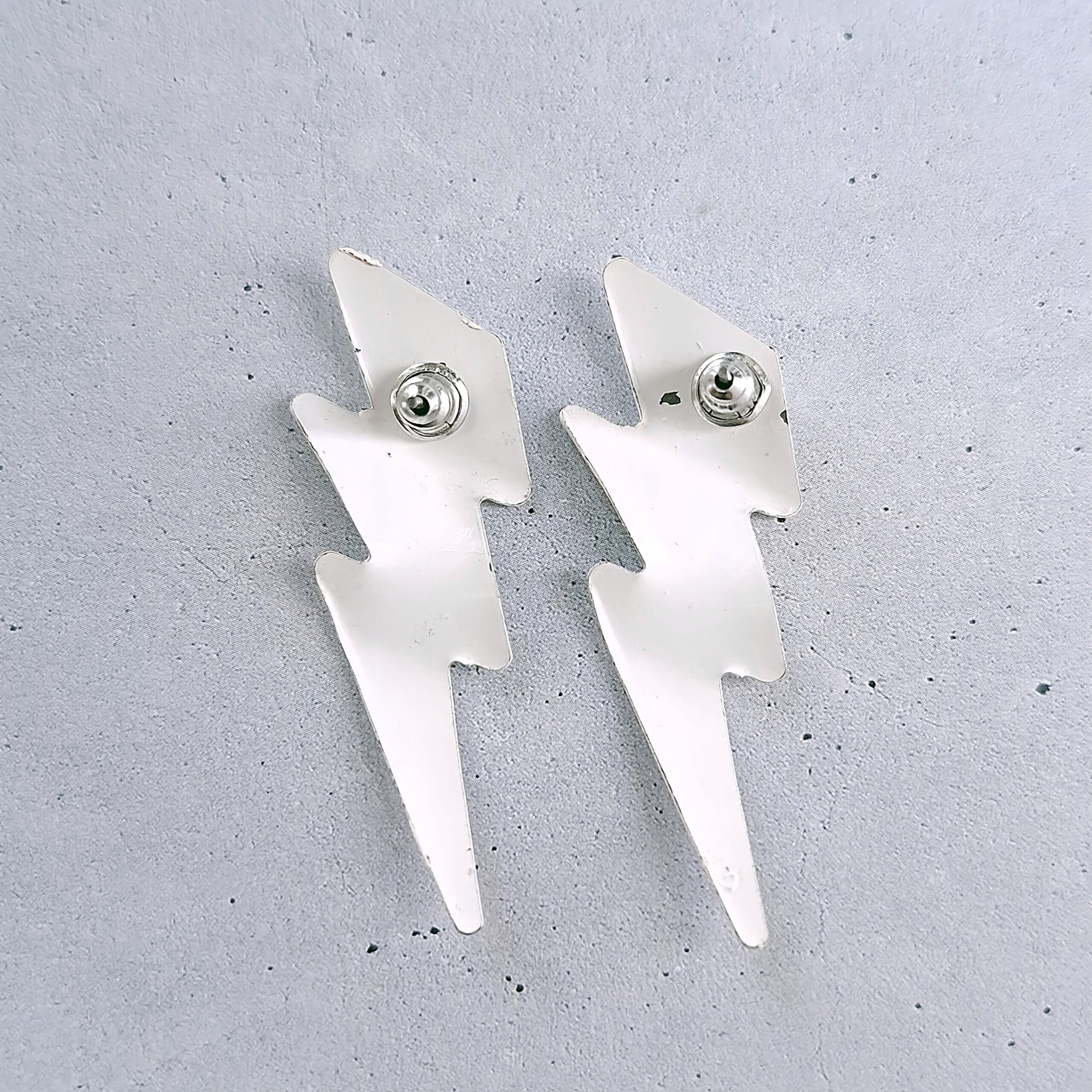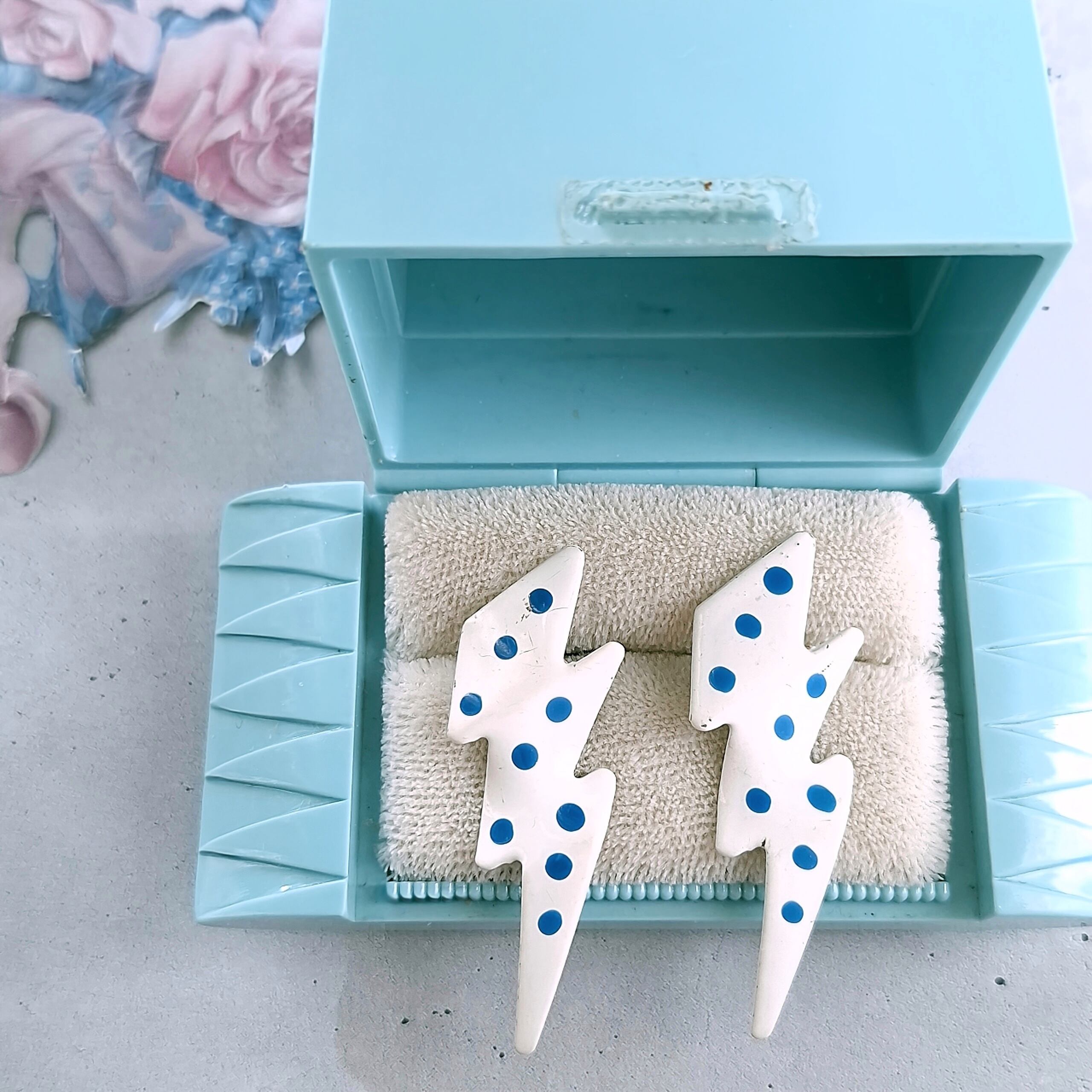 ホワイトに色付けされた上からブルーのエナメルでドット模様がペイントされた稲妻の形をしたヴィンテージピアスです。