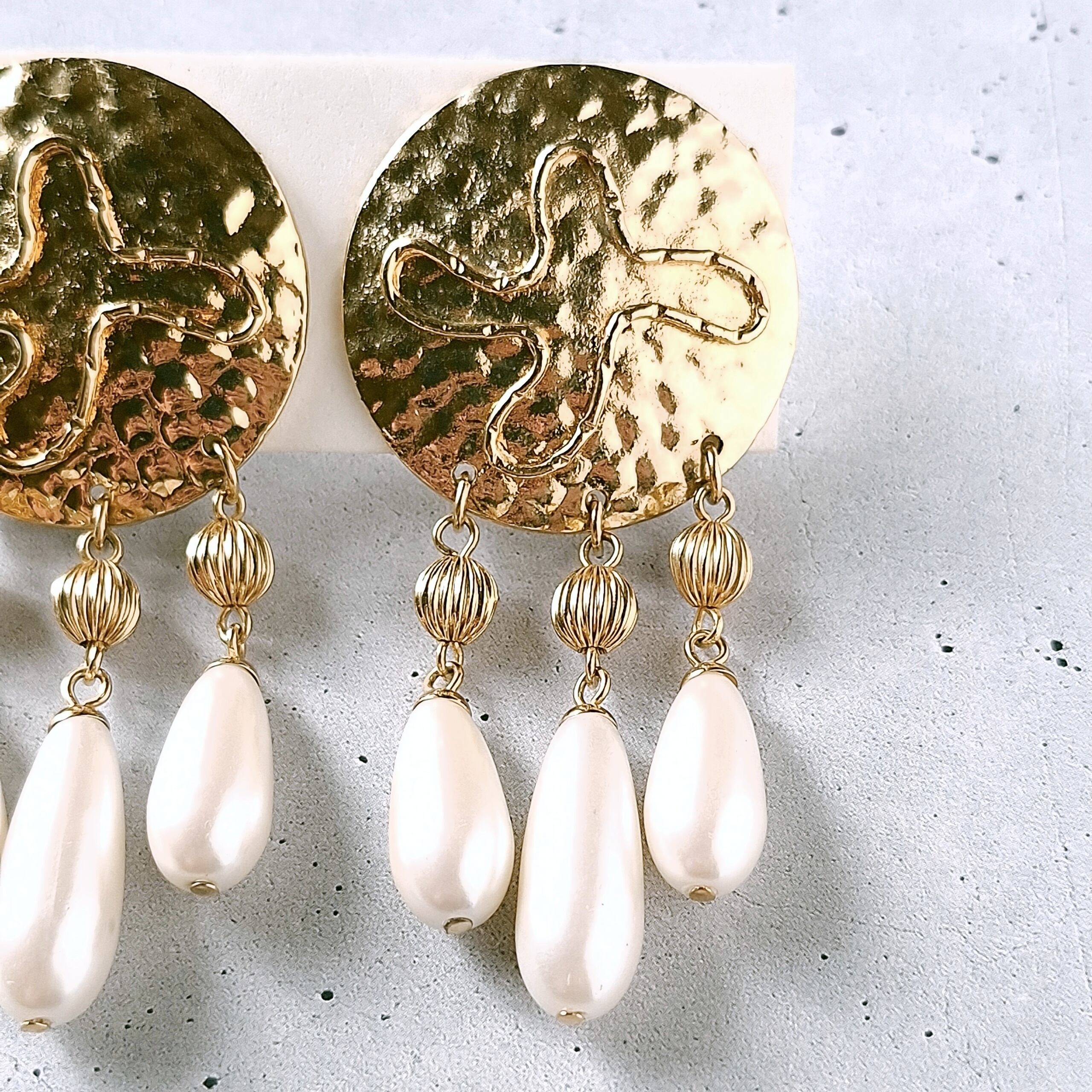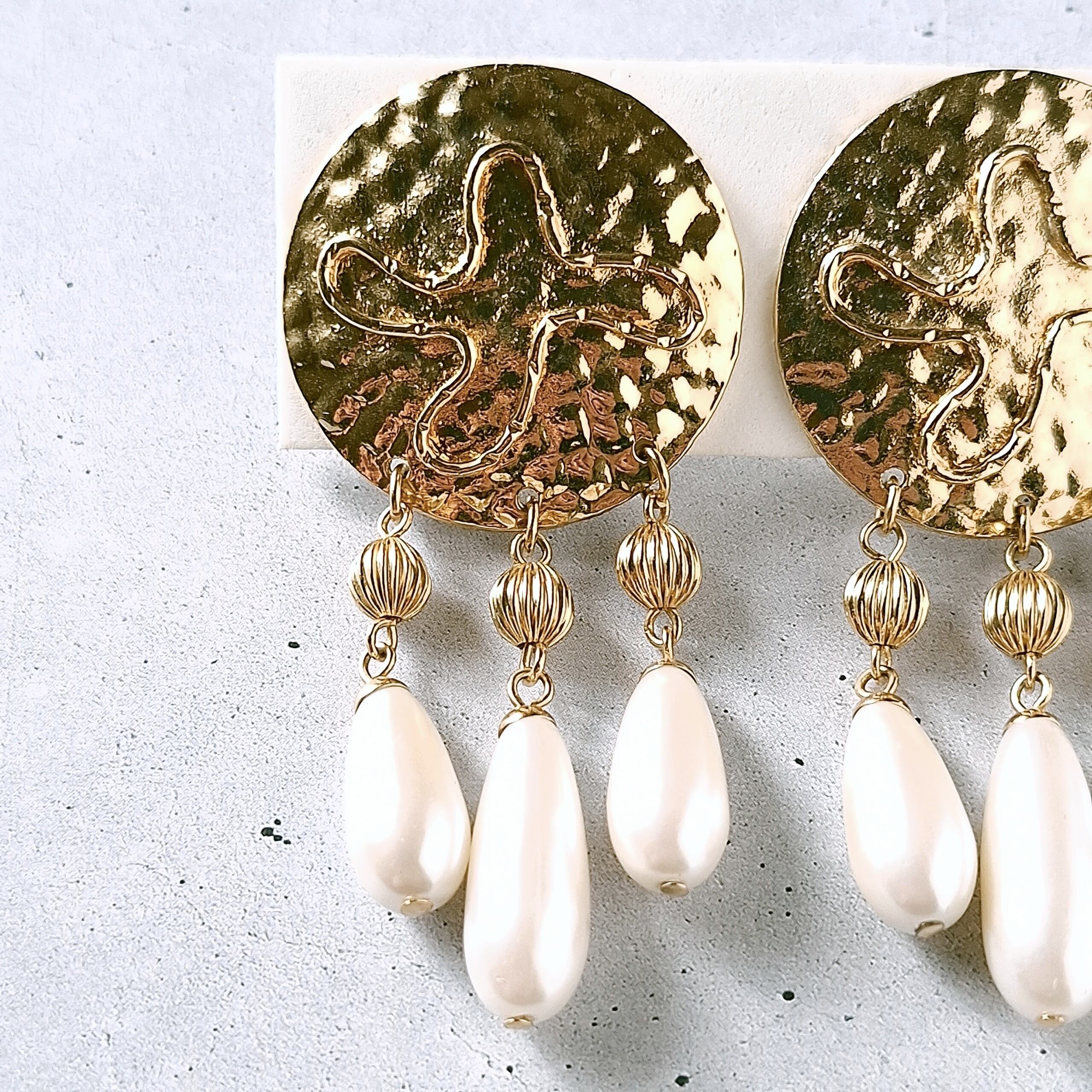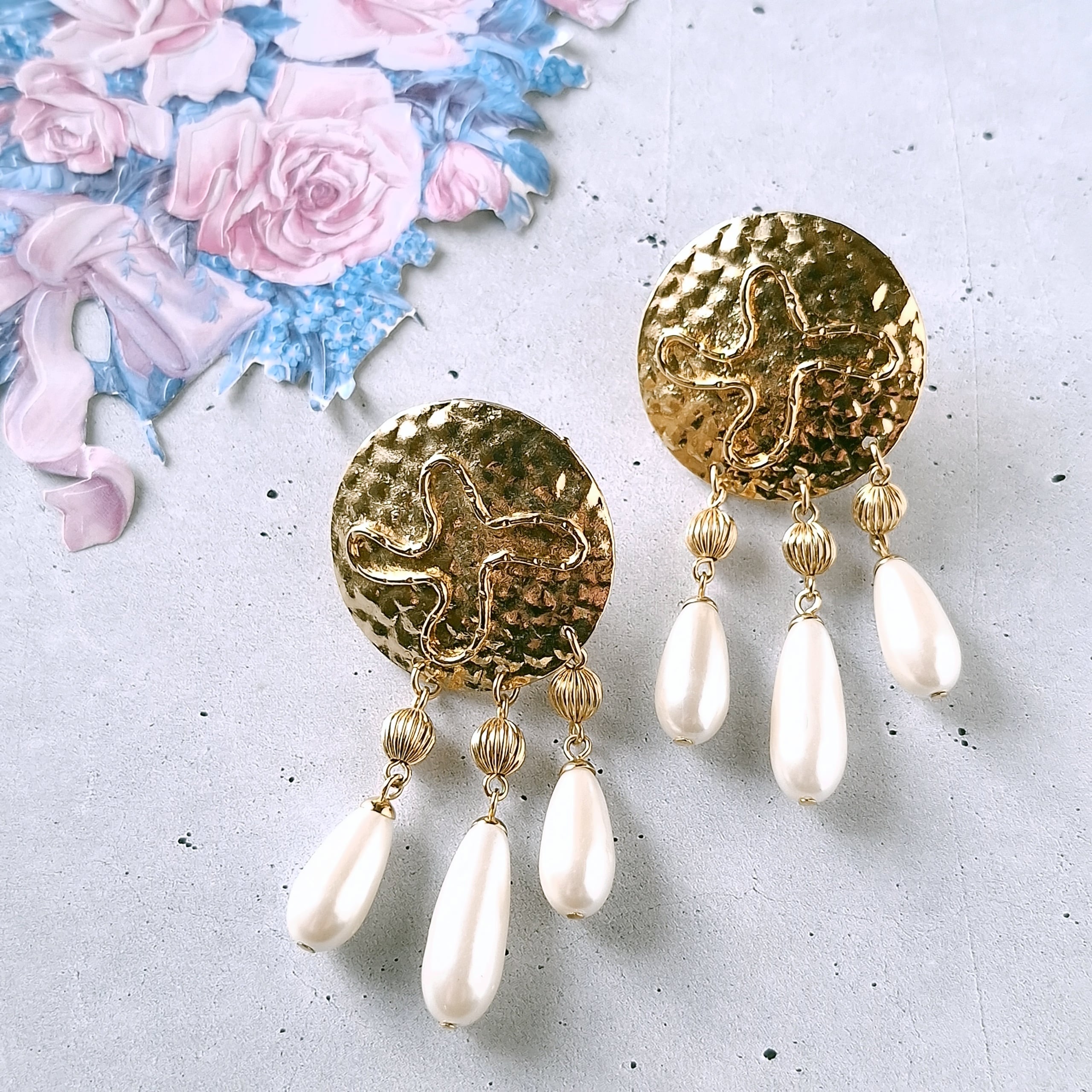 ワイヤーワークでフラワーのような模様が施されたゴールドメタルのラウンドに垂れ下がったティアドロップ型のフェイクパールが揺れるデザインの大ぶりなヴィンテージイヤリングです。