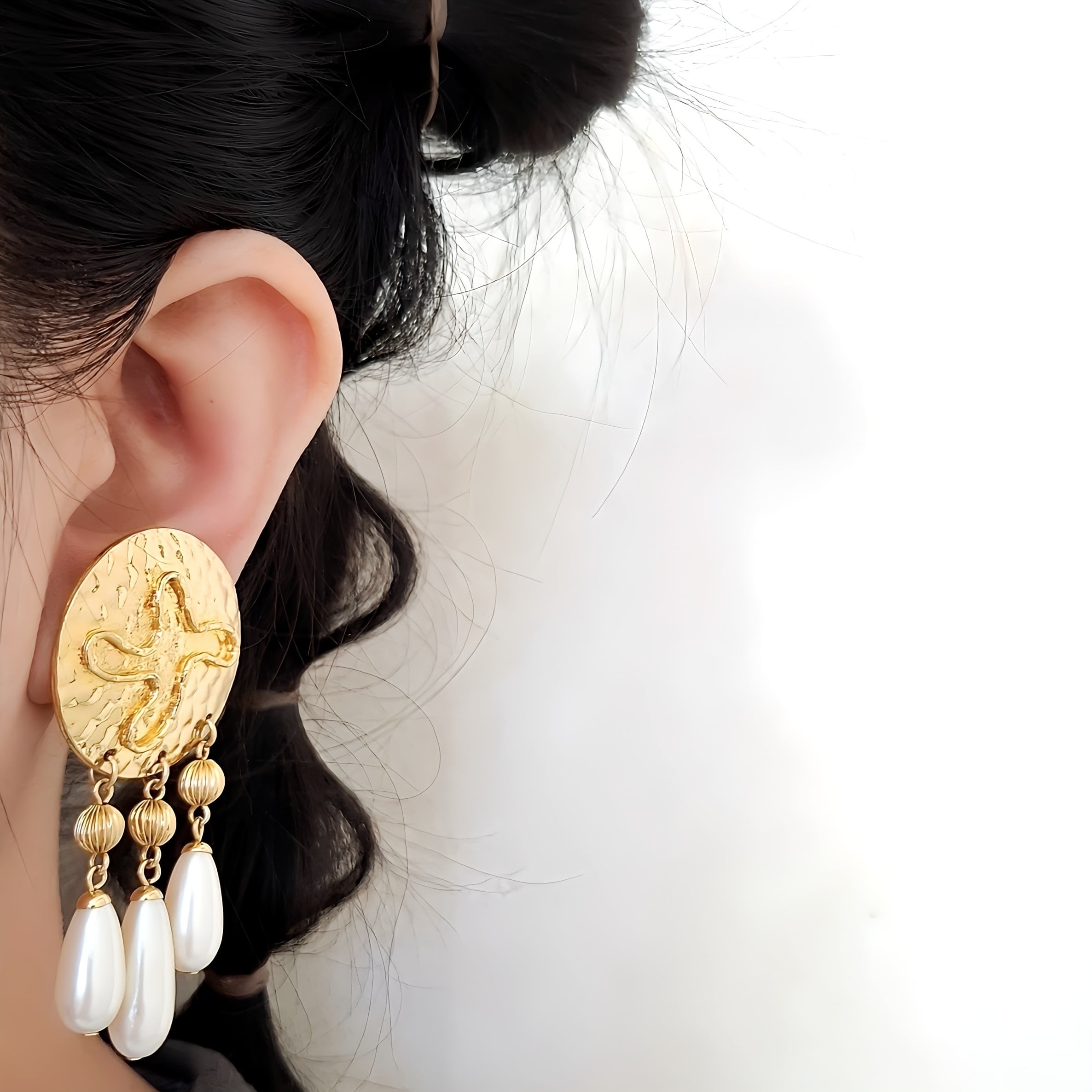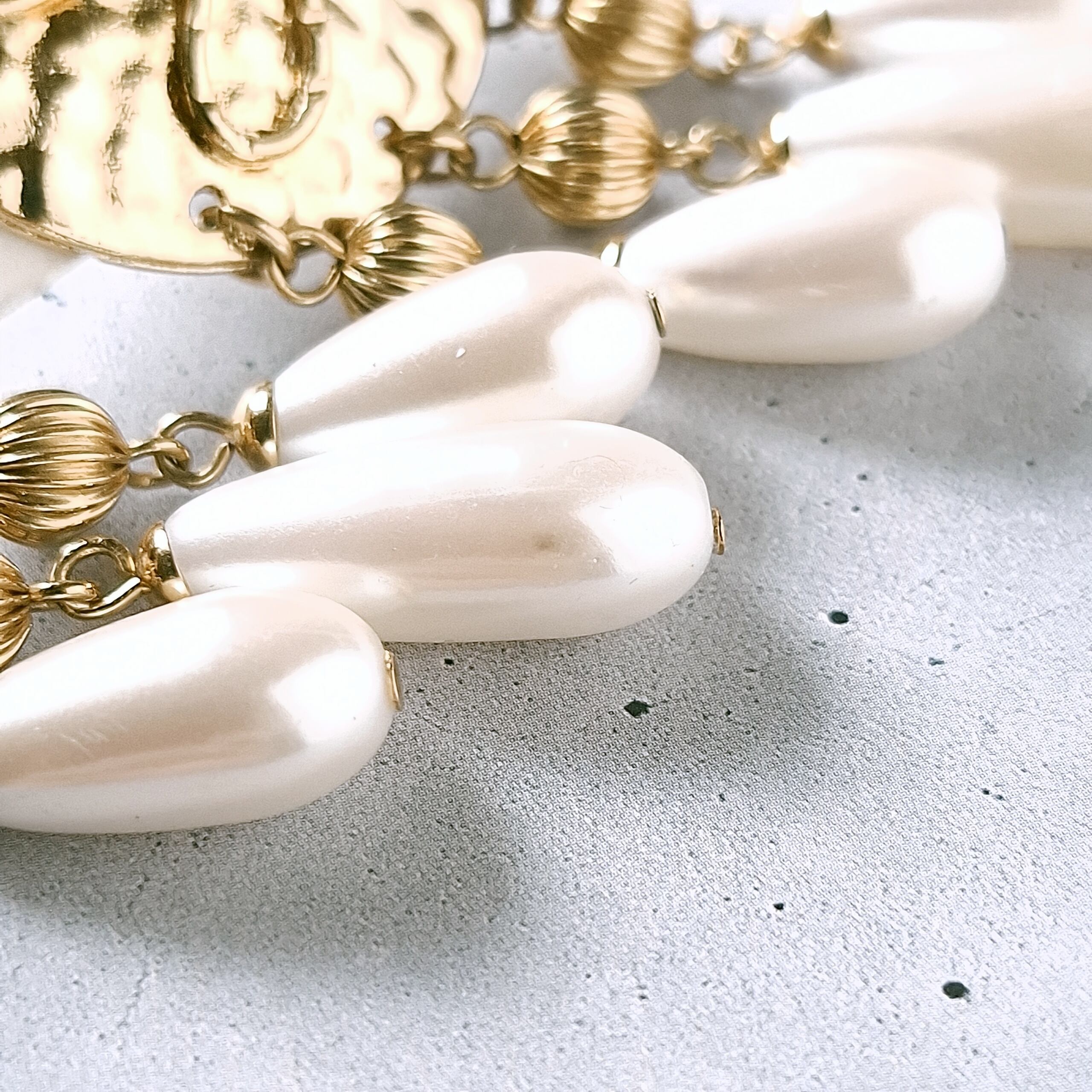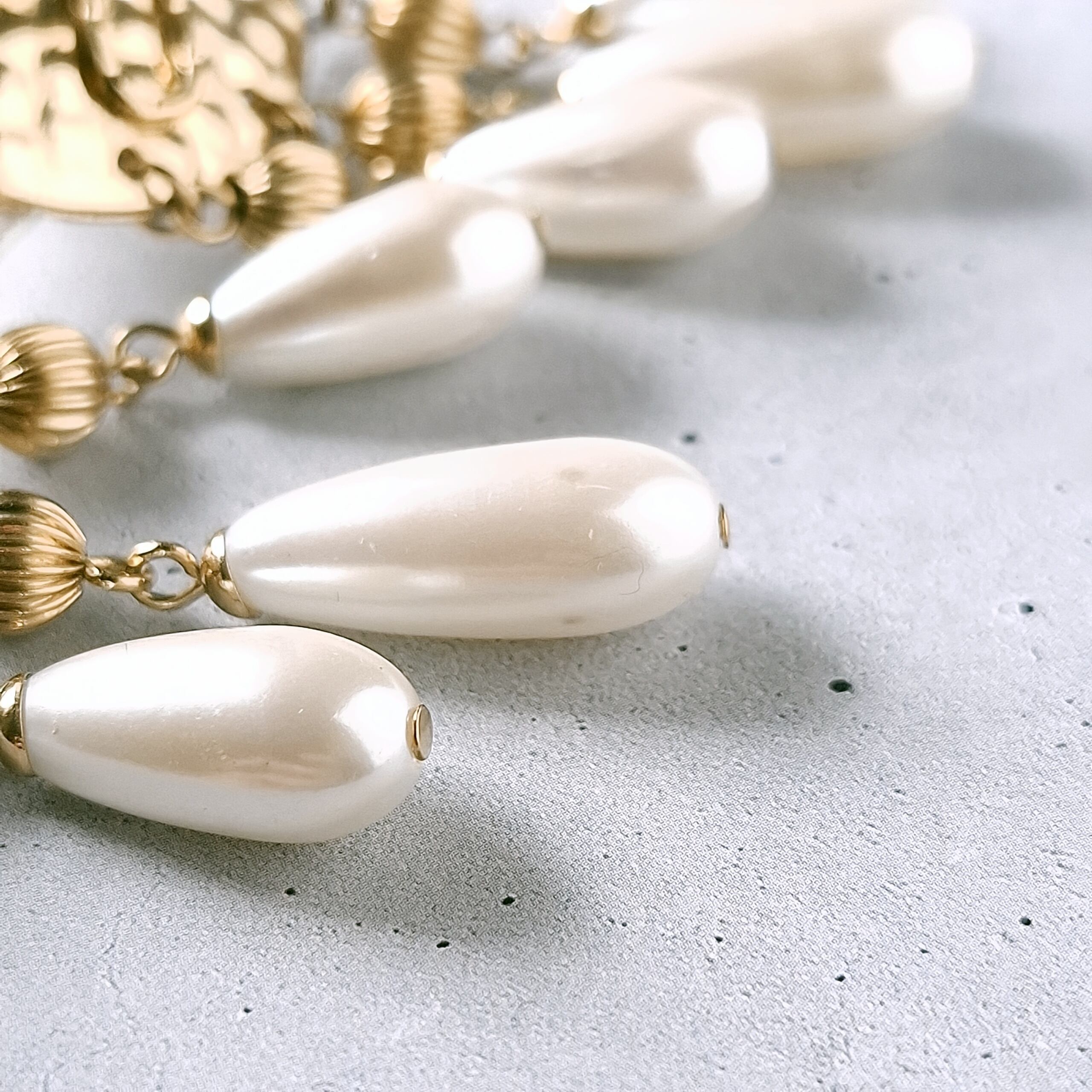ワイヤーワークでフラワーのような模様が施されたゴールドメタルのラウンドに垂れ下がったティアドロップ型のフェイクパールが揺れるデザインの大ぶりなヴィンテージイヤリングです。