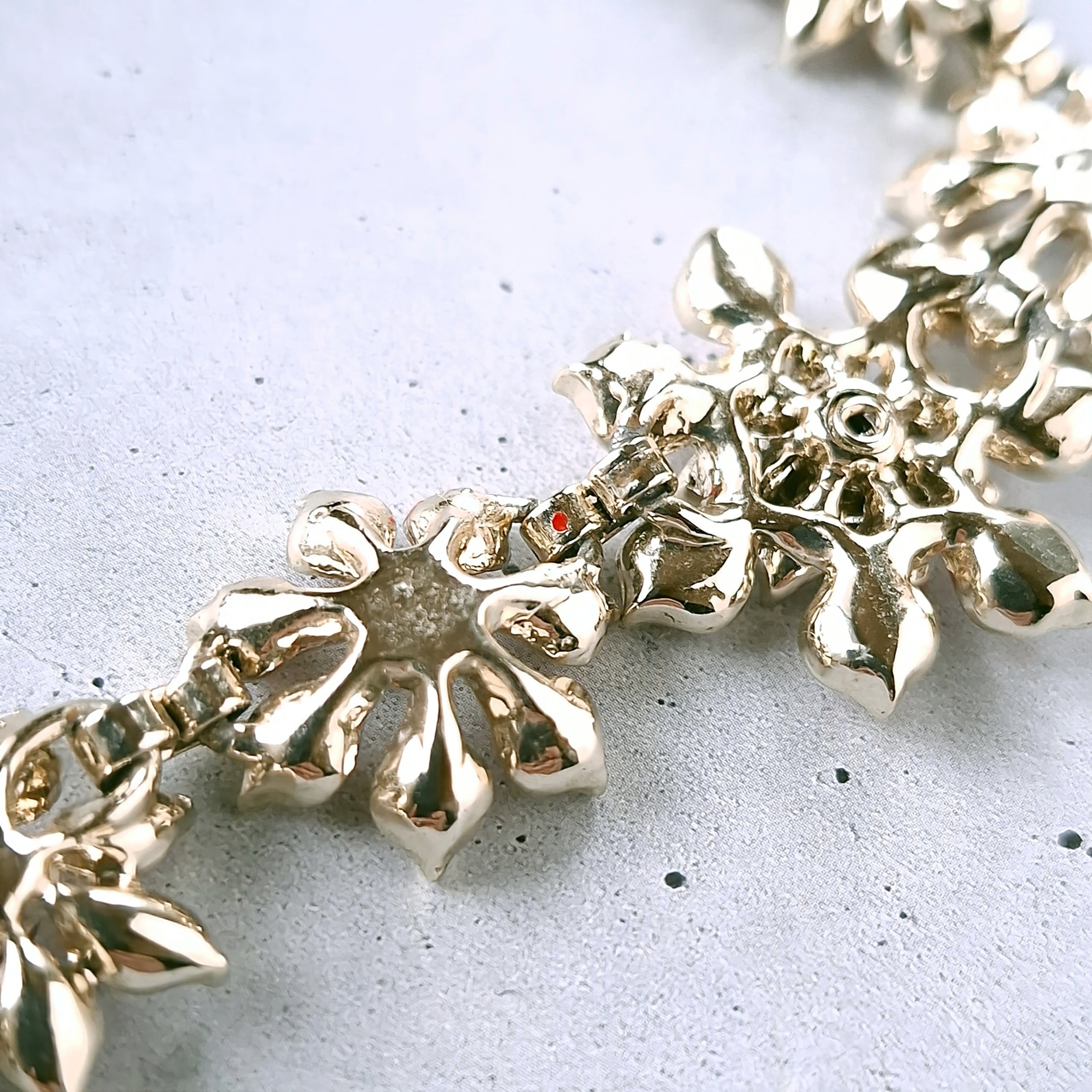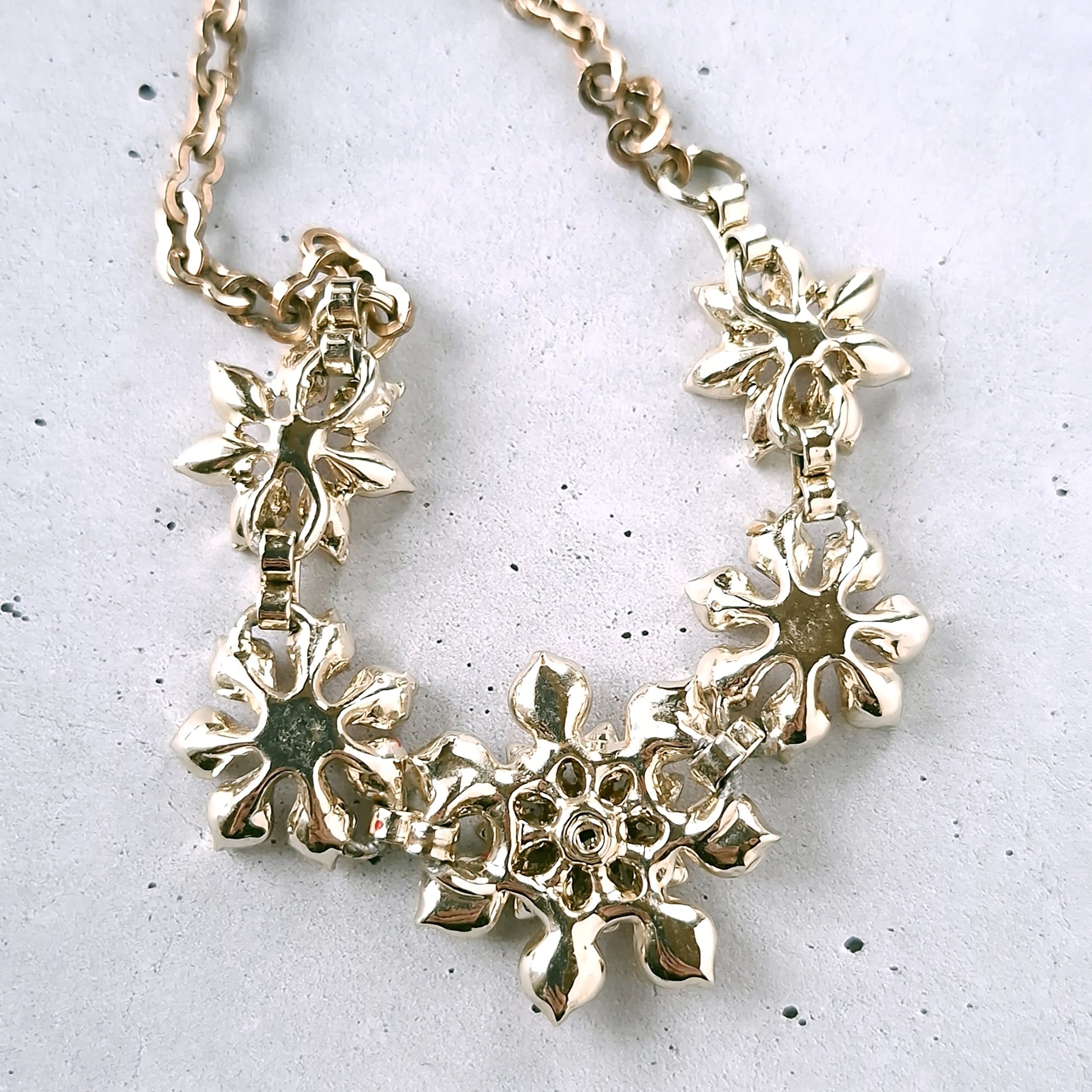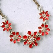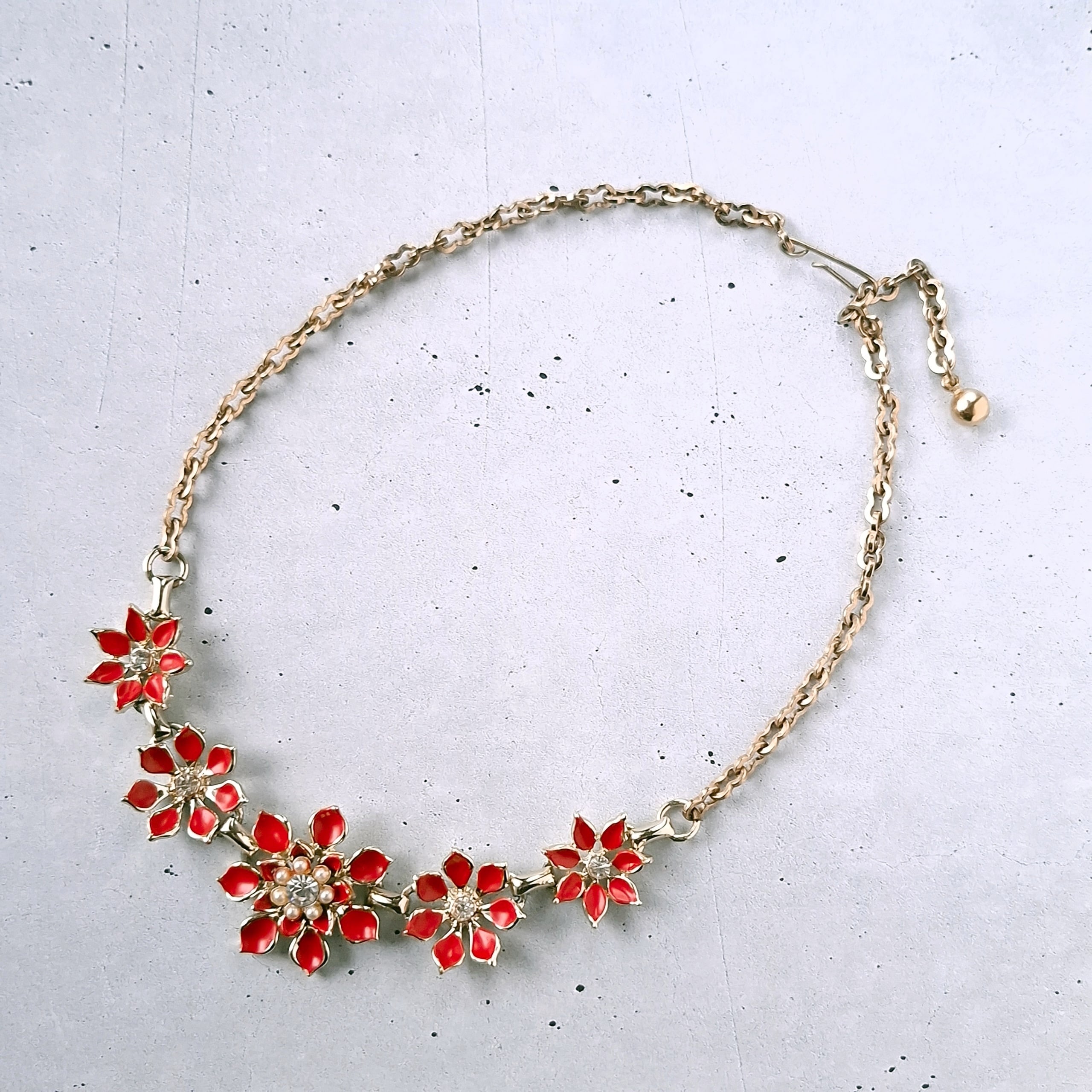 フェイクパールとクリアラインストーンがあしらわれたマットなレッドのエナメルで色付けされたフラワーのヴィンテージネックレスです。