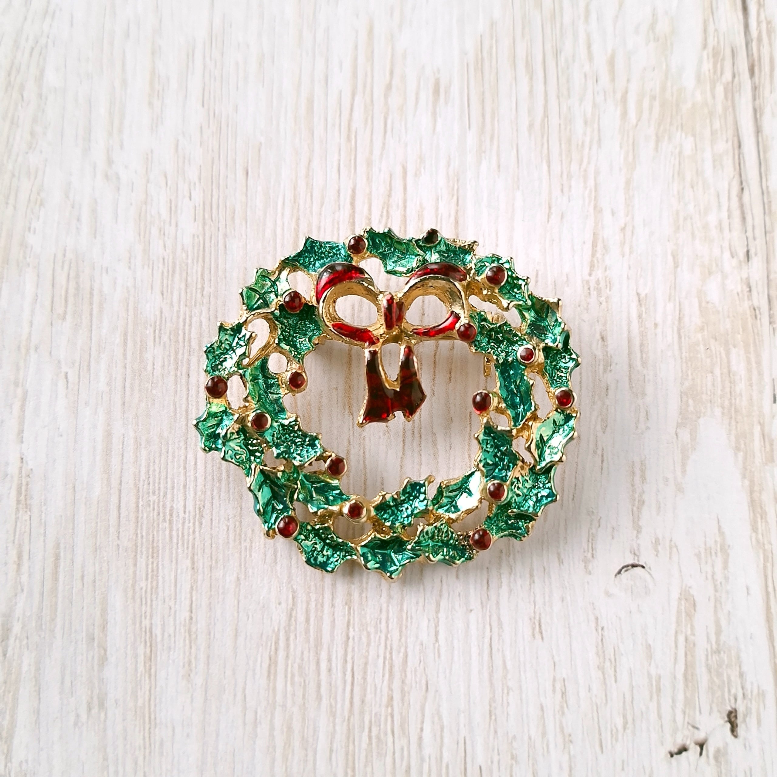リボンが付いた西洋柊のクリスマスリースがデザインされたヴィンテージブローチです。