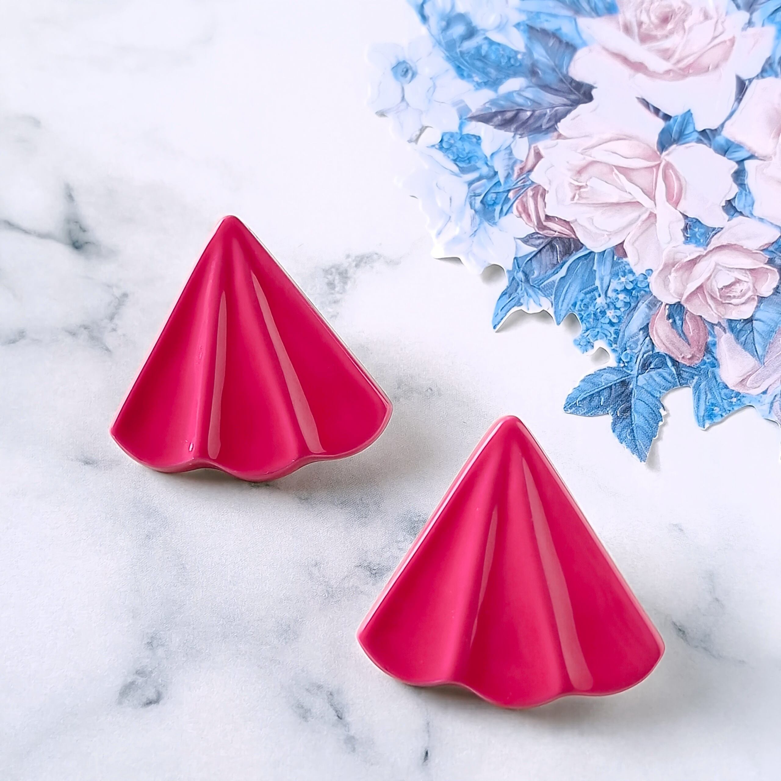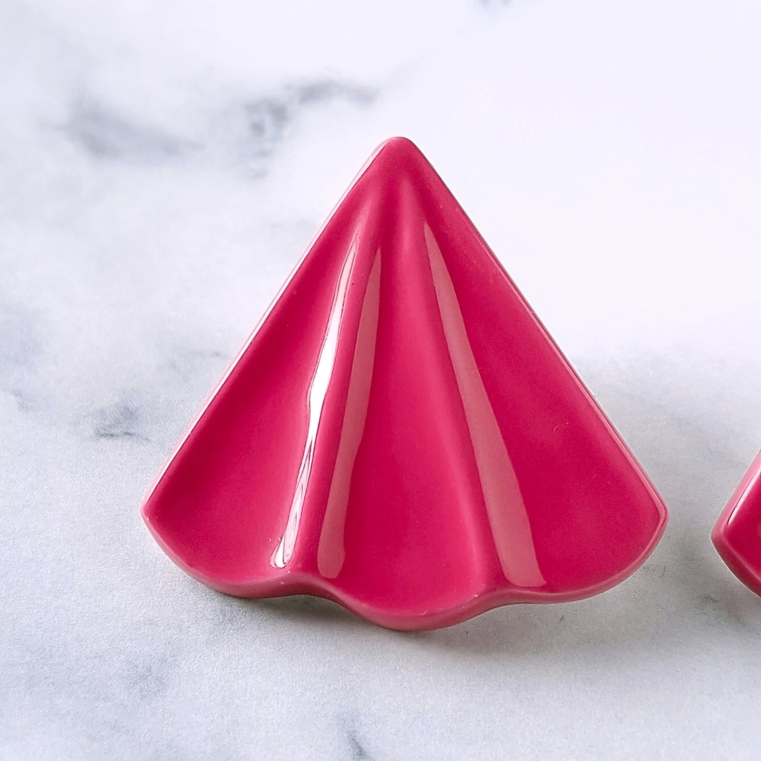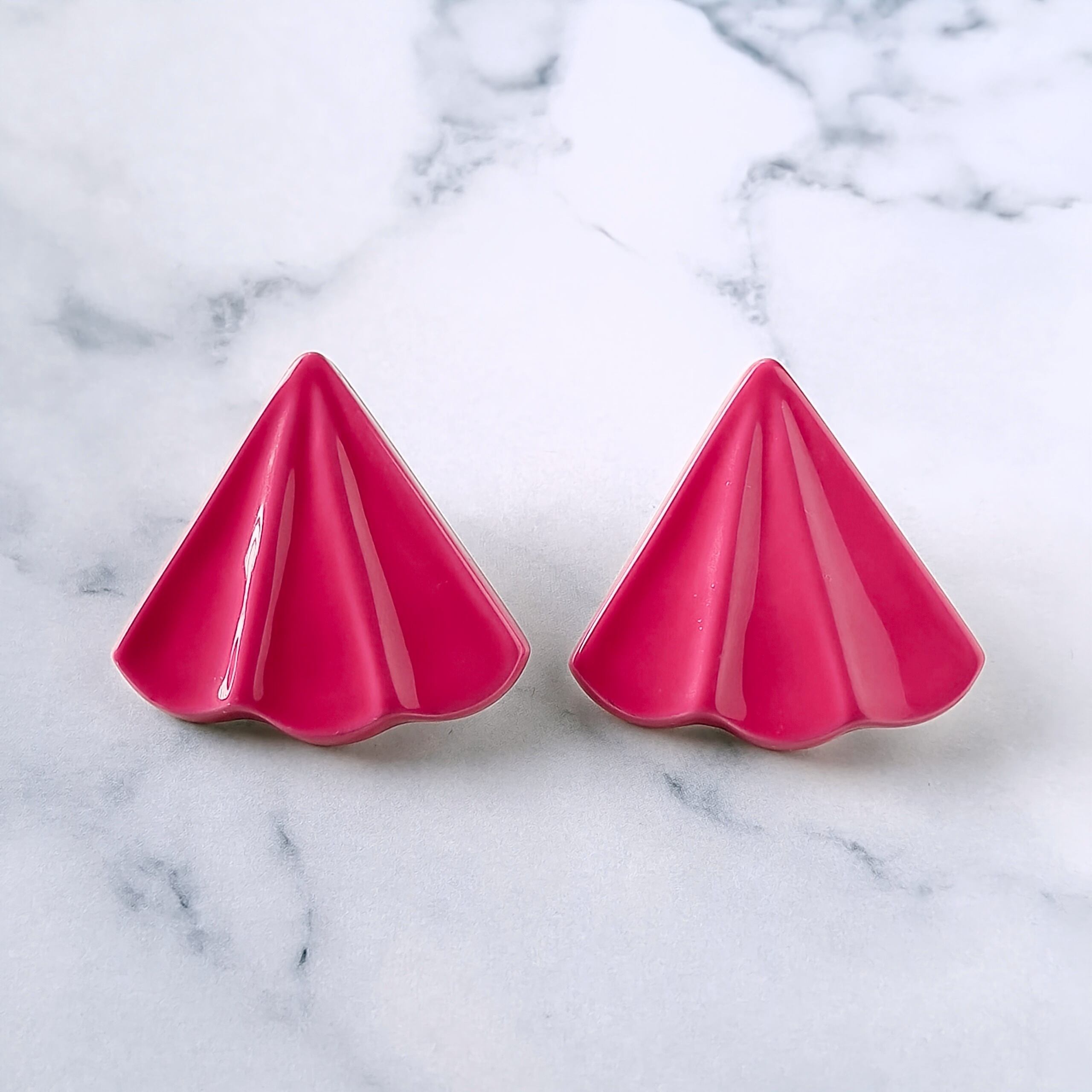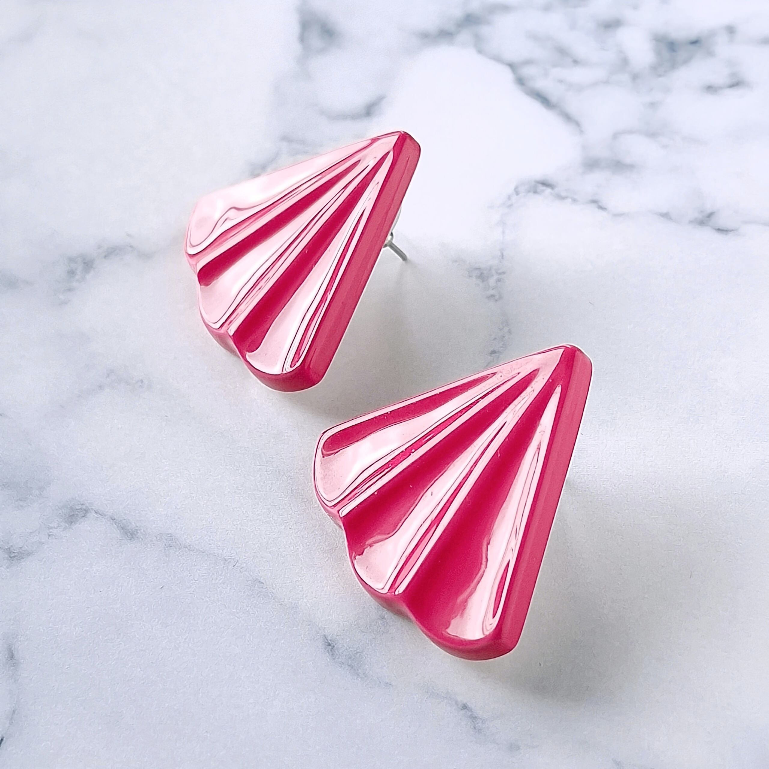 ビビットピンクに色付けされたプラスチックの大ぶりな扇形のヴィンテージピアスです。
