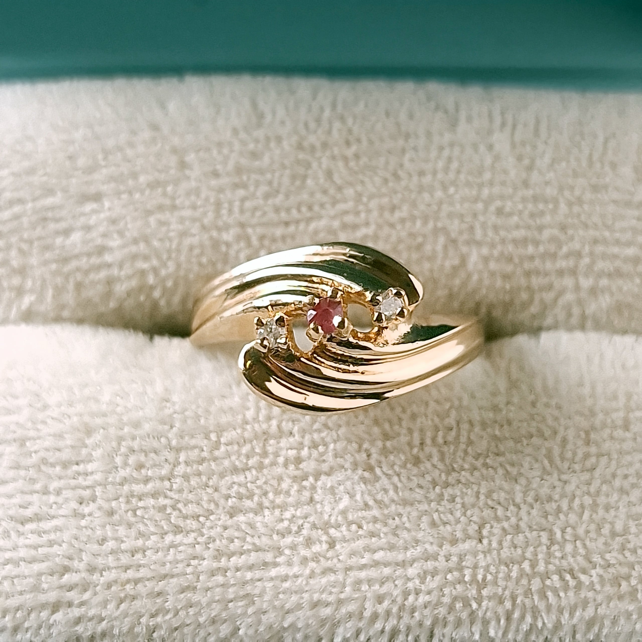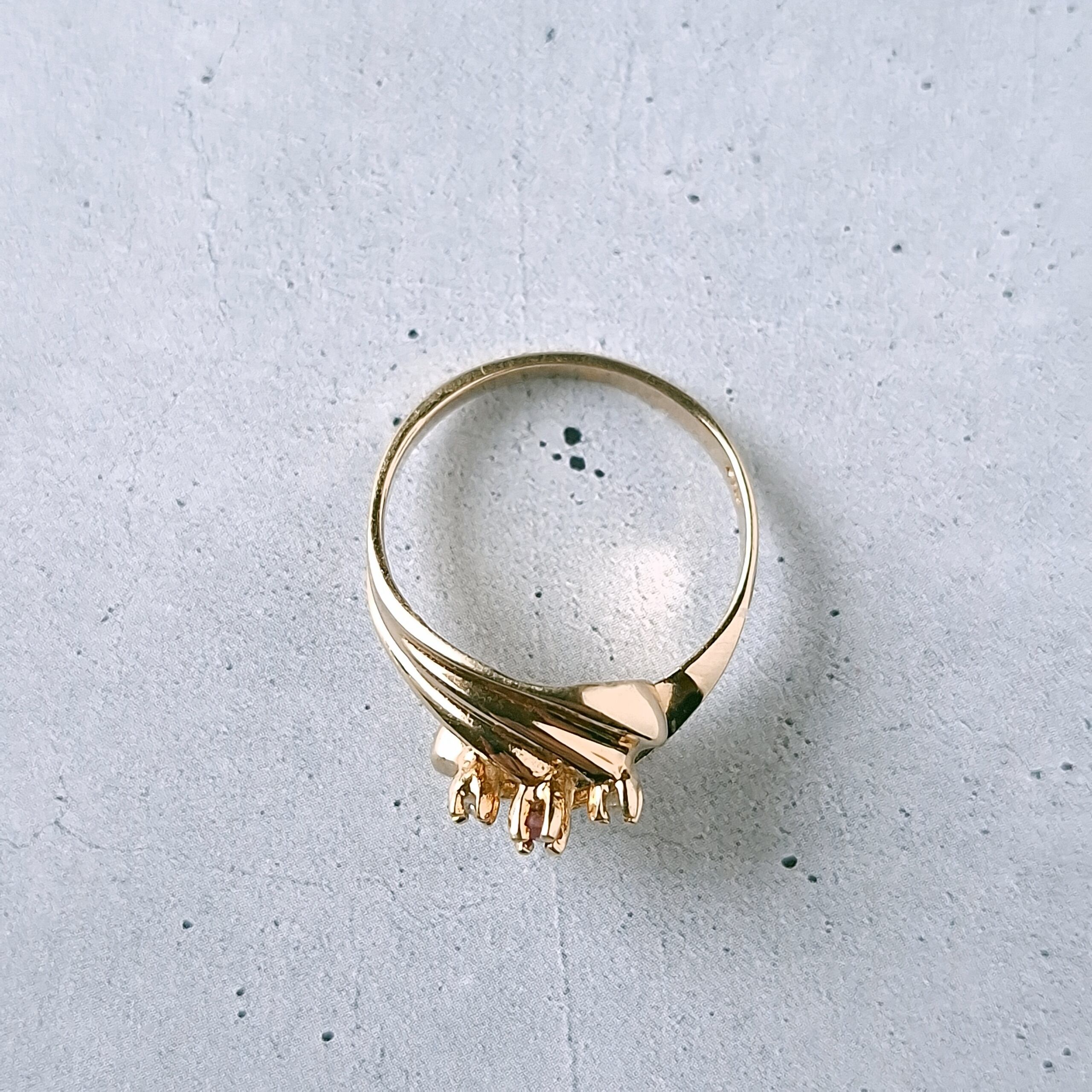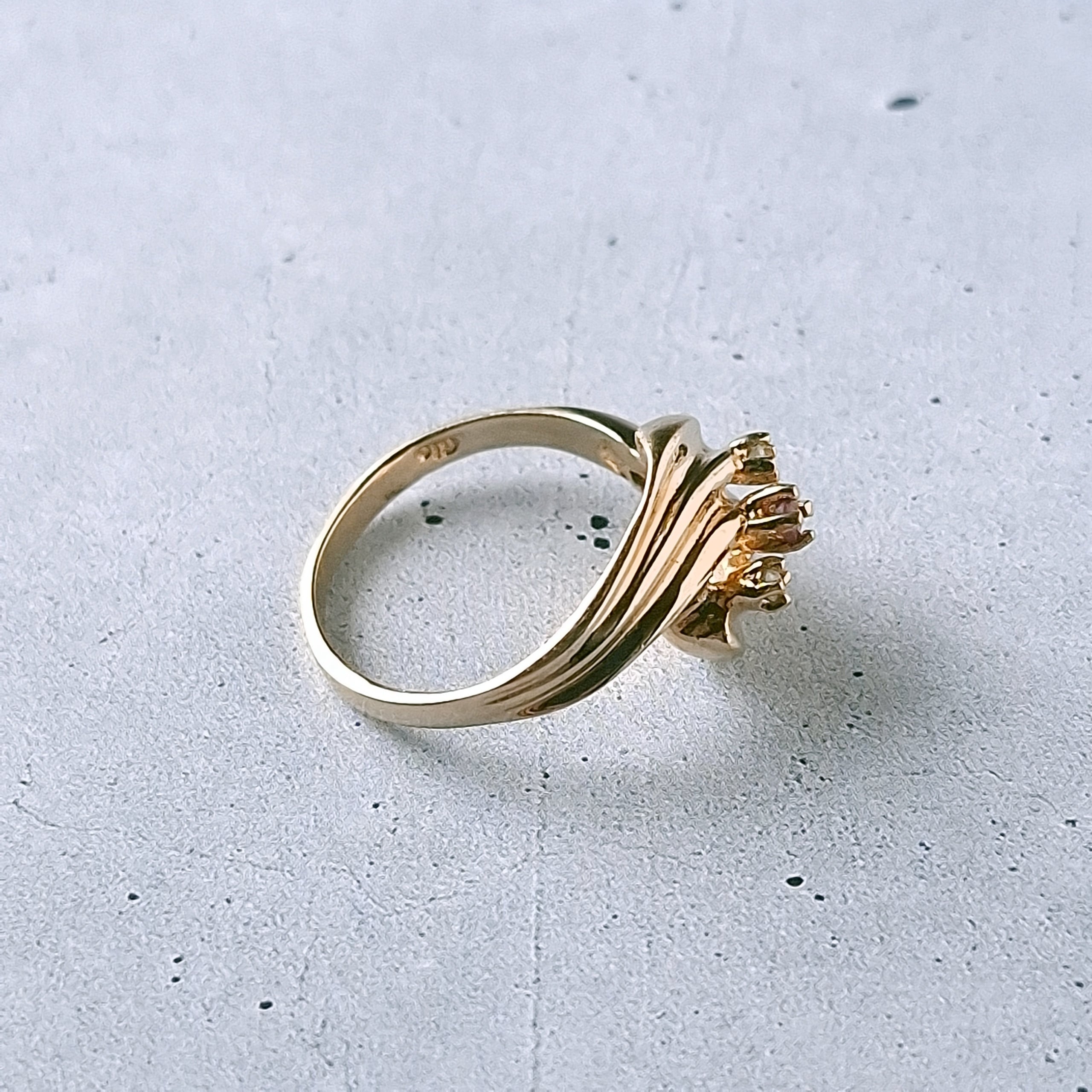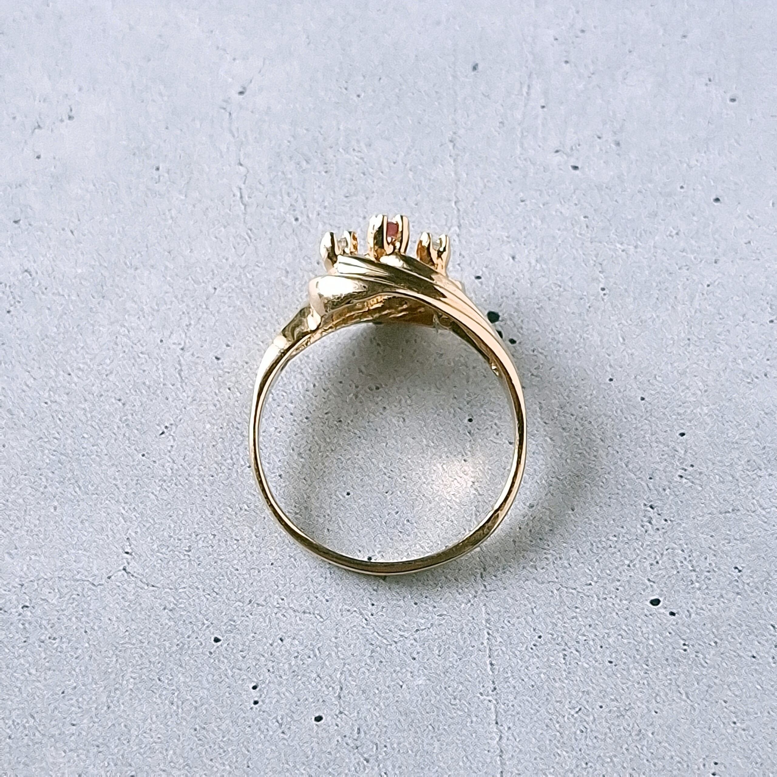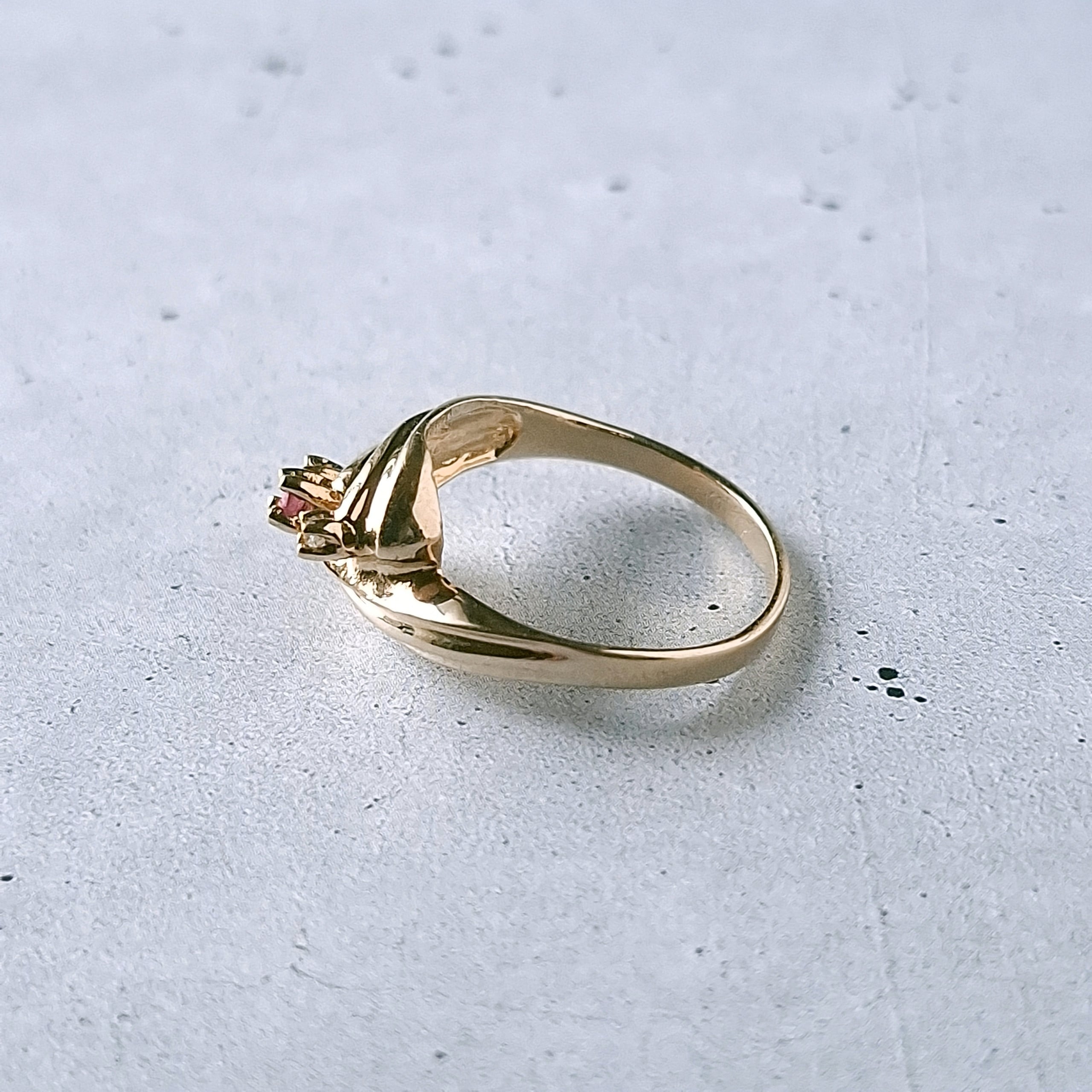 交差するようにデザインされたドレープ状のゴールドメタルに赤み掛かったピンクとクリアラインストーンがあしらわれたヴィンテージリングです。