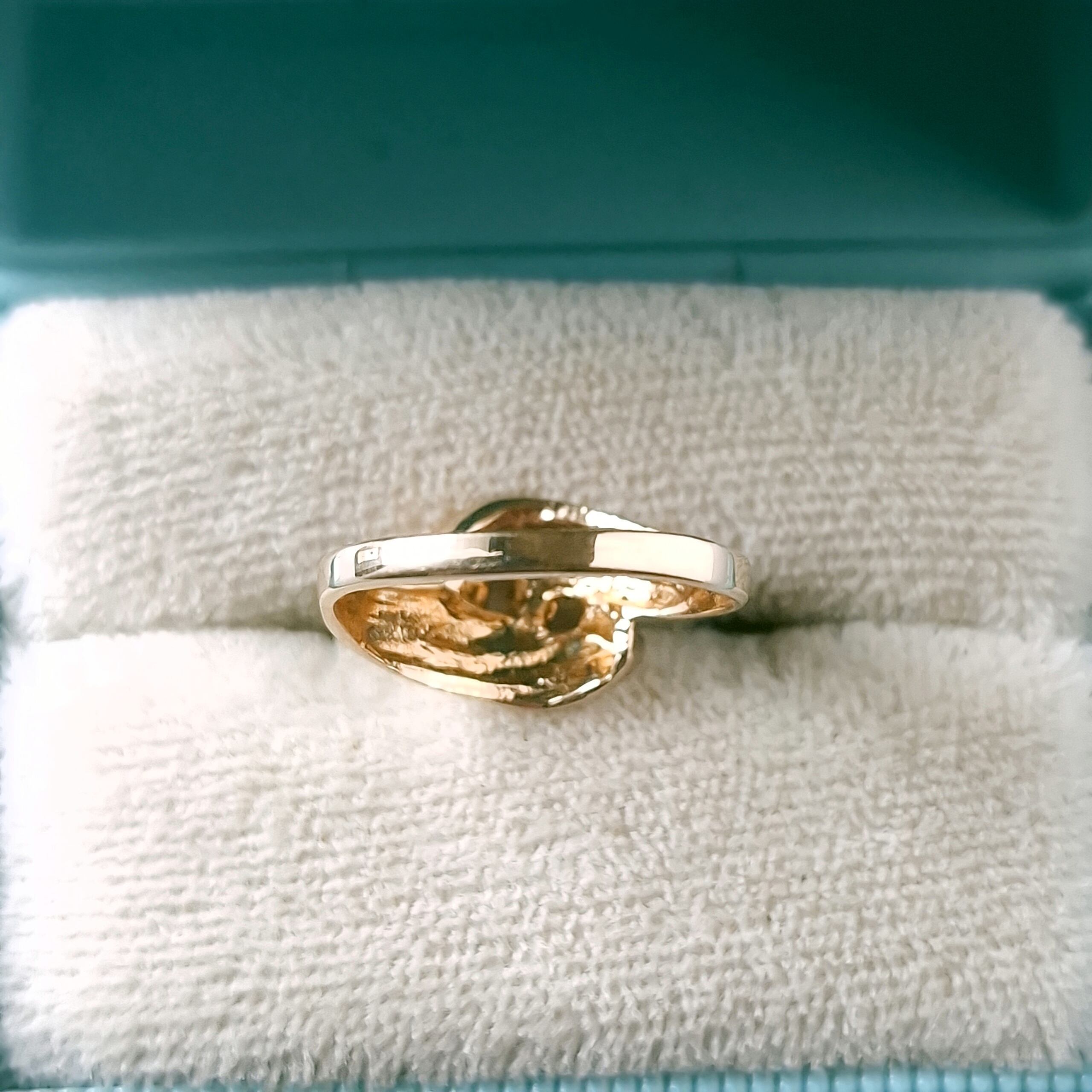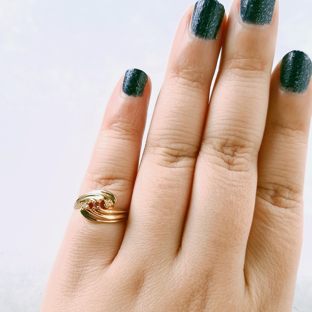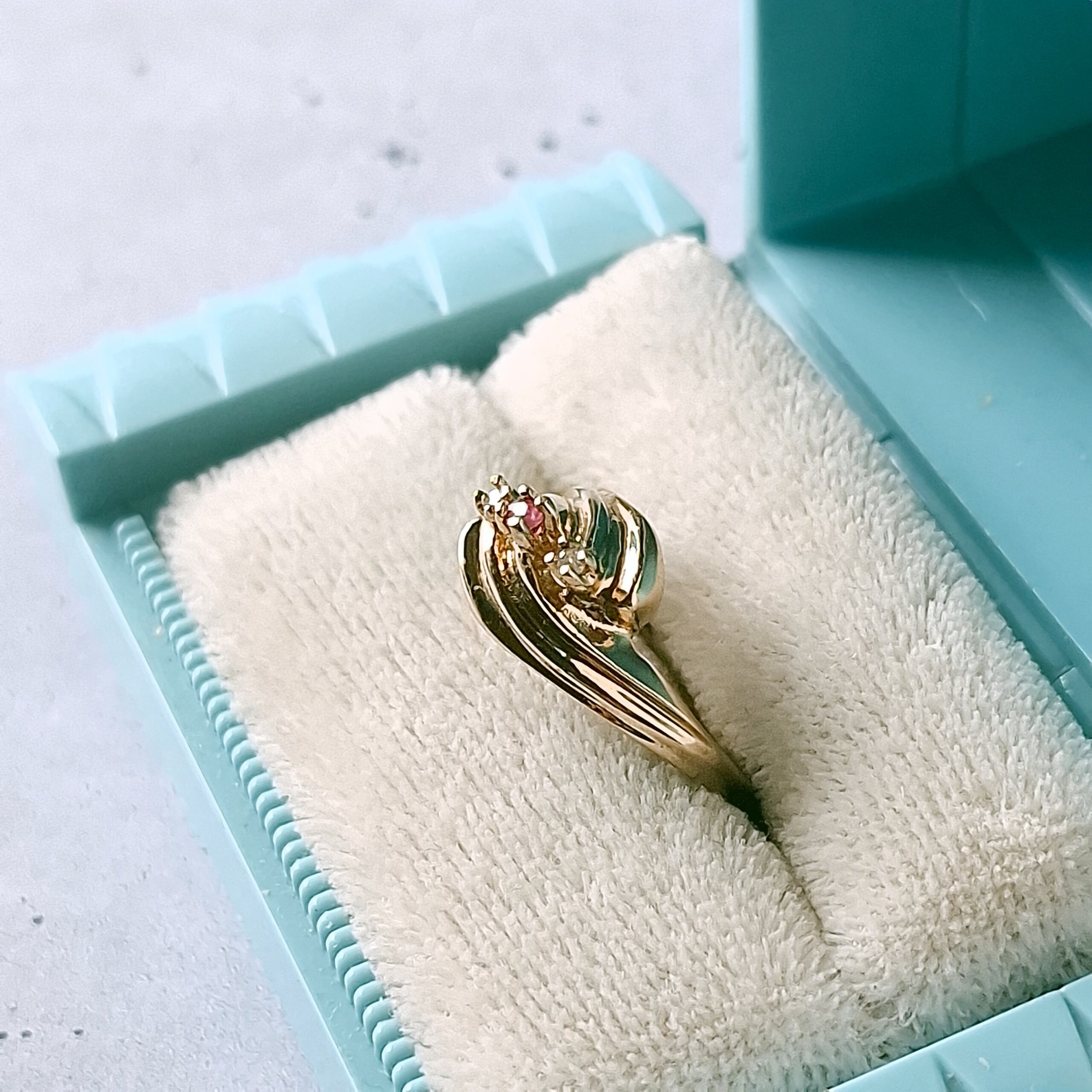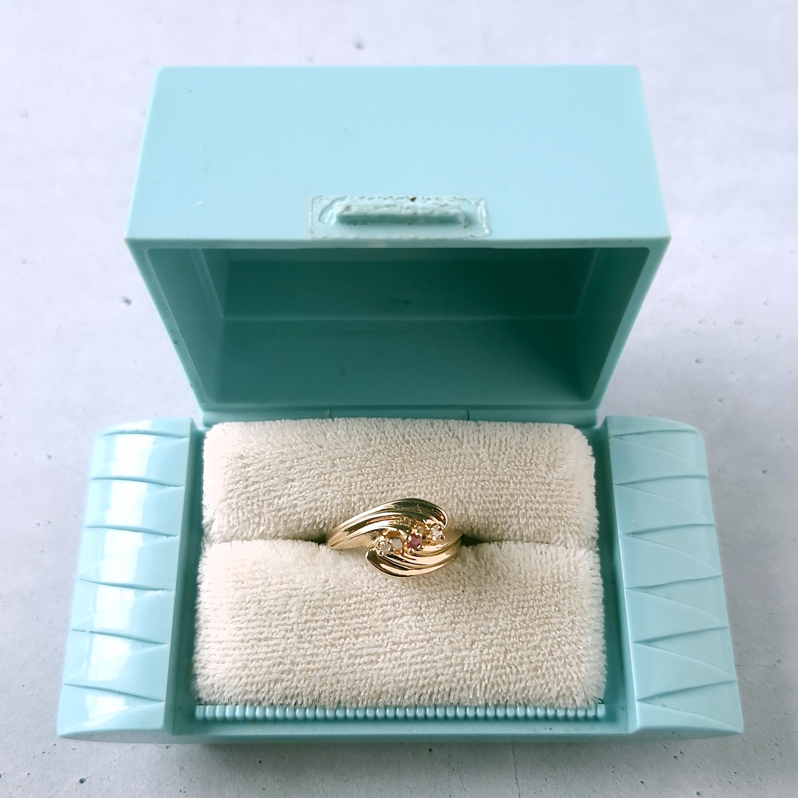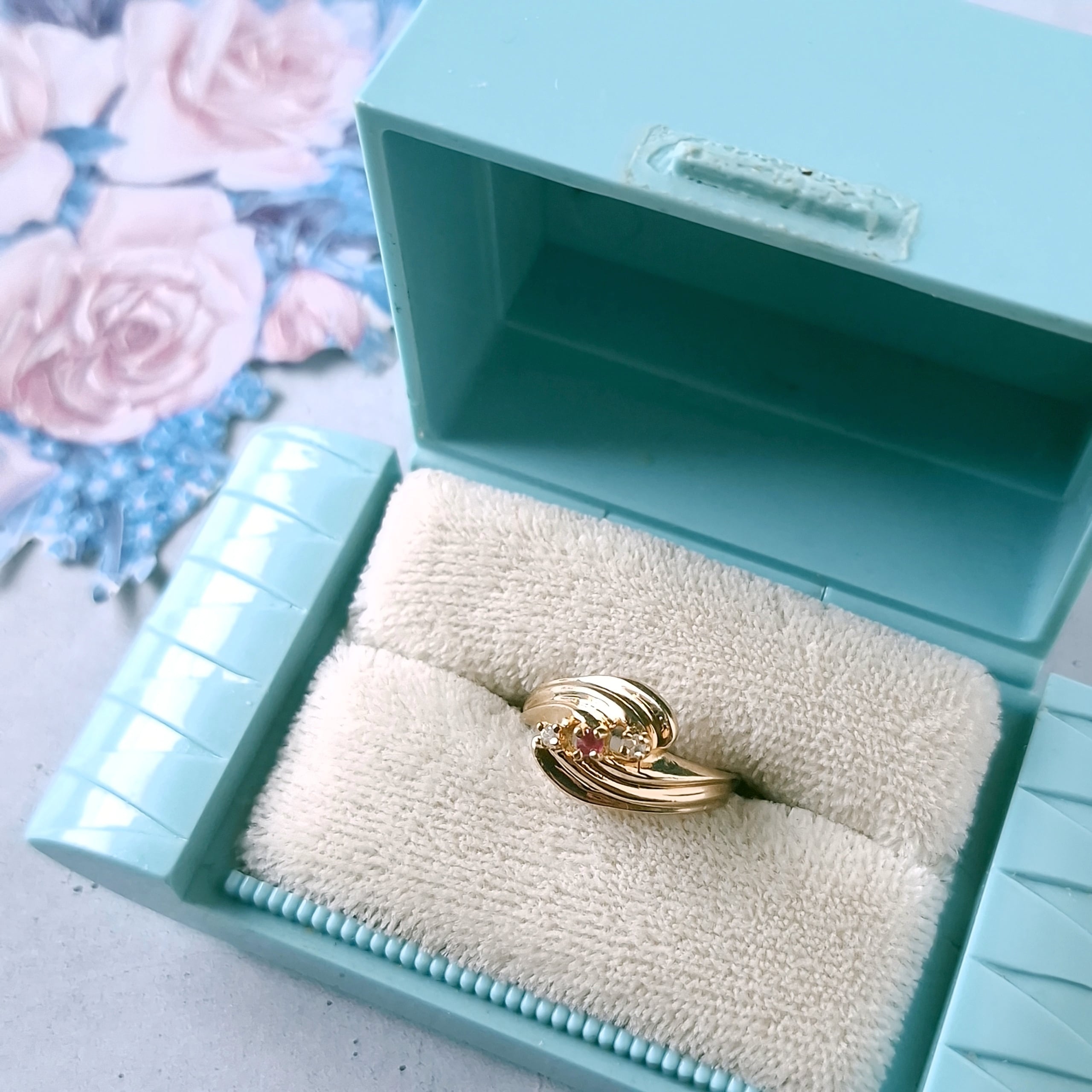 交差するようにデザインされたドレープ状のゴールドメタルに赤み掛かったピンクとクリアラインストーンがあしらわれたヴィンテージリングです。