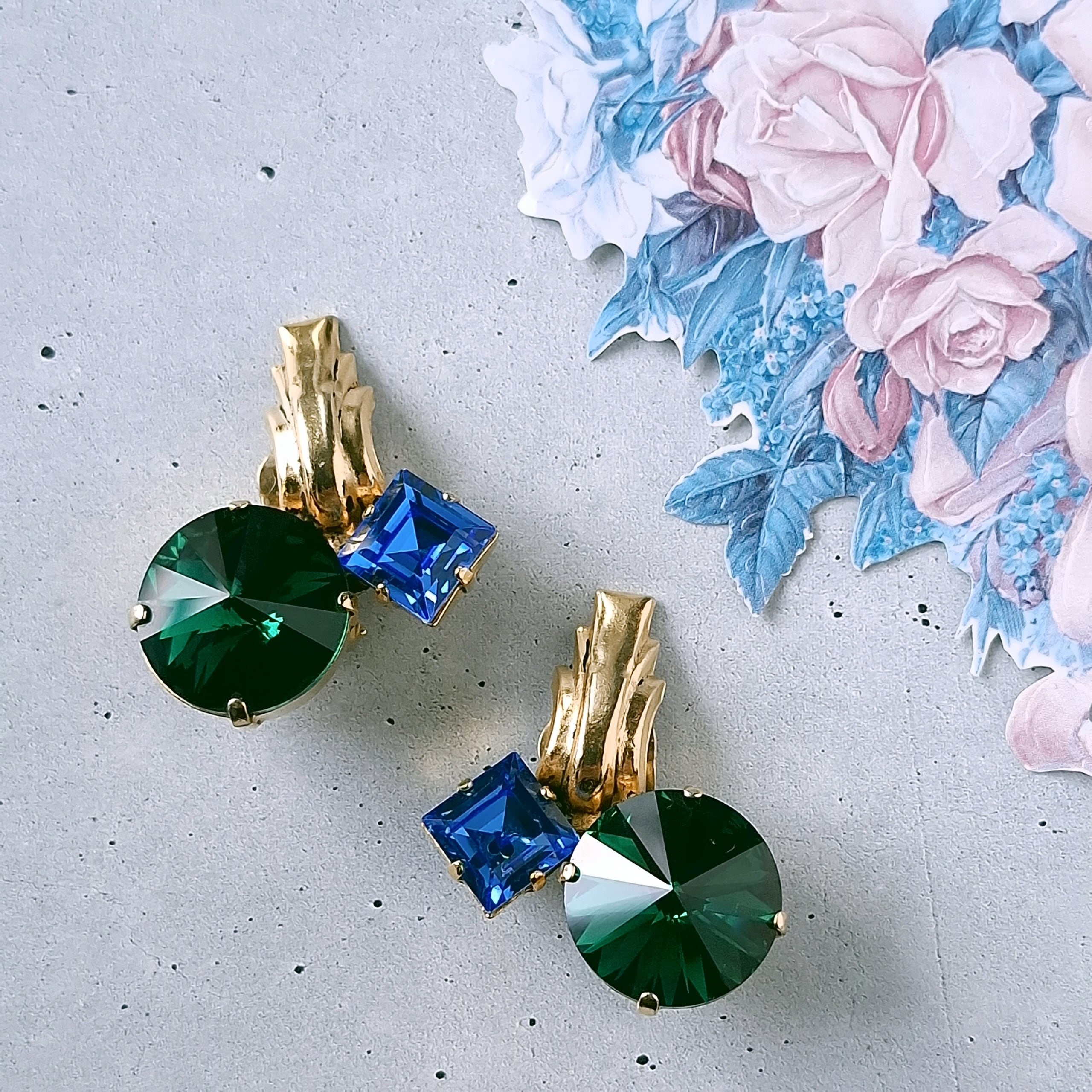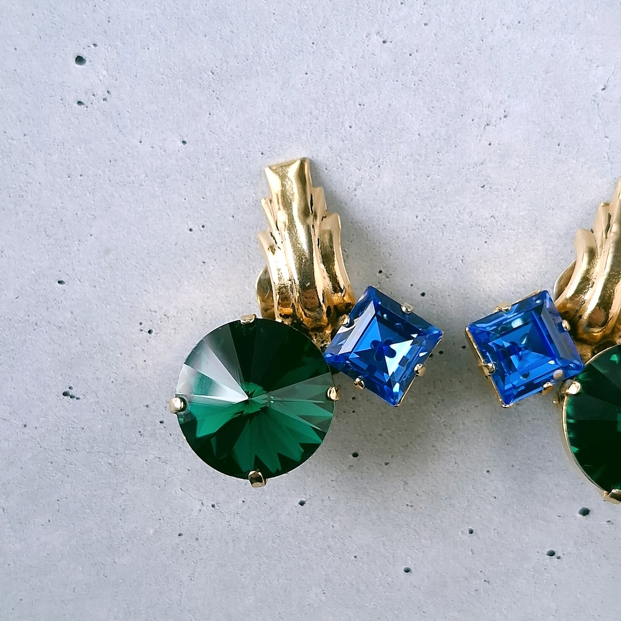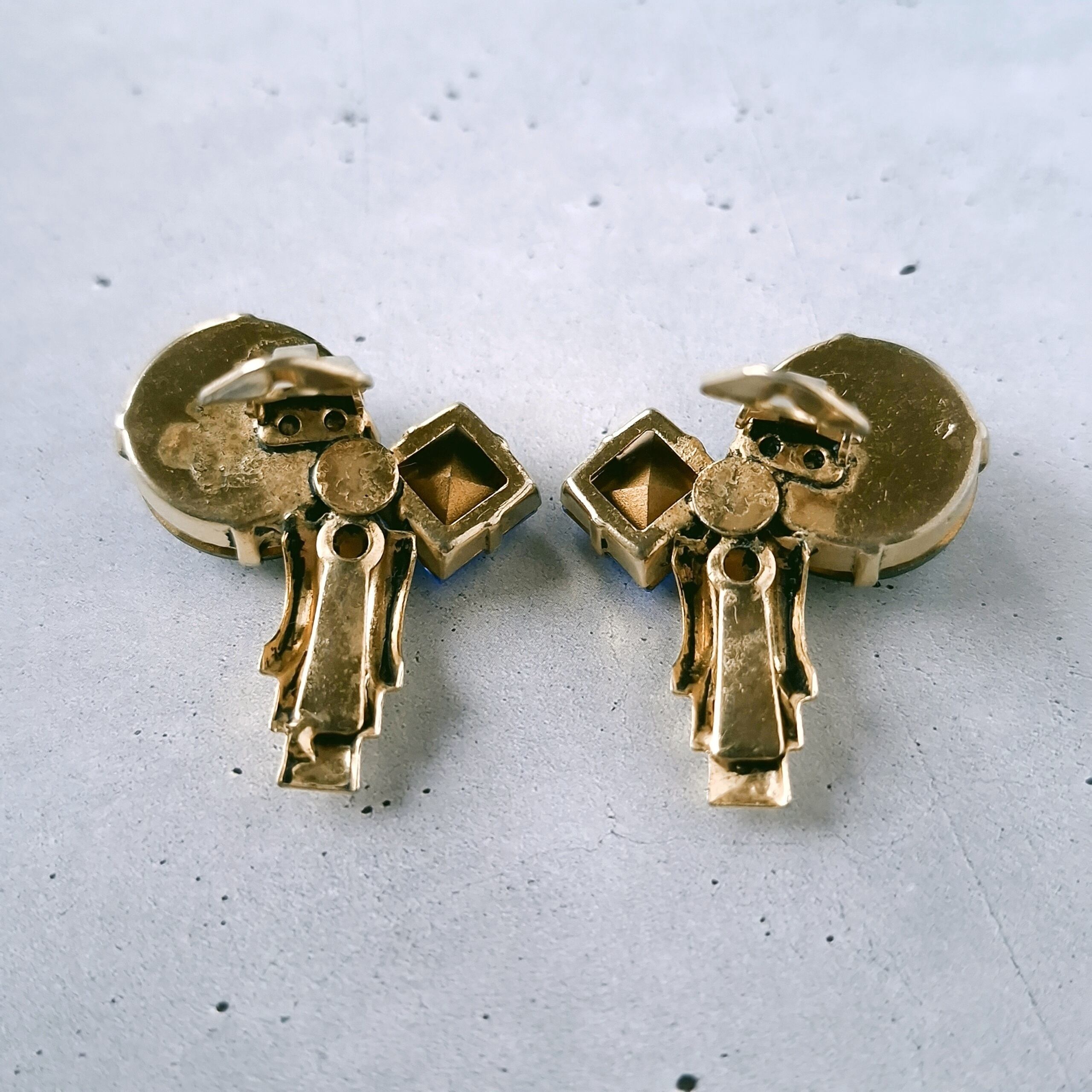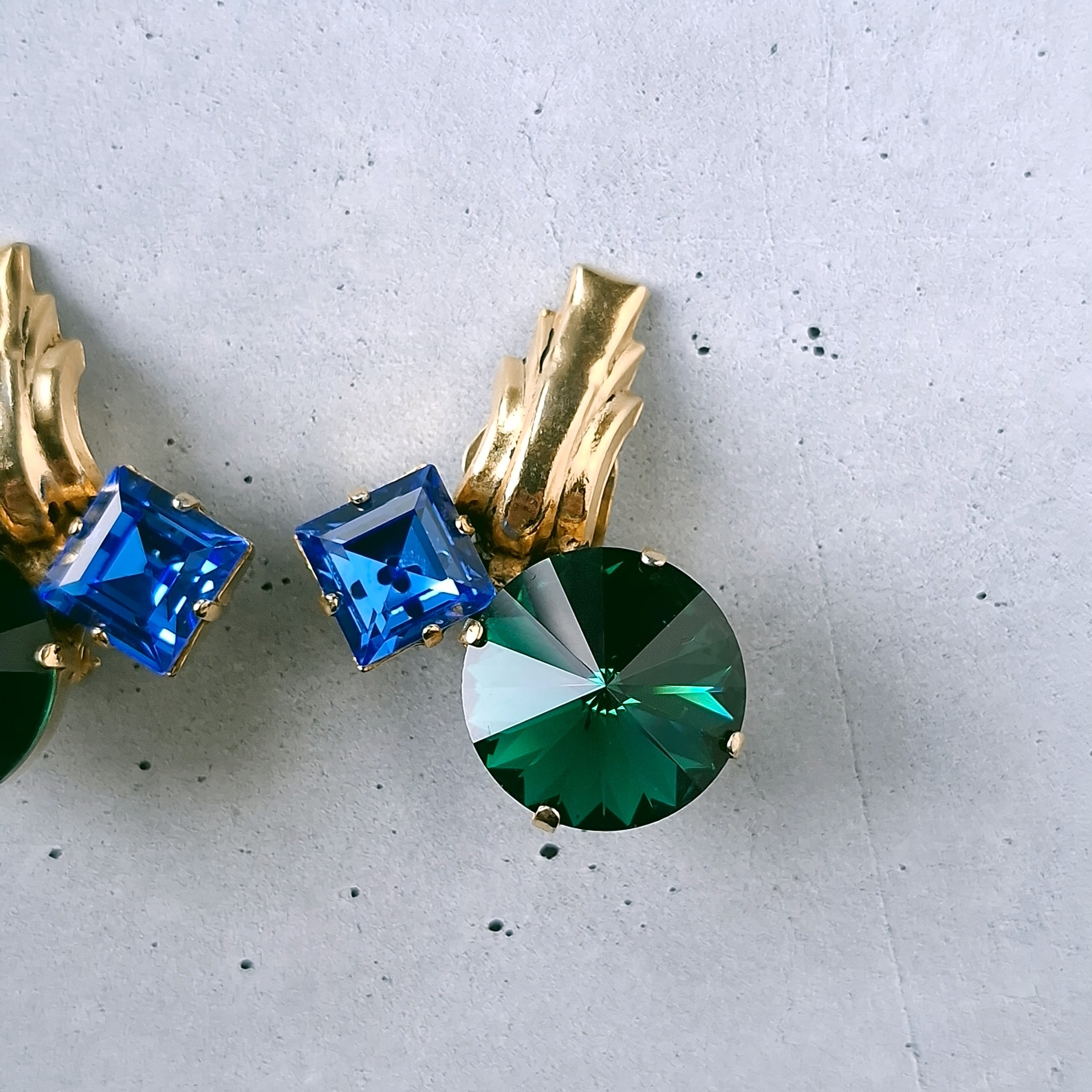 green rivoli blue square rhinestone vintage earrings ヴィンテージイヤリング