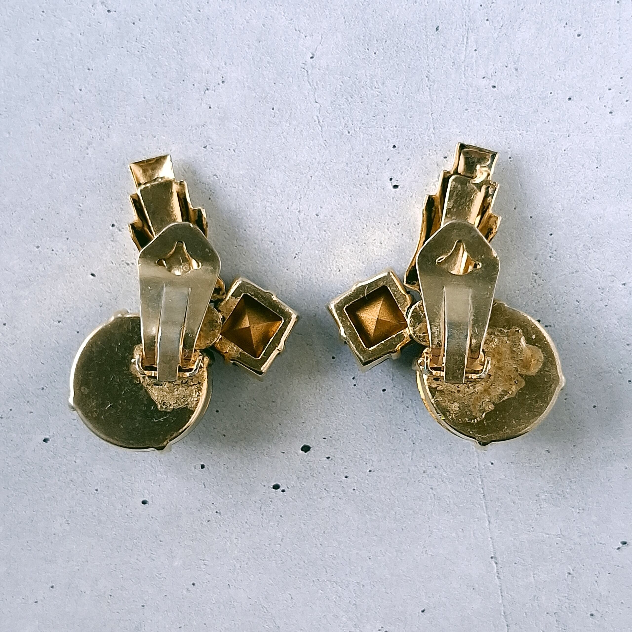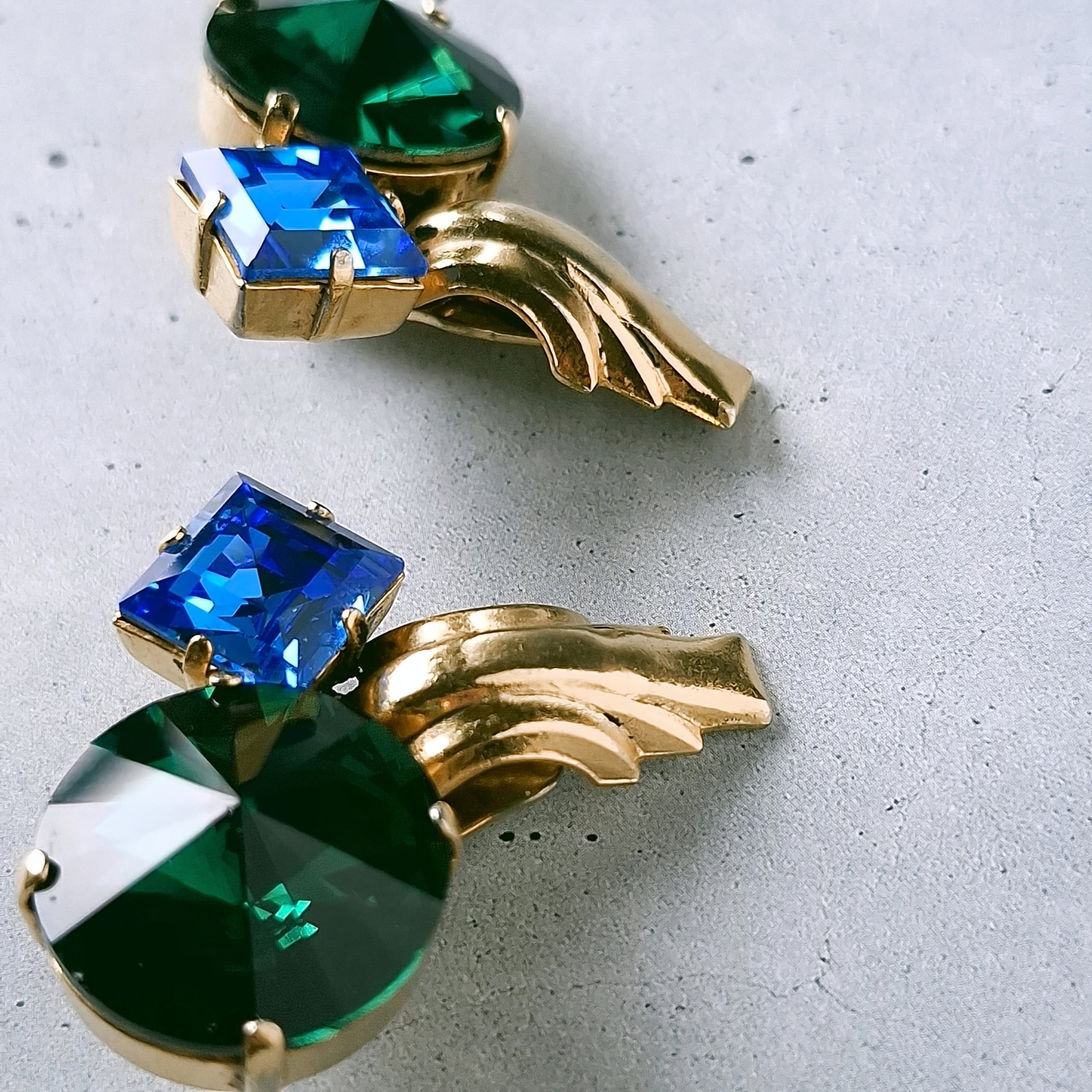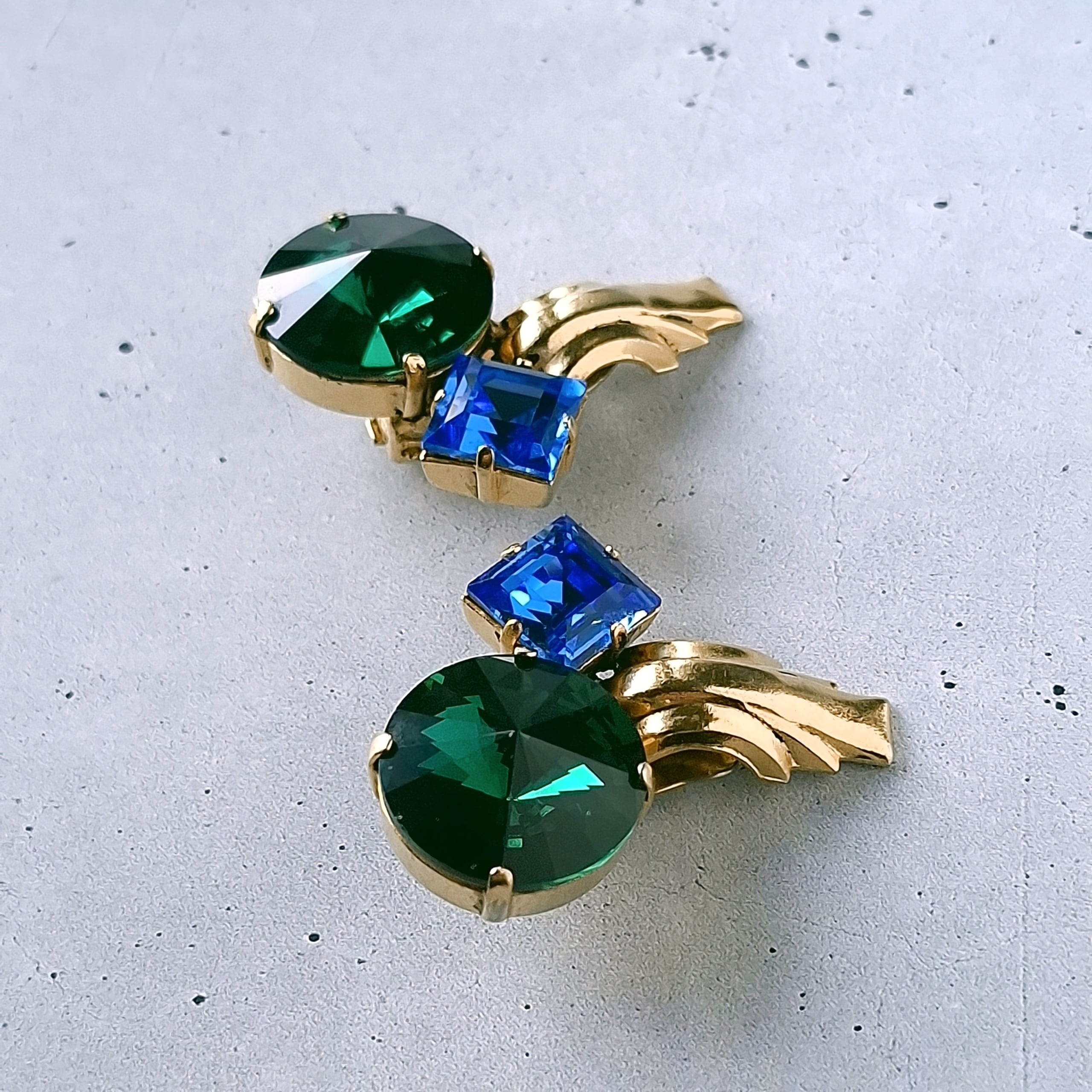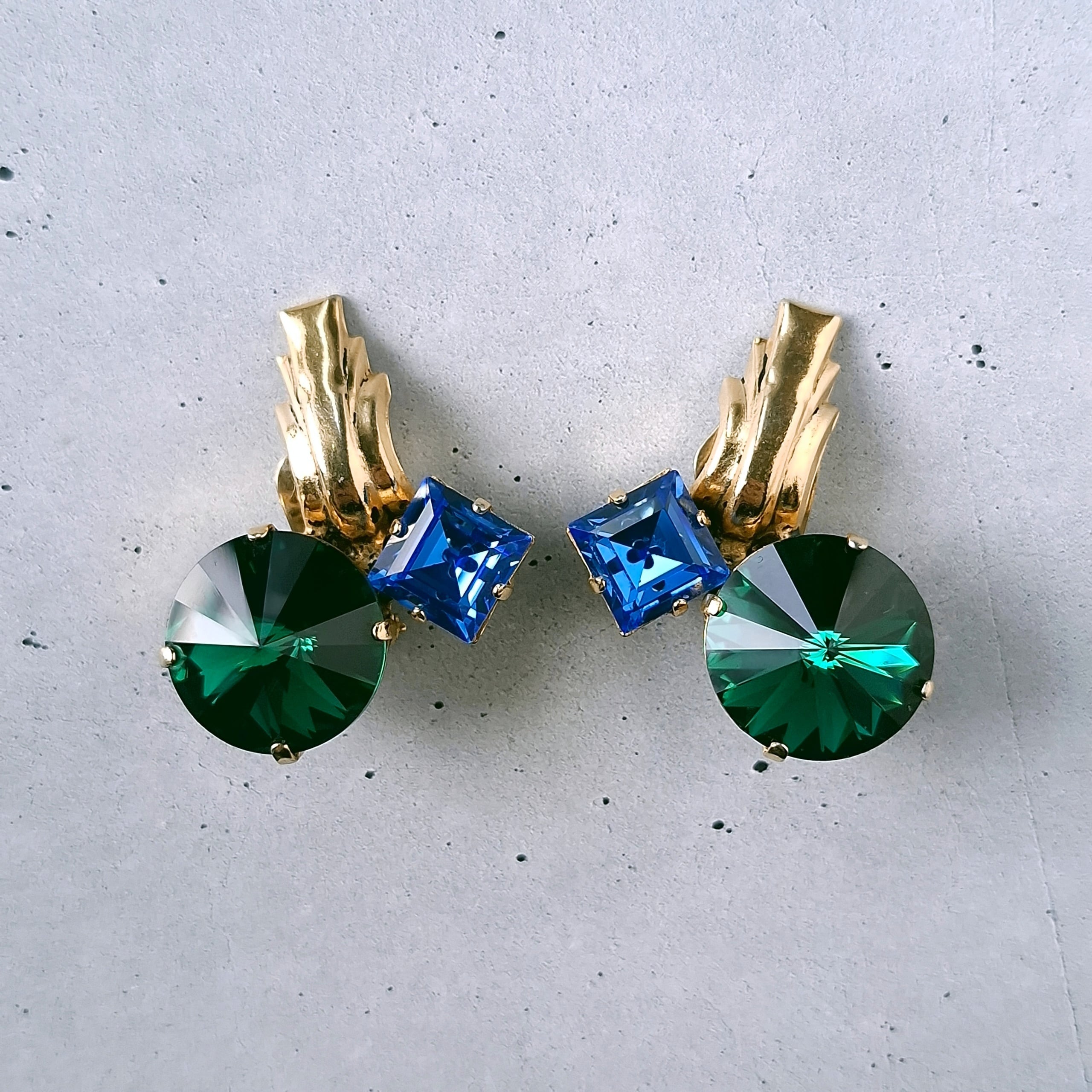 モダンな形のメタル、大粒のグリーンのリヴォリとブルーのスクエアラインストーンがアーティスティックにデザインされたヴィンテージイヤリングです。