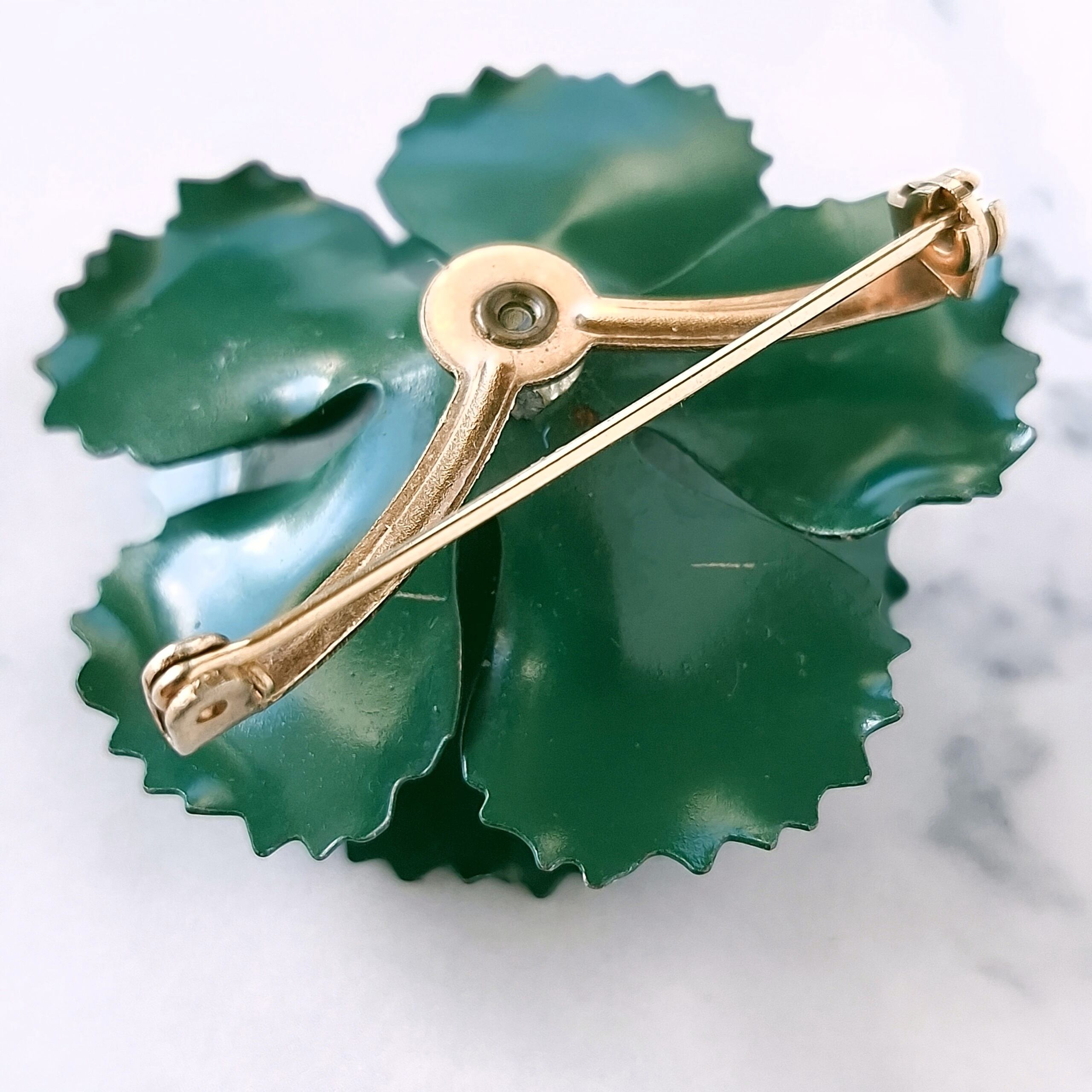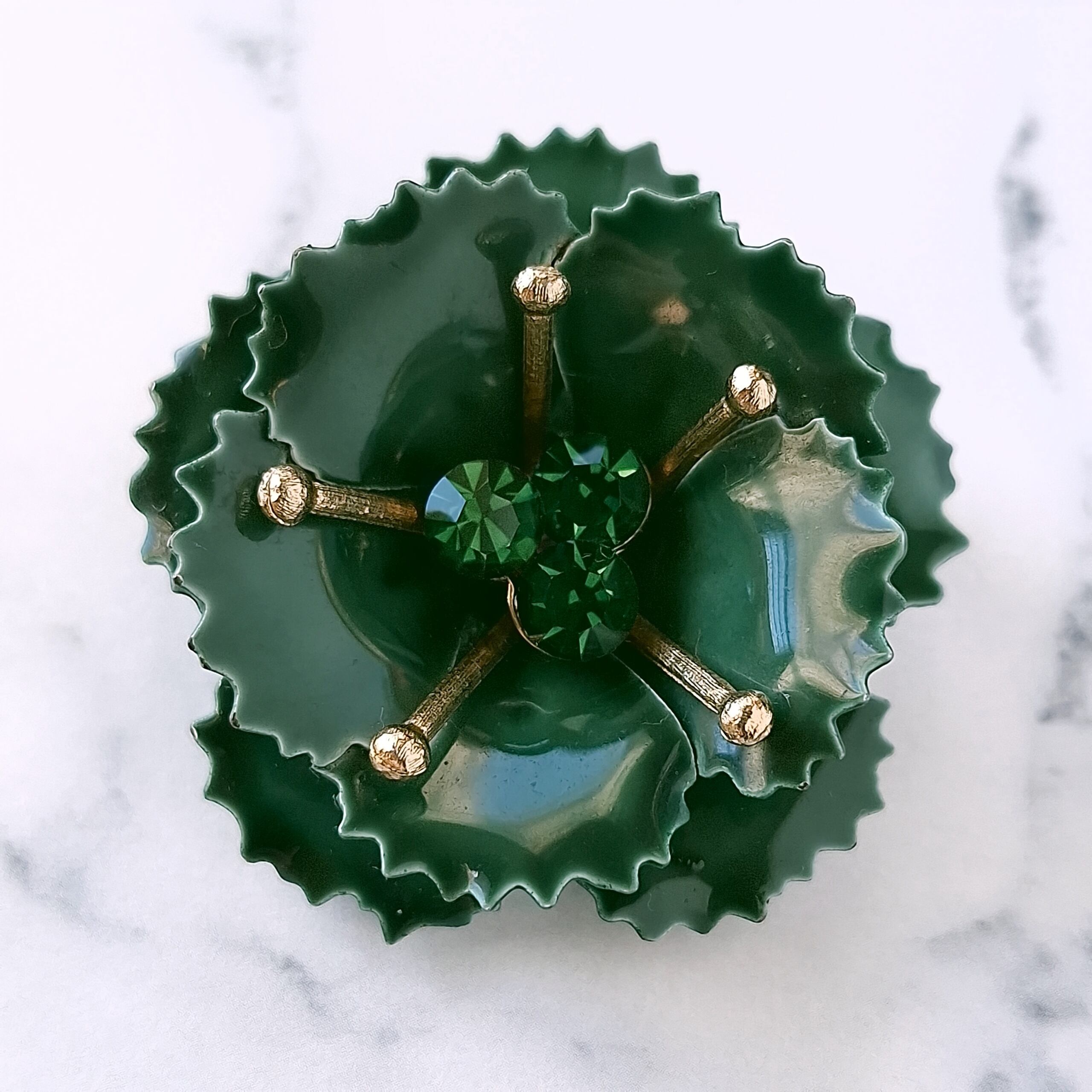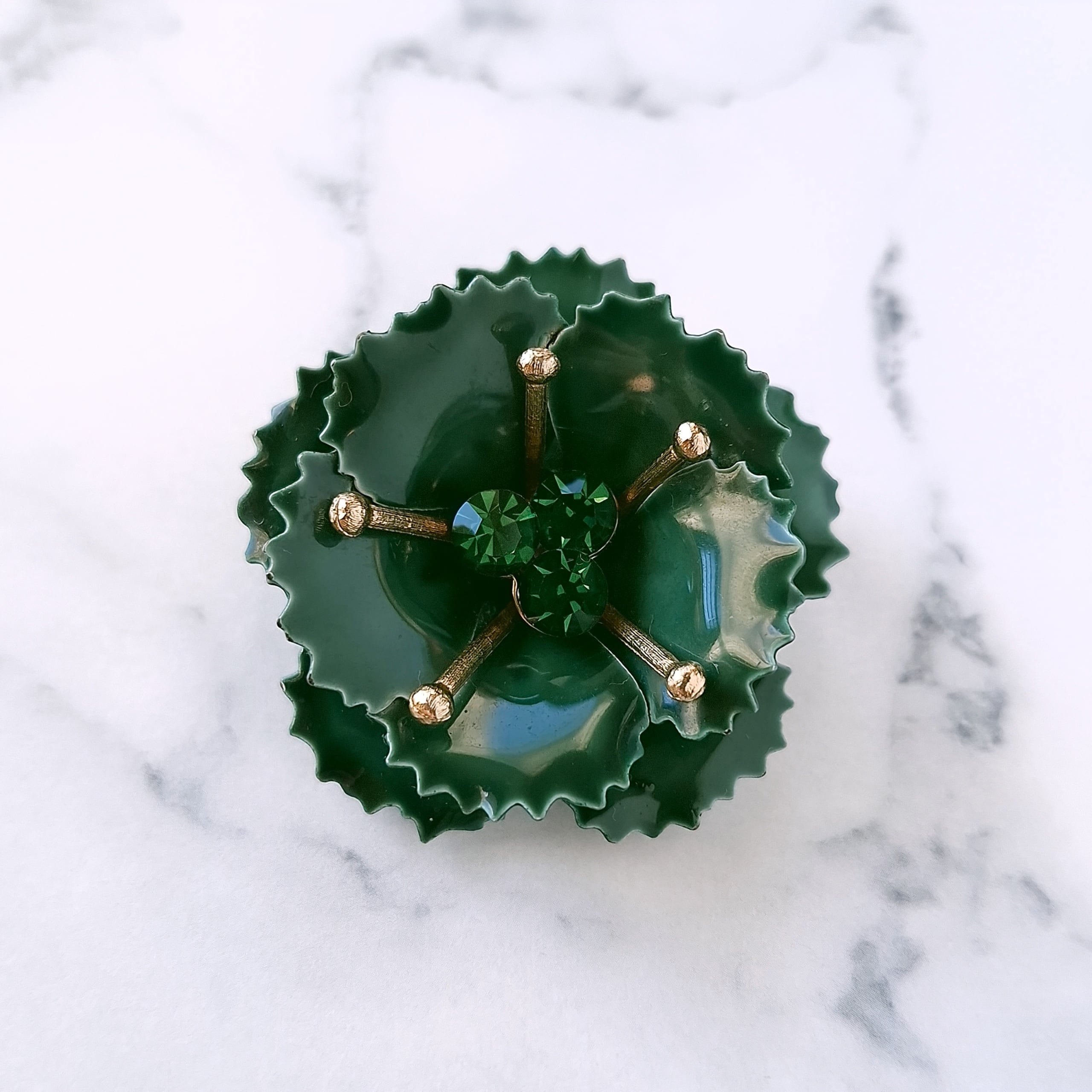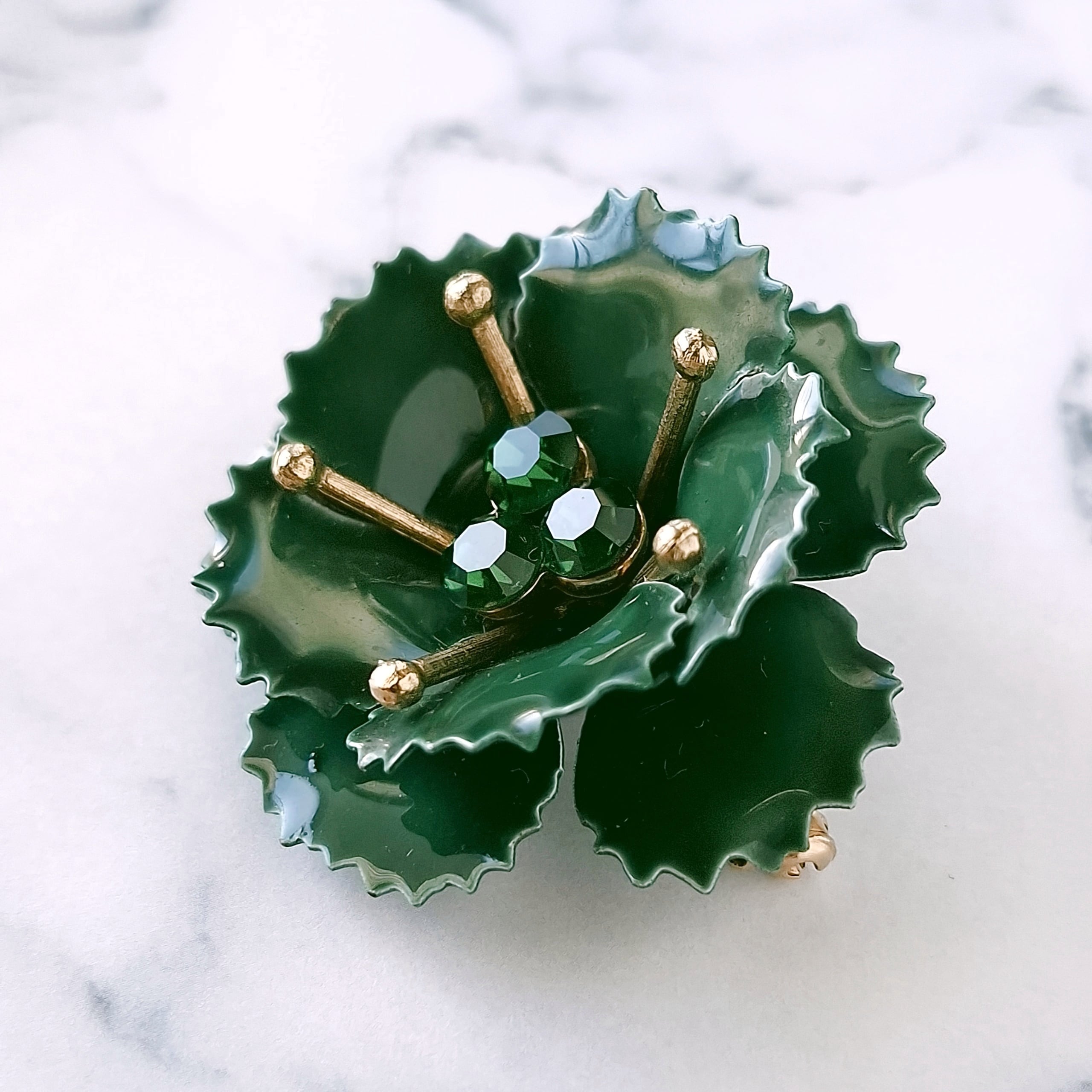 グリーンのラインストーンがあしらわれたディープグリーンのエナメルで色付けされたフラワーのヴィンテージブローチです。