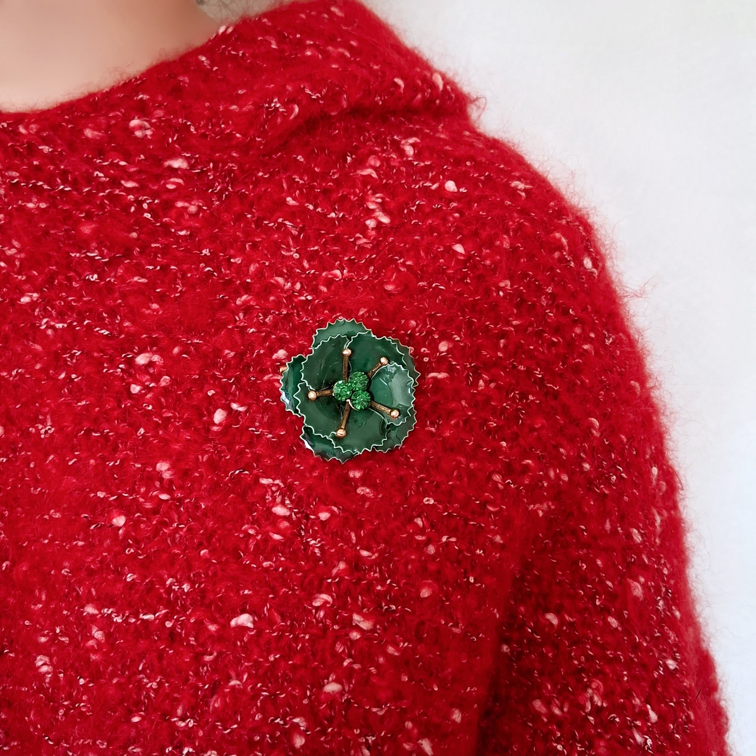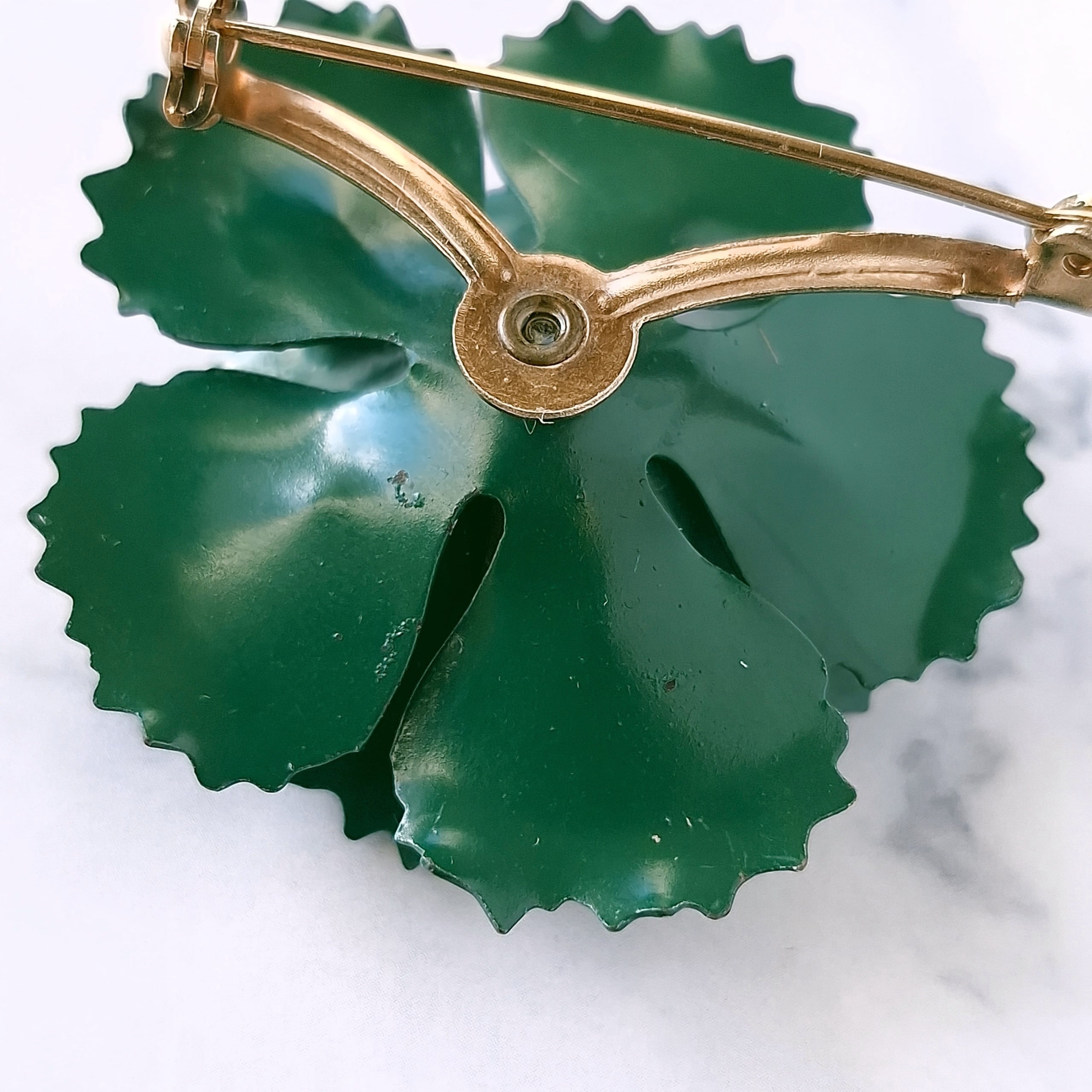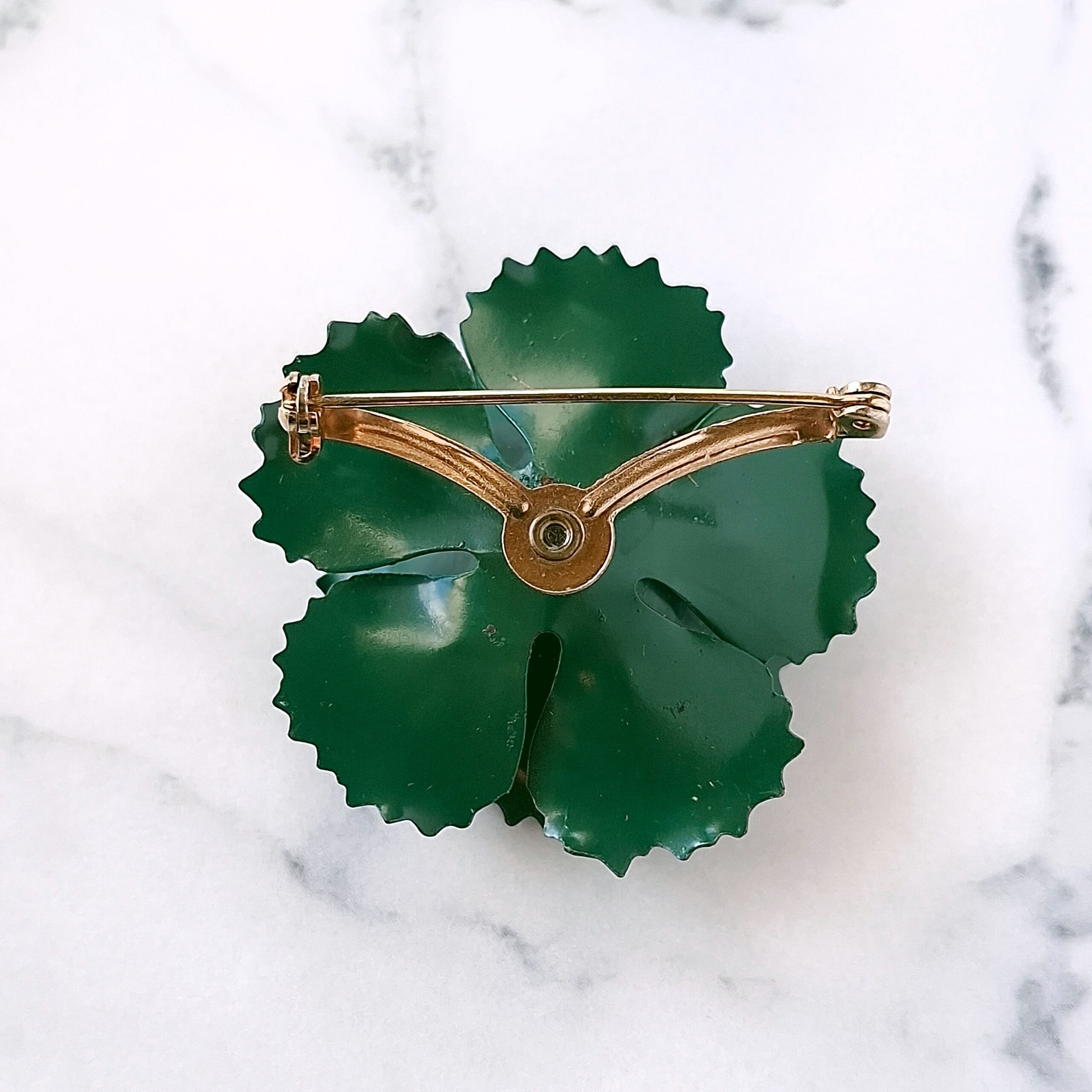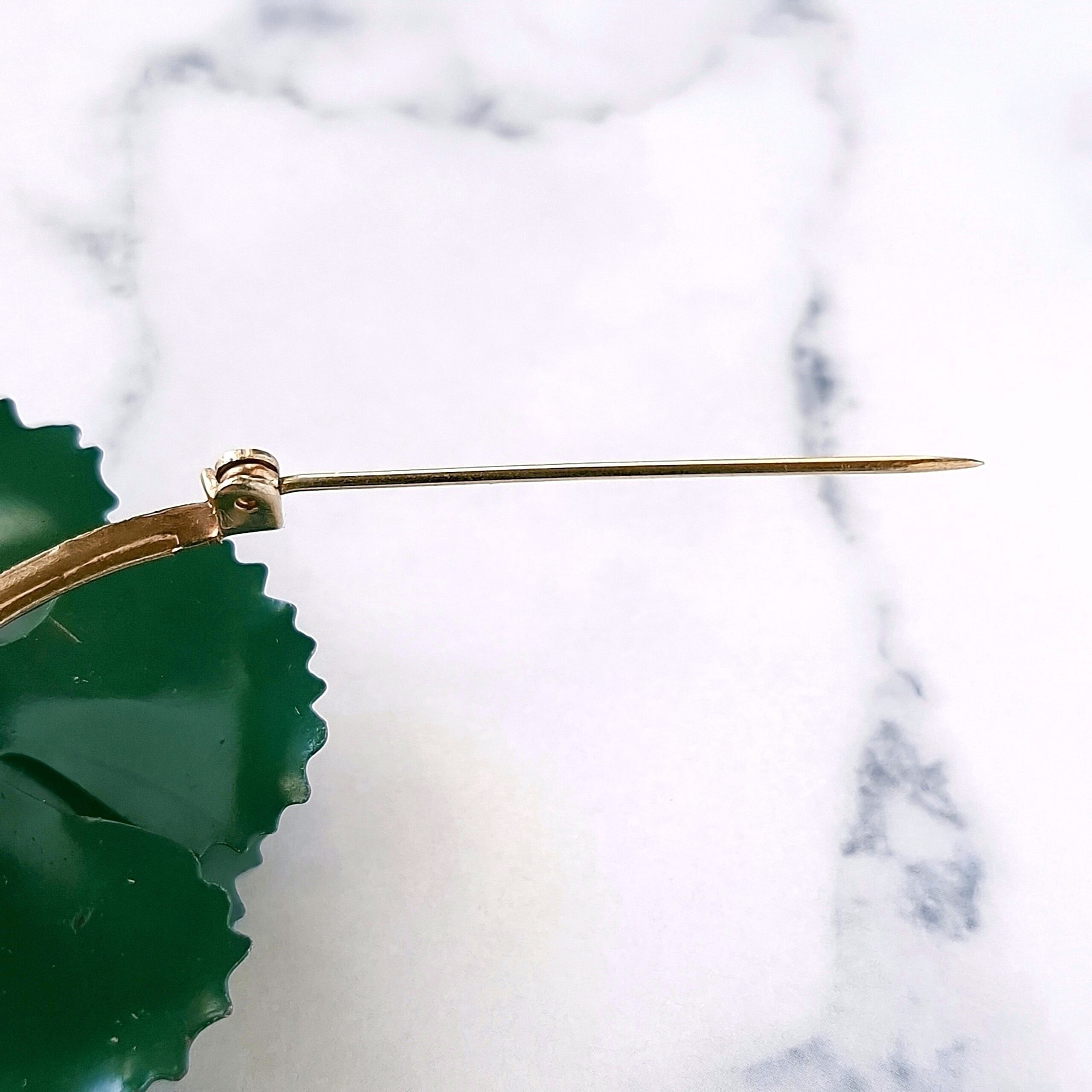 グリーンのラインストーンがあしらわれたディープグリーンのエナメルで色付けされたフラワーのヴィンテージブローチです。