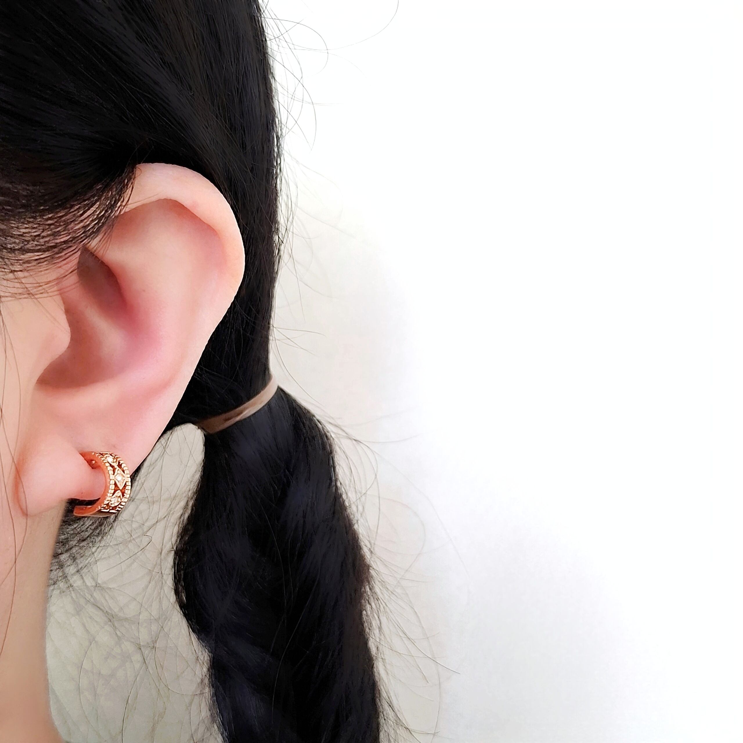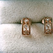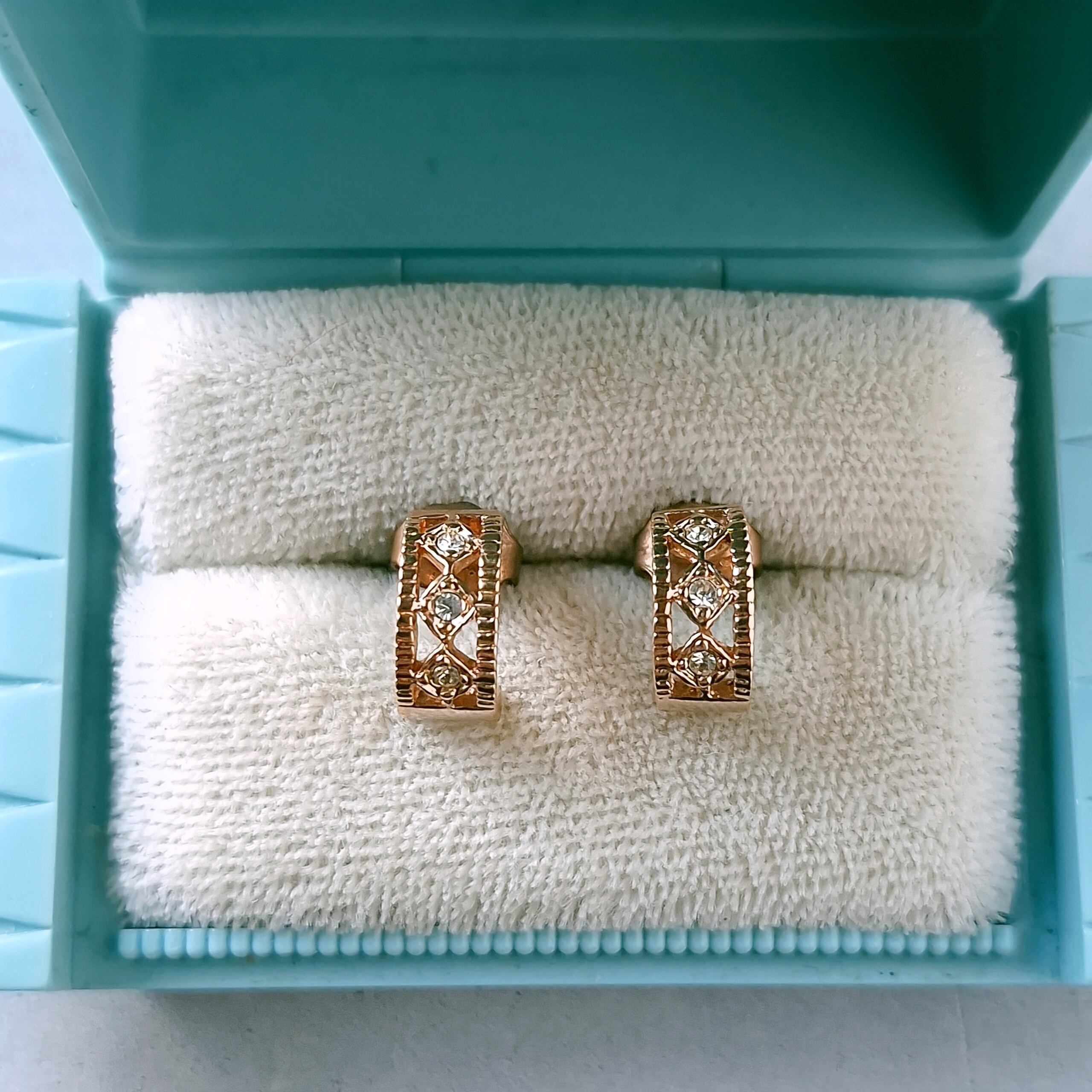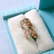 1886年アメリカのニューヨークにて小さな香水会社を創業、1971年に本格的にコスチュームジュエリーの製作を開始したAvon(エイボン)の2000年に販売された“ROSE GOLD COLORED”の菱形の部分にクリアラインストーンがあしらわれたローズゴールドの小ぶりなオープンワークハーフフープのヴィンテージピアスです。