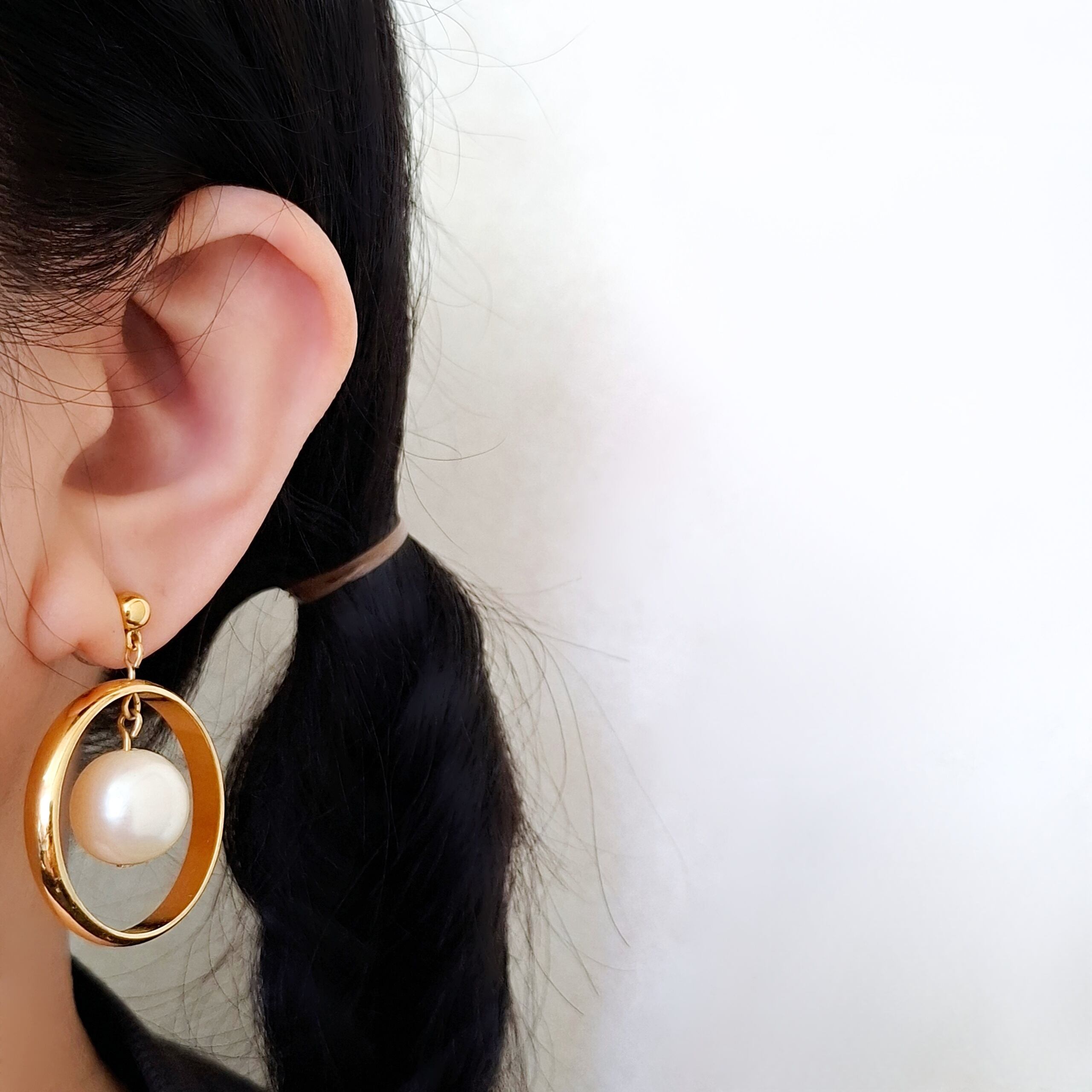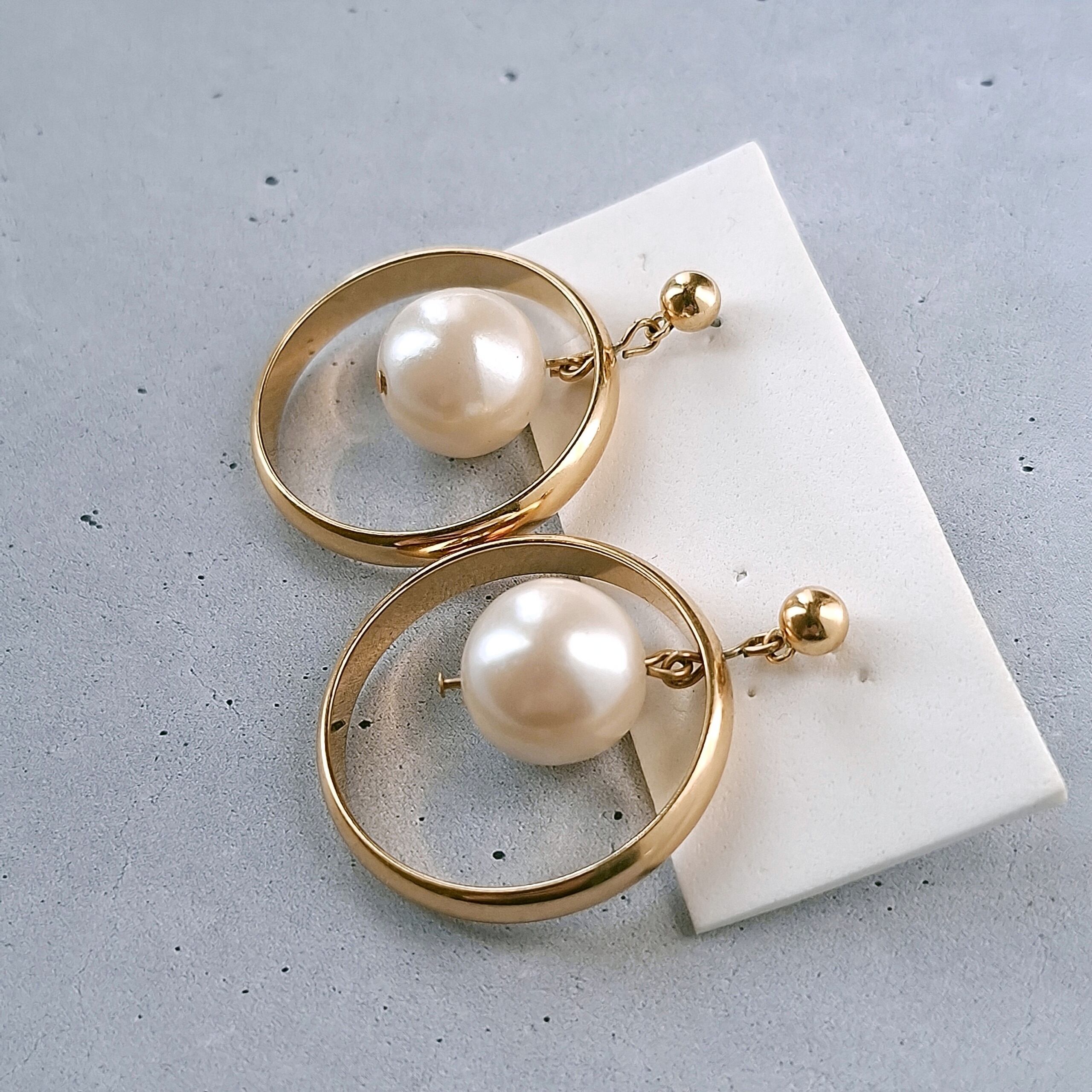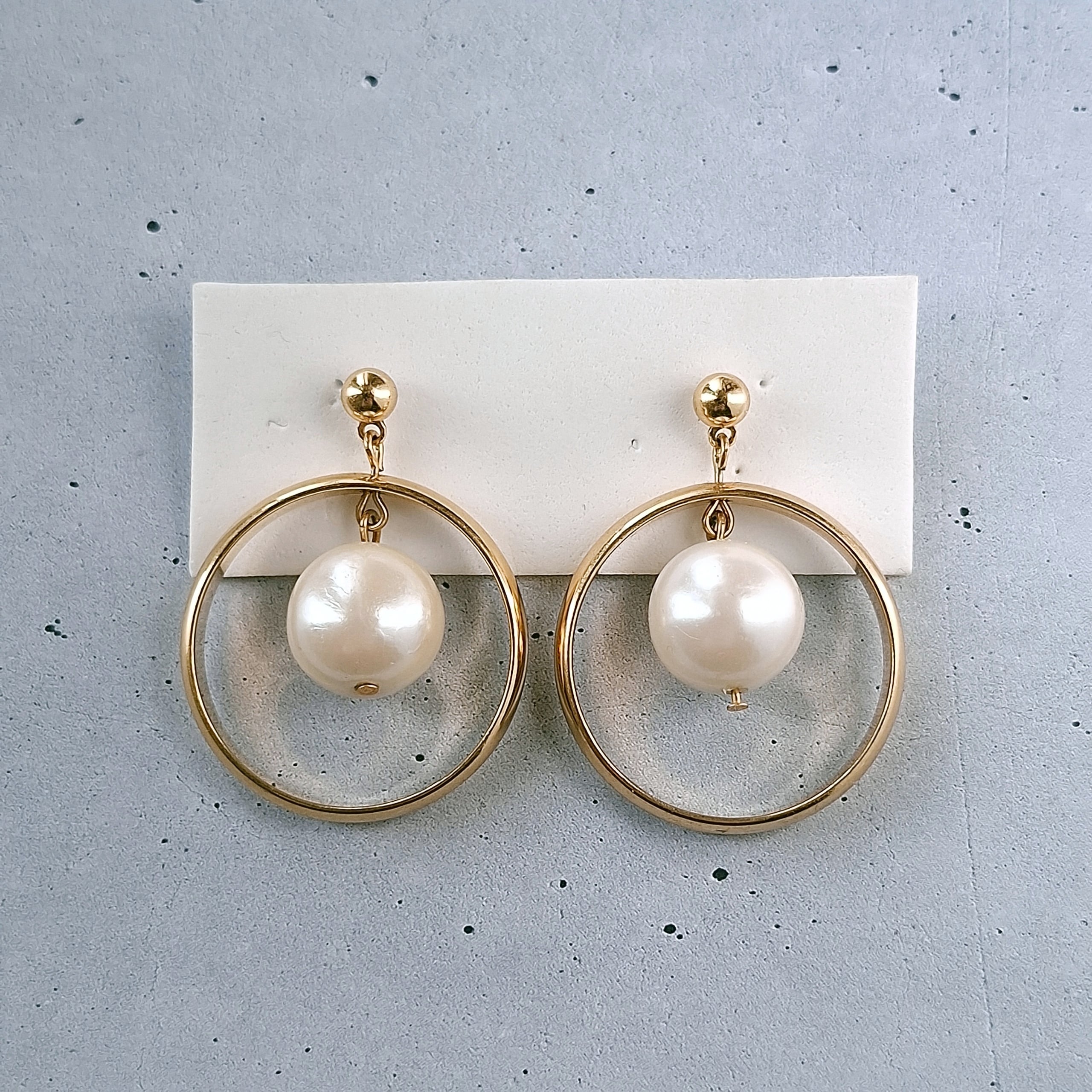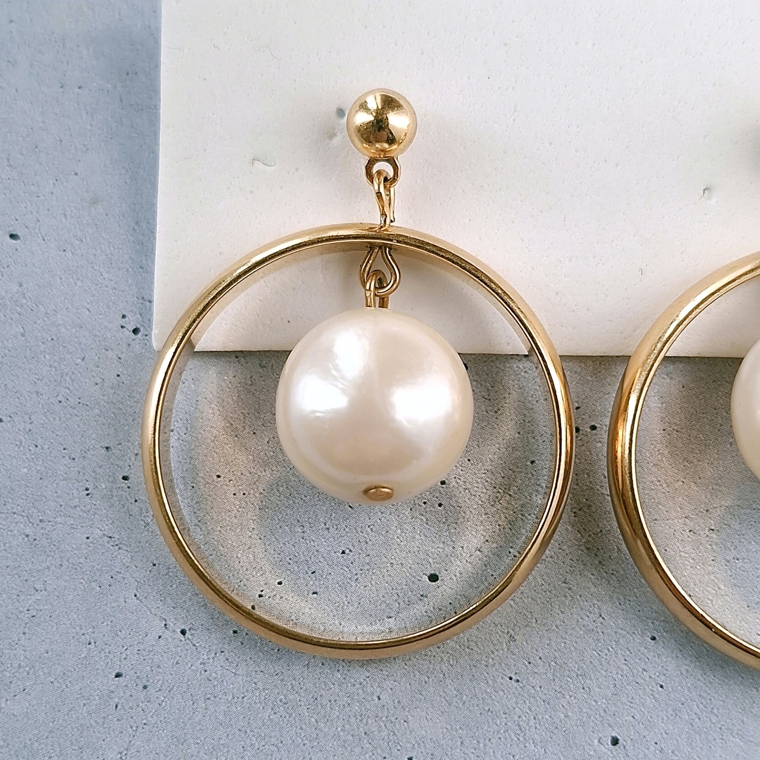 1886年アメリカのニューヨークにて小さな香水会社を創業、1971年に本格的にコスチュームジュエリーの製作を開始したAvon(エイボン)の1990年に販売された“pearly hoop”の大ぶりなゴールドメタルのフープの中にフェイクパールがぶら下がったデザインのヴィンテージピアスです。