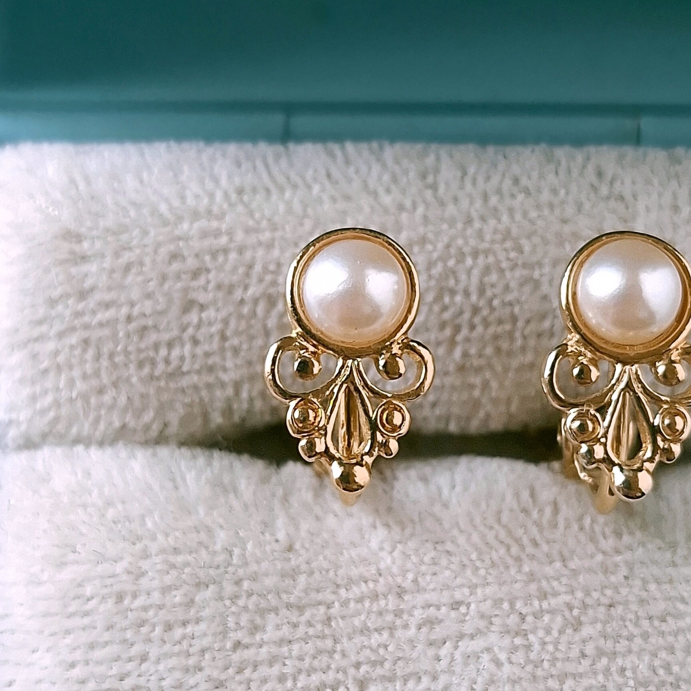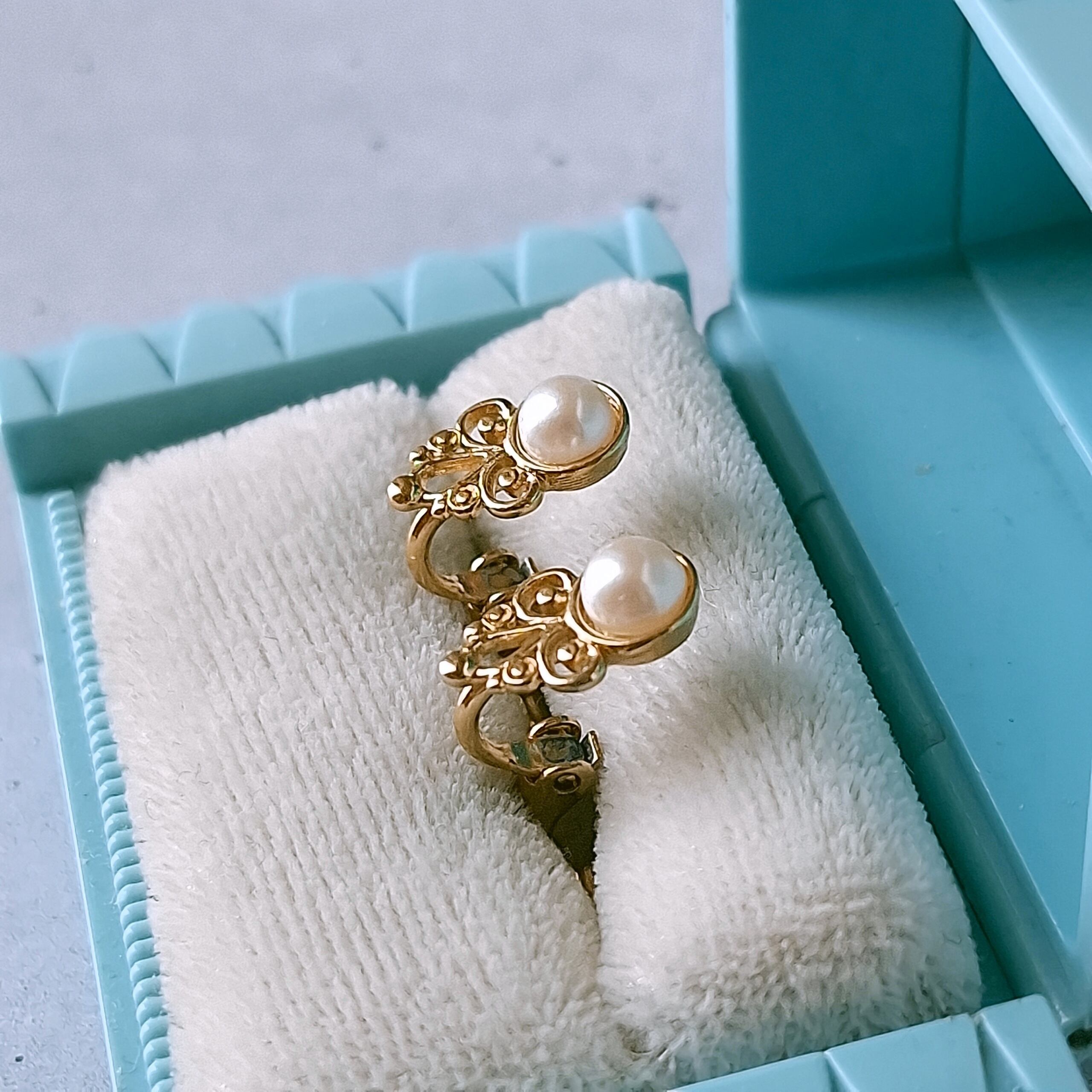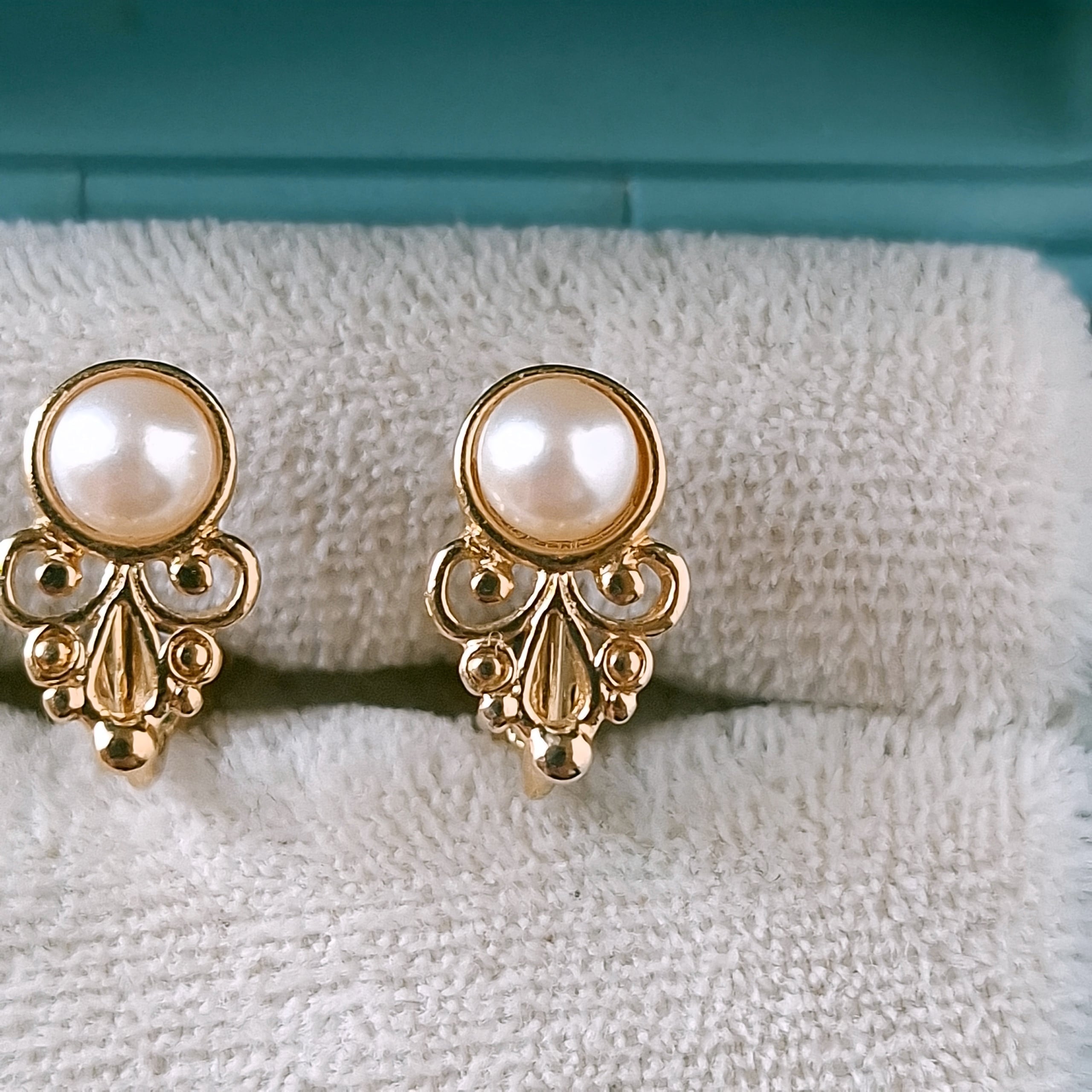 1886年アメリカのニューヨークにて小さな香水会社を創業、1971年に本格的にコスチュームジュエリーの製作を開始したAvon(エイボン)の1982年に販売された“ROMANTIC MOMENTS”のスワール状のゴールドメタルとフェイクパールの小ぶりなヴィンテージイヤリングです。