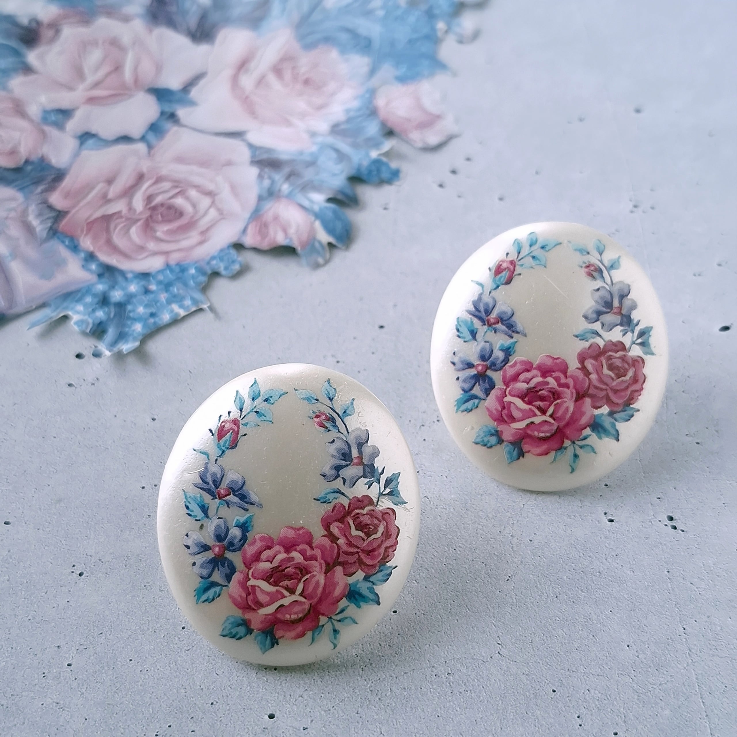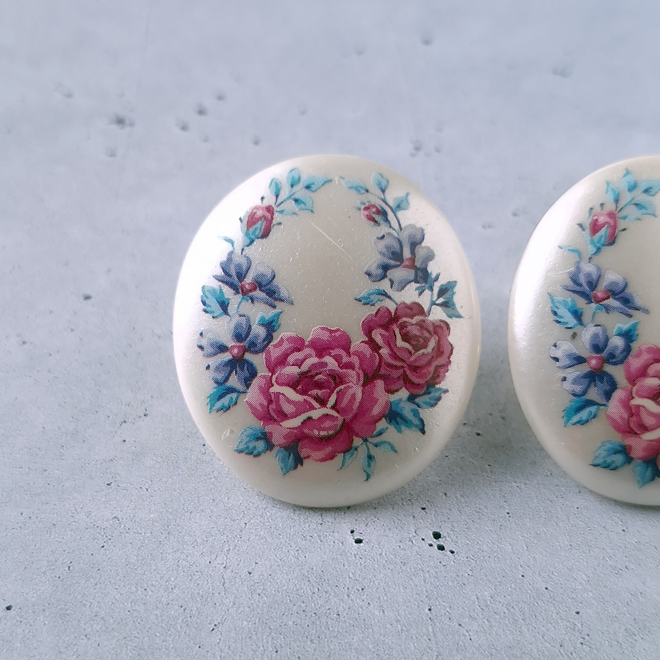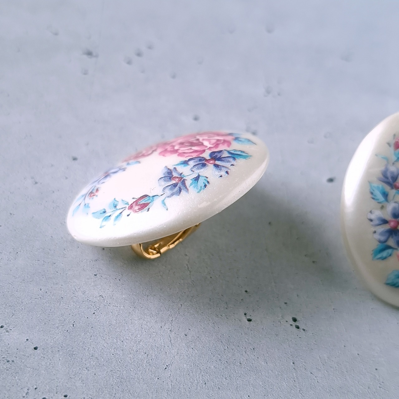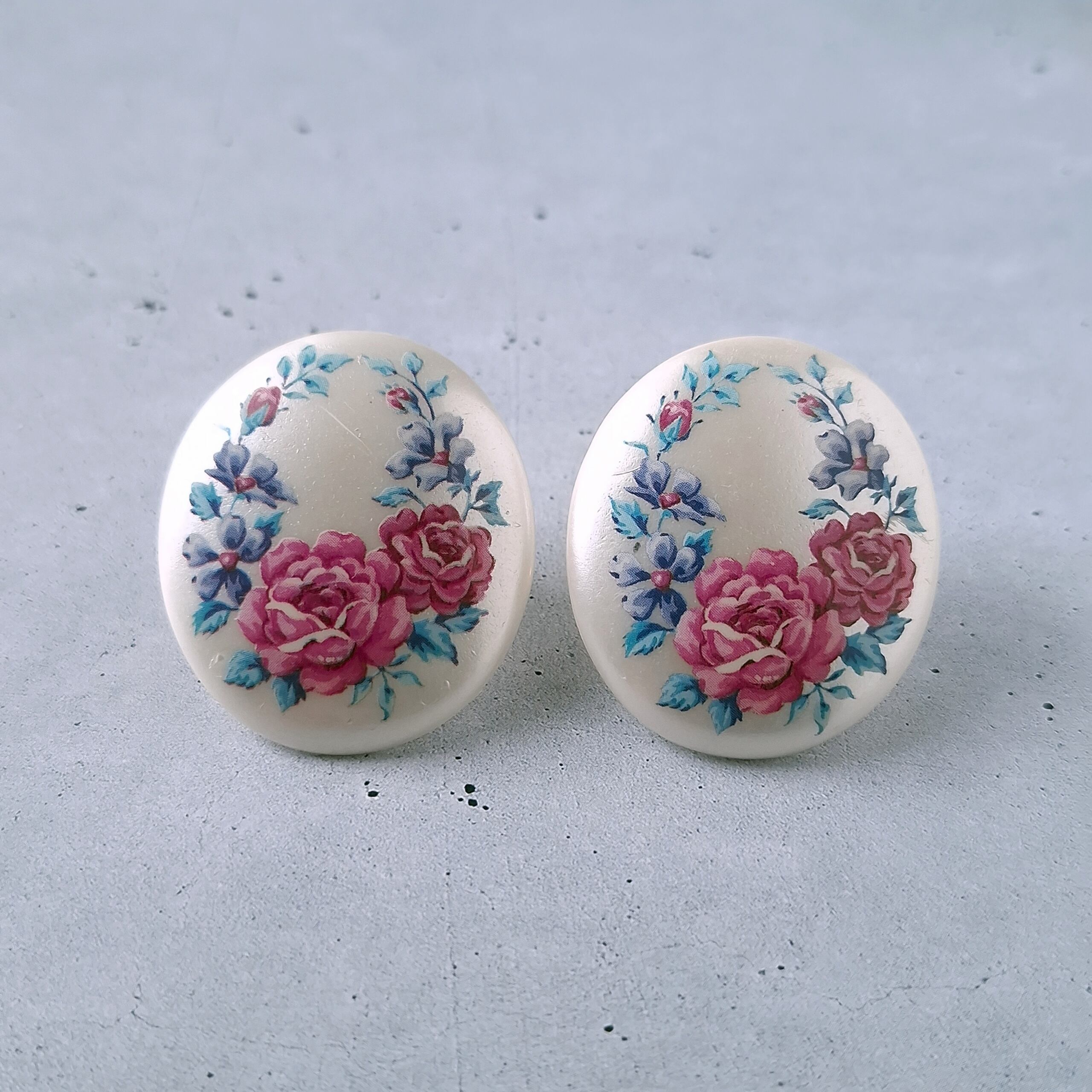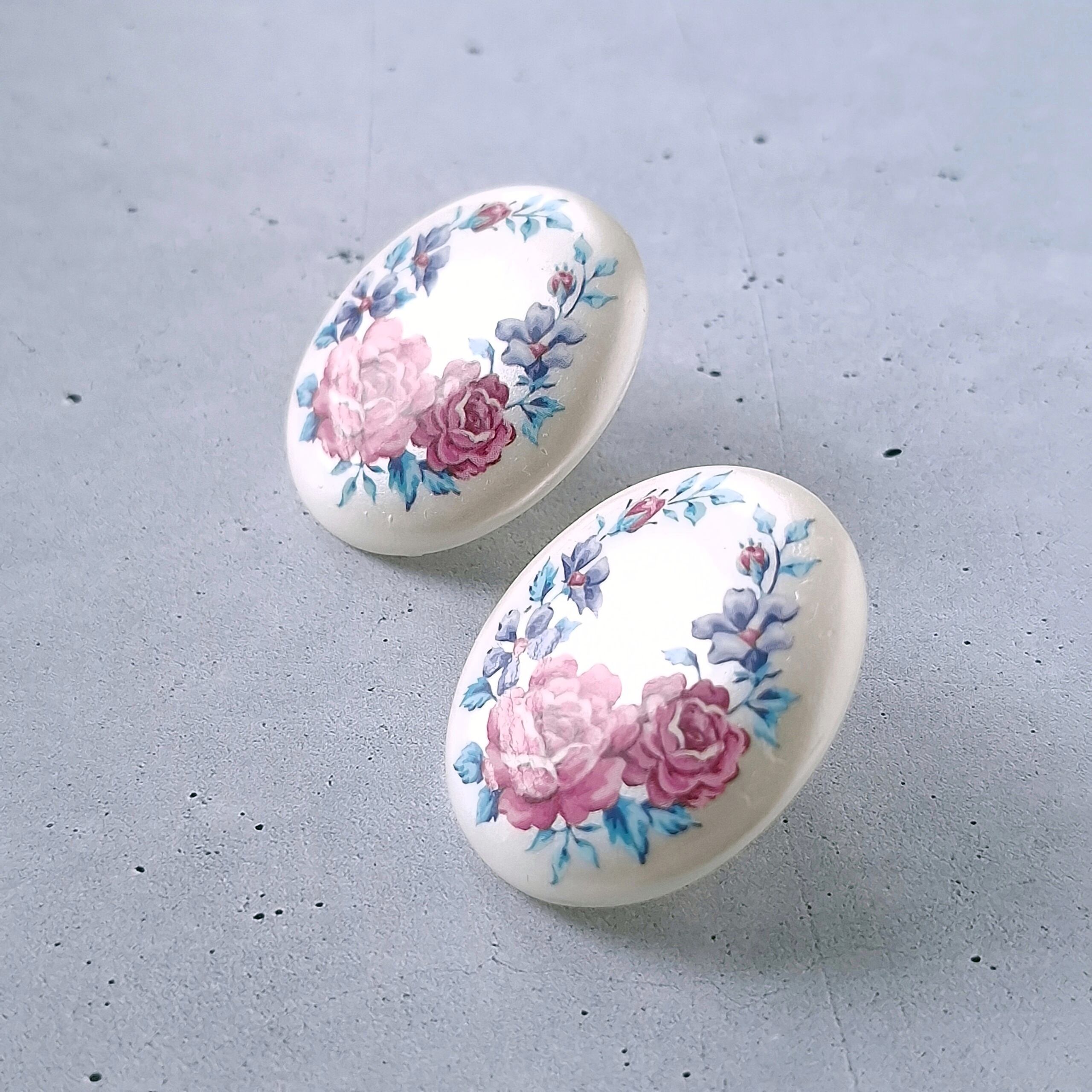1886年アメリカのニューヨークにて小さな香水会社を創業、1971年に本格的にコスチュームジュエリーの製作を開始したAvon(エイボン)の1992年に販売された“in full bloom”のオーバル型のパール調のプラスチックにフラワーが描かれたヴィンテージイヤリングです。