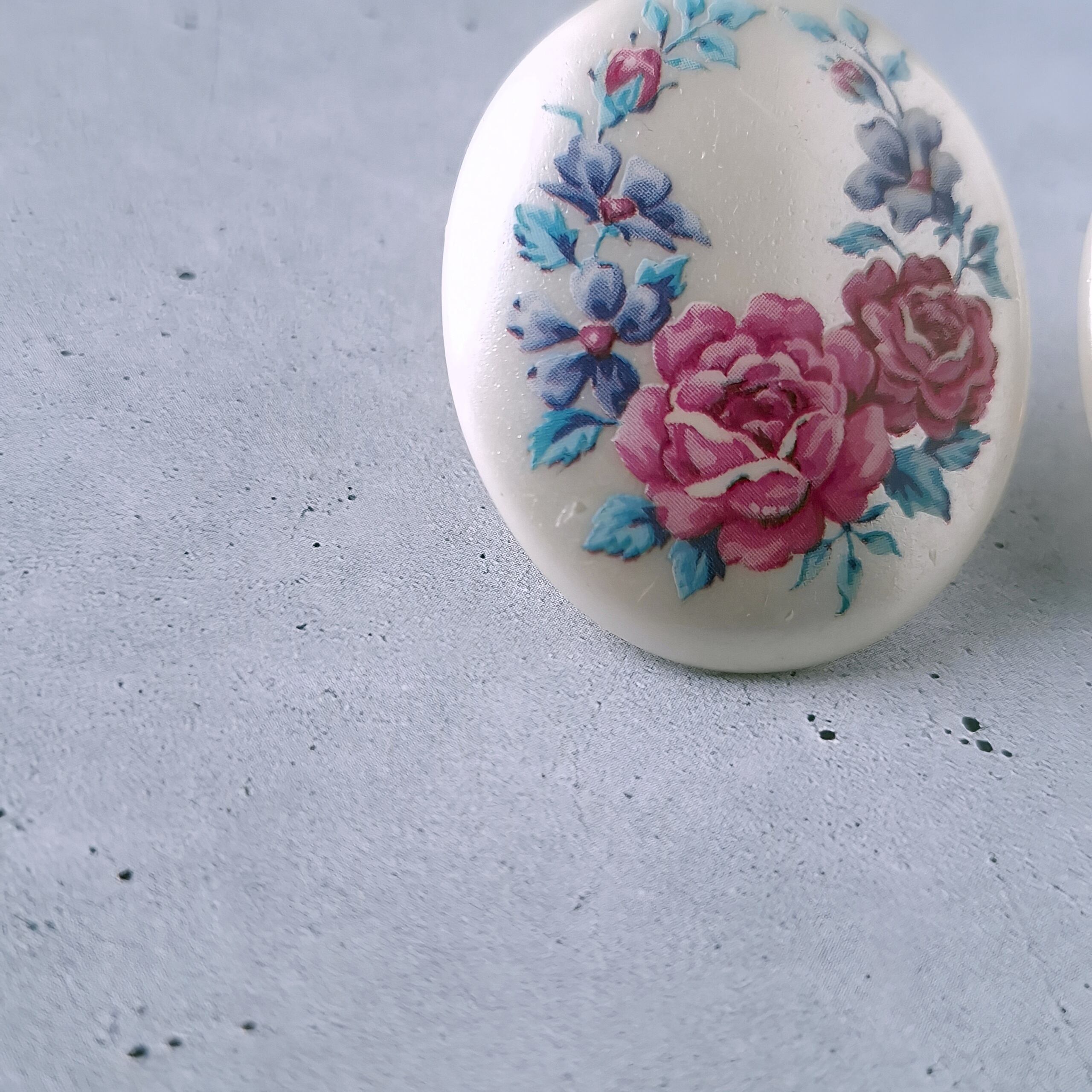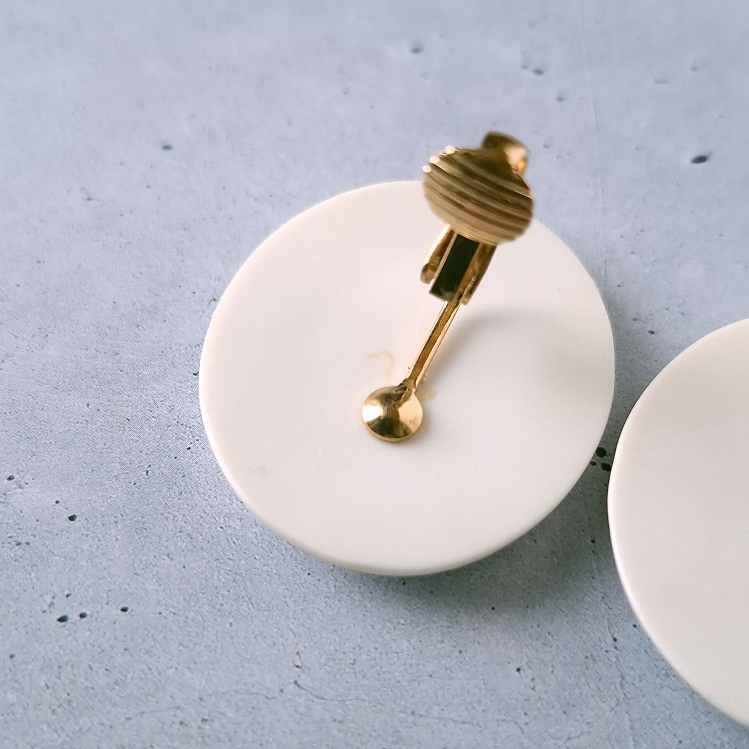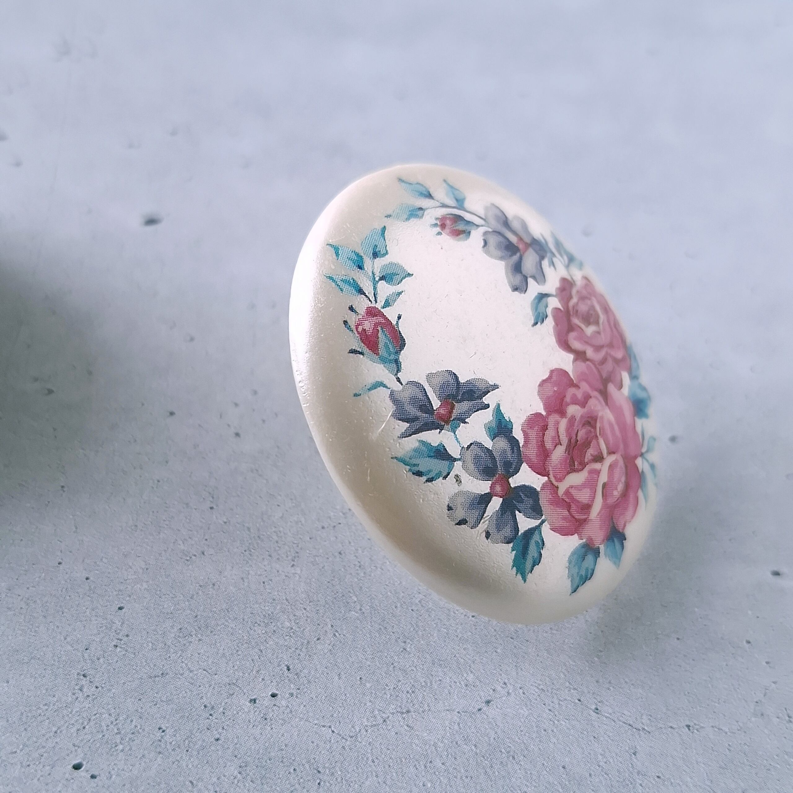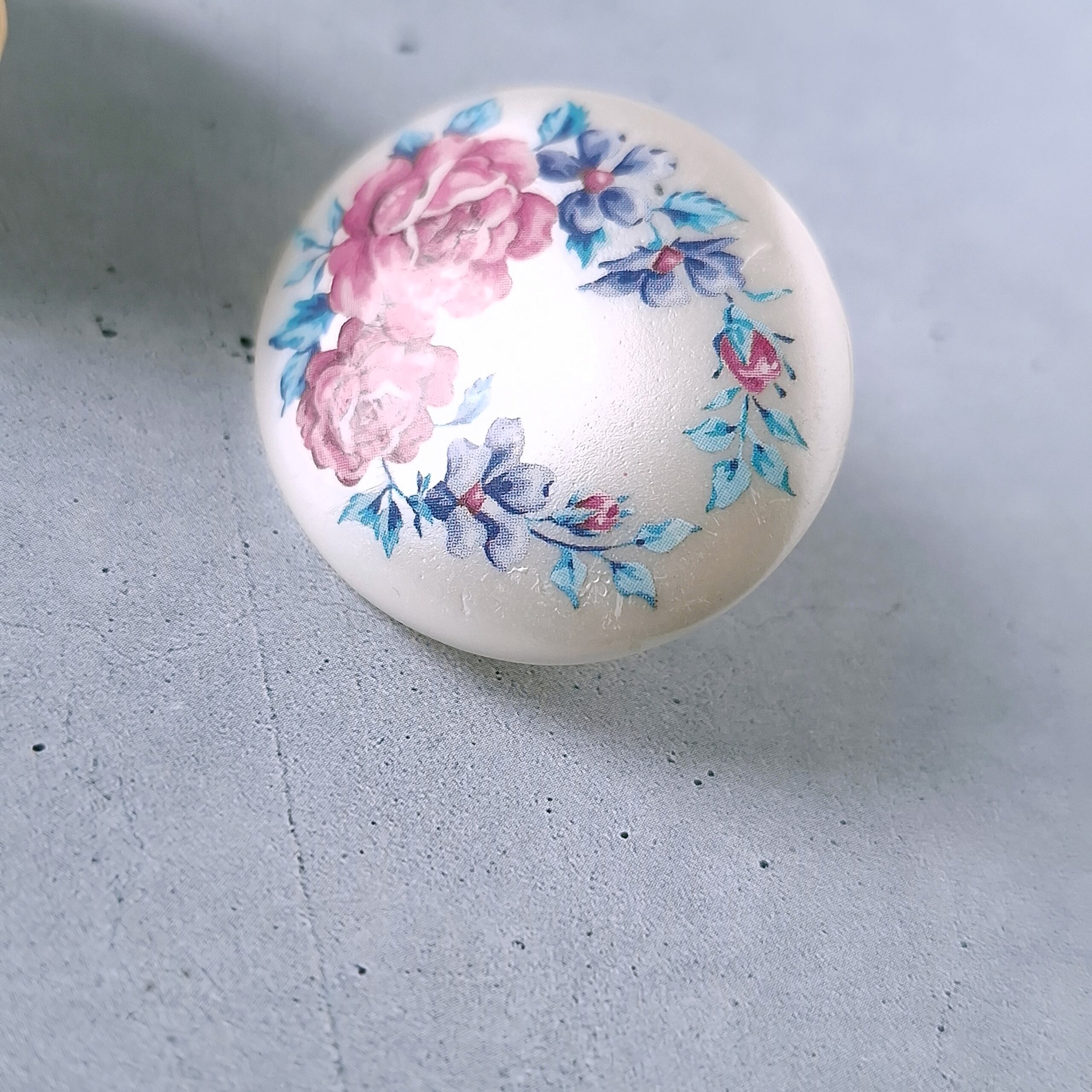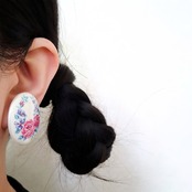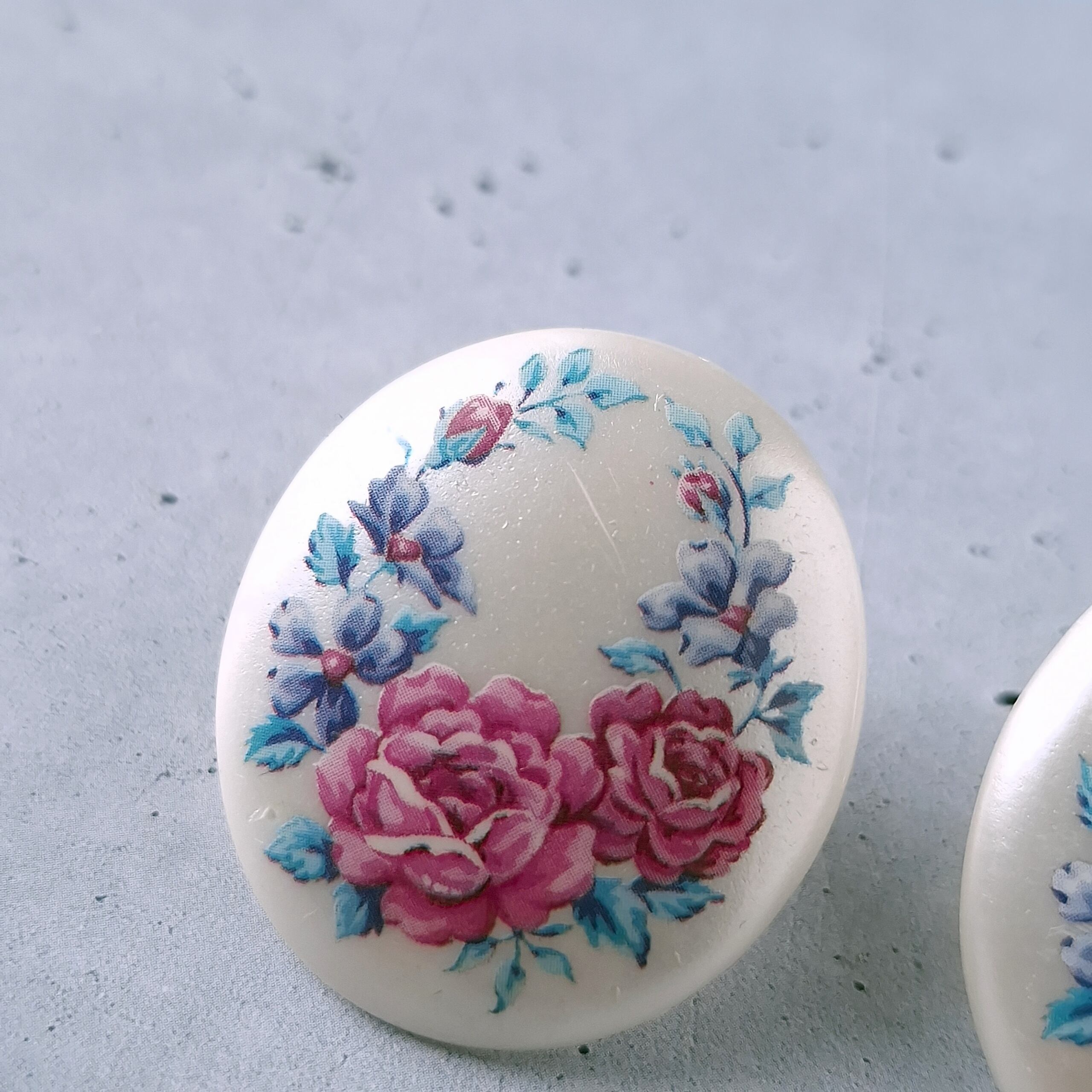 1886年アメリカのニューヨークにて小さな香水会社を創業、1971年に本格的にコスチュームジュエリーの製作を開始したAvon(エイボン)の1992年に販売された“in full bloom”のオーバル型のパール調のプラスチックにフラワーが描かれたヴィンテージイヤリングです。