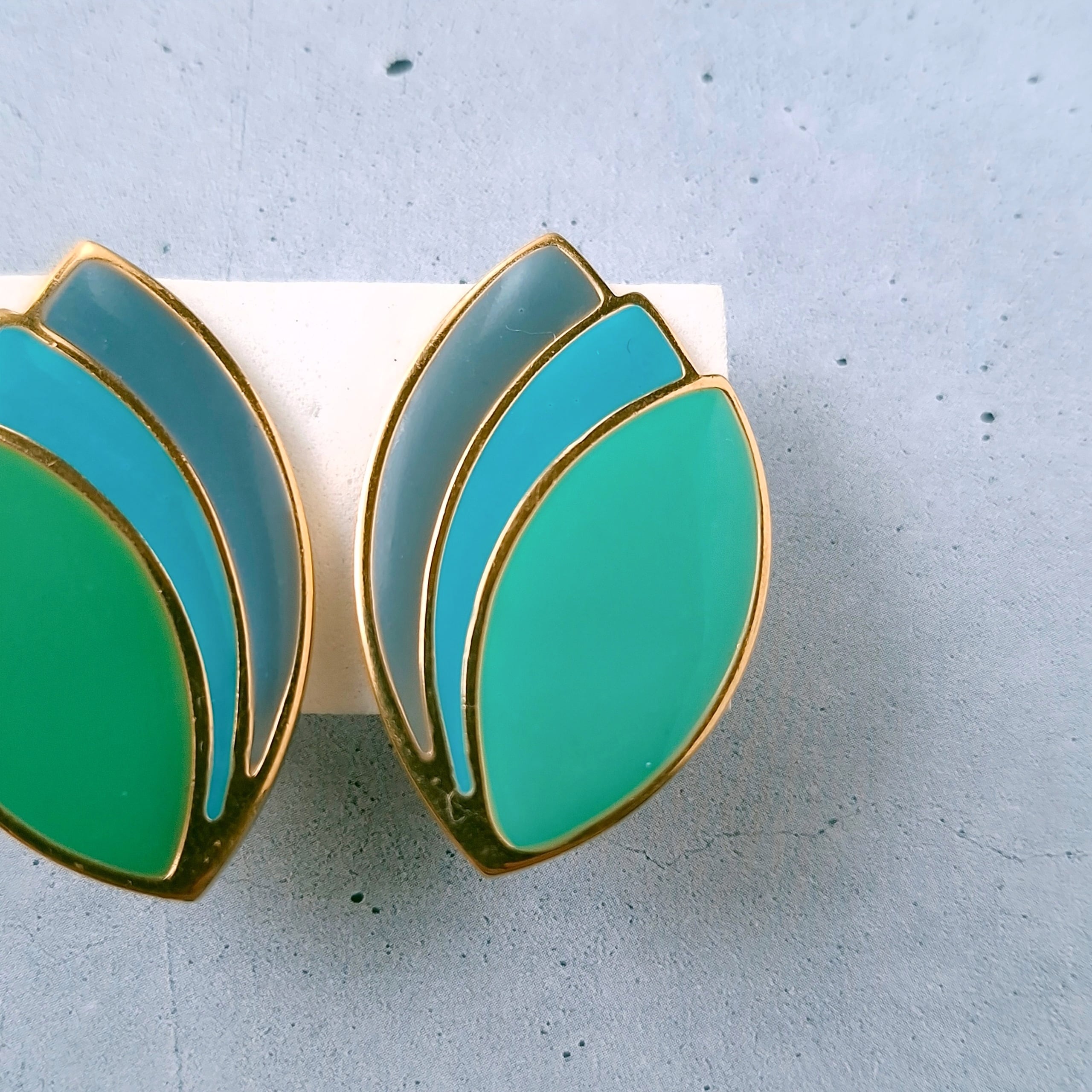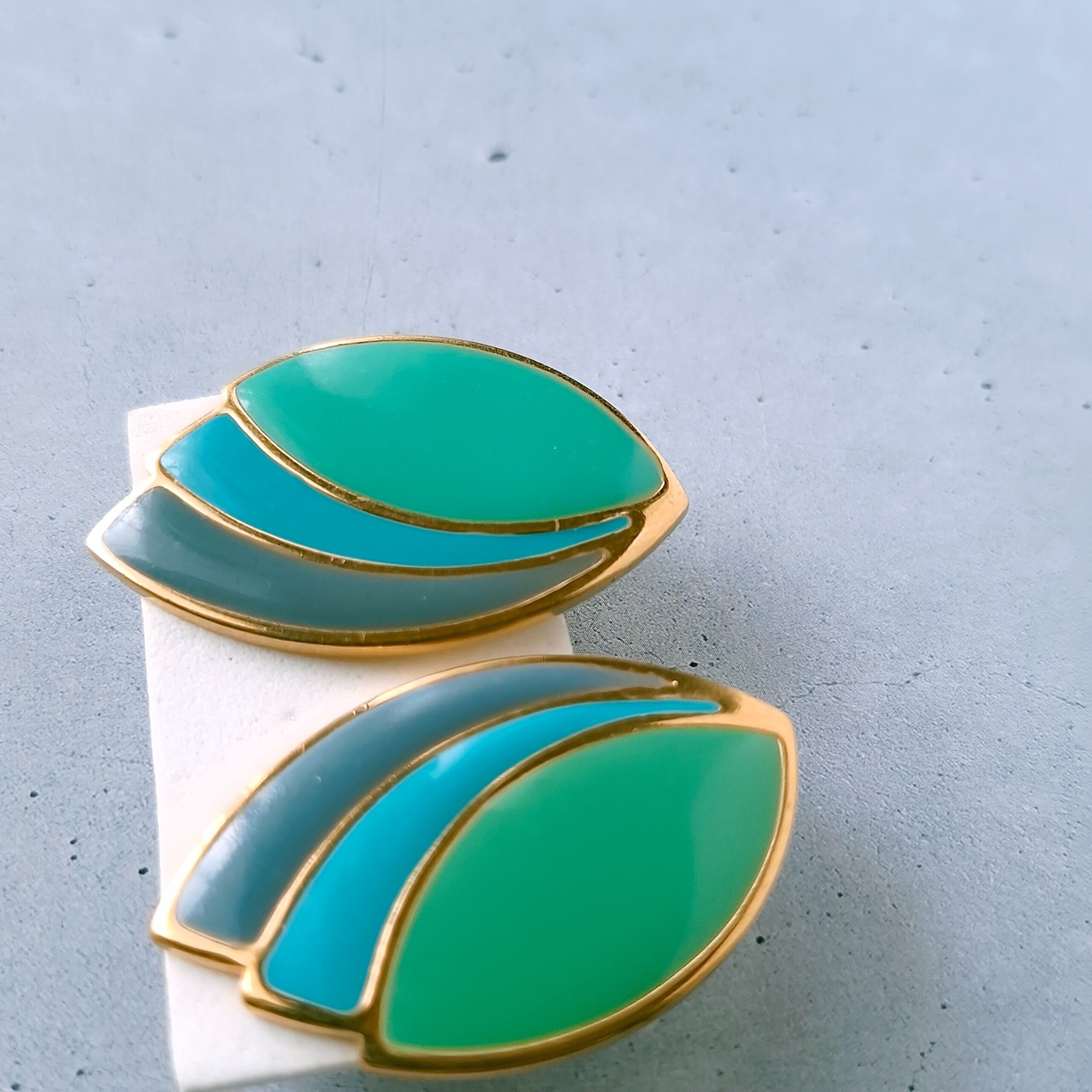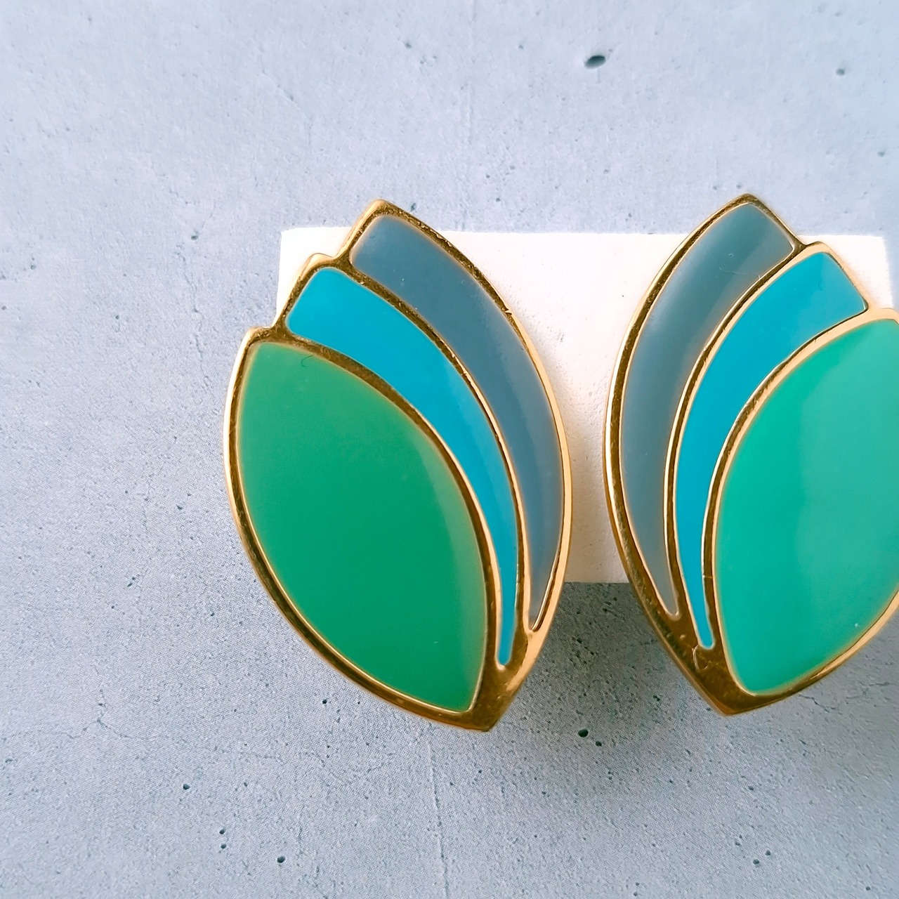 1886年アメリカのニューヨークにて小さな香水会社を創業、1971年に本格的にコスチュームジュエリーの製作を開始したAvon(エイボン)の1987年に販売された“paradise colors”のグリーン、ライトブルー、ダークブルーのエナメルで色付けされた3枚の蝶の羽根が重なったデザインのヴィンテージイヤリングです。